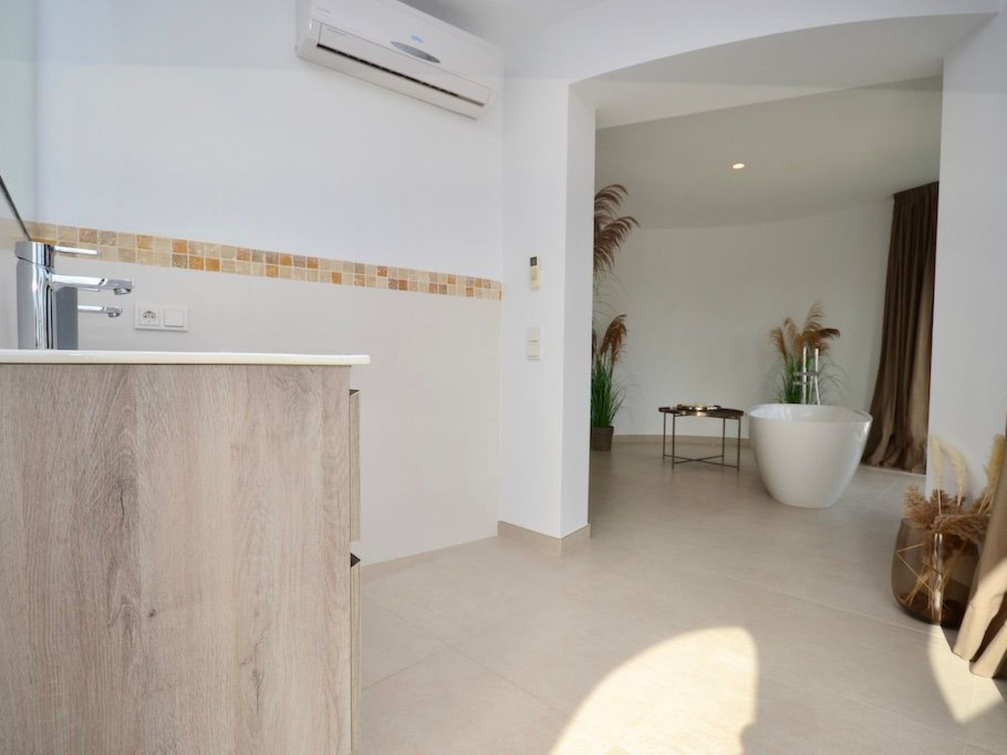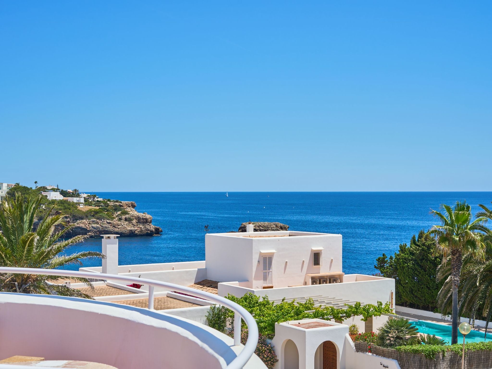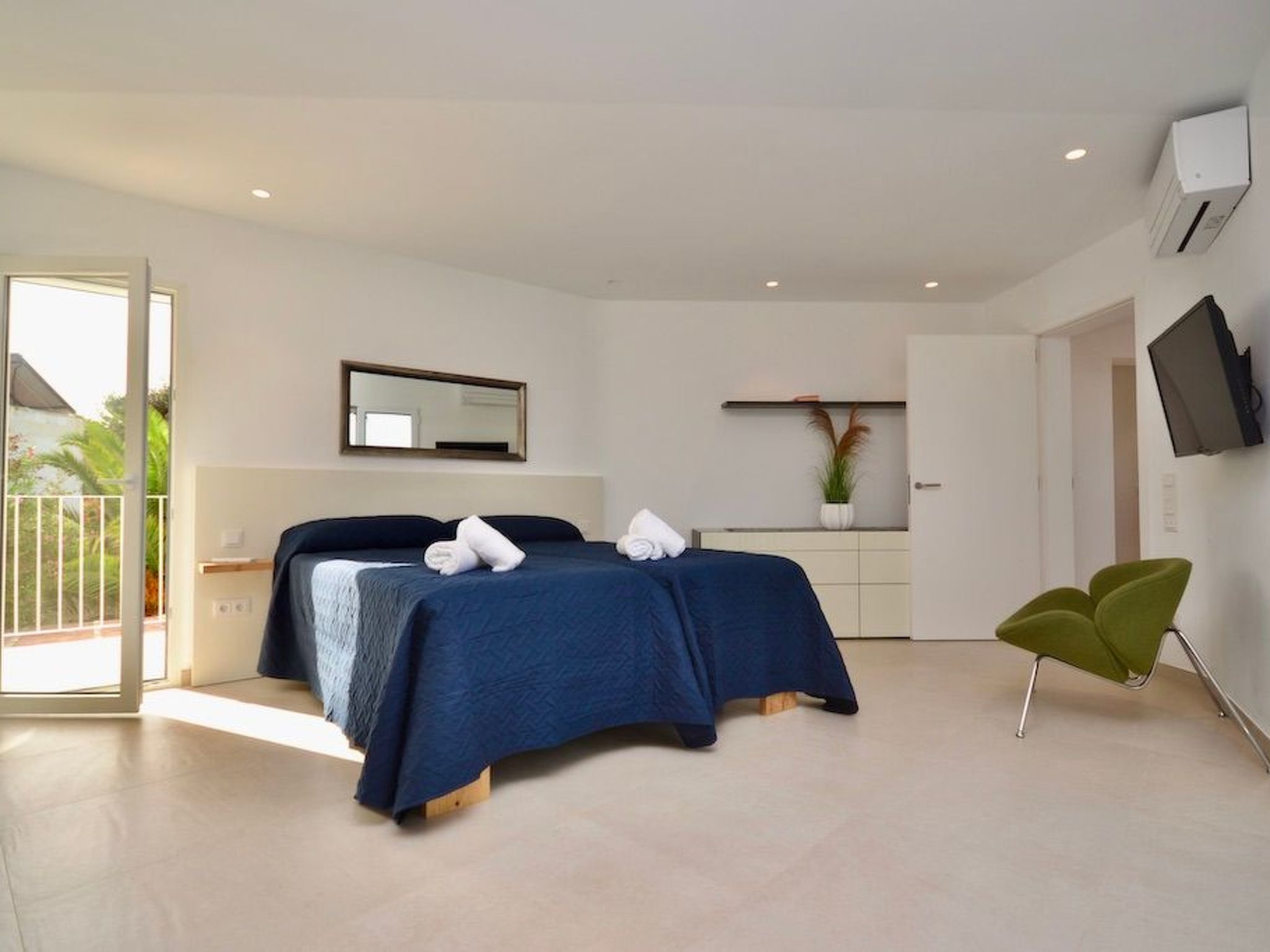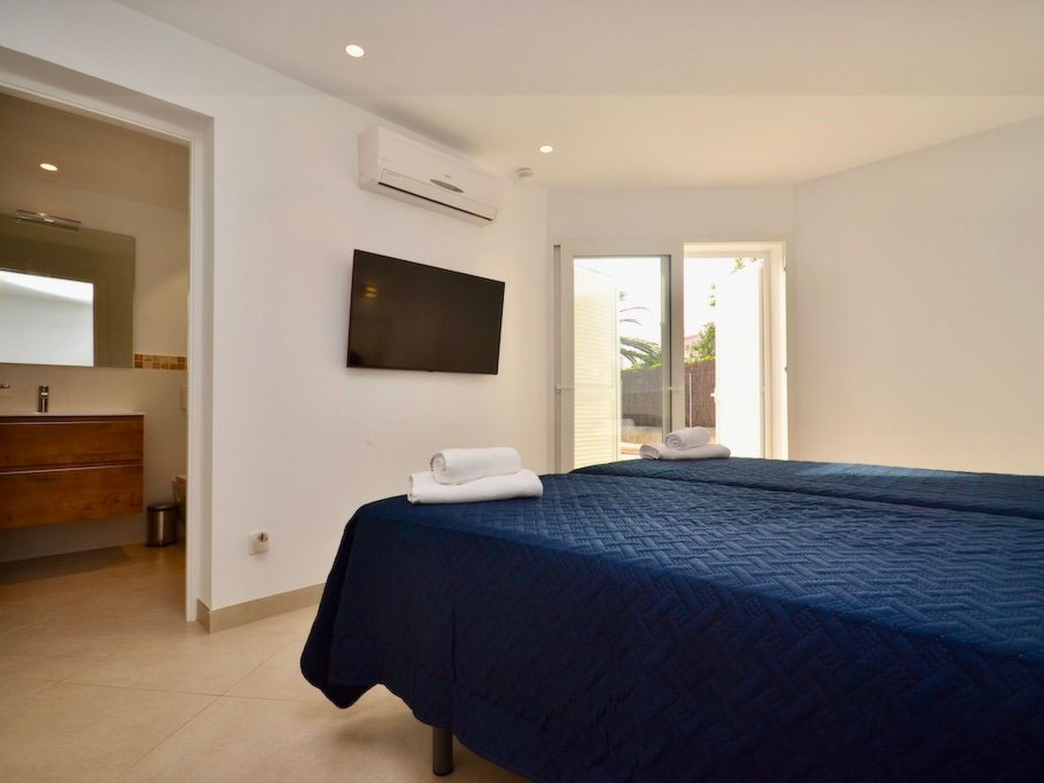 Depuis le jardin, on accède au premier étage par un escalier extérieur. Nous entrons dans la chambre à coucher principale, lumineuse et spacieuse, qui offre une vue partielle sur la mer via la baie semi-circulaire avec baignoire moderne. La salle de bain est entièrement intégrée. À ce niveau, nous trouvons deux autres chambres à coucher avec salle de bain en suite. L'une d'entre elles dispose d'un balcon.