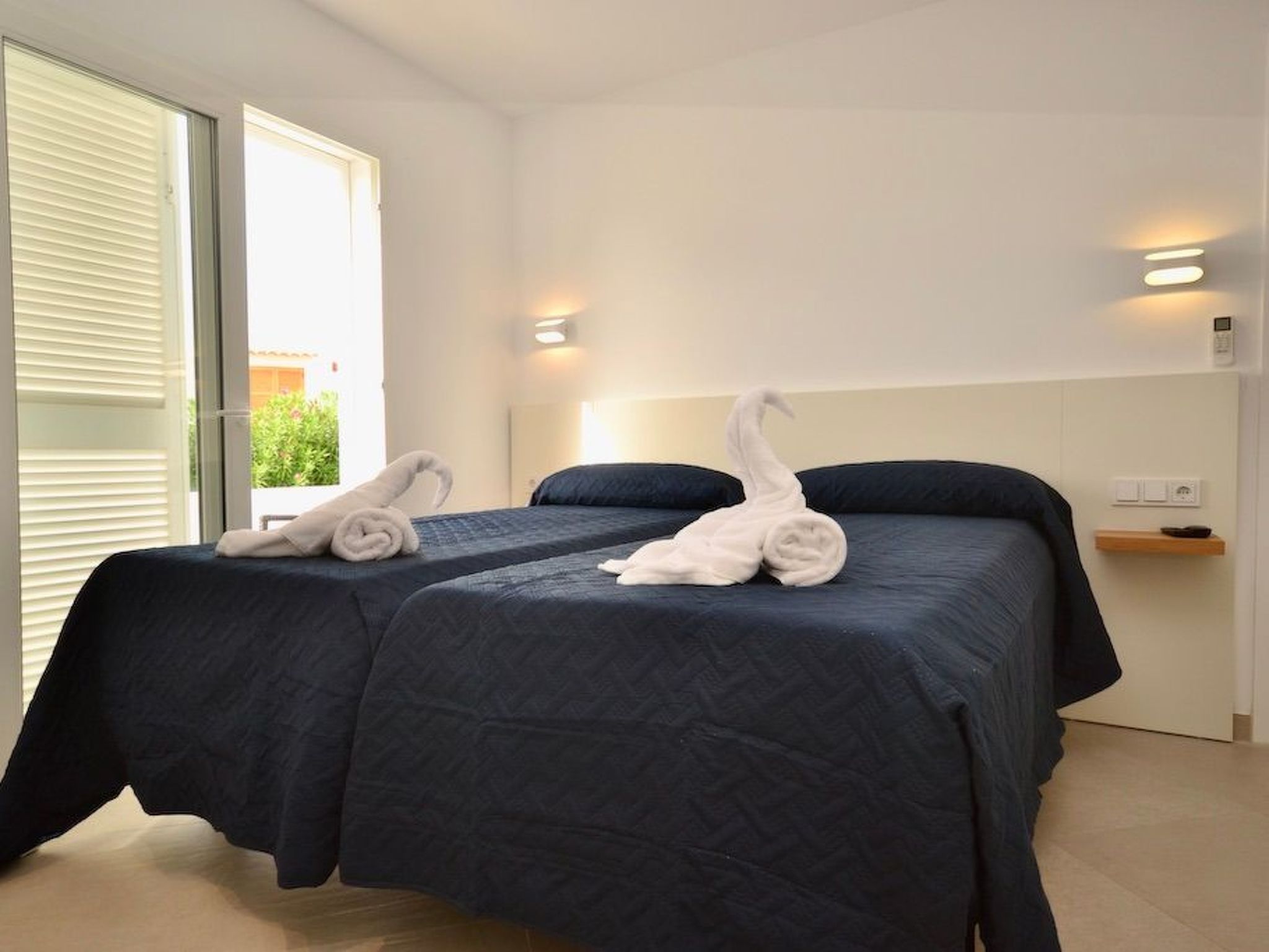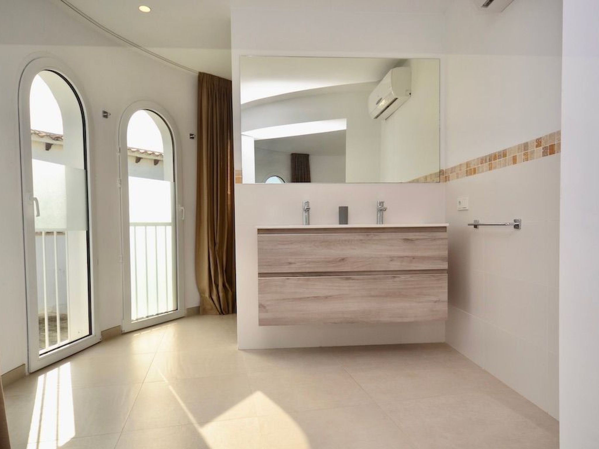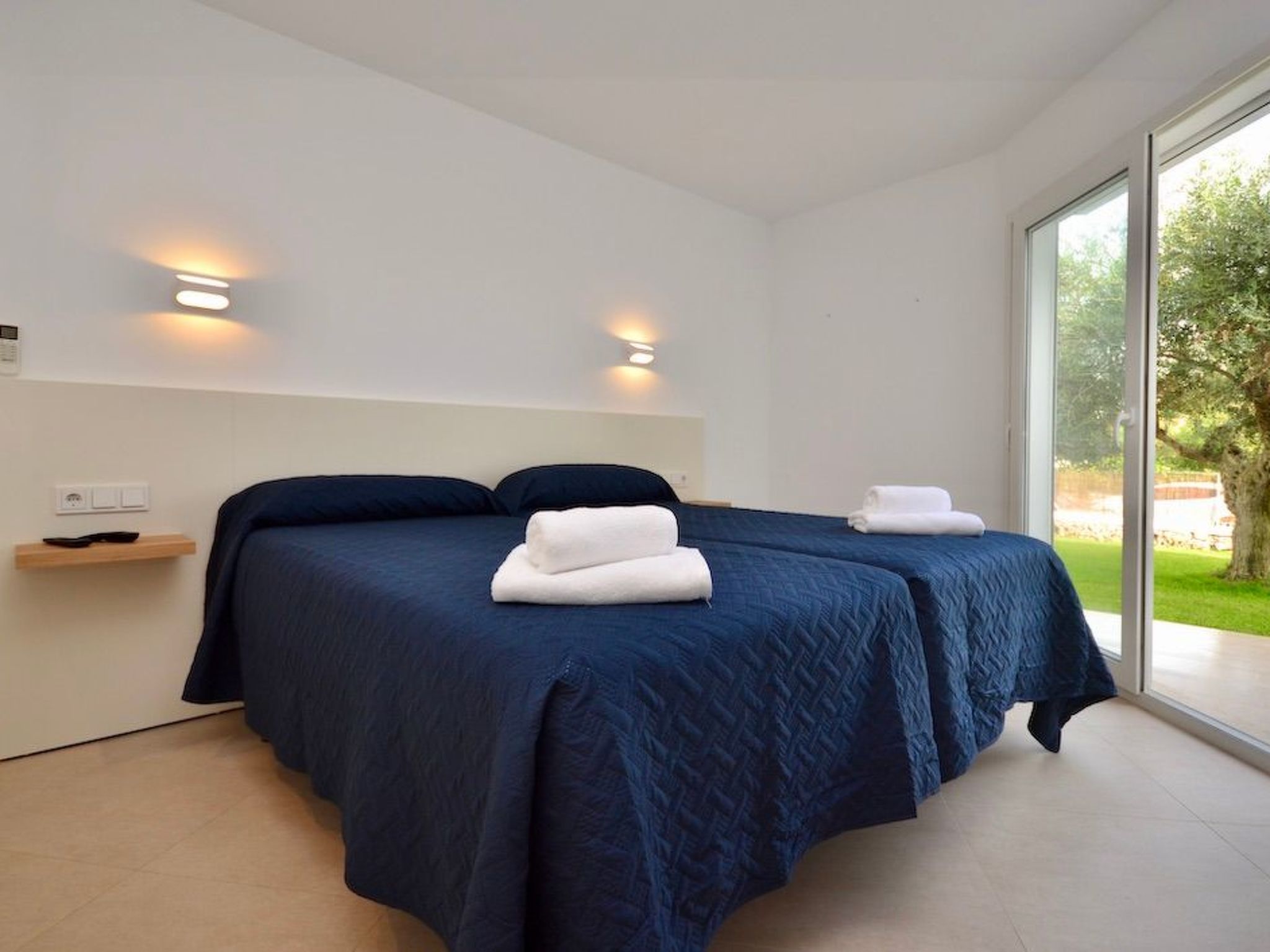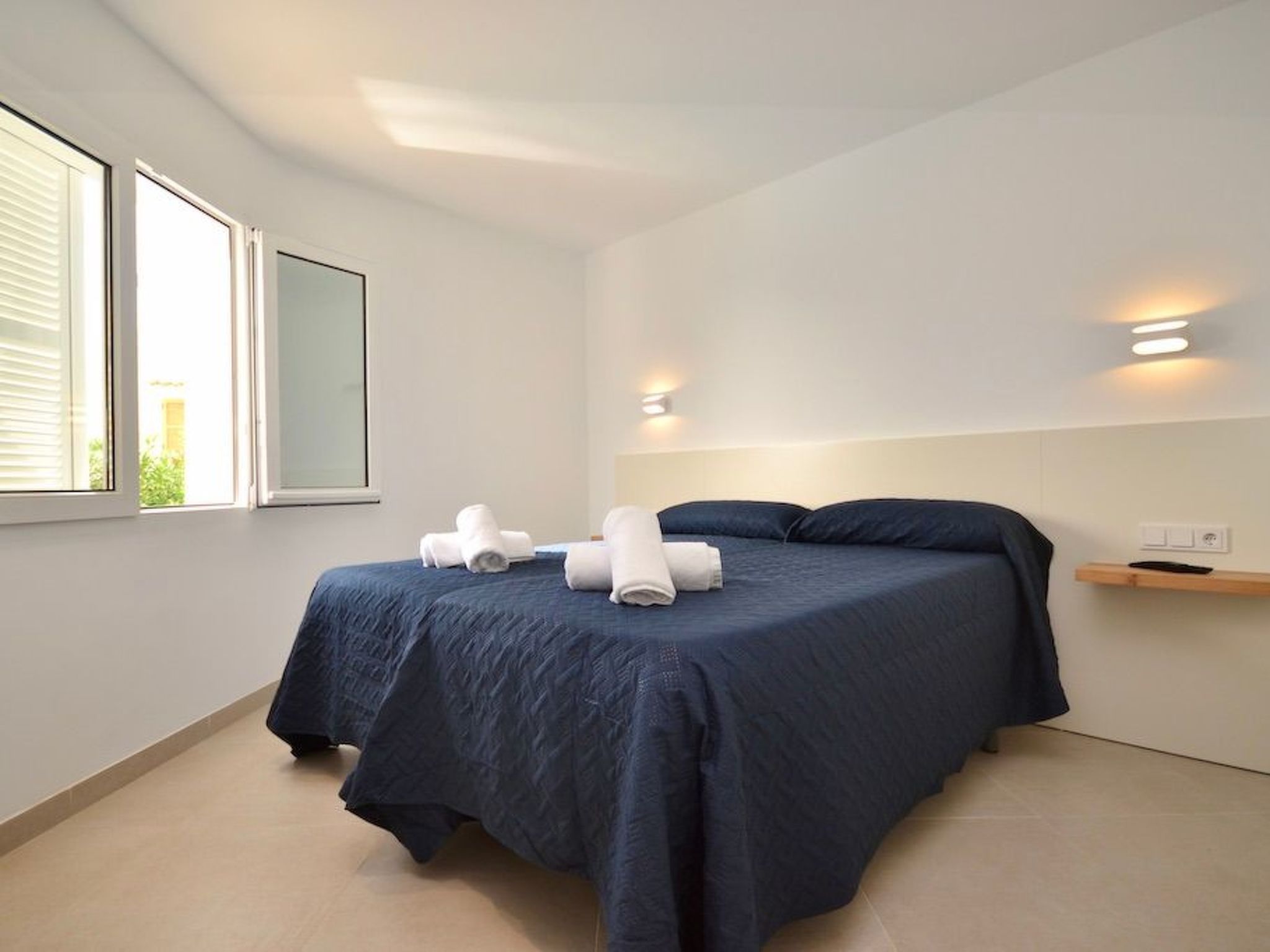 Depuis le jardin, on accède au premier étage par un escalier extérieur. Nous entrons dans la chambre à coucher principale, lumineuse et spacieuse, qui offre une vue partielle sur la mer via la baie semi-circulaire avec baignoire moderne. La salle de bain est entièrement intégrée. À ce niveau, nous trouvons deux autres chambres à coucher avec salle de bain en suite. L'une d'entre elles dispose d'un balcon.