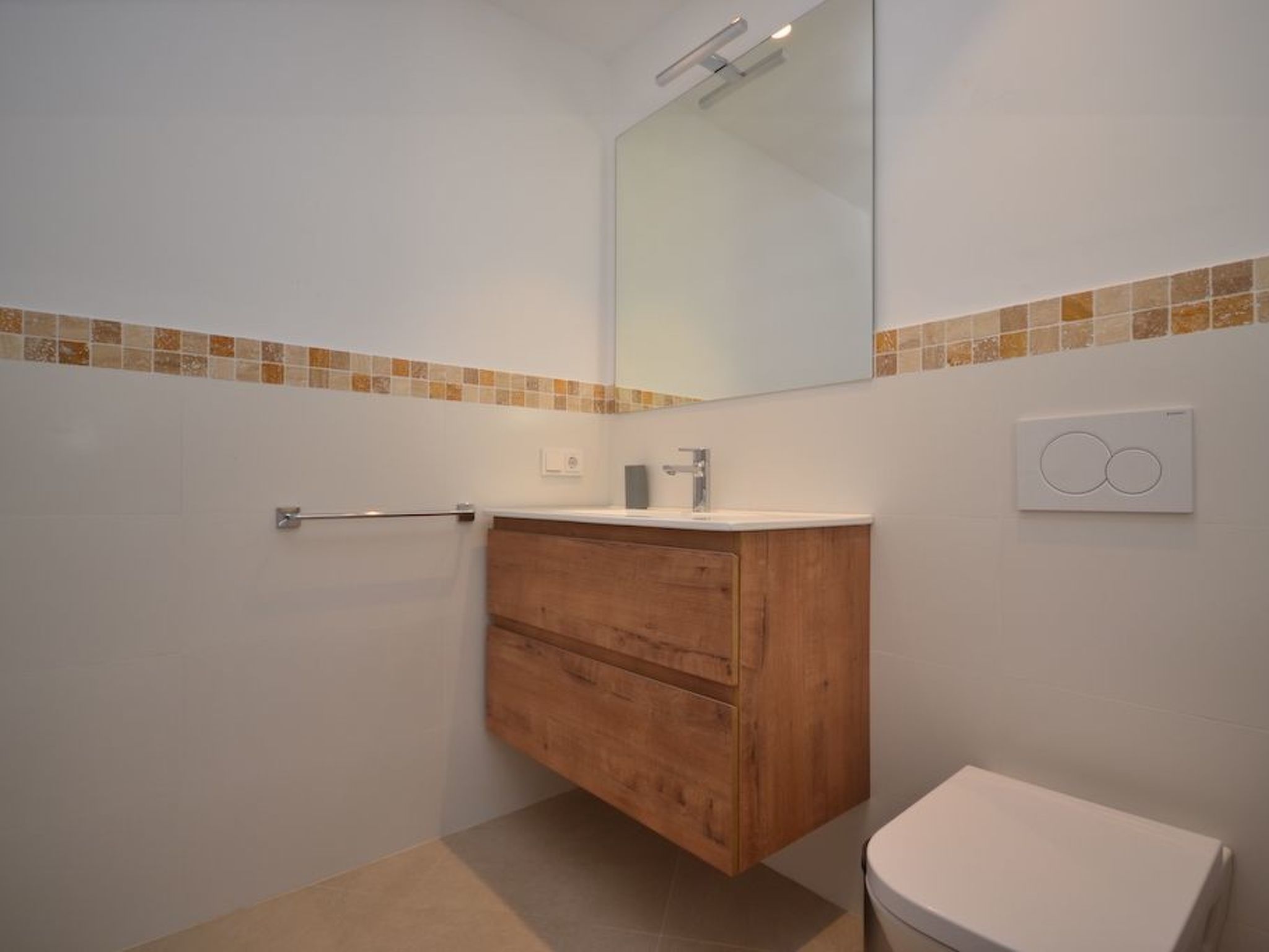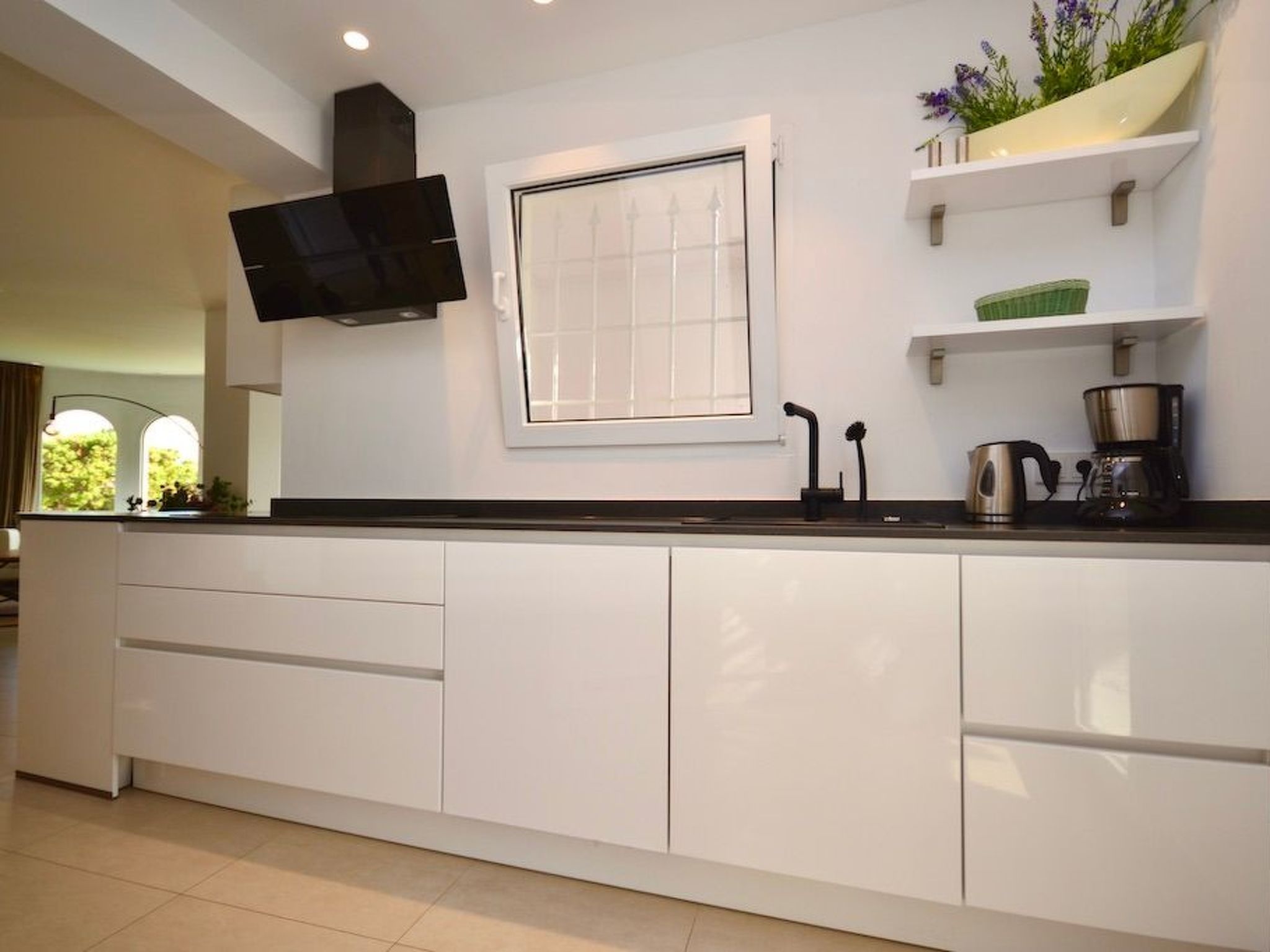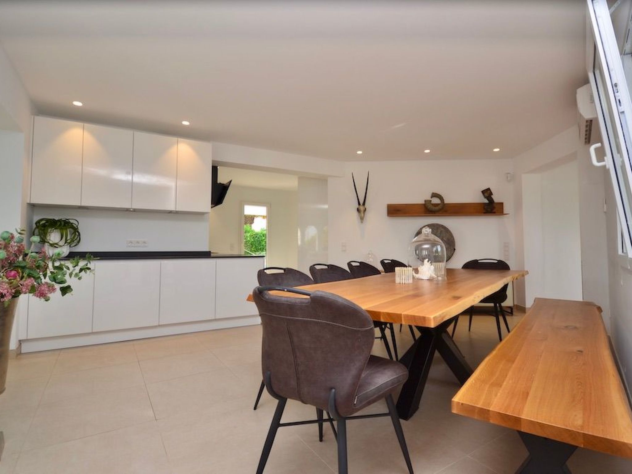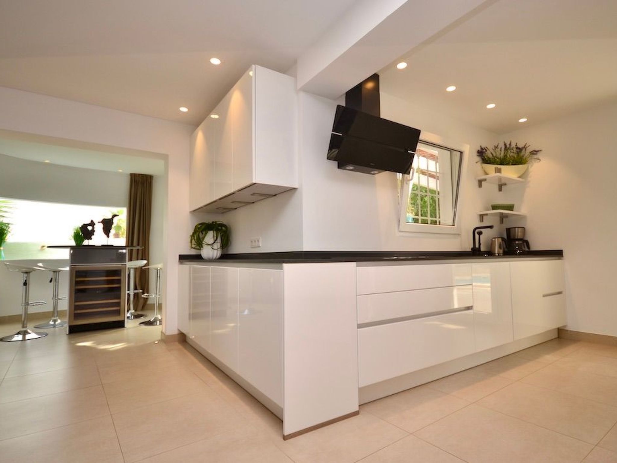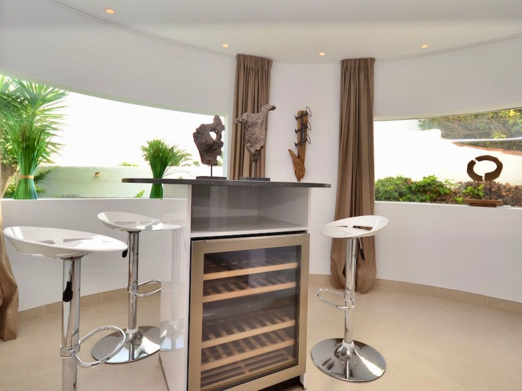L'entrée donne accès à un salon/salle à manger spacieux, lumineux et ouvert. Le salon et la cuisine élégamment intégrée donnent accès à la piscine. Dans la pièce adjacente, une armoire à vin avec une table haute intégrée et des tabourets de bar stylés vous attendent pour des moments agréables. À ce niveau, il y a trois chambres à coucher avec salle de bain en suite et accès à l'extérieur. Deux chambres sont équipées de lits doubles et une de deux lits simples.