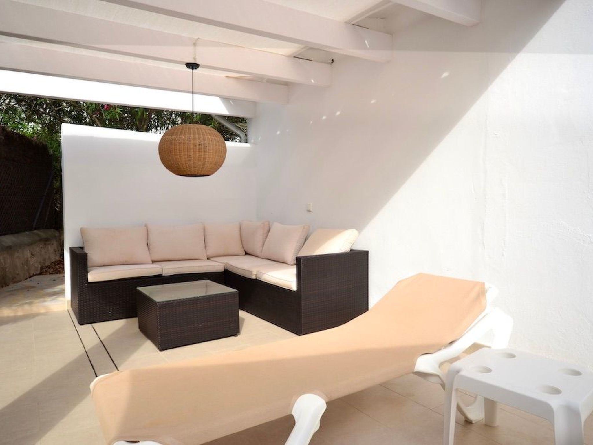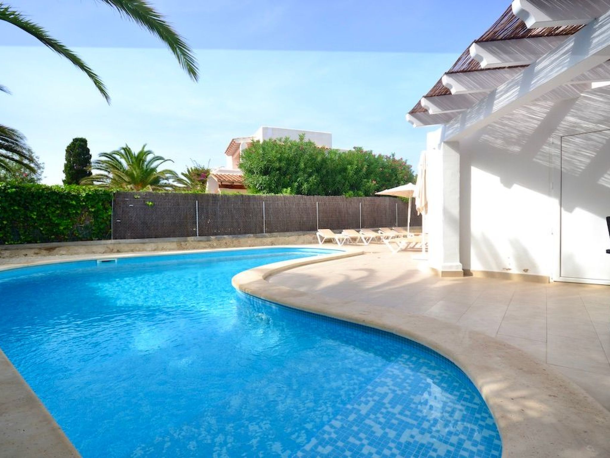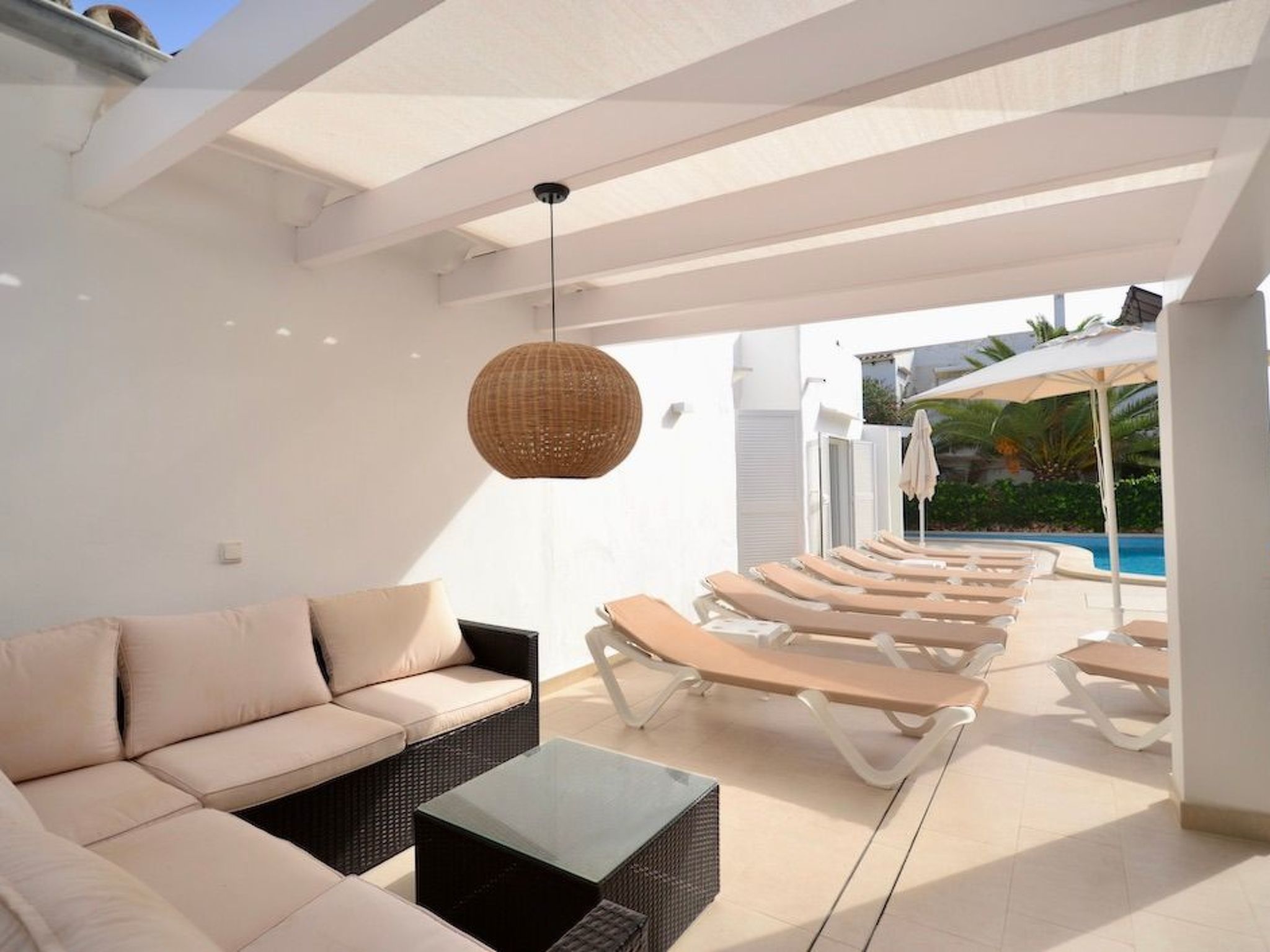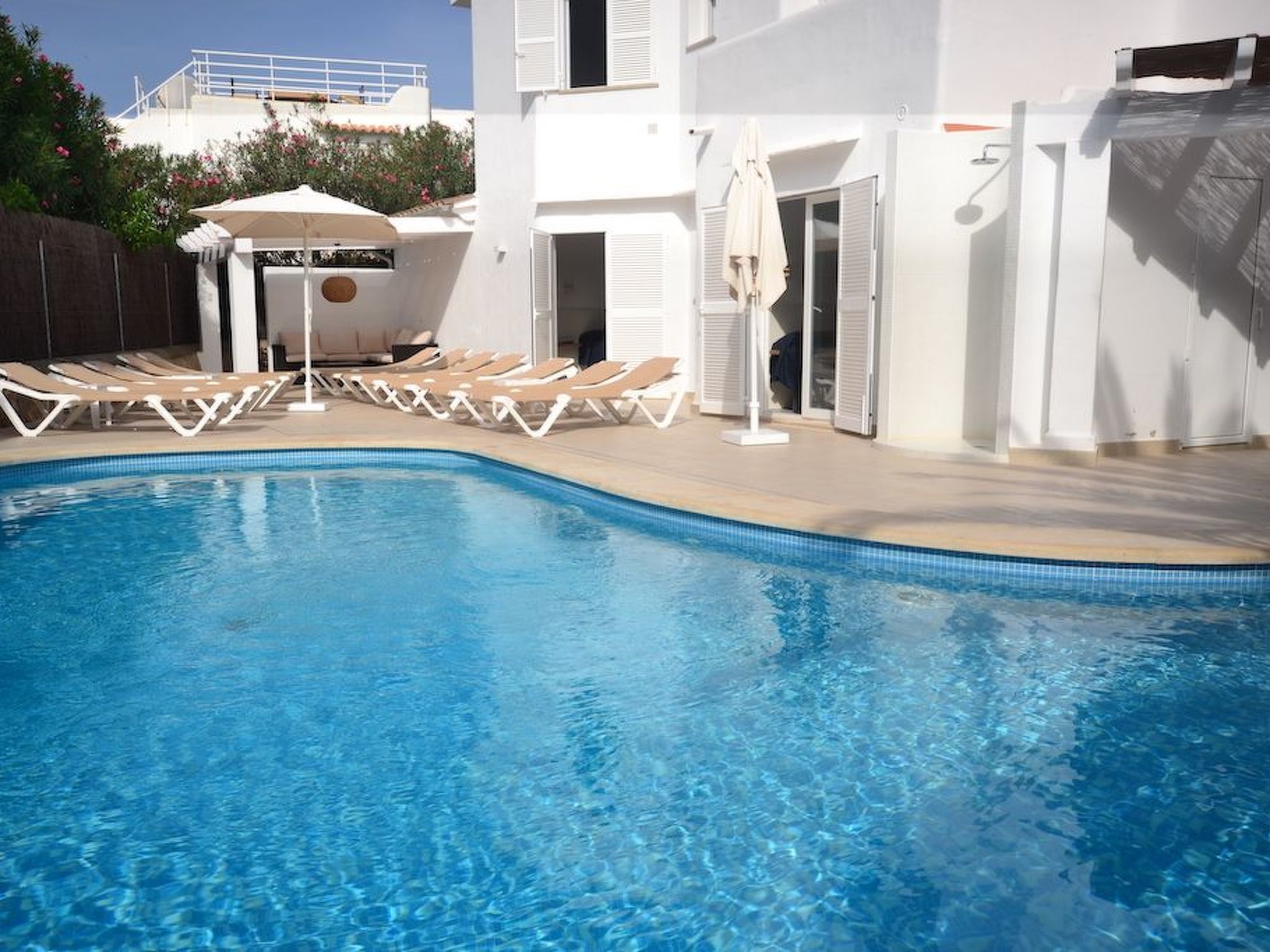 À l'avant, il y a un grand jardin. Deux véhicules peuvent être garés sur le chemin d'accès latéral. La piscine, de forme originale avec des marches en briques, se trouve à l'arrière de la maison. D'un côté de la piscine se trouve un espace couvert avec une table et des chaises ainsi qu'un barbecue à gaz Weber, afin de pouvoir savourer les repas "al fresco". De l'autre côté de la piscine se trouve une pergola avec un petit coin chill-out. Un local de service avec machine à laver se trouve également à l'arrière de la maison.