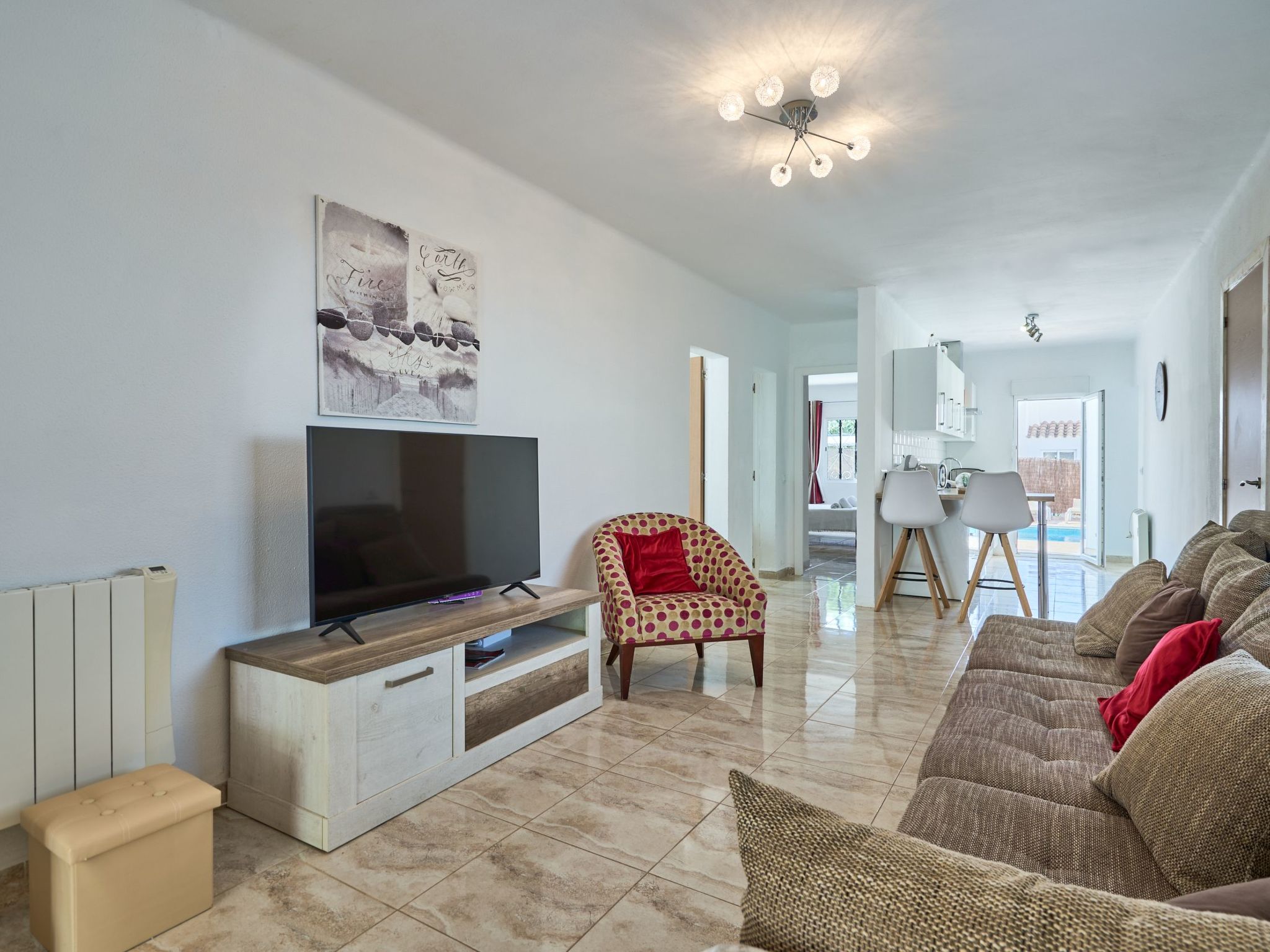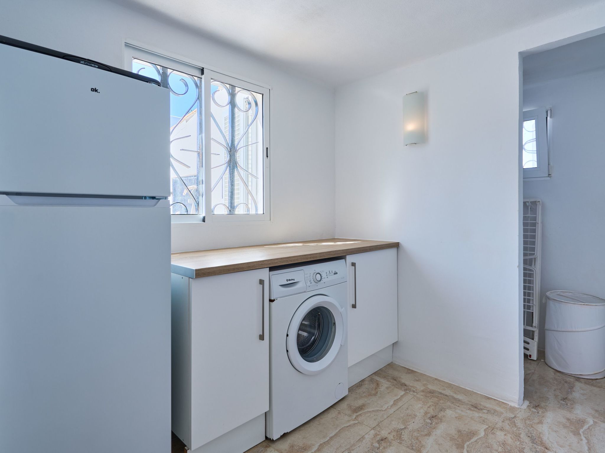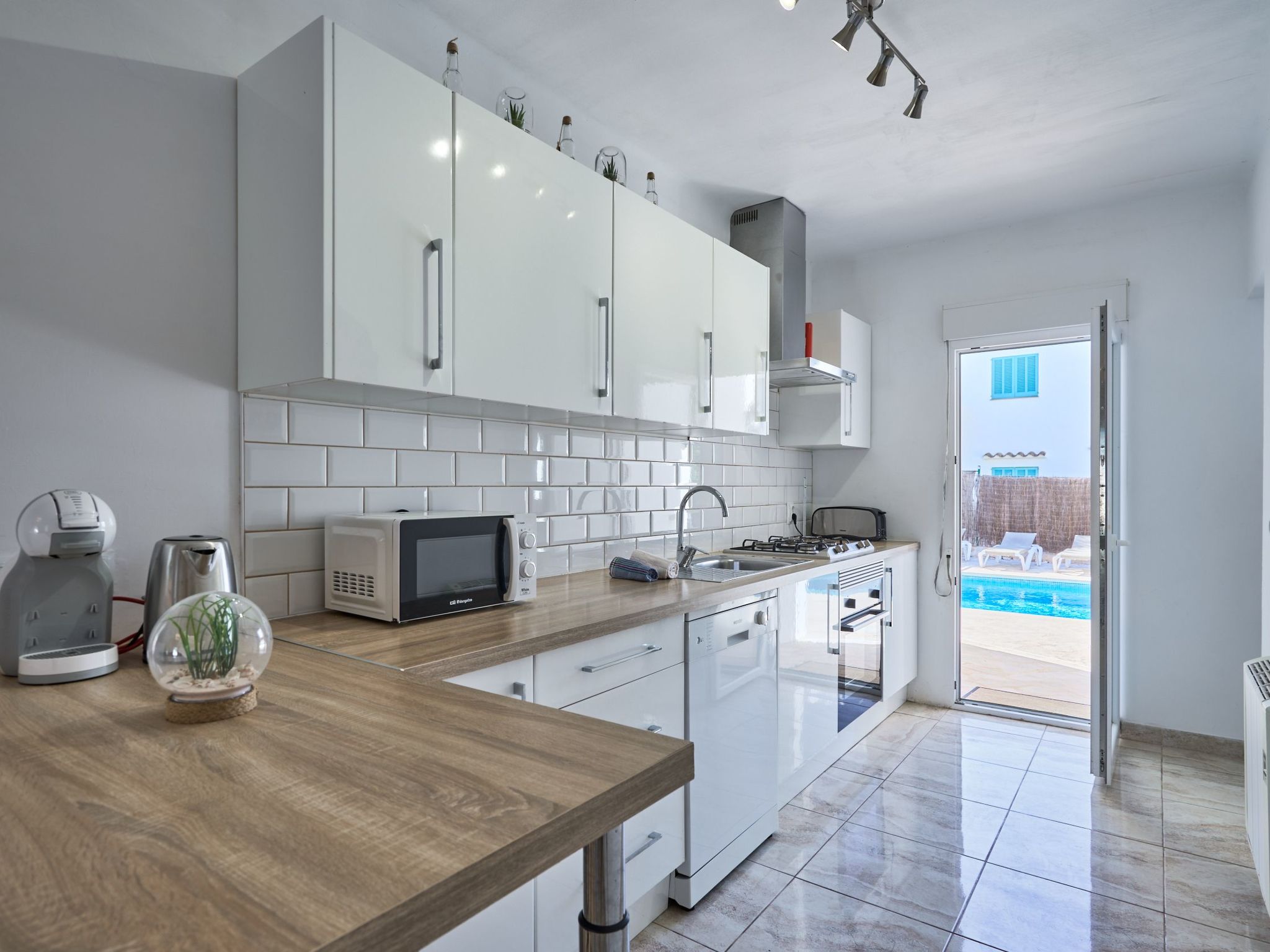 The renovated Fleming holiday home is distributed over two floors. Directly from the entrance of the house we find an open space with the dining table on the left, the living area with Smart TV and the directly adjacent open-plan kitchenette. From here you have access to the rear of the house, where you will find the refreshing pool with sun loungers, a beautifully designed outdoor area under a porch and the brick-built charcoal barbecue. The kitchen also leads to the utility room, where the fridge and washing machine are located.