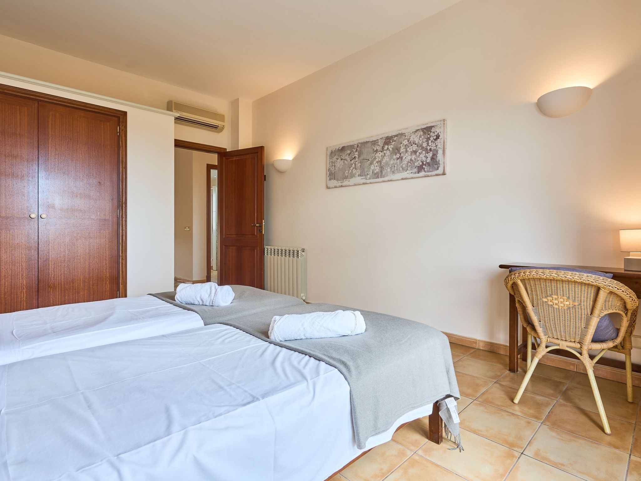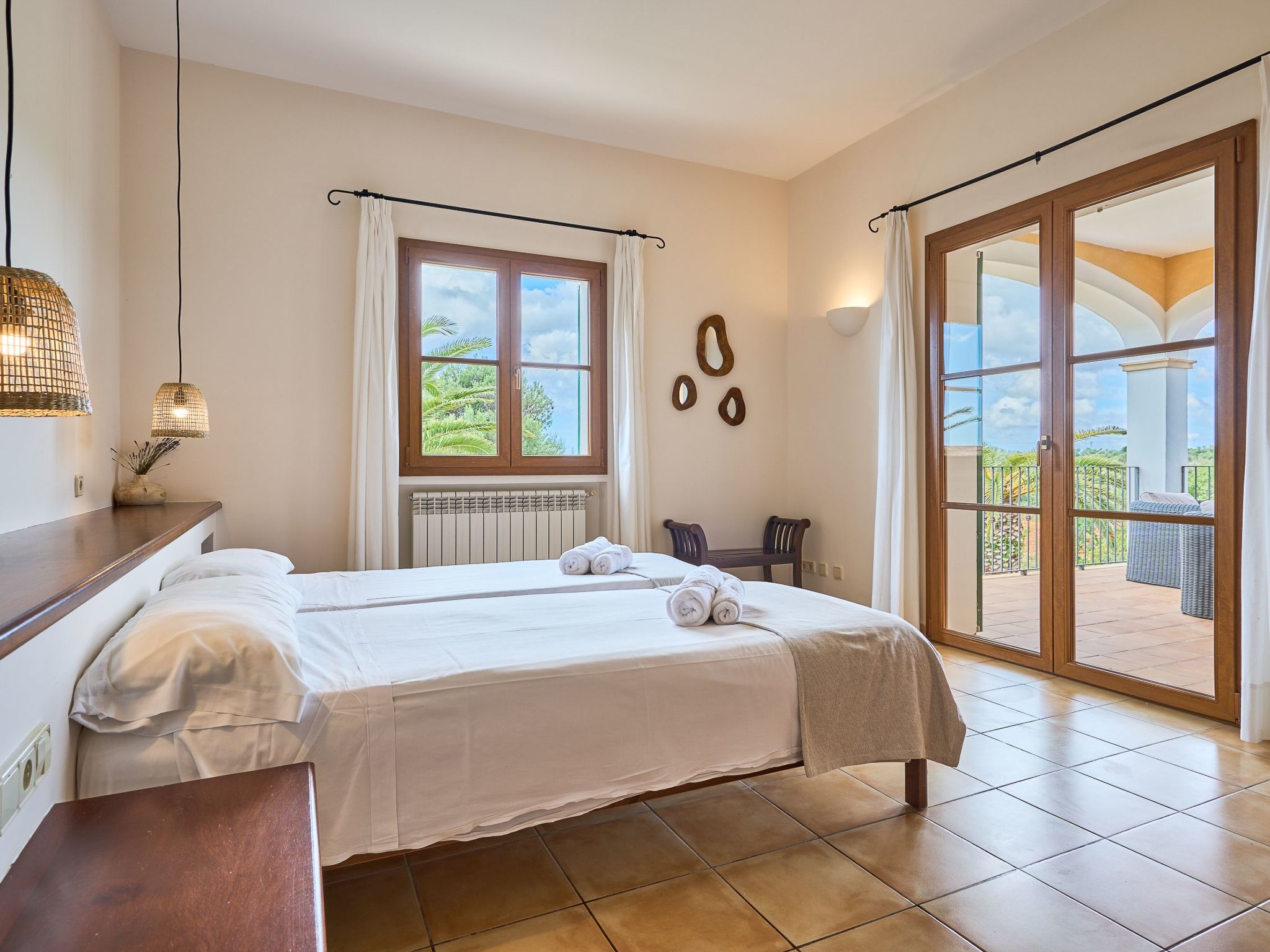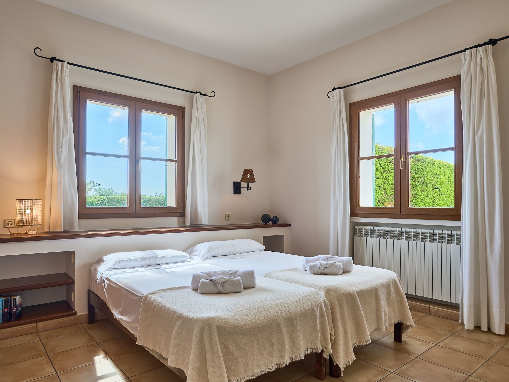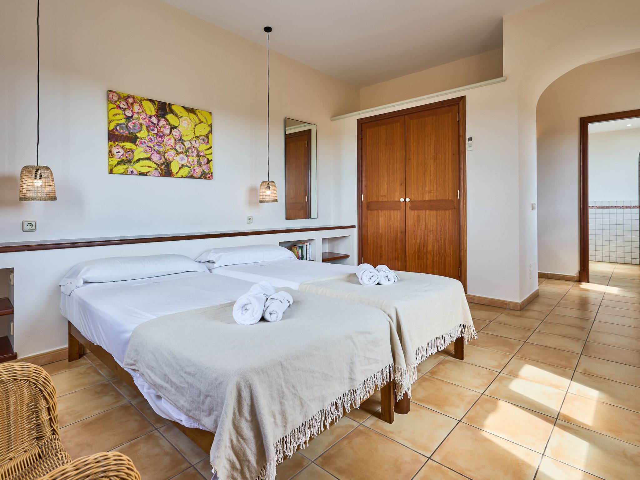 We also find two bedrooms with two single beds - one bedroom with a covered terrace with armchairs and sofa - that share an adjoining full bathroom with shower.