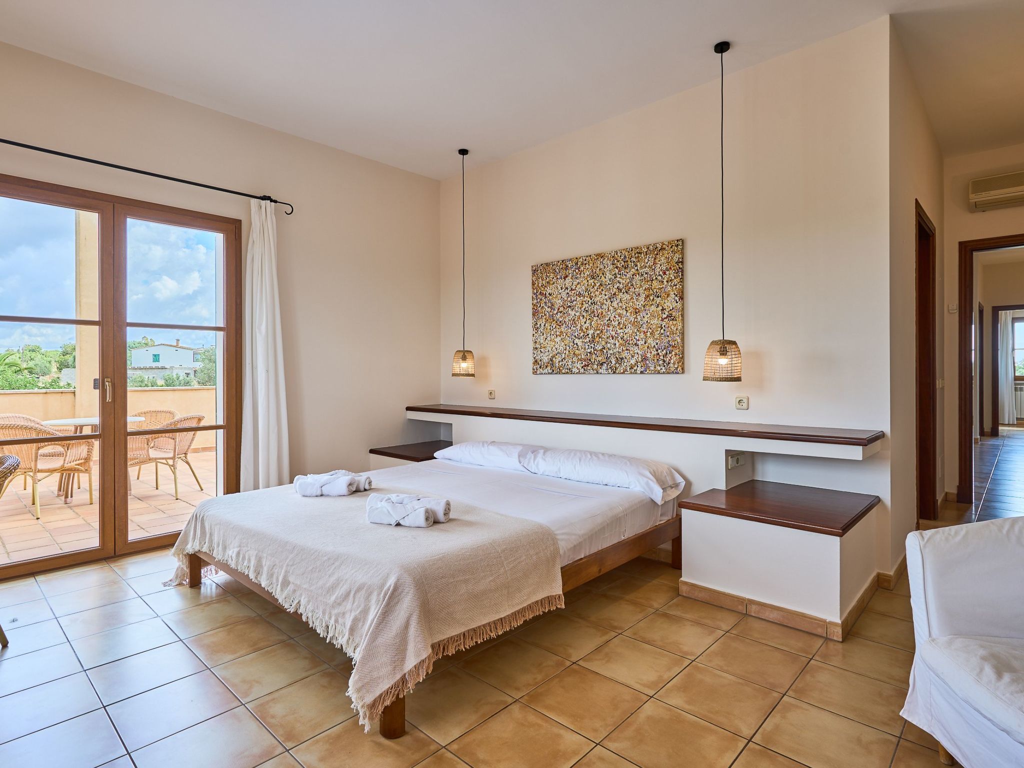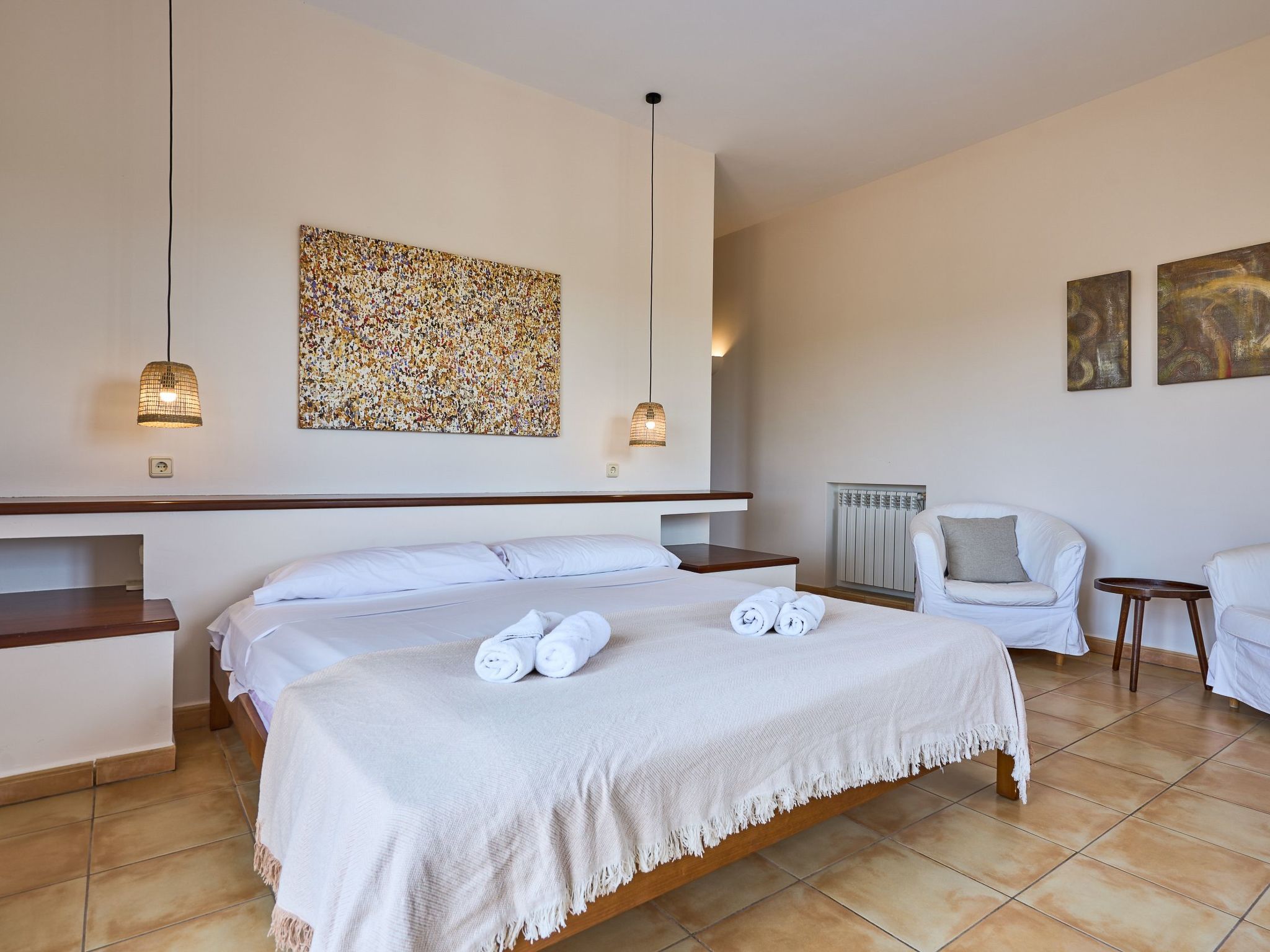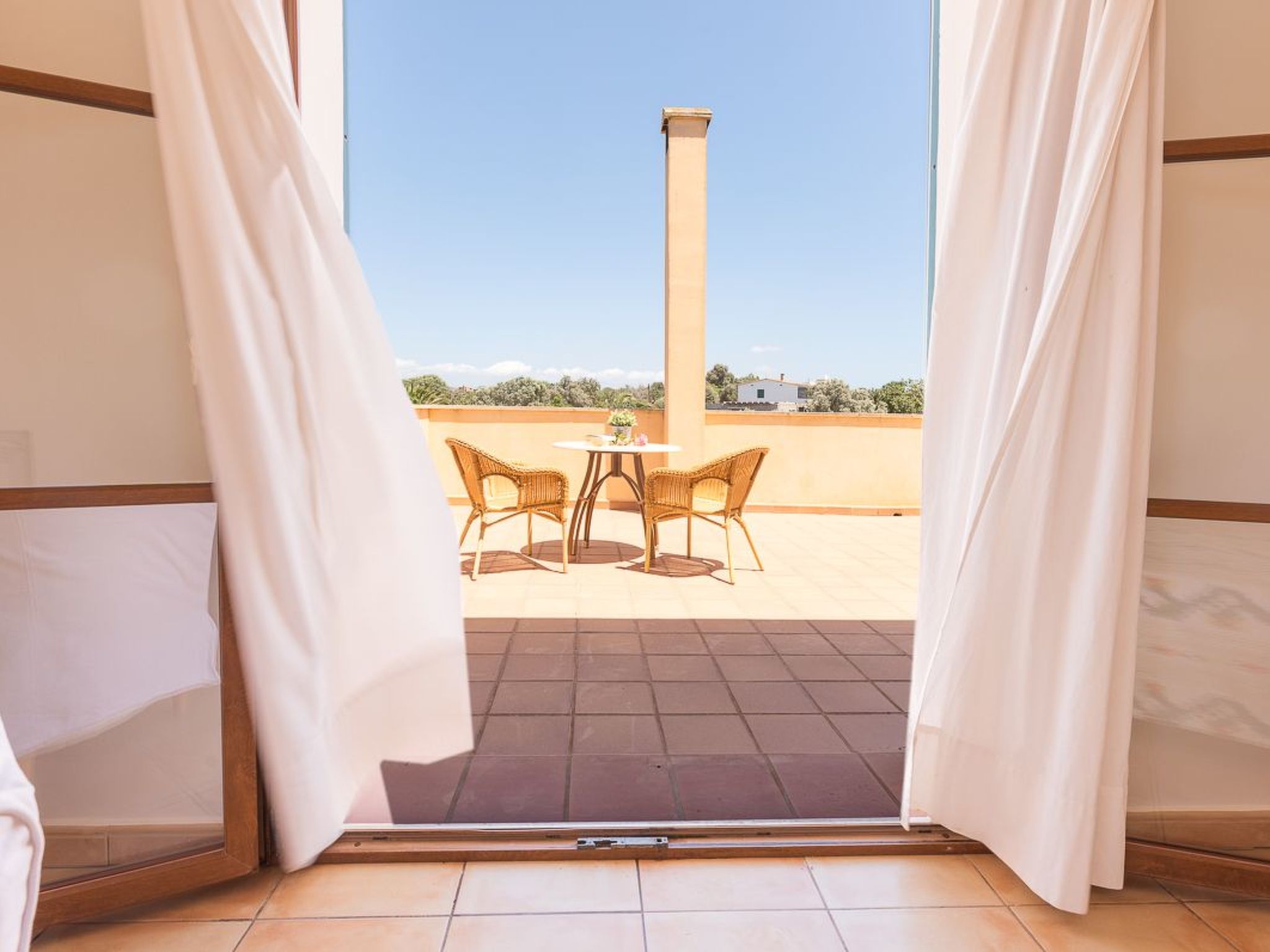 We also find two bedrooms with two single beds - one bedroom with a covered terrace with armchairs and sofa - that share an adjoining full bathroom with shower.