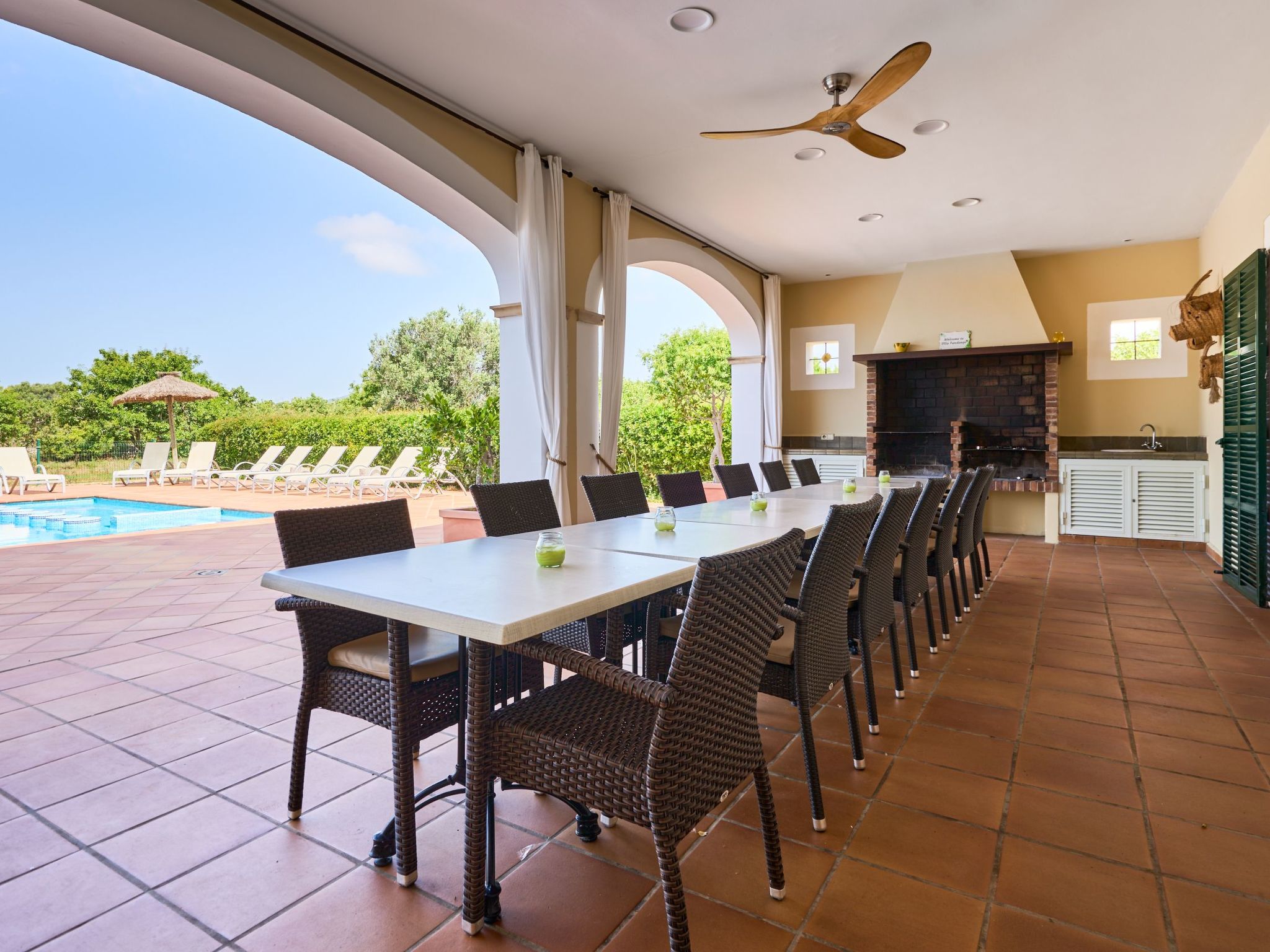 Covered terrace with dining area and brick barbecue. Bathroom near the pool with shower. Lovely pool with separate children's pool and terrace with sun loungers and lawn.
