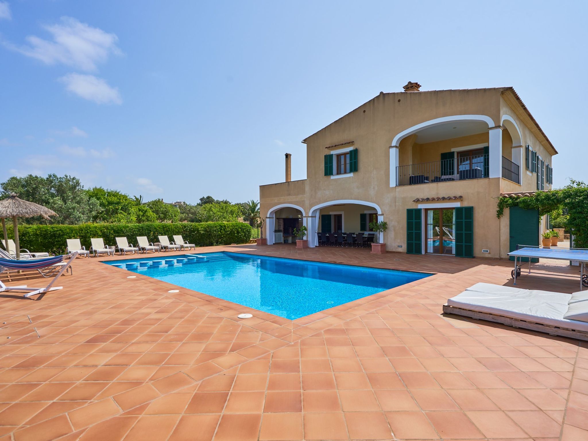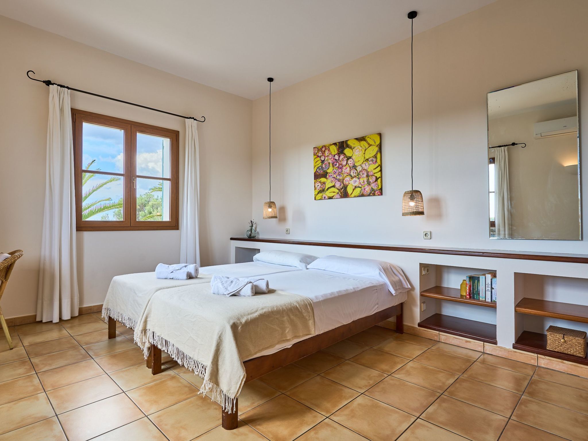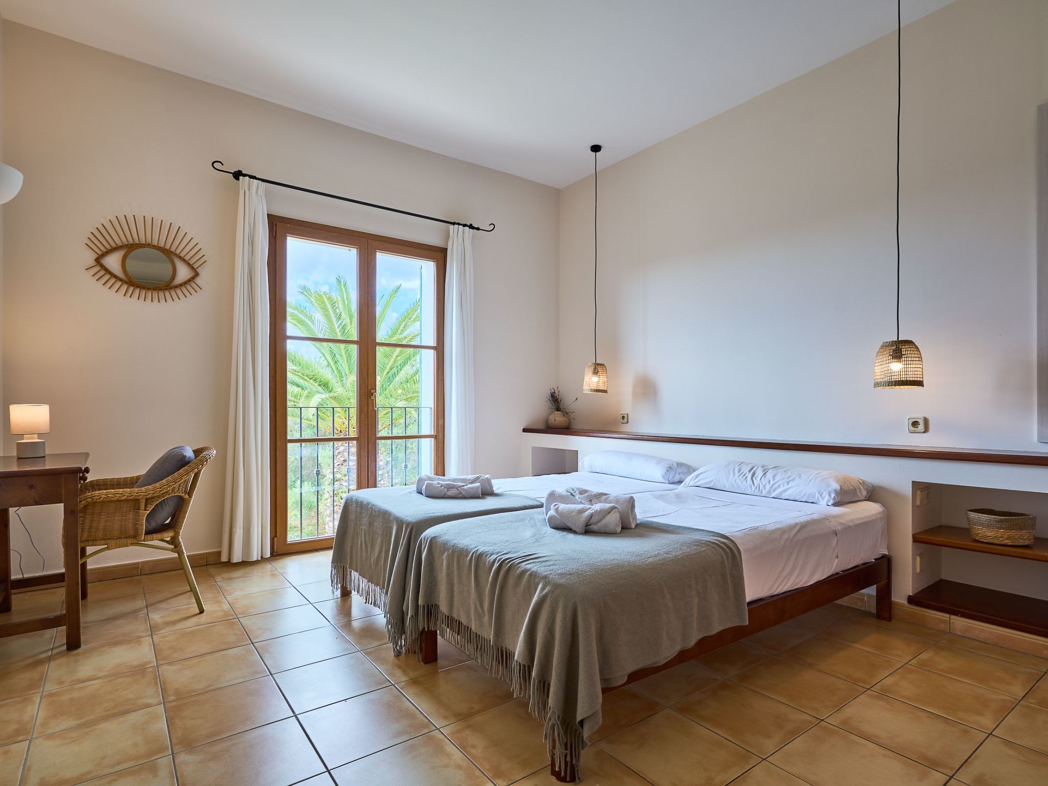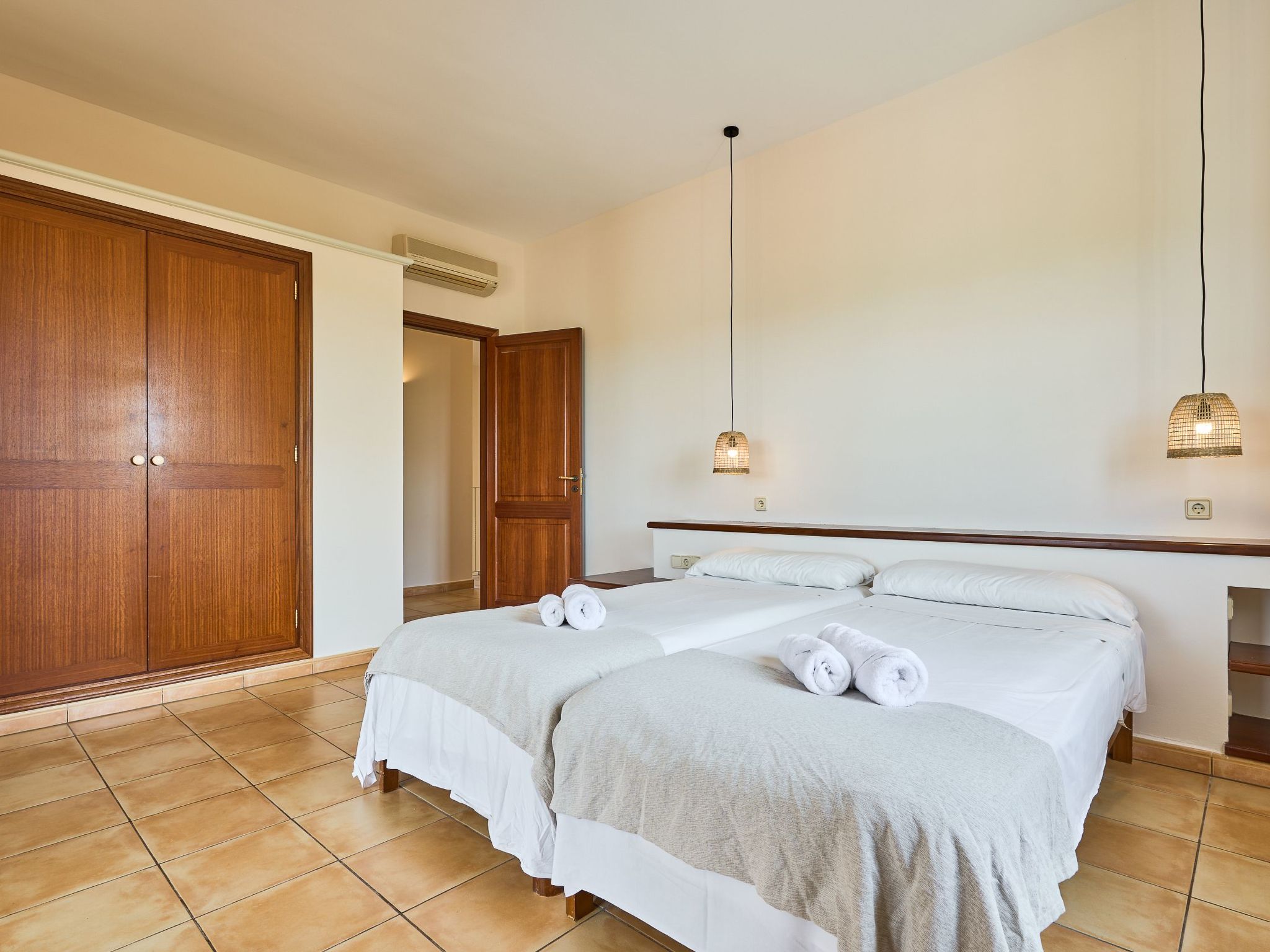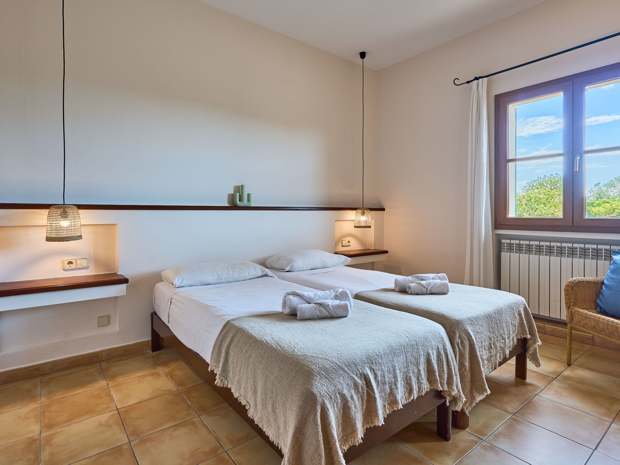The finca extends generously over two floors. On the ground floor there is a large living/dining room with sofas and an oak dining table. Access to the pool terrace. Fully equipped kitchen, breakfast table and pantry with additional fridge. Exit to the covered terrace with barbecue. Laundry room. On the ground floor there are two bedrooms with two single beds each and a bathroom.