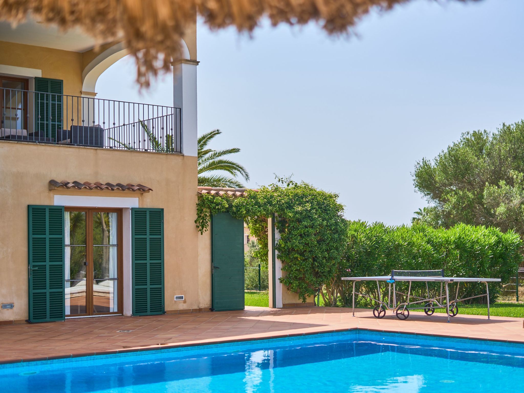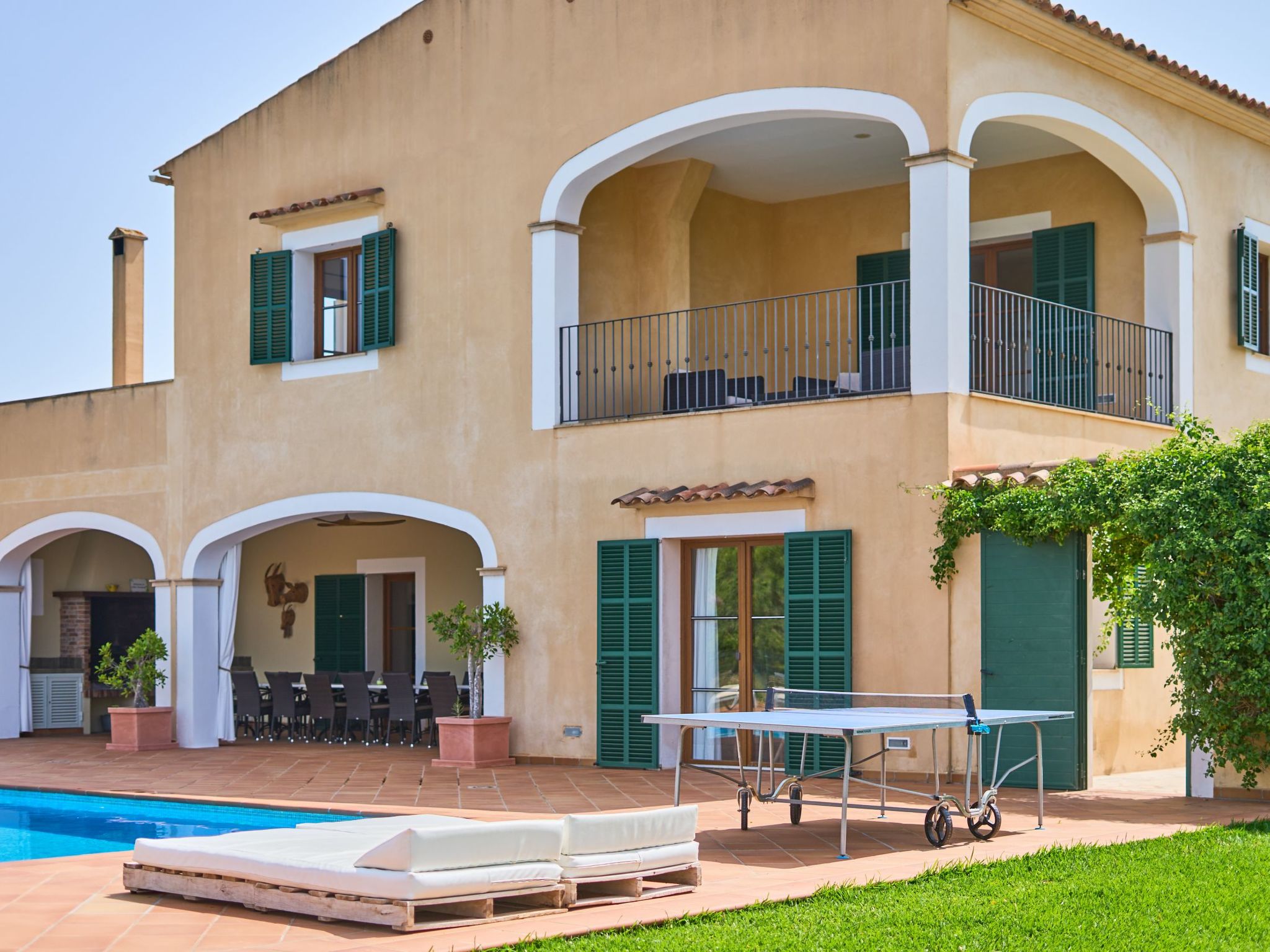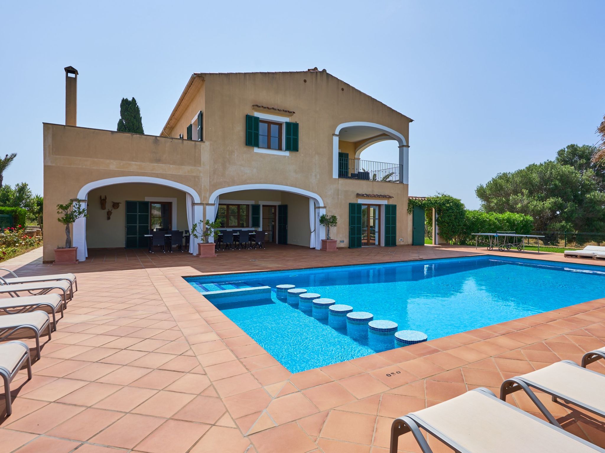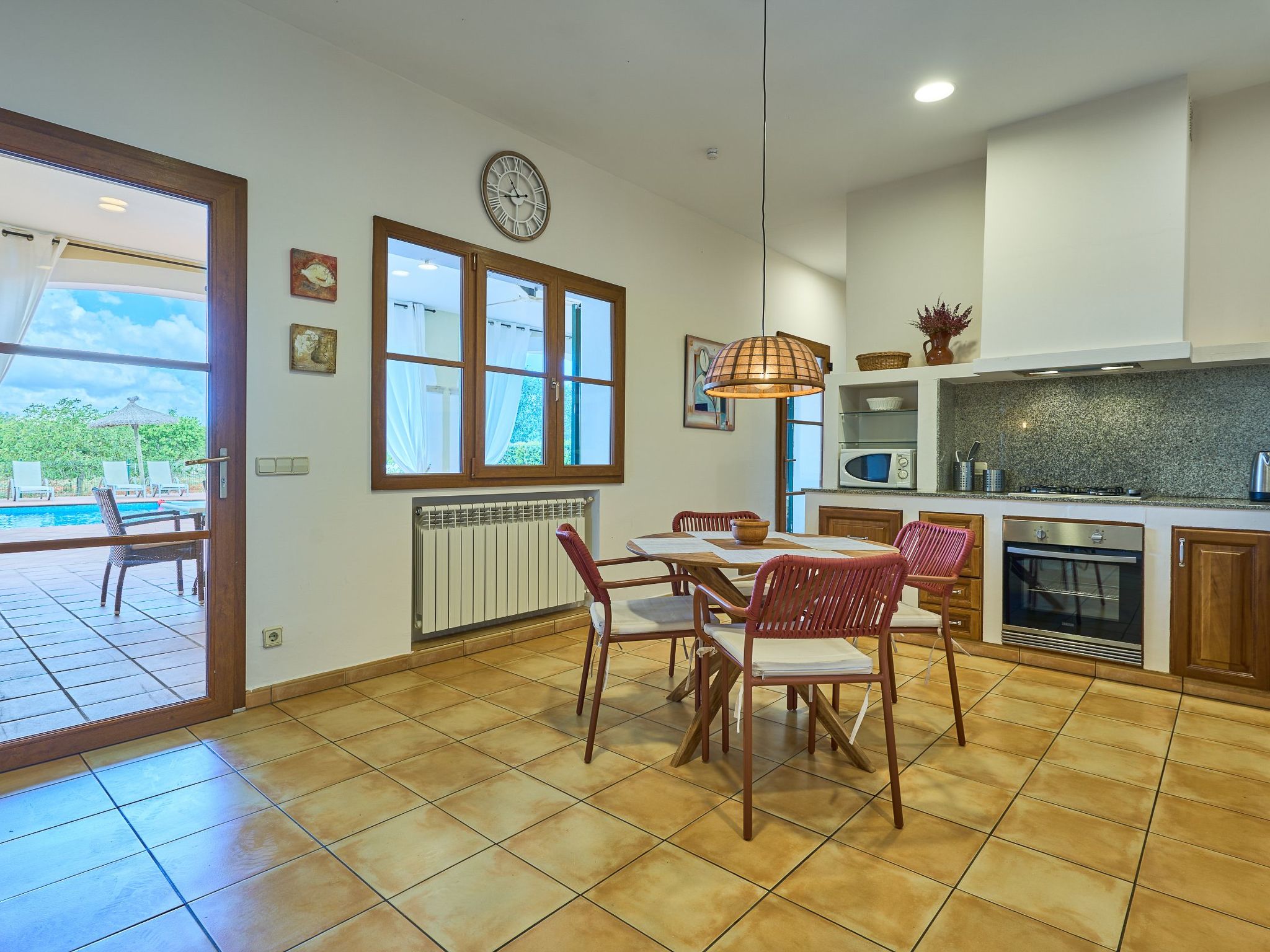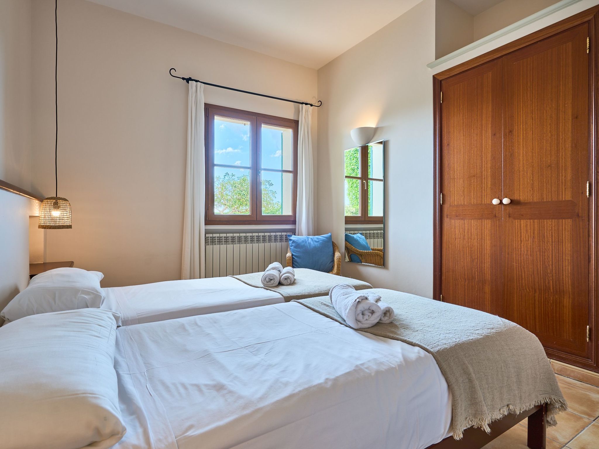 The finca extends generously over two floors. On the ground floor there is a large living/dining room with sofas and an oak dining table. Access to the pool terrace. Fully equipped kitchen, breakfast table and pantry with additional fridge. Exit to the covered terrace with barbecue. Laundry room. On the ground floor there are two bedrooms with two single beds each and a bathroom.