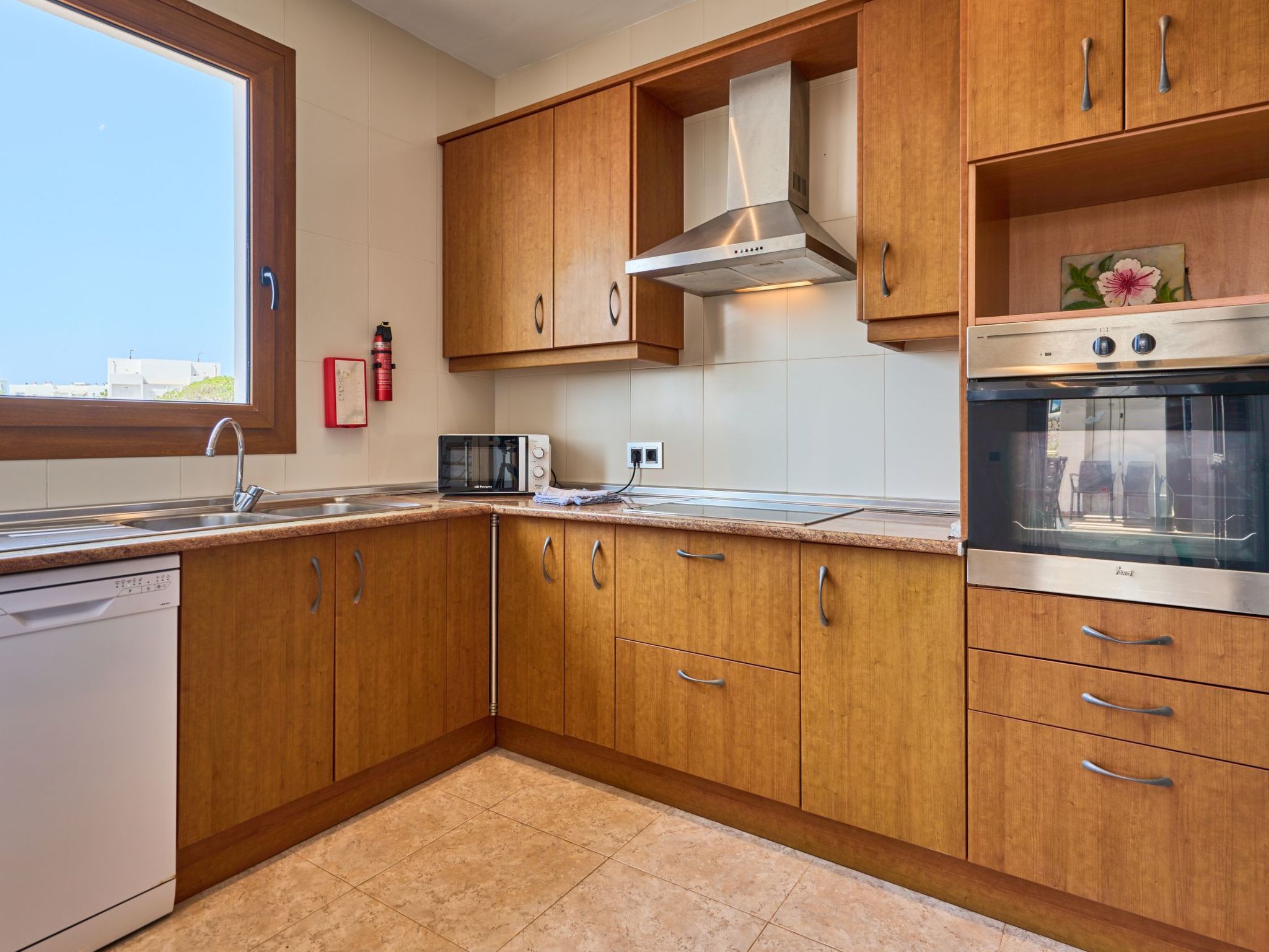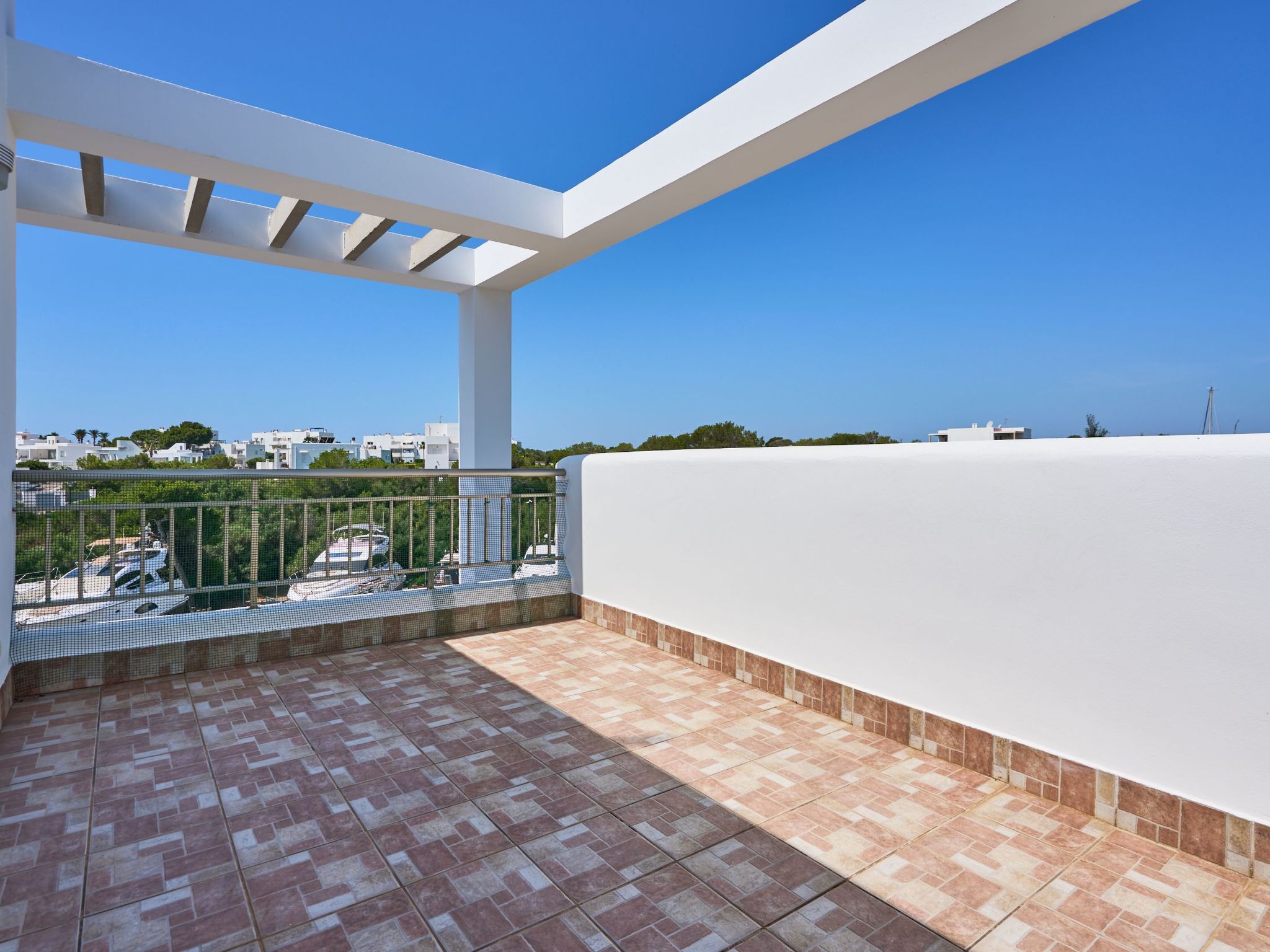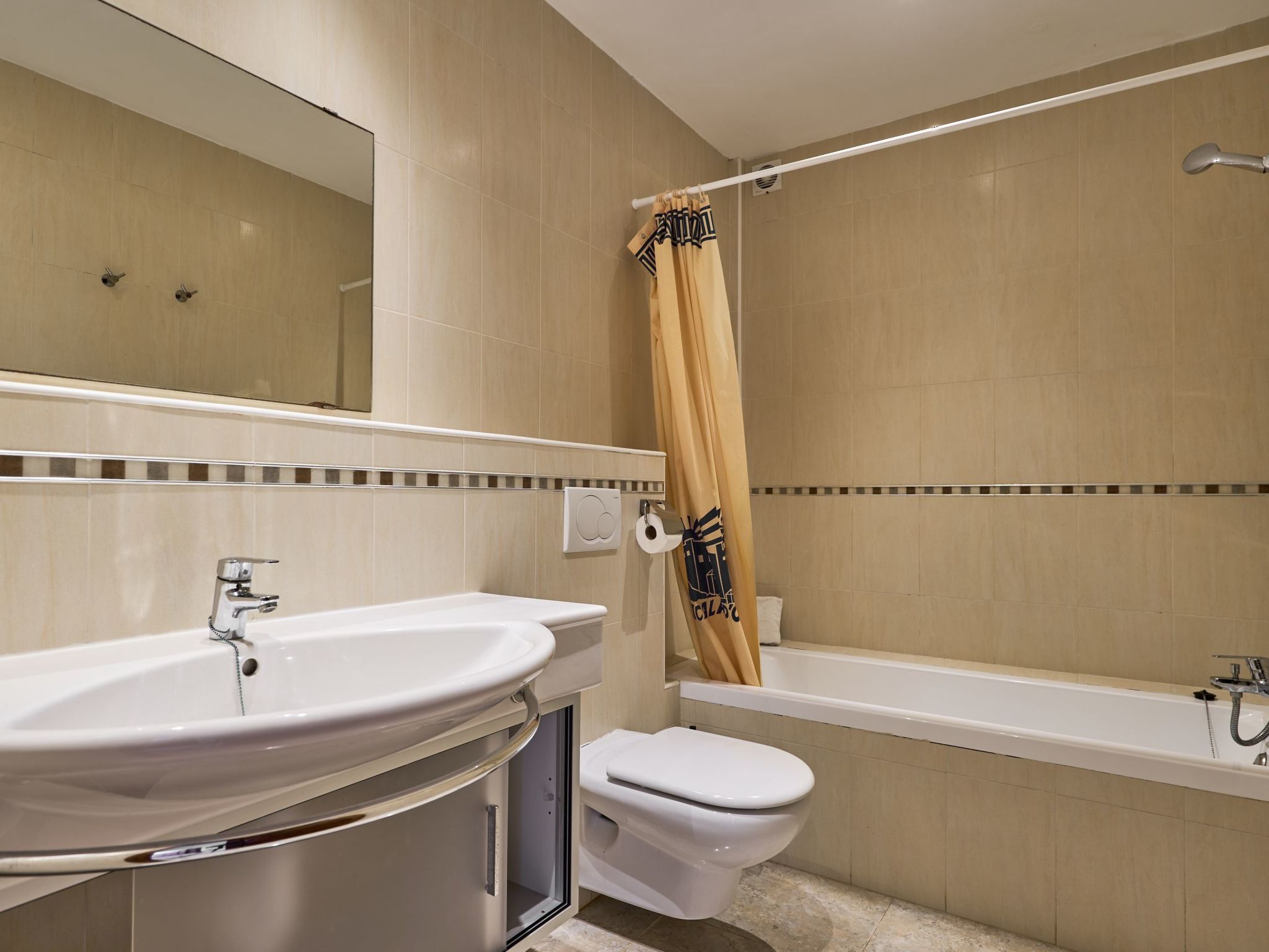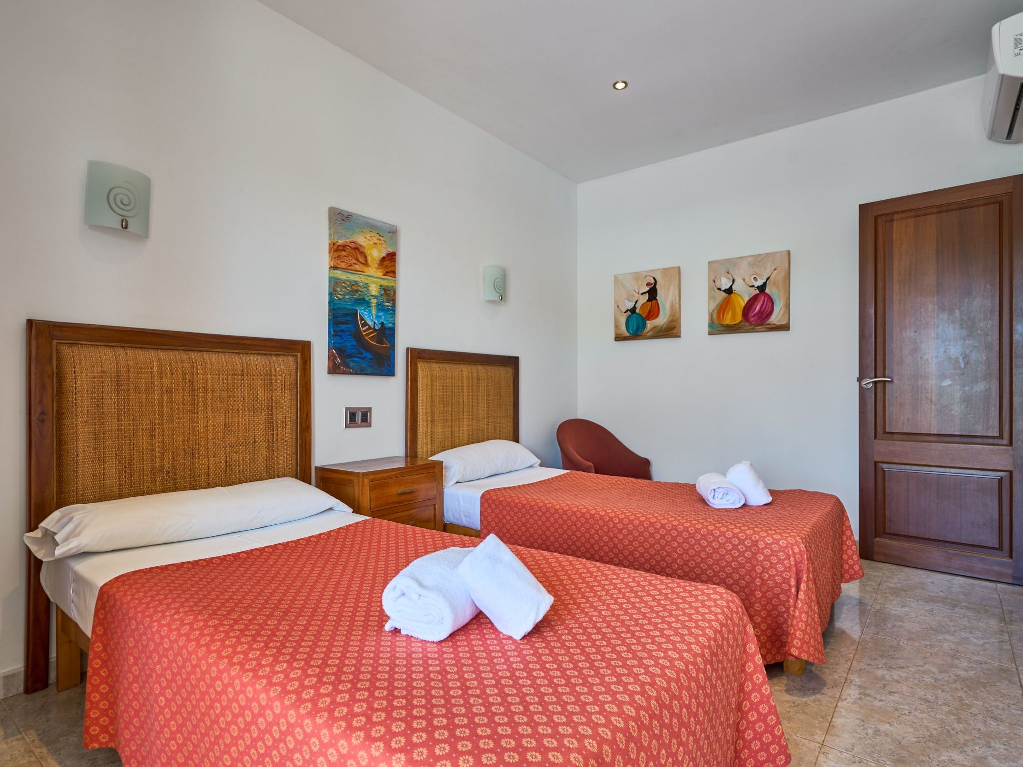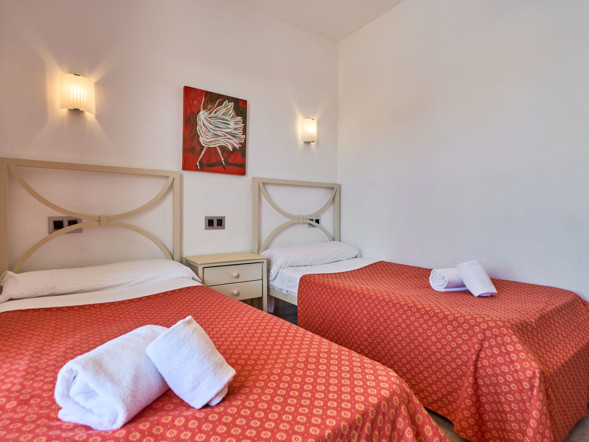 Semi-detached house on three floors. A few steps lead to the entrance of the villa on the ground floor (middle floor). On this level there is an open-plan dining room with access to the terrace. Kitchen and laundry room are accessible from the dining room. Guest toilet. A staircase leads to the floor where there is a bedroom with two single beds and an ensuite bathroom with shower. This bedroom has access to two terraces. On the lower floor there is a double bedroom with en-suite bathroom with shower and two twin bedrooms sharing a separate bathroom with bathtub. These bedrooms have access to the pool terrace.