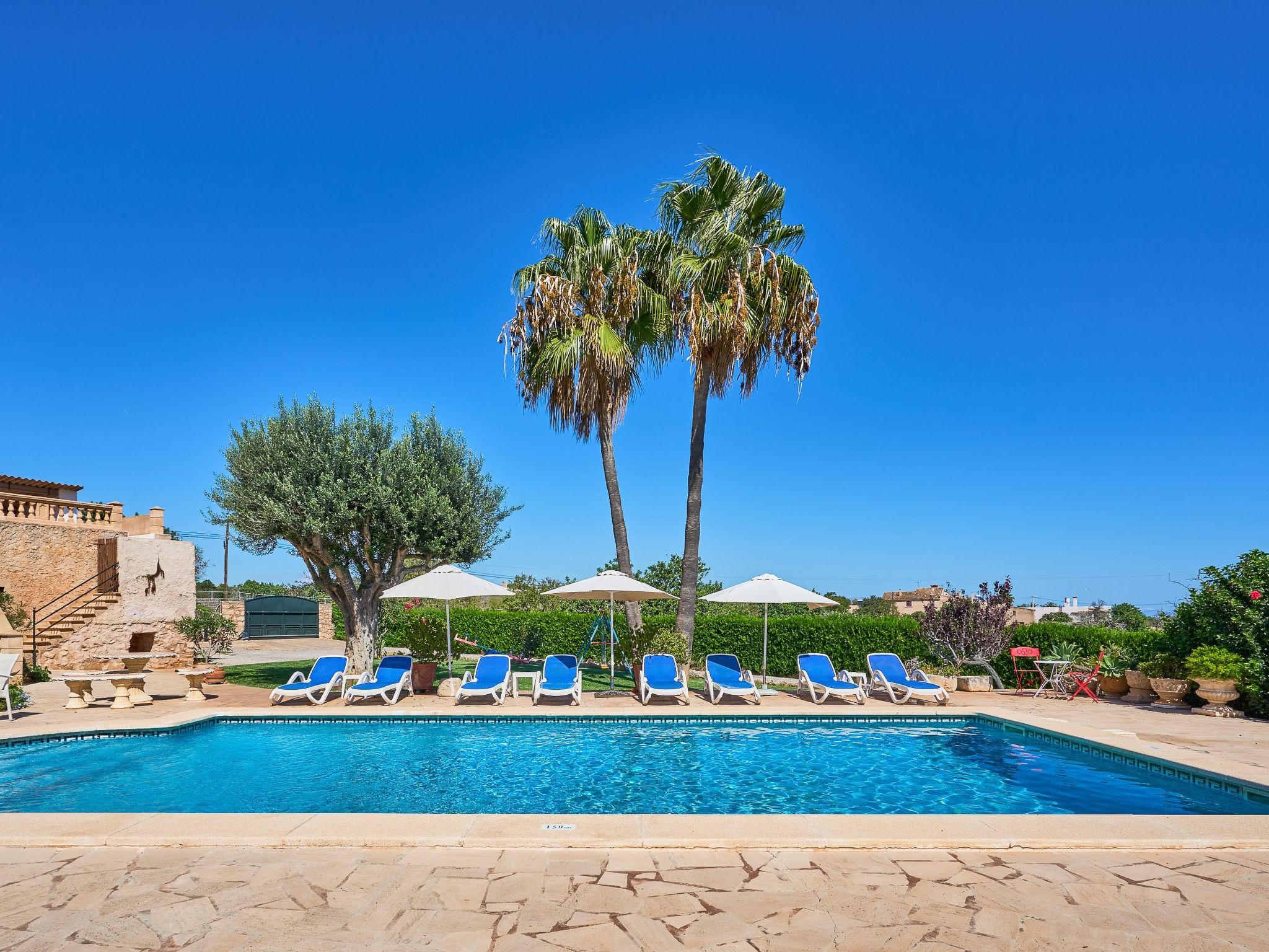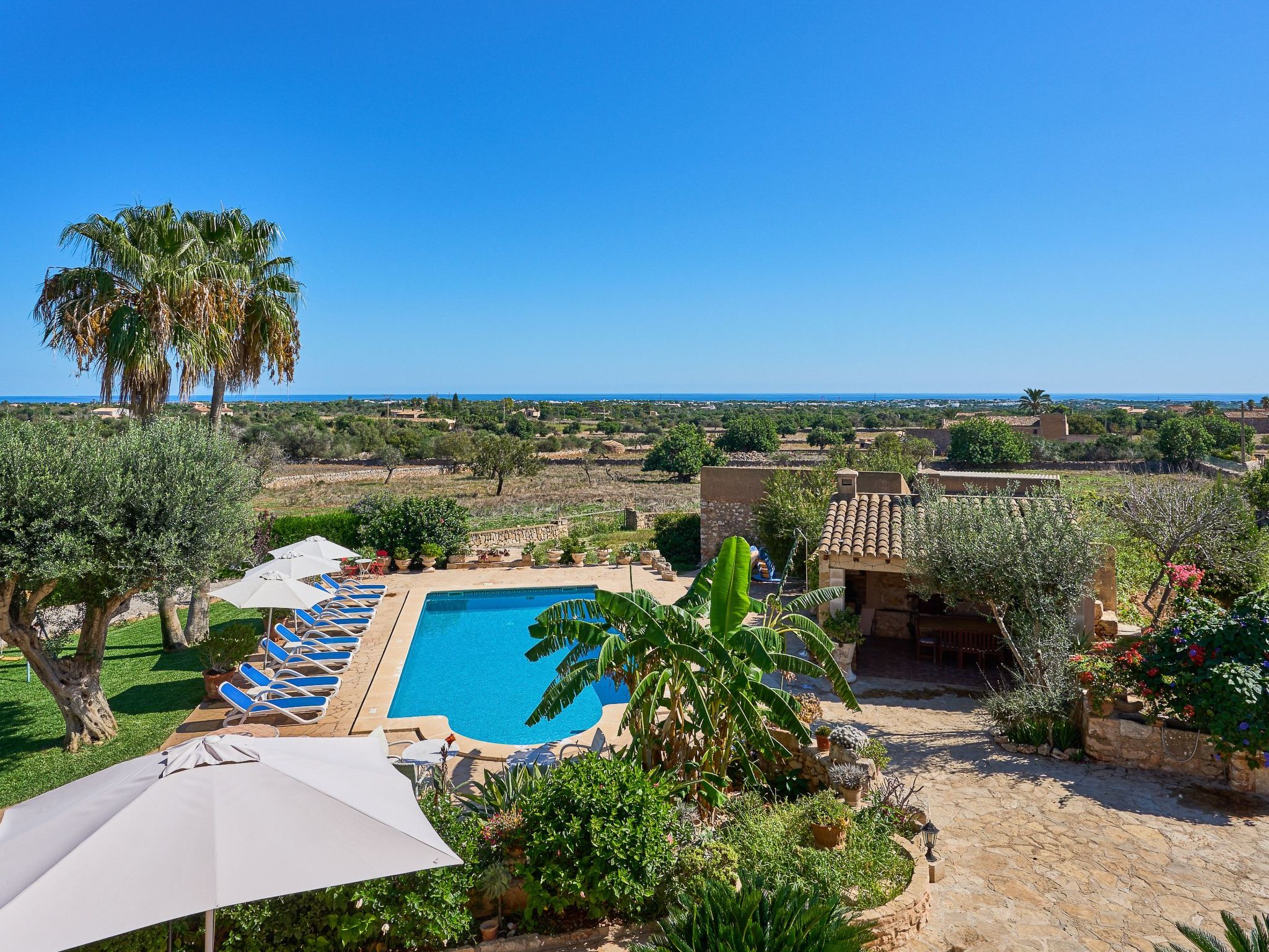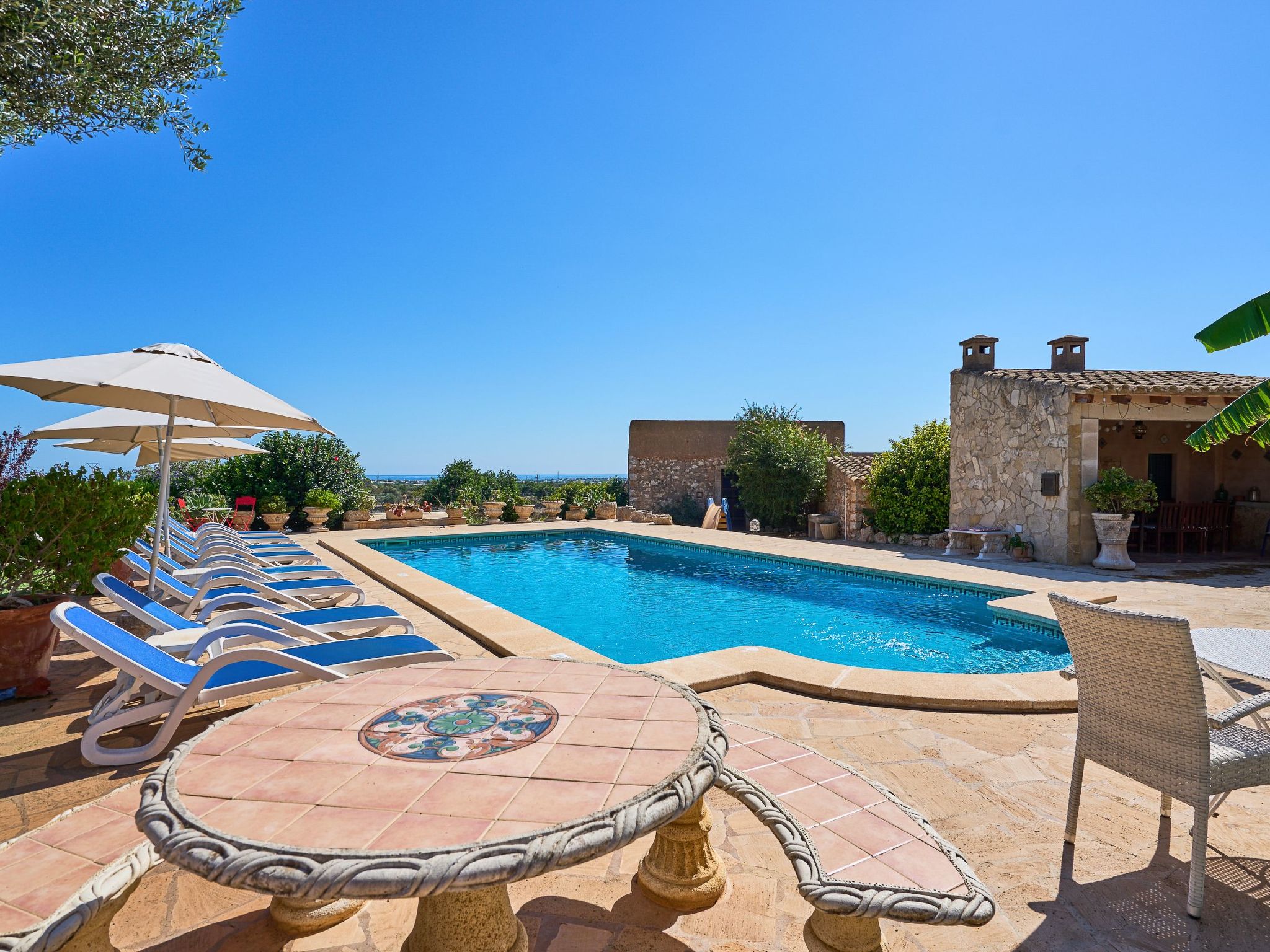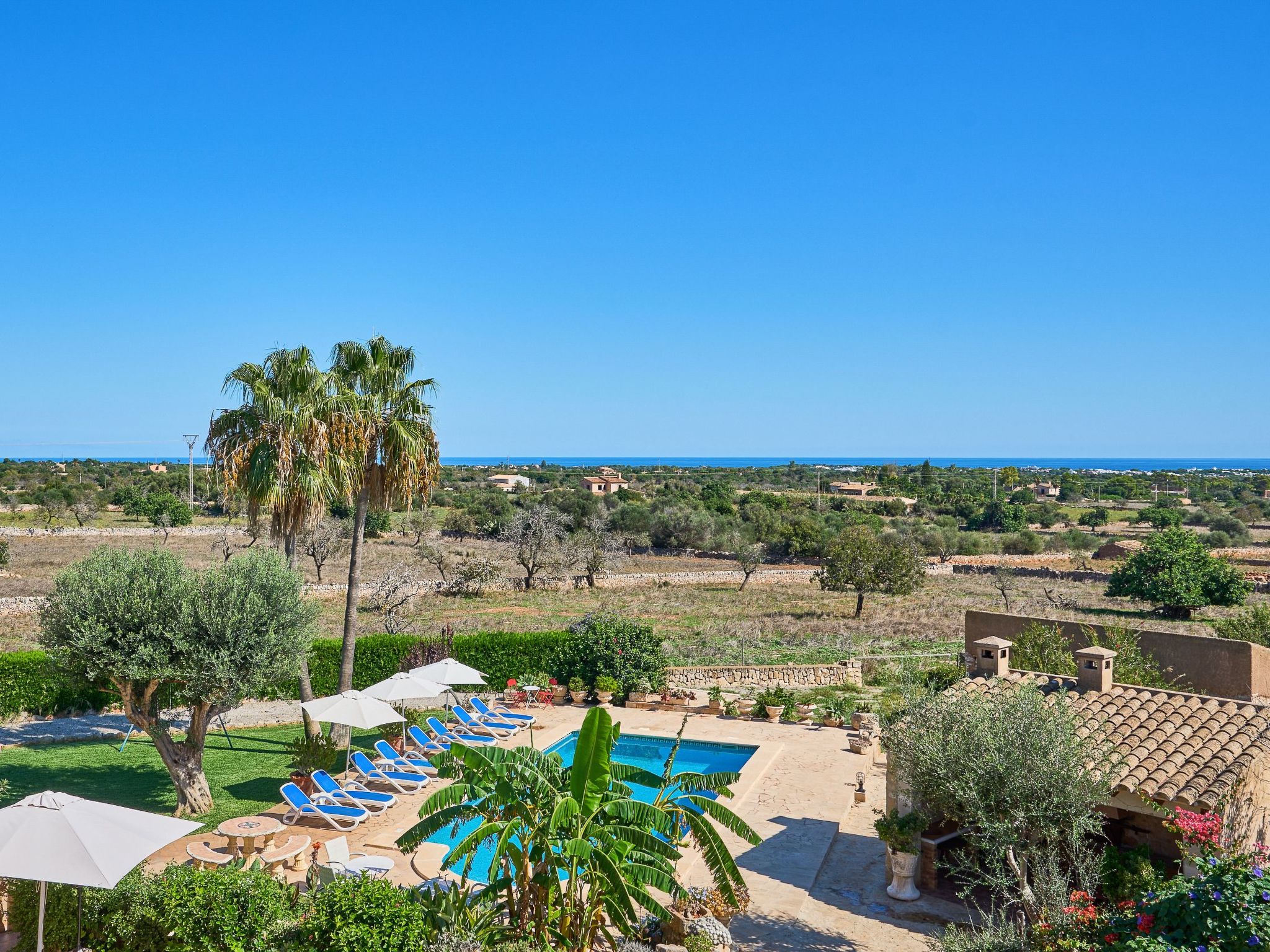 Le bel espace extérieur spacieux offre de l'intimité et est agrémenté de pelouses, de grands palmiers et de plantes méditerranéennes. La grande piscine avec des marches romaines (10m x 5m et min. 1.2m à max. 2.00m de profondeur) est entourée d'une terrasse ensoleillée qui invite à prendre des bains de soleil et à se détendre. Toute la terrasse offre une vue magnifique sur le paysage jusqu'à la mer bleue scintillante. Le coin bar avec barbecue maçonné et évier extérieur se trouve sous une terrasse couverte et ombragée. La grande table en bois rustique invite à de longues soirées barbecue dans l'air tiède de l'été. Pour les enfants, il y a une balançoire et une table de ping-pong. Plusieurs véhicules peuvent prendre place sur le terrain clos.