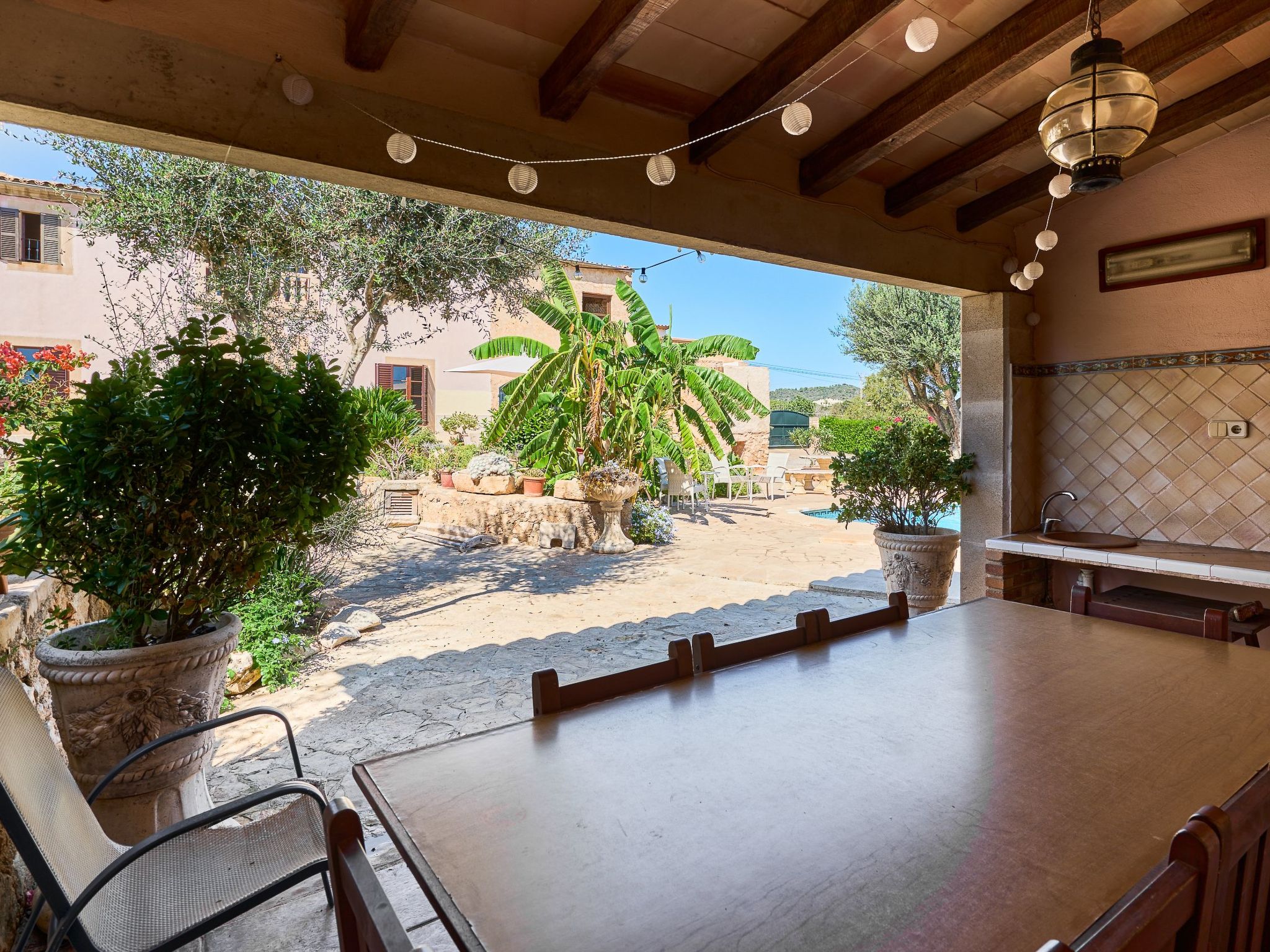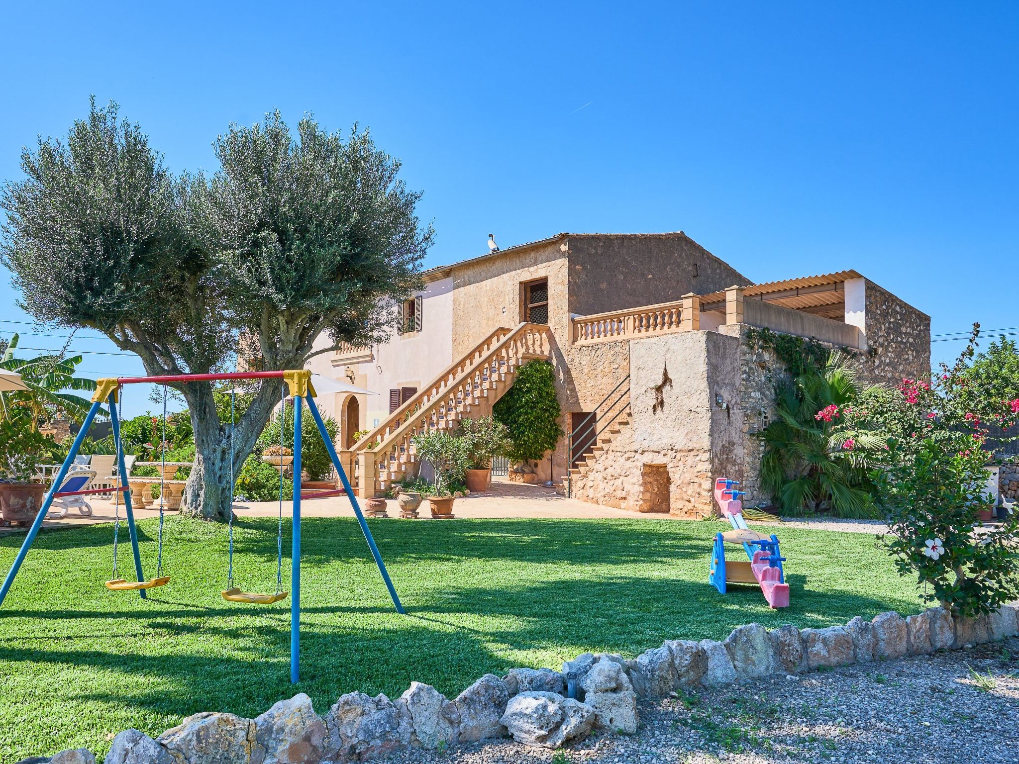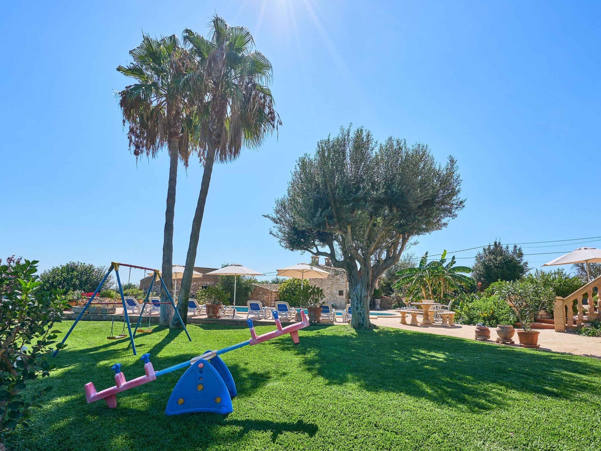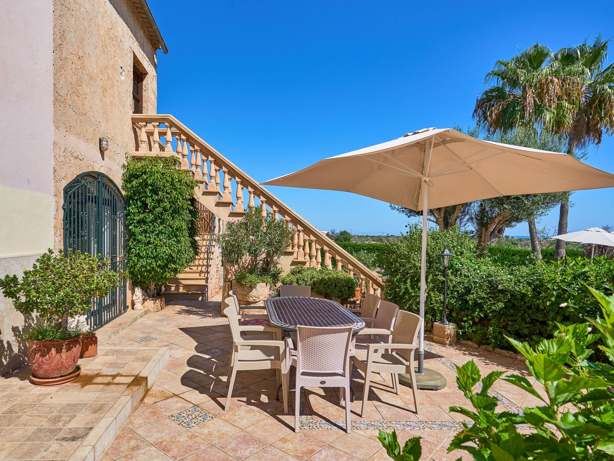 Le bel espace extérieur spacieux offre de l'intimité et est agrémenté de pelouses, de grands palmiers et de plantes méditerranéennes. La grande piscine avec des marches romaines (10m x 5m et min. 1.2m à max. 2.00m de profondeur) est entourée d'une terrasse ensoleillée qui invite à prendre des bains de soleil et à se détendre. Toute la terrasse offre une vue magnifique sur le paysage jusqu'à la mer bleue scintillante. Le coin bar avec barbecue maçonné et évier extérieur se trouve sous une terrasse couverte et ombragée. La grande table en bois rustique invite à de longues soirées barbecue dans l'air tiède de l'été. Pour les enfants, il y a une balançoire et une table de ping-pong. Plusieurs véhicules peuvent prendre place sur le terrain clos.