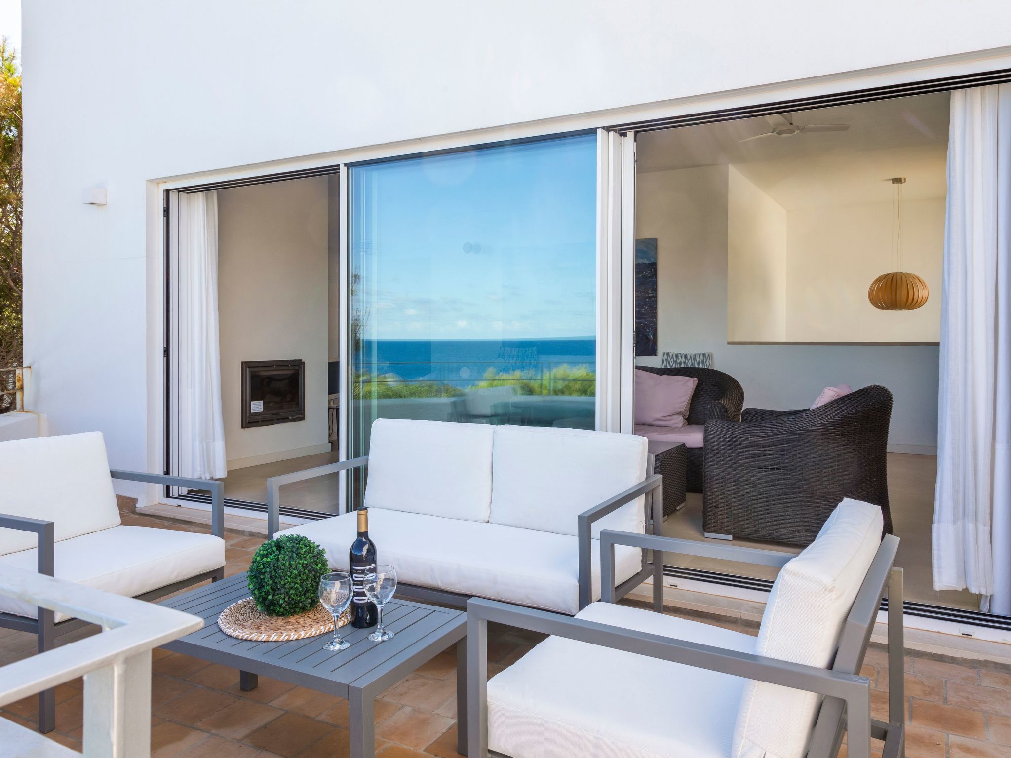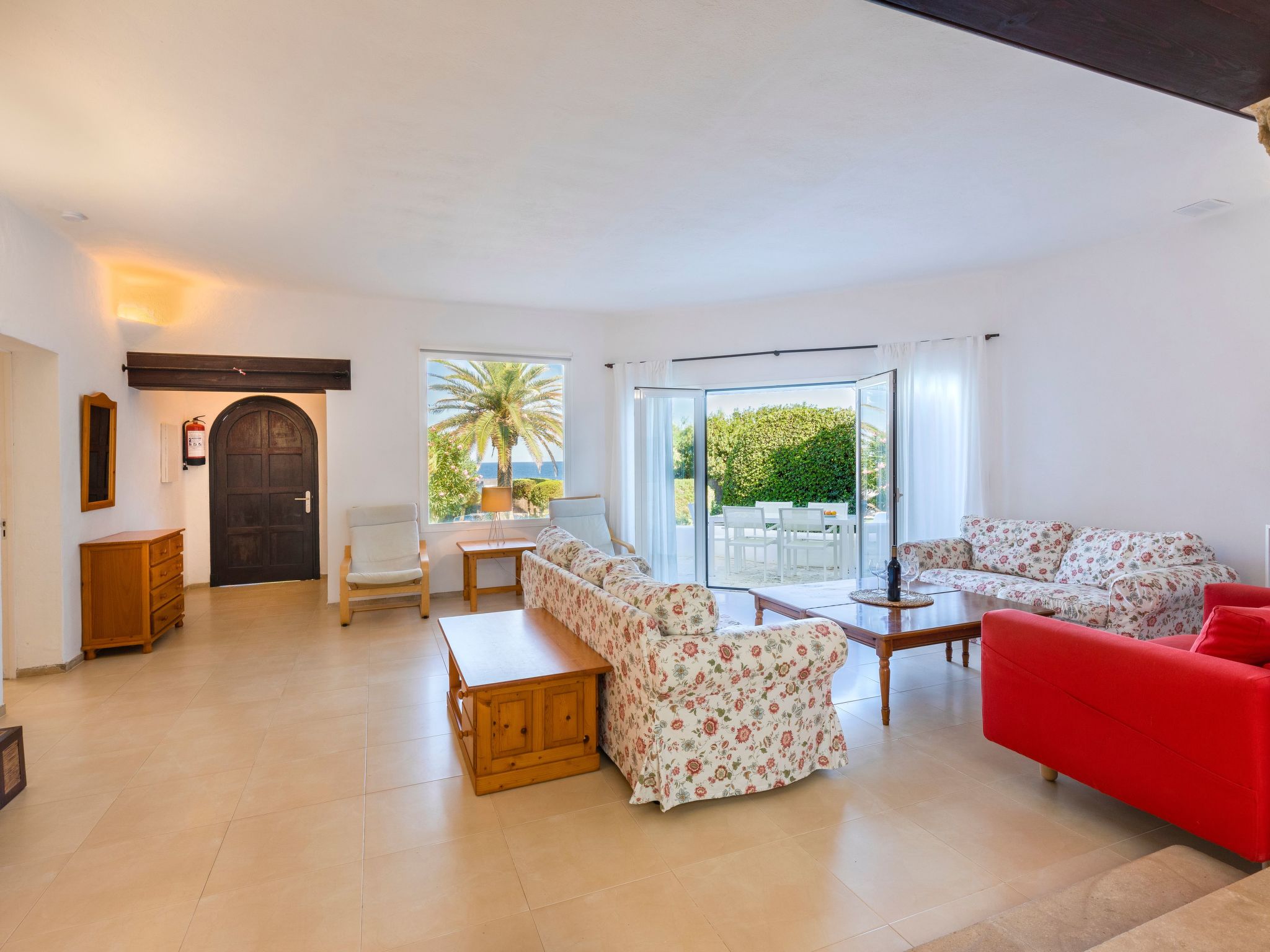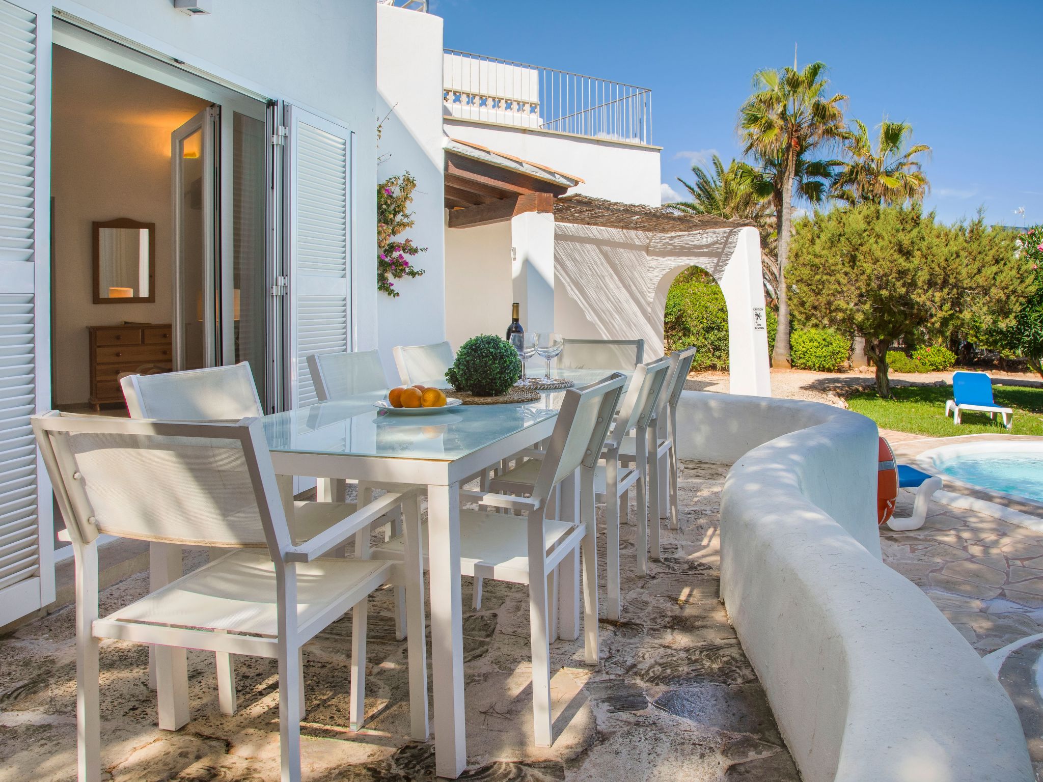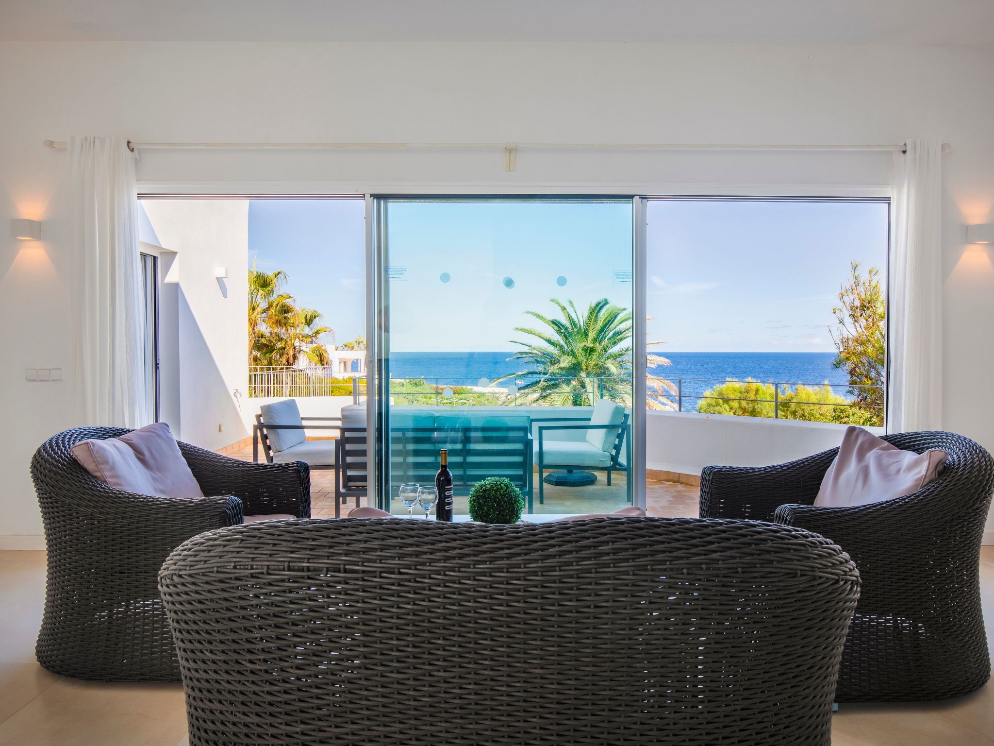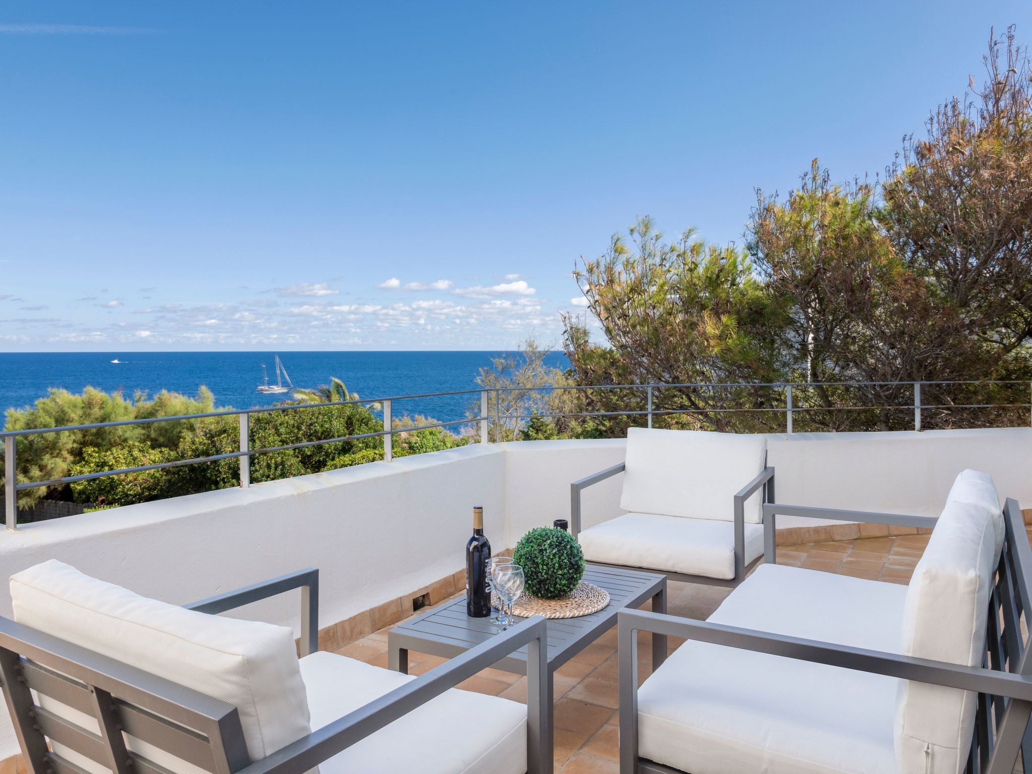 Villa Gran Mar is built in the old Ibizan style. A short path leads to the house through a small garden with a lawn. The entrance area leads into the spacious, bright and cosily furnished living/dining room. Patio doors open out to the pool area and a further private terrace, a perfect place for al fresco dining. You have a well-equipped modern kitchen. From the living room you enter a beautiful double bedroom with an en-suite shower room and access to the terrace and pool area. A further bedroom is located on the opposite side of the living room. Steps lead from the dining area to the floor. There is a seating area here. Large French windows allow you to enjoy the fantastic sea view and access to the terrace, which is also equipped with a seating area. From this living room there is access to the 3rd bedroom with en-suite shower room, which also has access to the terrace.