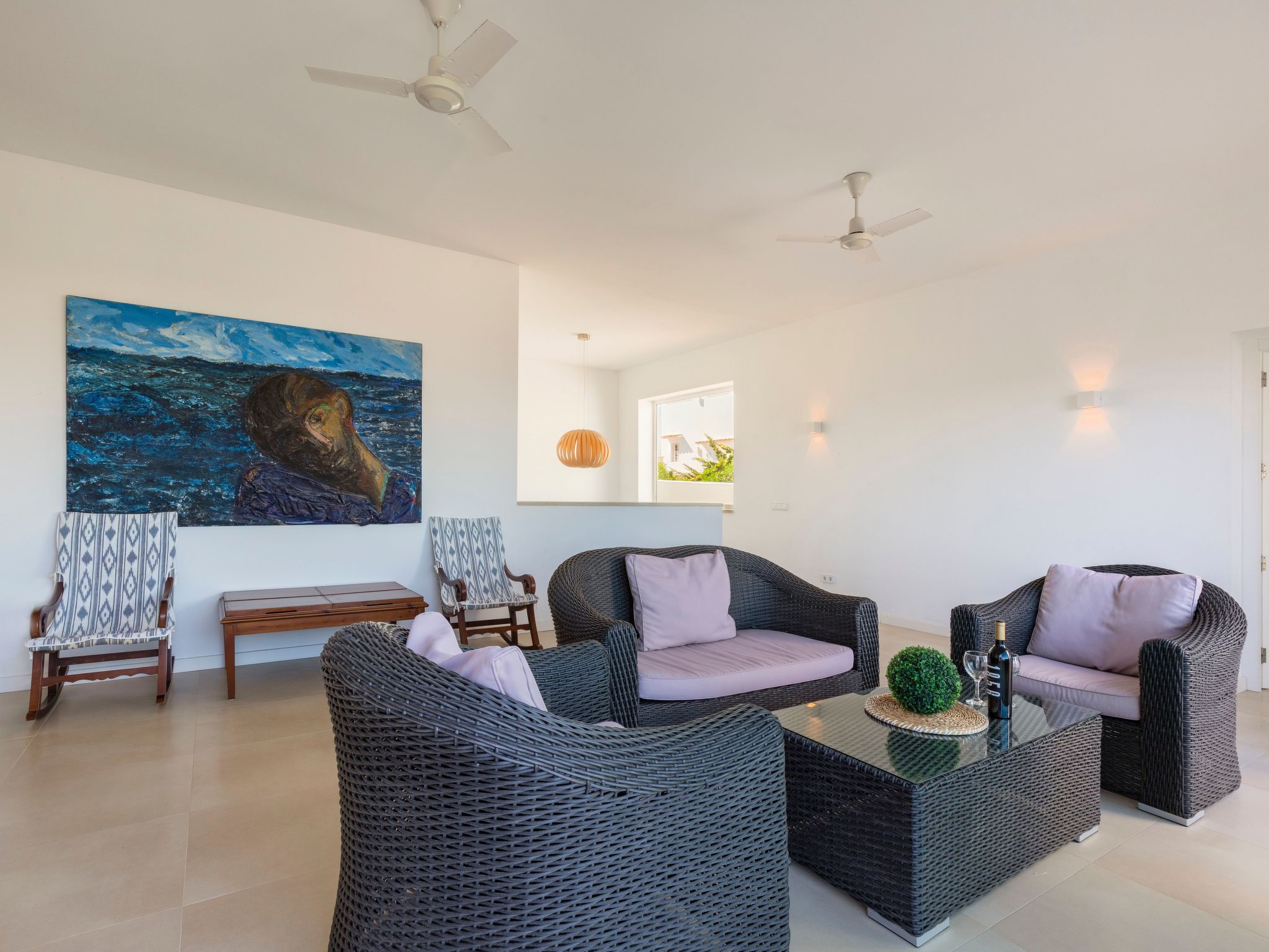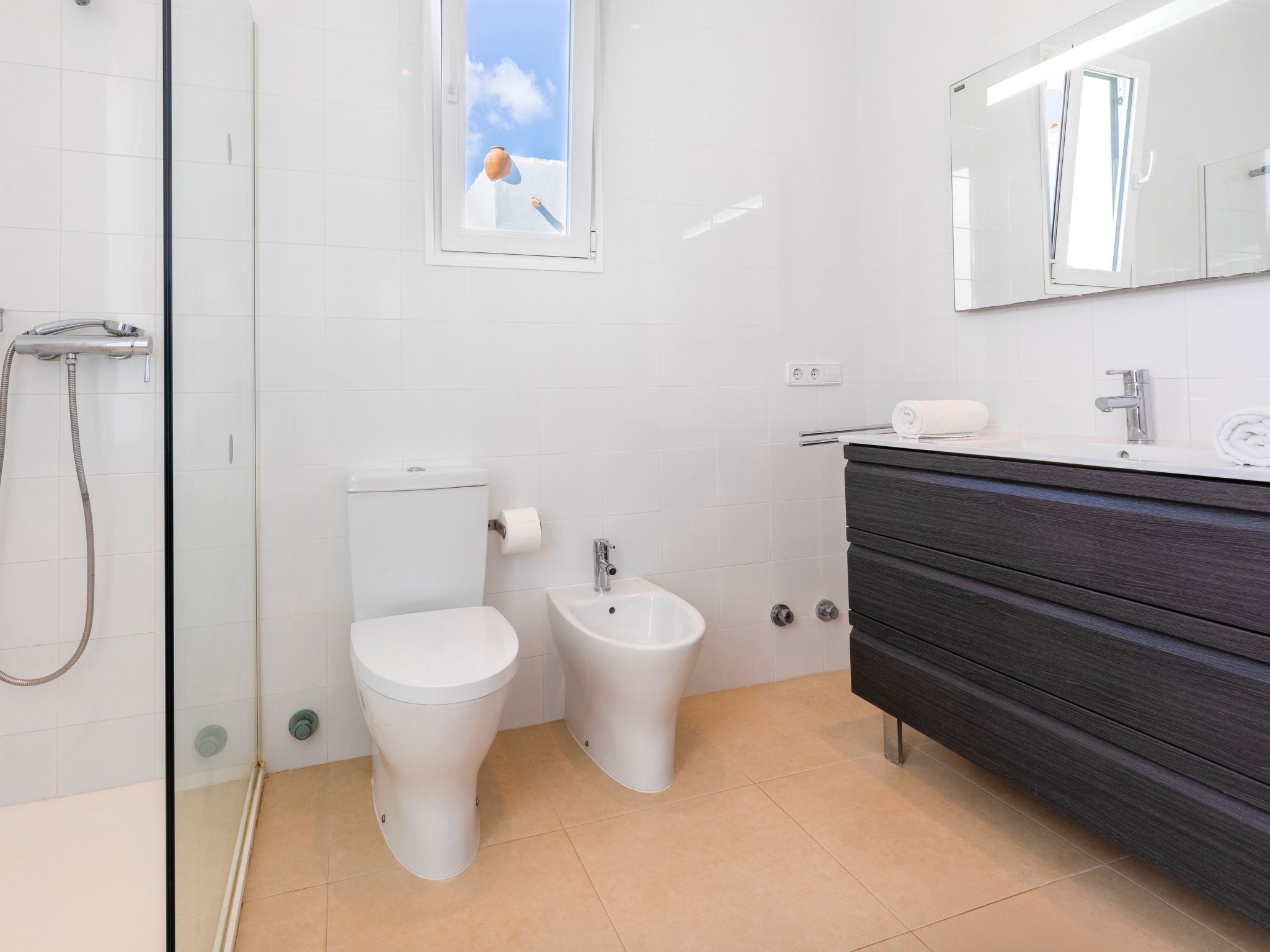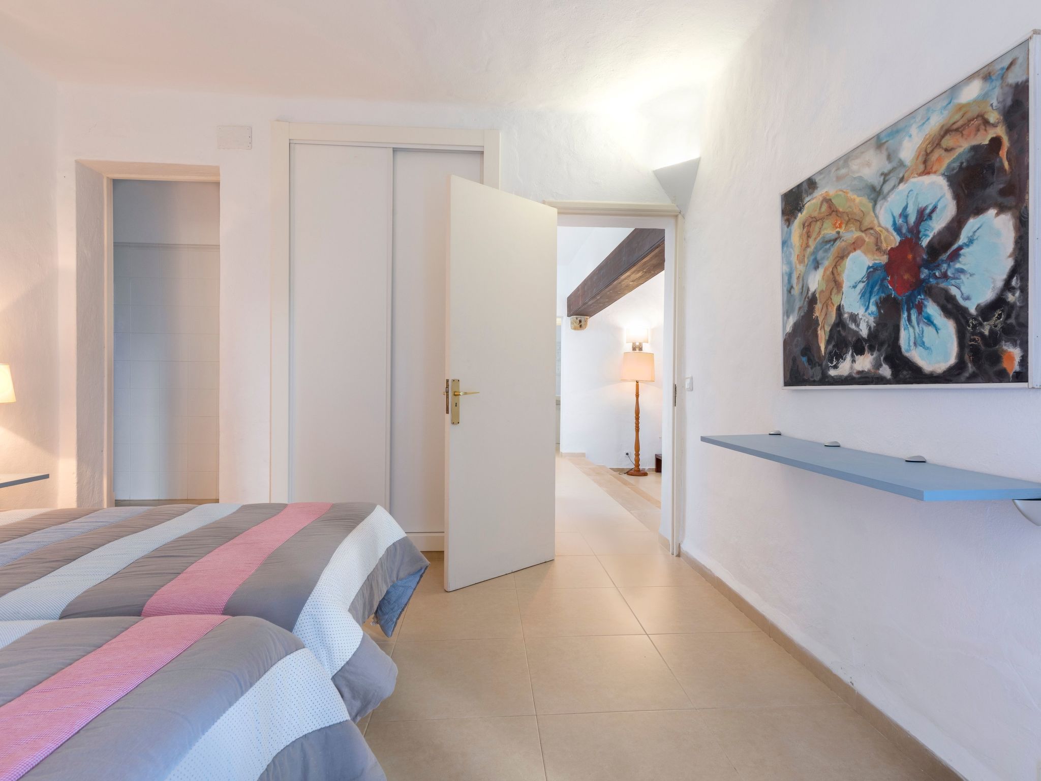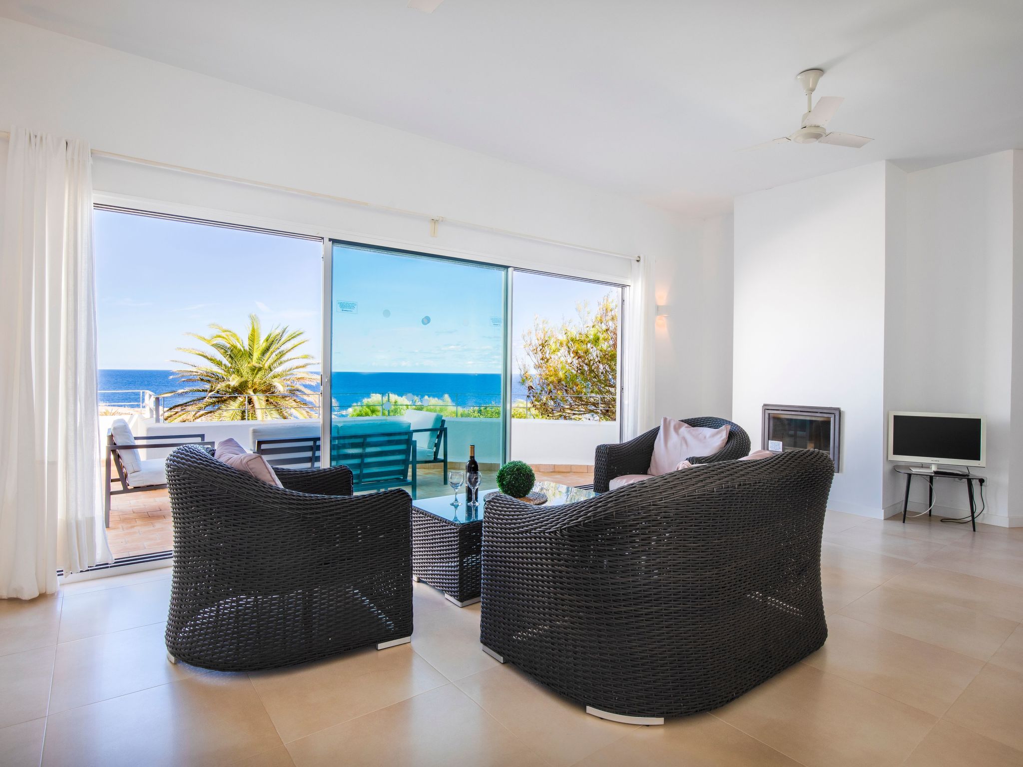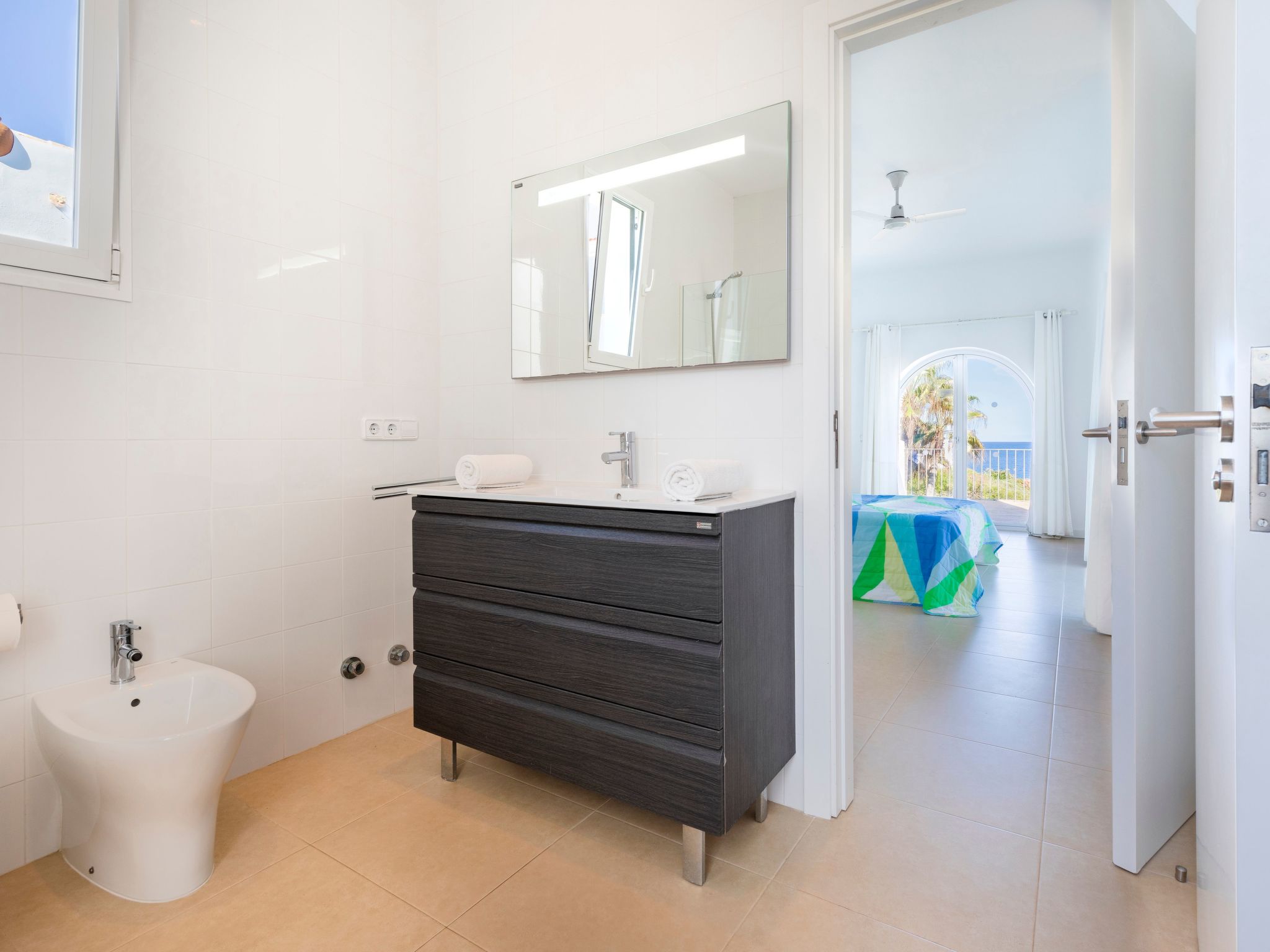Villa Gran Mar is built in the old Ibizan style. A short path leads to the house through a small garden with a lawn. The entrance area leads into the spacious, bright and cosily furnished living/dining room. Patio doors open out to the pool area and a further private terrace, a perfect place for al fresco dining. You have a well-equipped modern kitchen. From the living room you enter a beautiful double bedroom with an en-suite shower room and access to the terrace and pool area. A further bedroom is located on the opposite side of the living room. Steps lead from the dining area to the floor. There is a seating area here. Large French windows allow you to enjoy the fantastic sea view and access to the terrace, which is also equipped with a seating area. From this living room there is access to the 3rd bedroom with en-suite shower room, which also has access to the terrace.