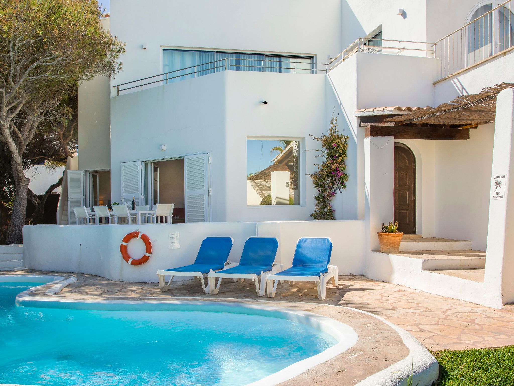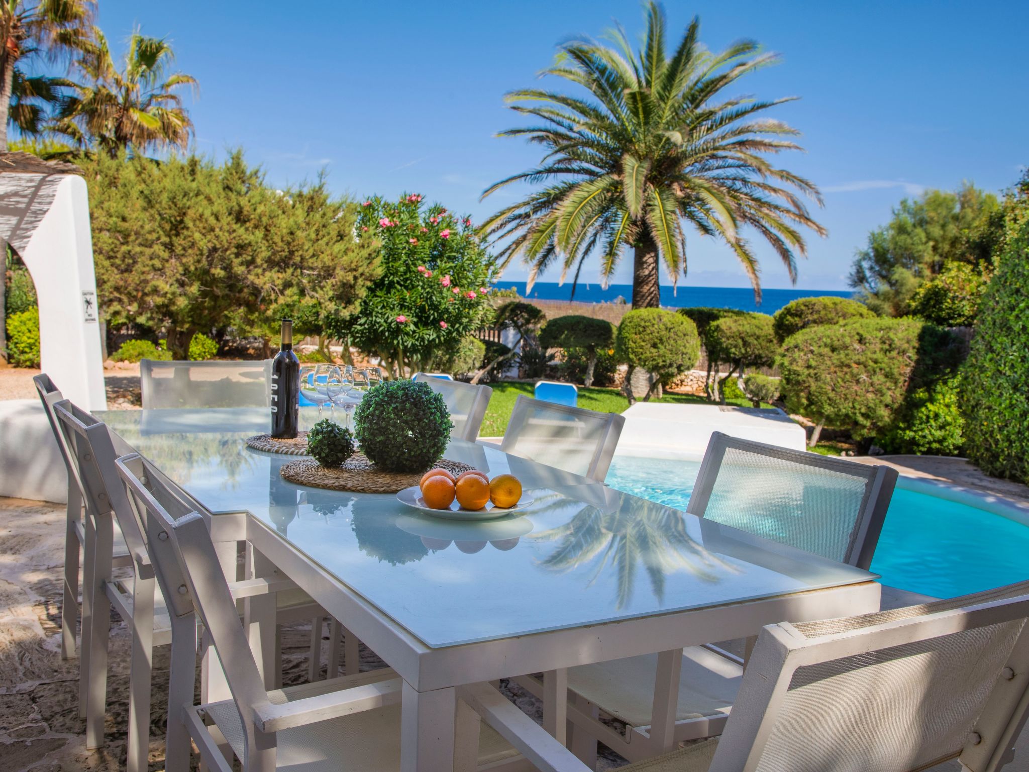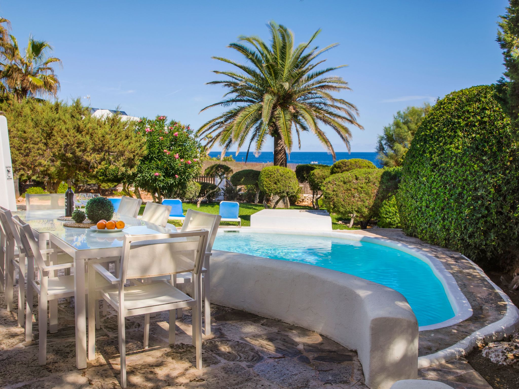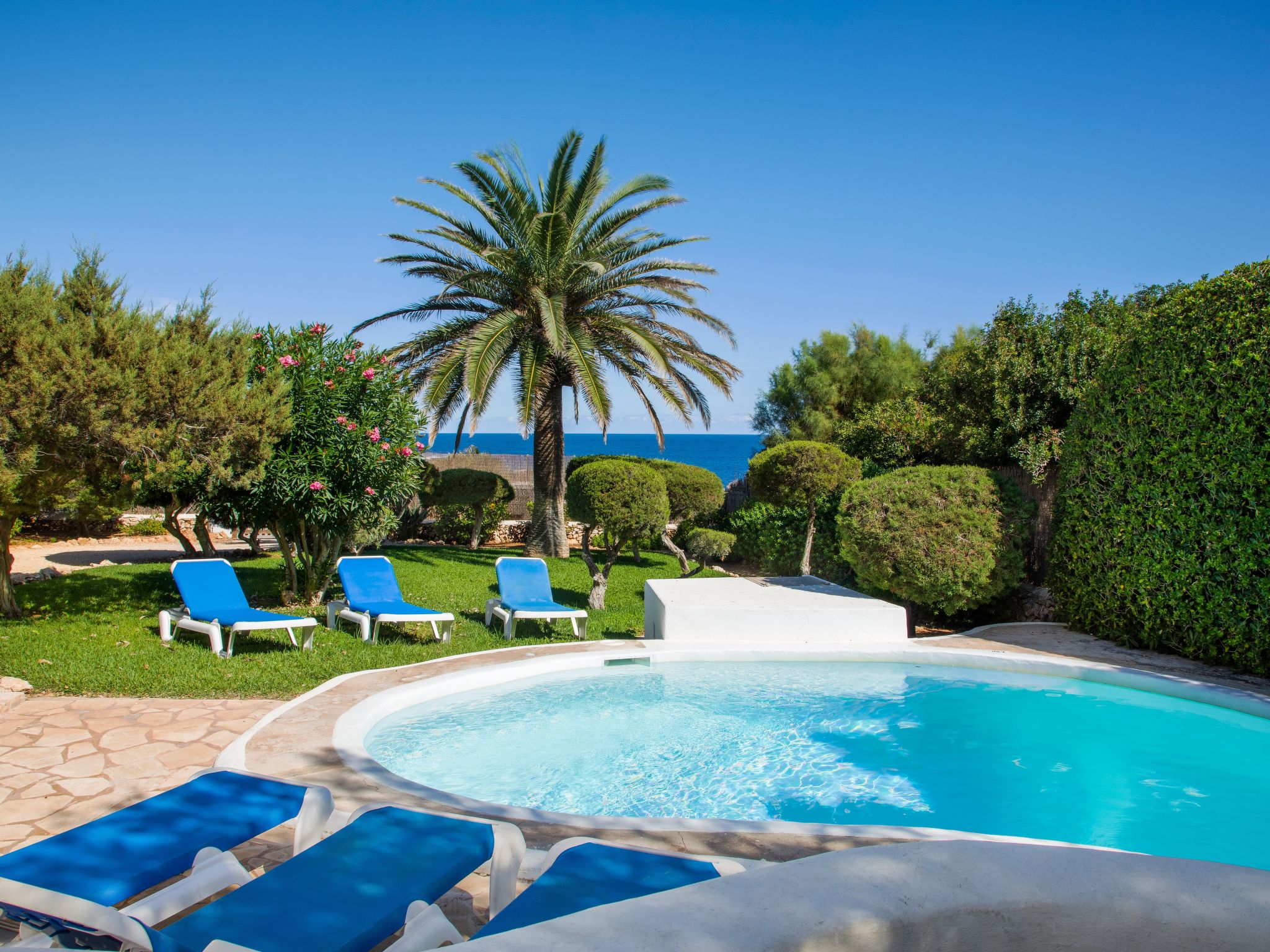 The terrace is divided into two levels and is equipped with sun loungers and dining areas. The beautiful kidney-shaped pool has a shallow end and child-friendly steps. From here you can reach the sun terrace with fantastic sea views, an ideal place to enjoy your private sunbathing.