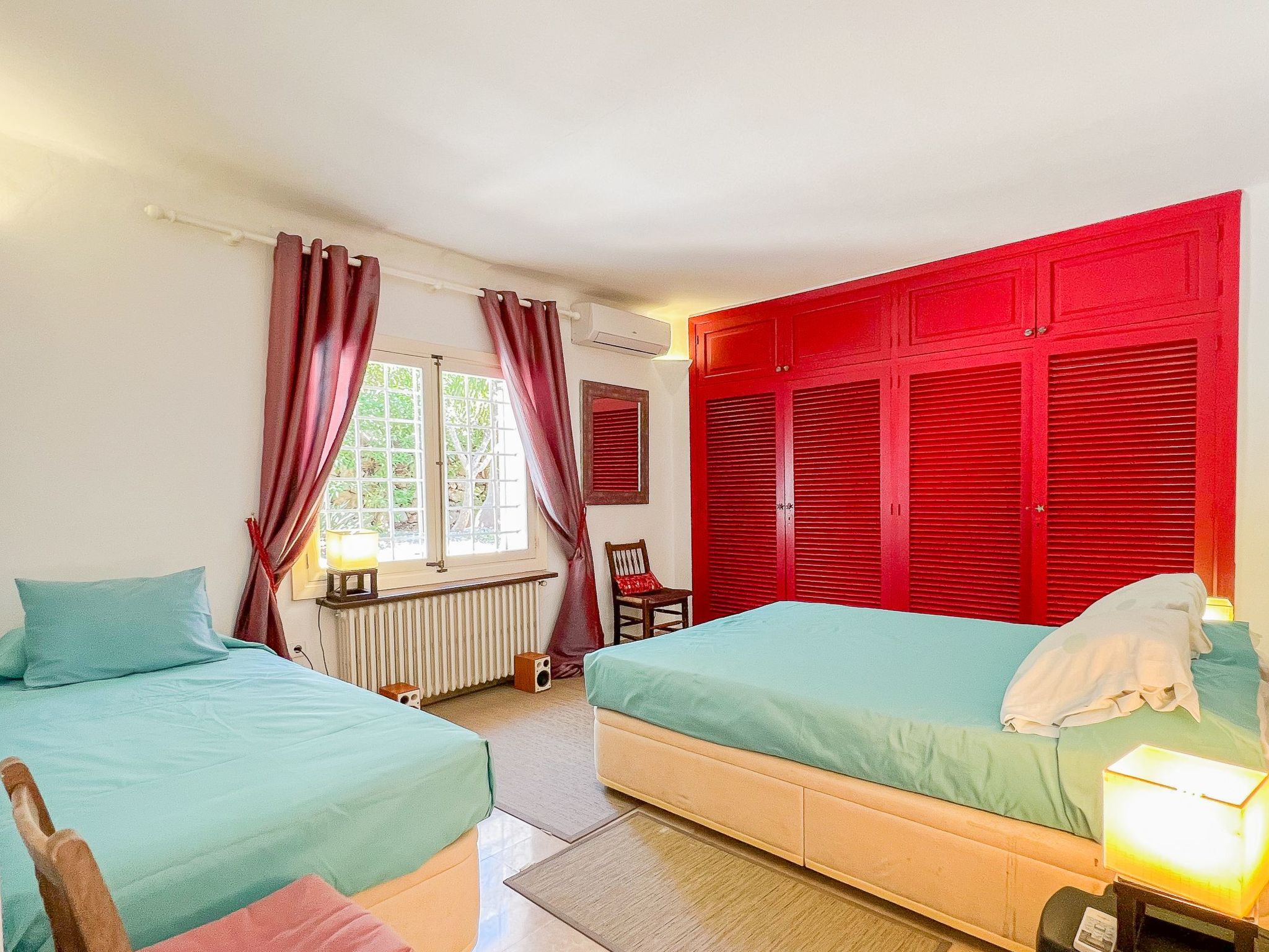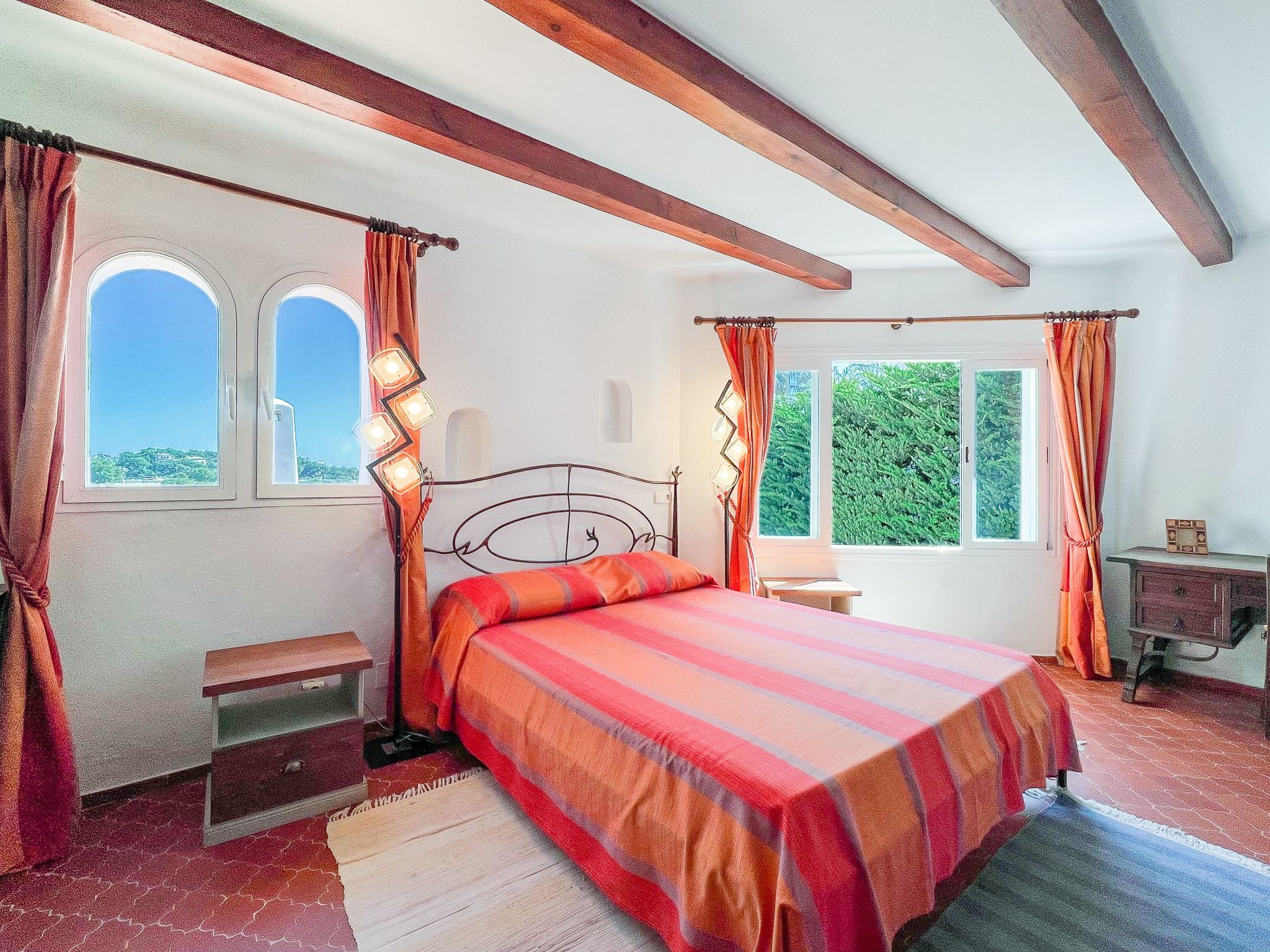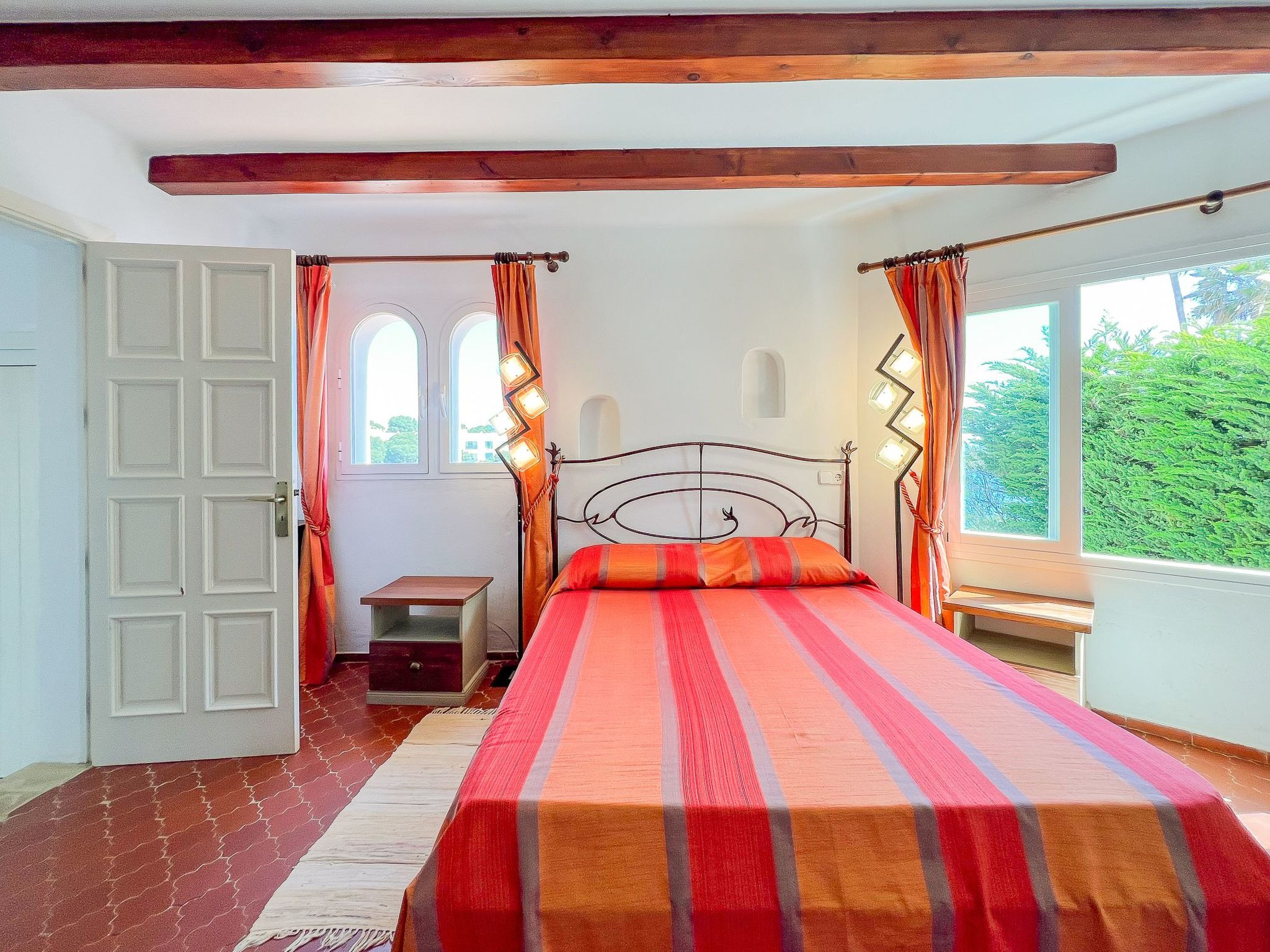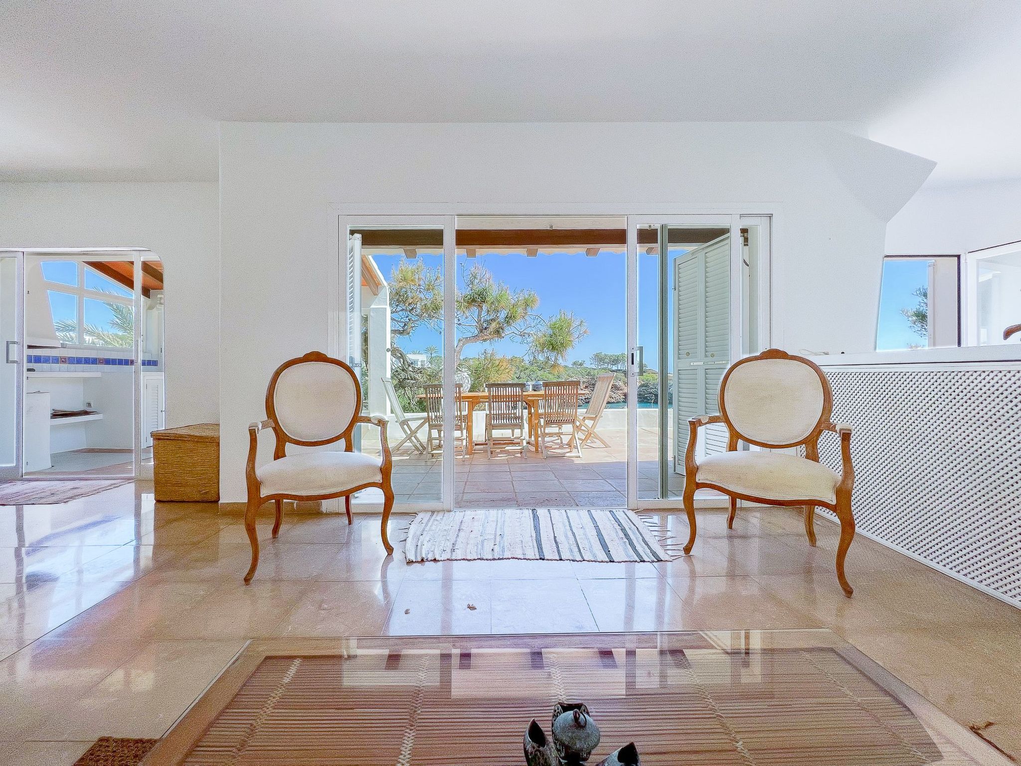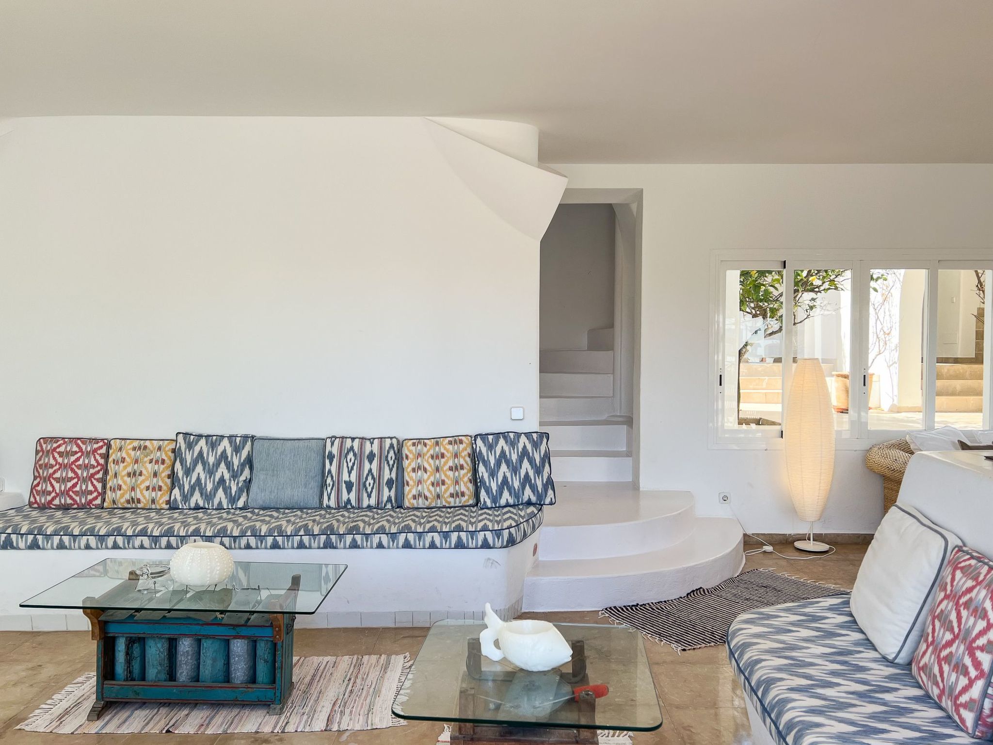 The holiday home is distributed over two floors. It is spacious and has different areas where you can enjoy the sun and relax.on the ground floor is the living room with brick benches, great views of the sea and dining area, access to the terrace. Spacious kitchen. From the living room there is access to a bedroom with double bed and ensuite bathroom. This bedroom has access to the terrace. From the living room, a spiral staircase in Ibizan style leads to the floor, where there is another double bedroom and an en-suite bathroom with shower.The house has an inner courtyard with three bedrooms. One bedroom for children, with a single bed plus a pull-out bed and a small bathroom en suite. Another bedroom with a double bed and an adjacent bathroom. The last bedroom has a double bed and an en suite bathroom. Unbeatable outdoor area with barbecue area, table to enjoy meals with sea views. Private pool and several areas where you can enjoy the sun and shade. Access to the sea from the rocks. Air conditioning in the bedrooms with a fixed and limited schedule.