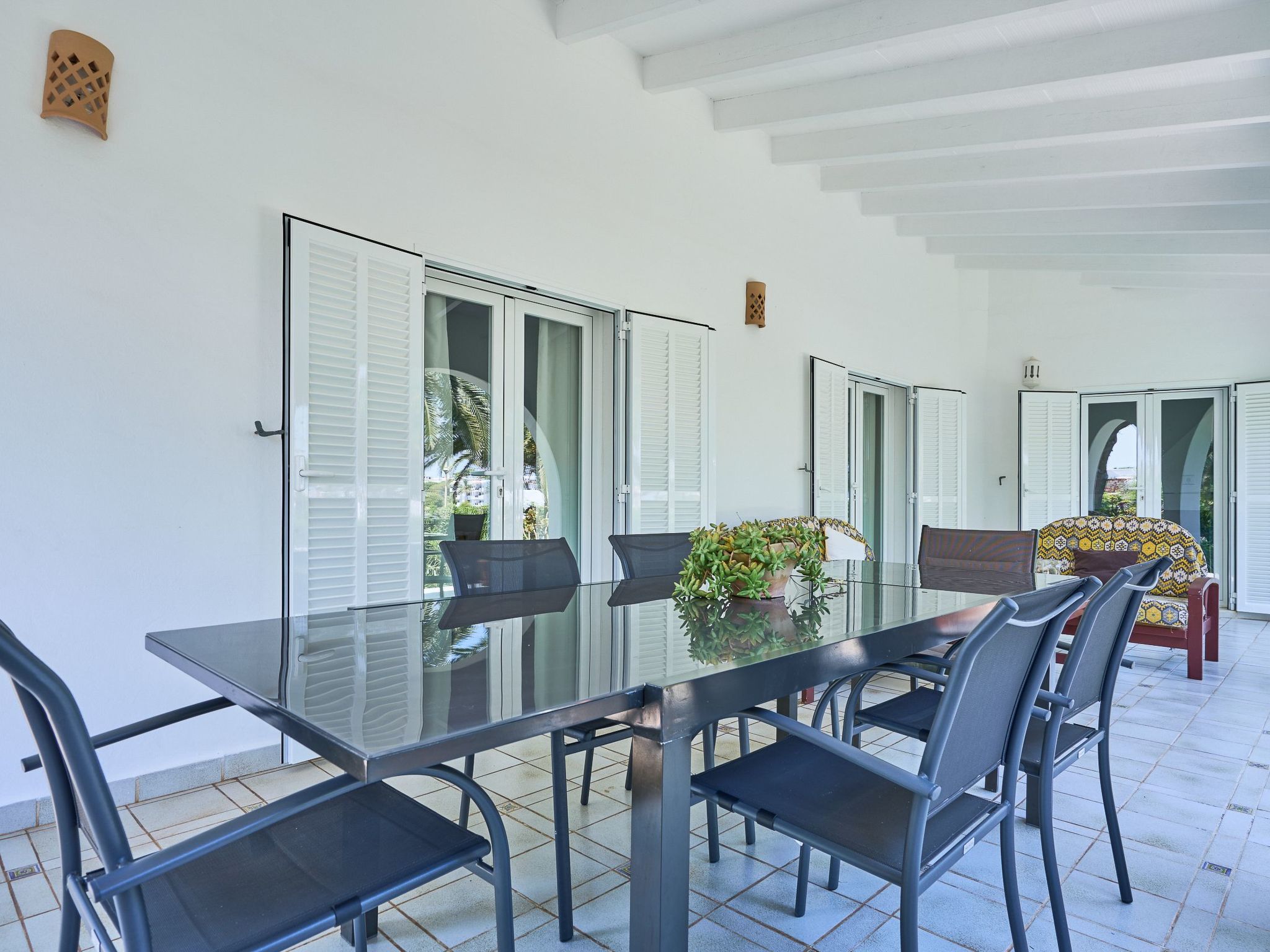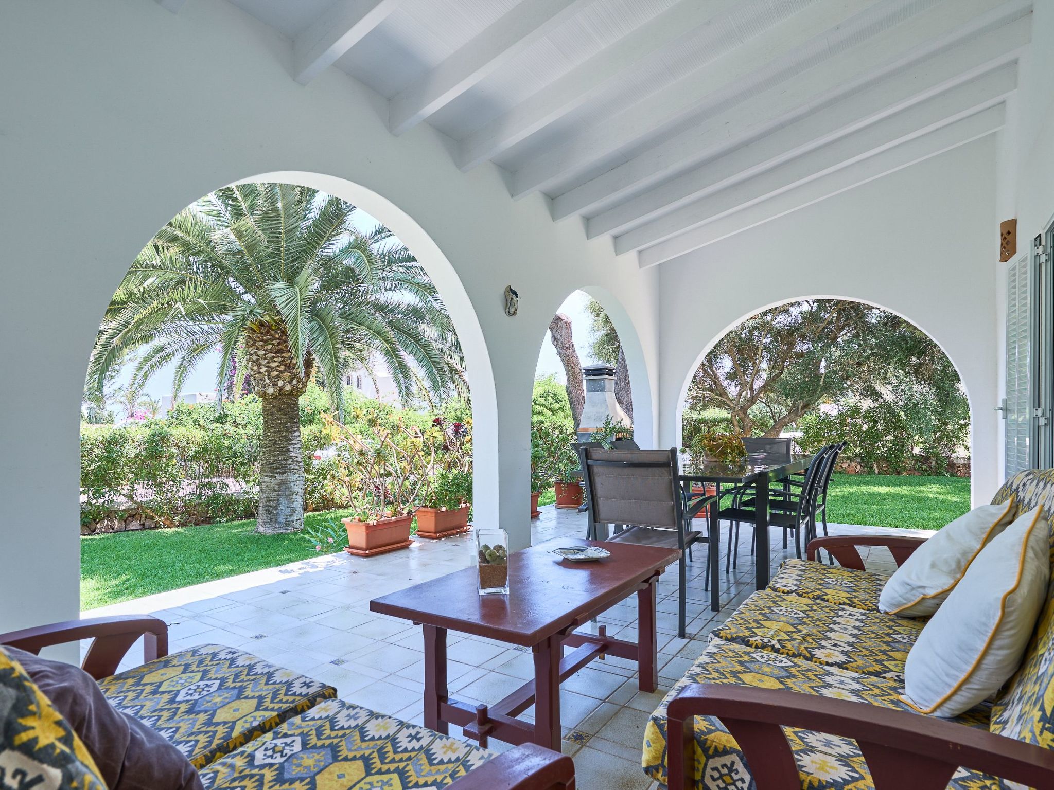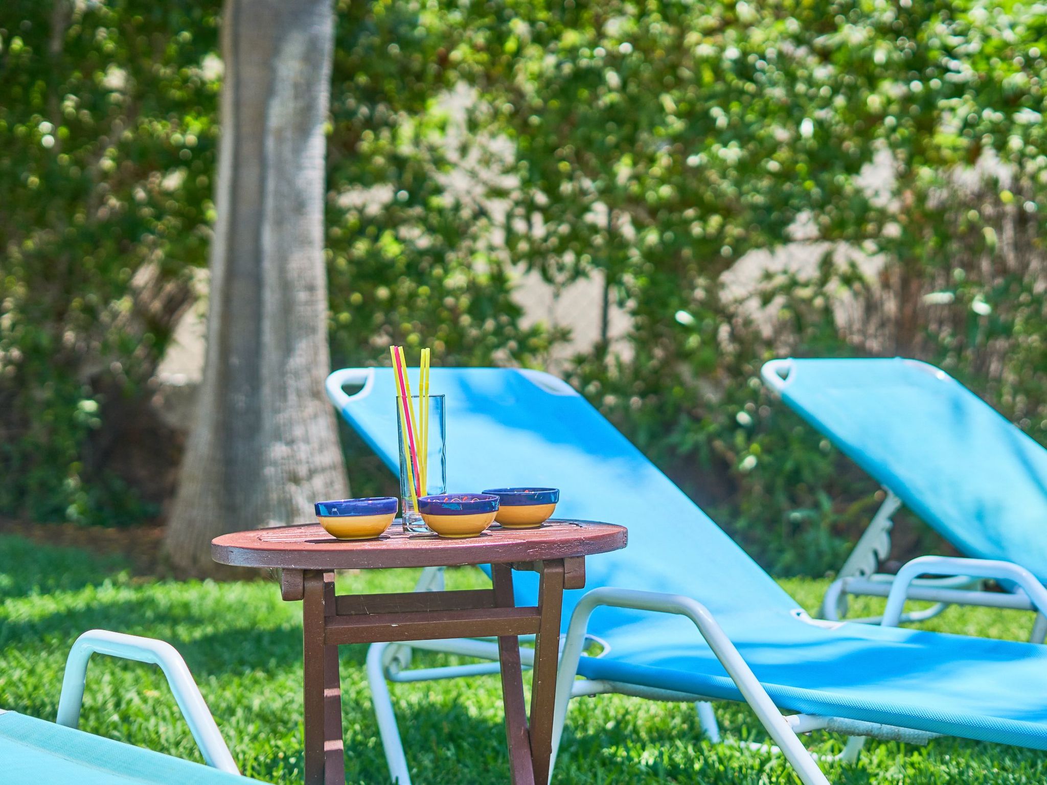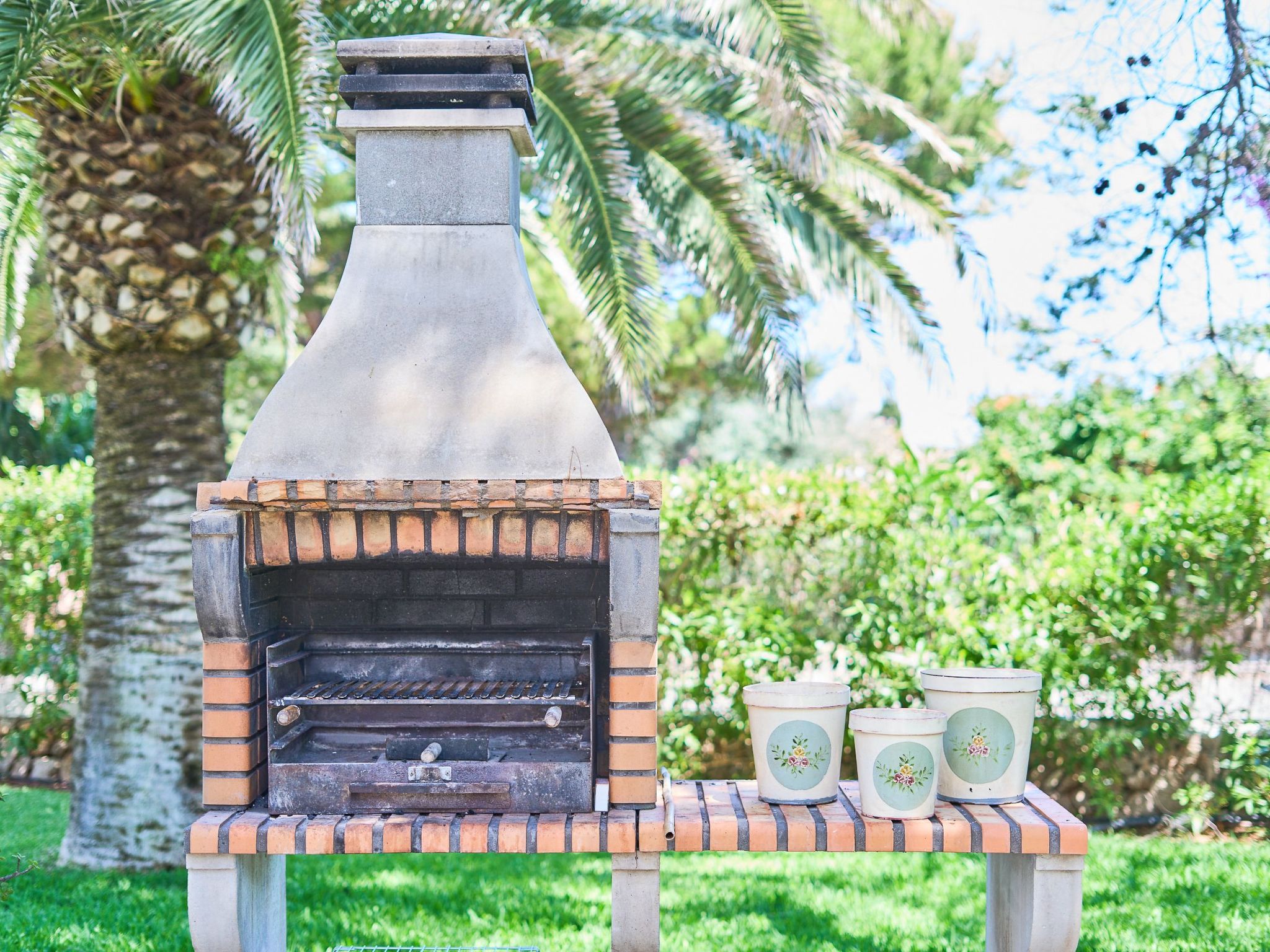 The house has a large, well-kept garden with tall palm trees and old pine trees that provide shade in pleasant proportions. To the side of the house is a lovely area with a large covered terrace, sofas for chilling out and a table and chairs for al fresco dining. The garden area, where the beautiful child-safe pool with brick steps (10m x 5m - saltwater pool) and outdoor shower is located, offers another terrace for sunbathing with deckchairs and another small table with chairs. A lovely place to enjoy the long summer days or read a good book. A brick-built outdoor barbecue can be used. The pool fence is fixed and cannot be removed