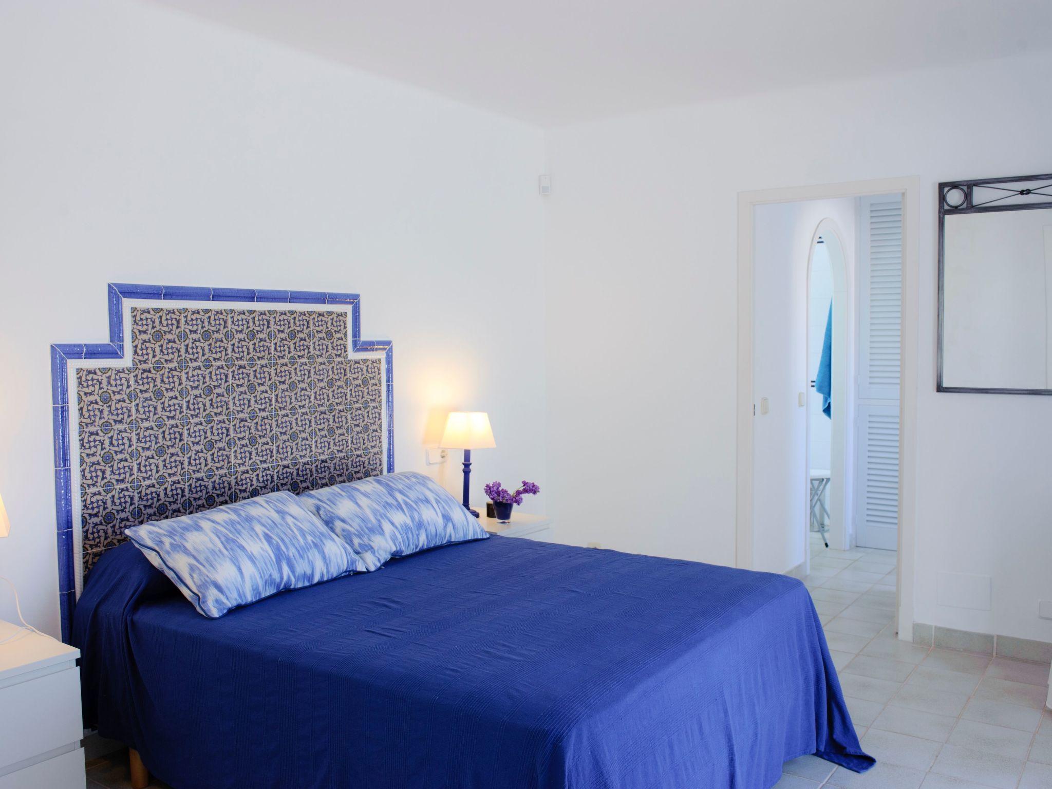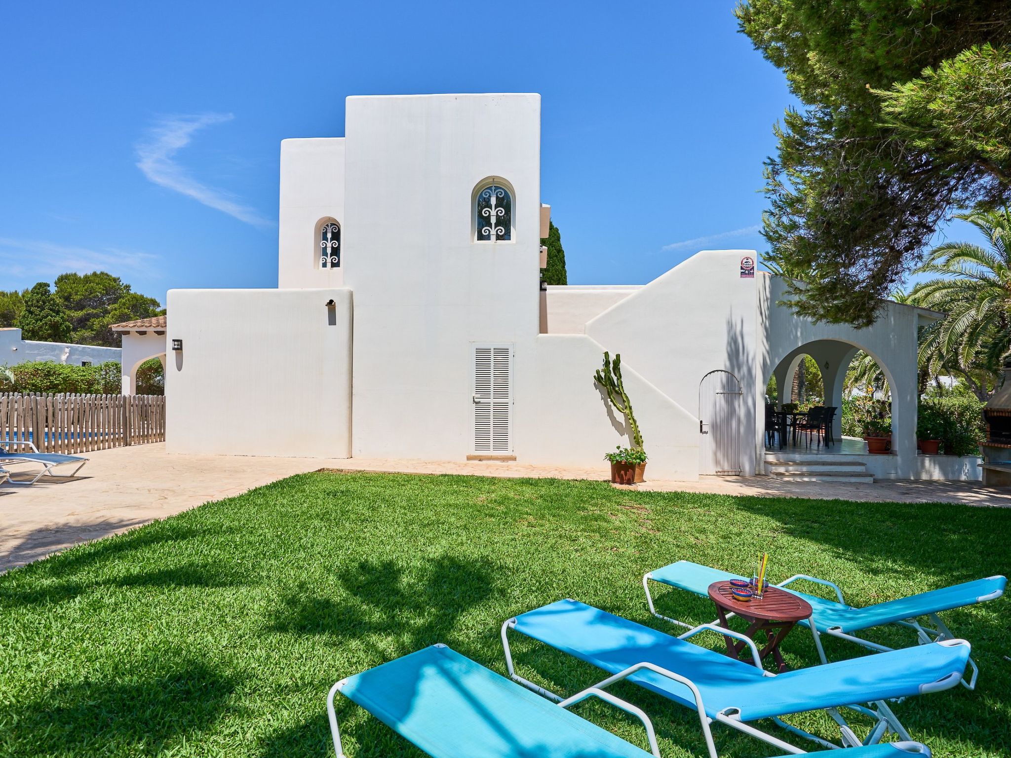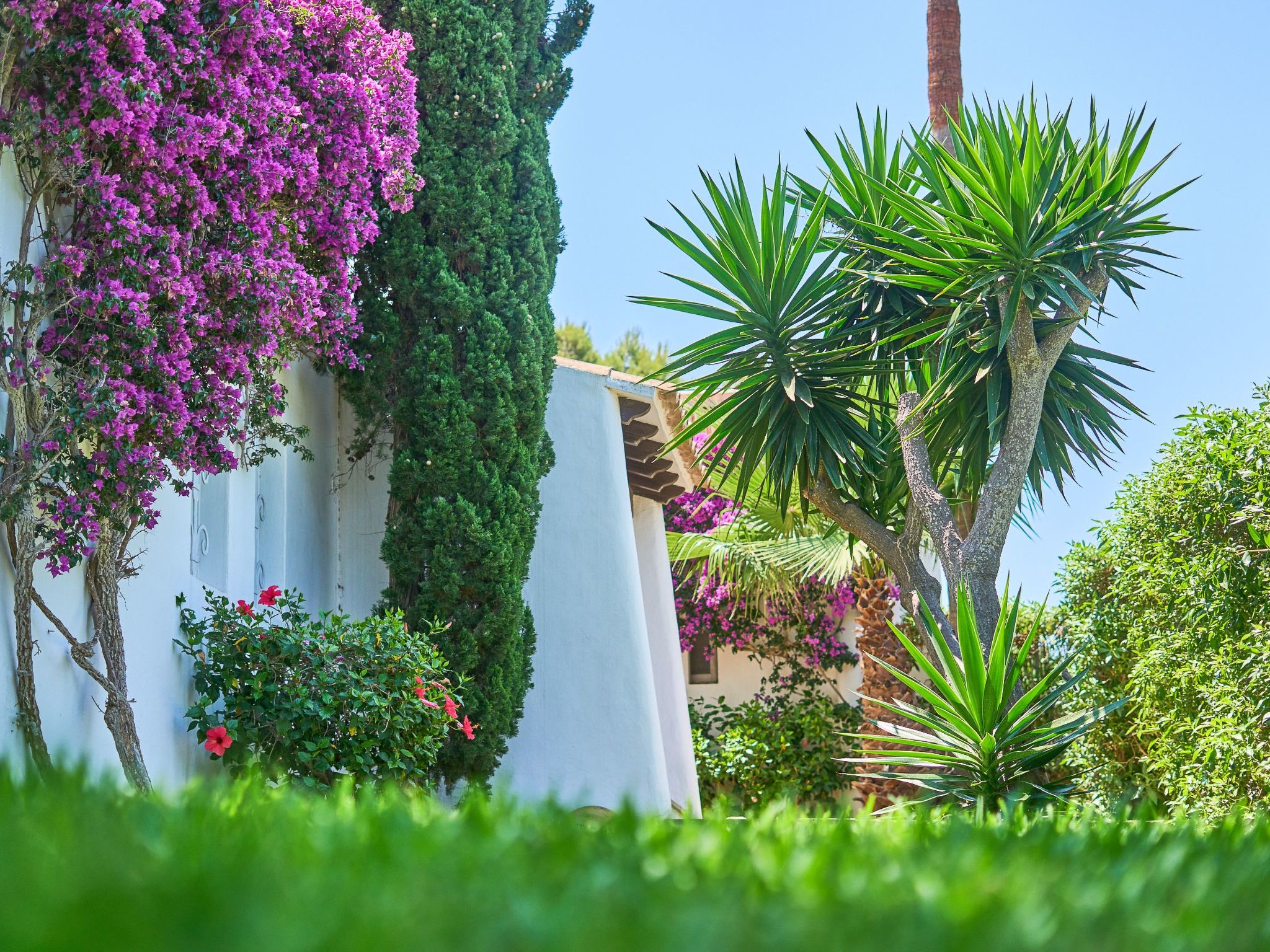 Acebuche is a beautiful Ibizan-style house, airy and with plenty of natural light, covered terraces and a large garden with lawns. The house is divided into two floors, plus a "casita" (small cottage) by the pool with a small bedroom with two single beds, an en-suite shower and a small covered terrace. On the ground floor of the main house is the open-plan living and dining area with cosy sofas and a dining table. The living area leads out onto a large covered terrace and the garden. The well-equipped kitchen also leads to the outside area. The ground floor also has three bedrooms, two of which have two single beds each, both with access to the covered terrace. The two bedrooms share two bathrooms, one with a bathtub and the other with two showers. The third bedroom is equipped with two single beds and an en-suite bathroom and has access to the terrace overlooking the pool. The upper floor houses a large bedroom with double bed, en-suite bathroom and dressing area. There is direct access to the roof terrace from the bedroom. There is further access to the roof terrace via the garden.