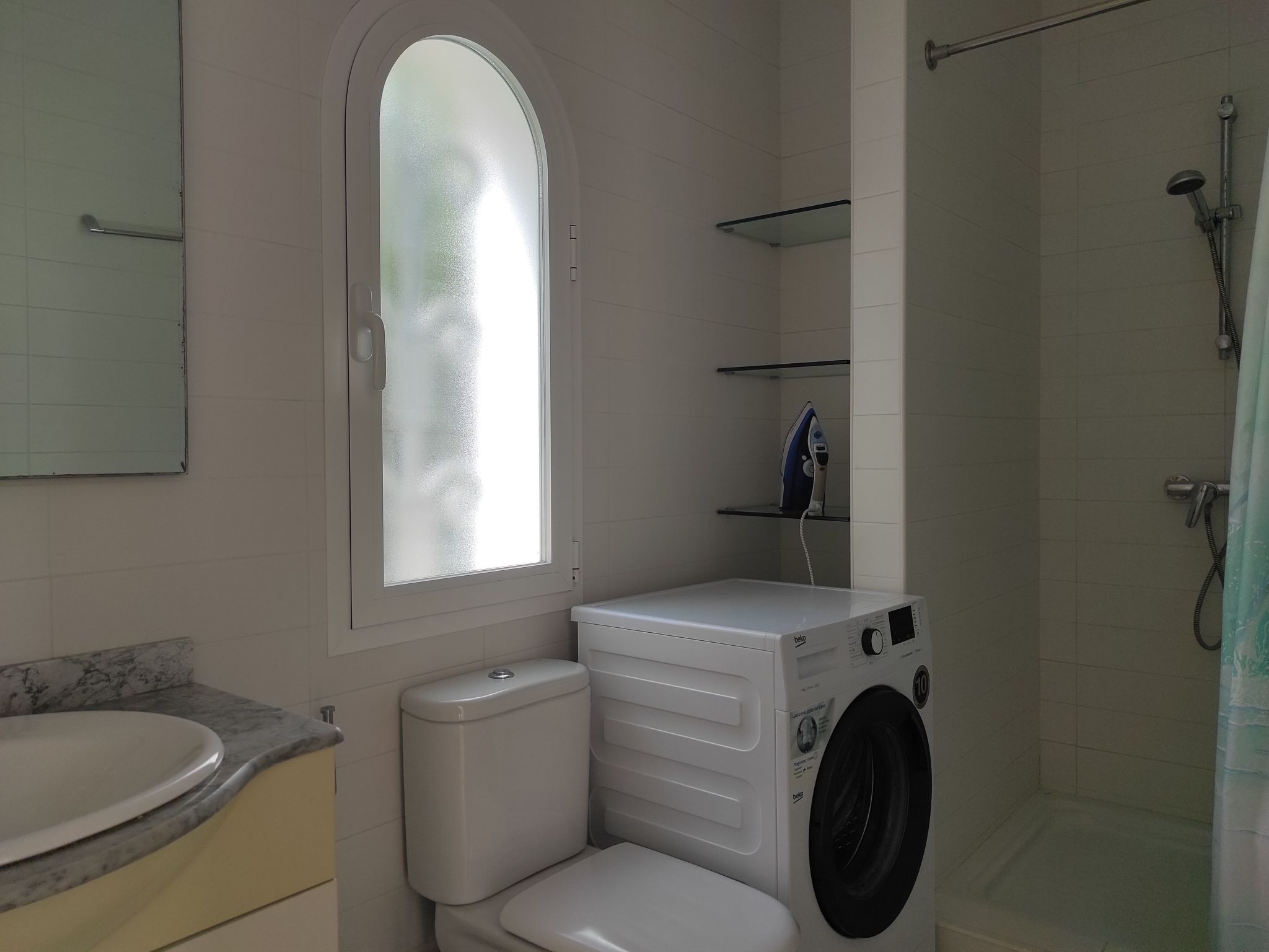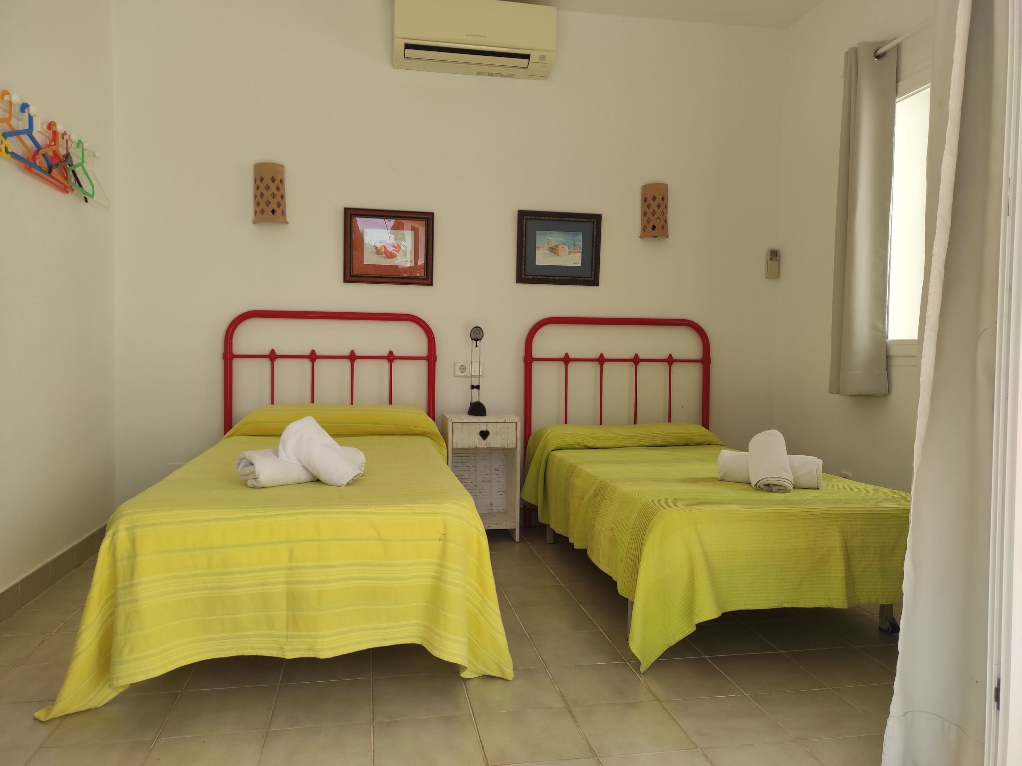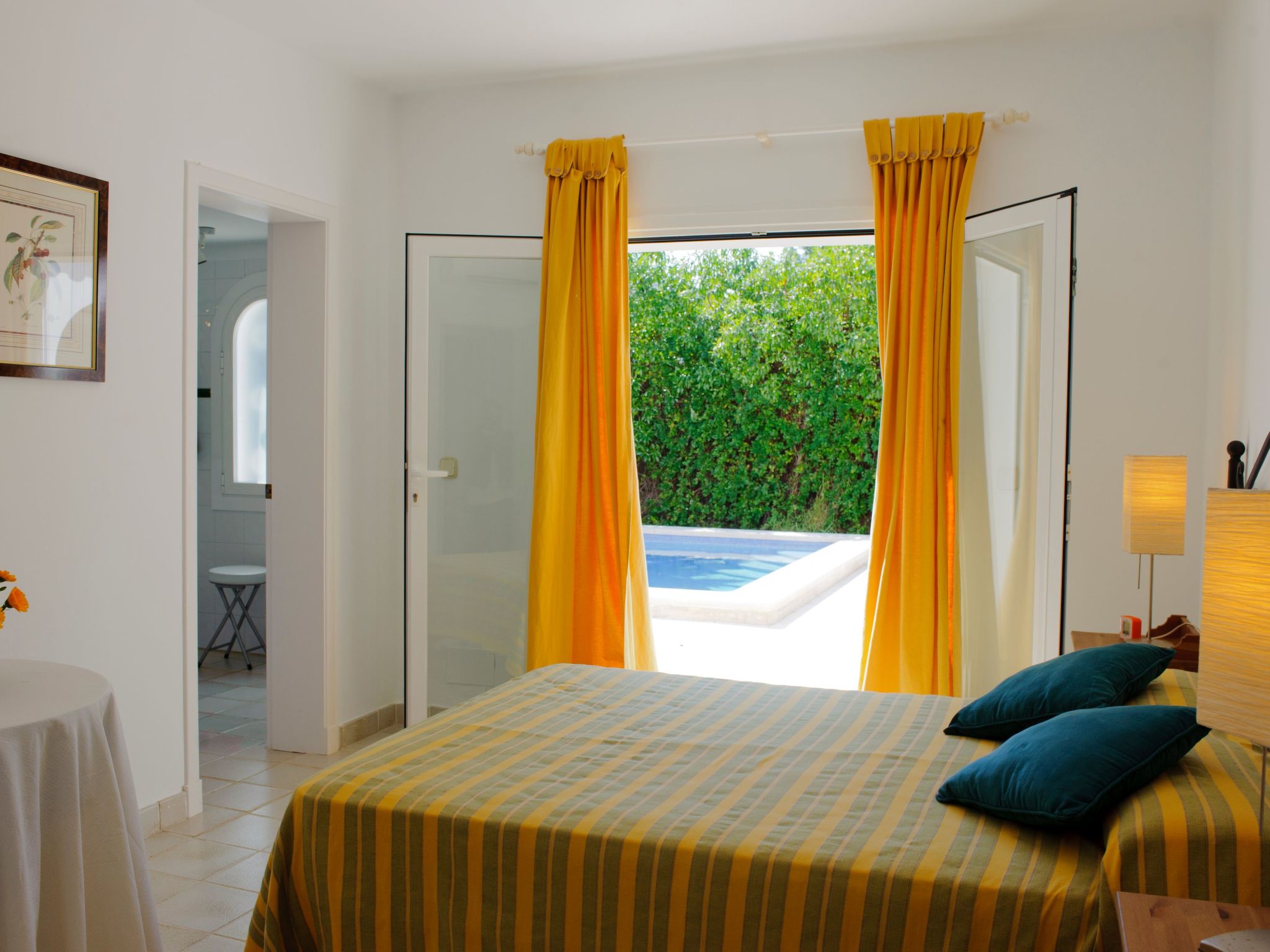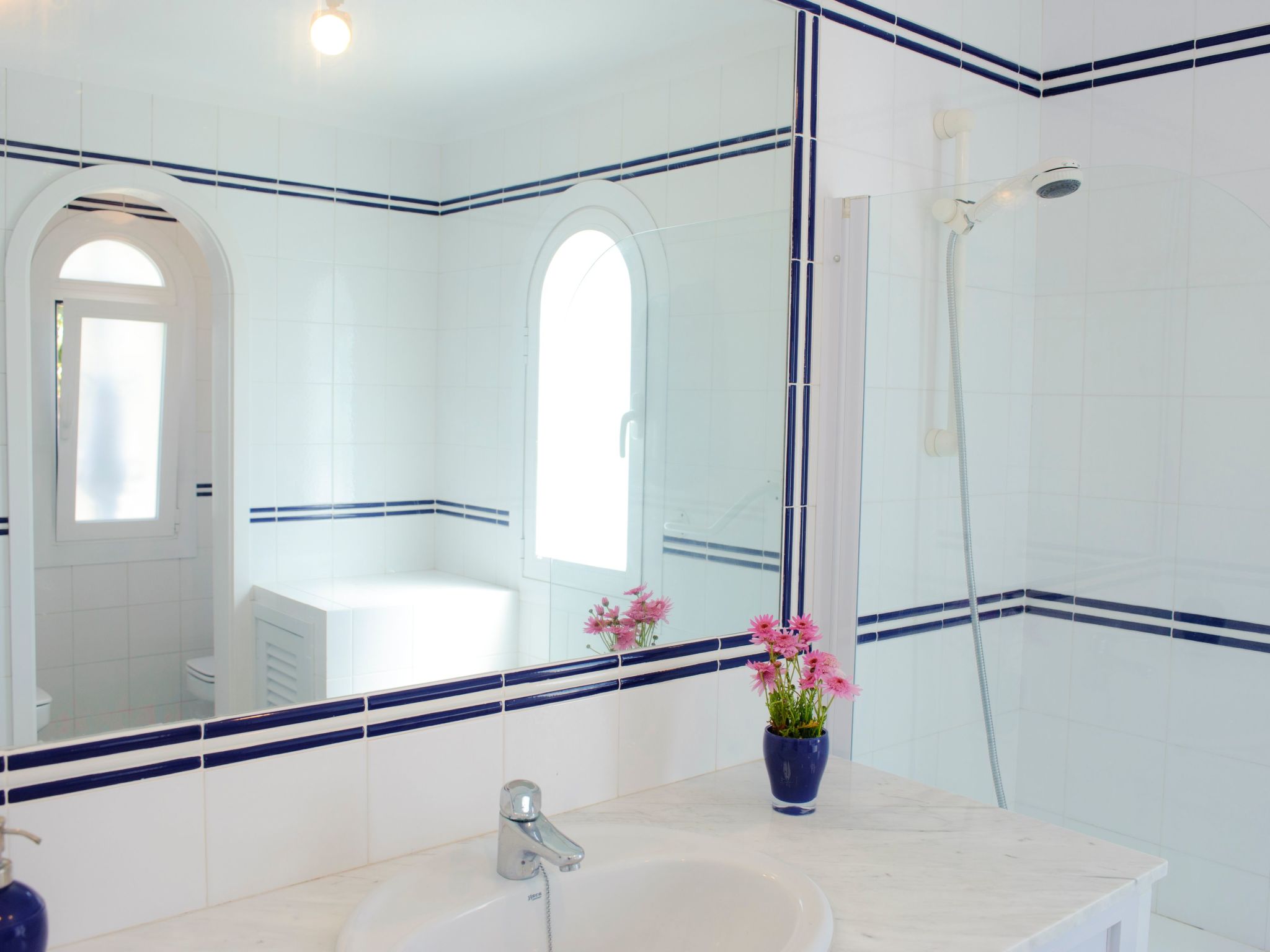 Acebuche is a beautiful Ibizan-style house, airy and with plenty of natural light, covered terraces and a large garden with lawns. The house is divided into two floors, plus a "casita" (small cottage) by the pool with a small bedroom with two single beds, an en-suite shower and a small covered terrace. On the ground floor of the main house is the open-plan living and dining area with cosy sofas and a dining table. The living area leads out onto a large covered terrace and the garden. The well-equipped kitchen also leads to the outside area. The ground floor also has three bedrooms, two of which have two single beds each, both with access to the covered terrace. The two bedrooms share two bathrooms, one with a bathtub and the other with two showers. The third bedroom is equipped with two single beds and an en-suite bathroom and has access to the terrace overlooking the pool. The upper floor houses a large bedroom with double bed, en-suite bathroom and dressing area. There is direct access to the roof terrace from the bedroom. There is further access to the roof terrace via the garden.