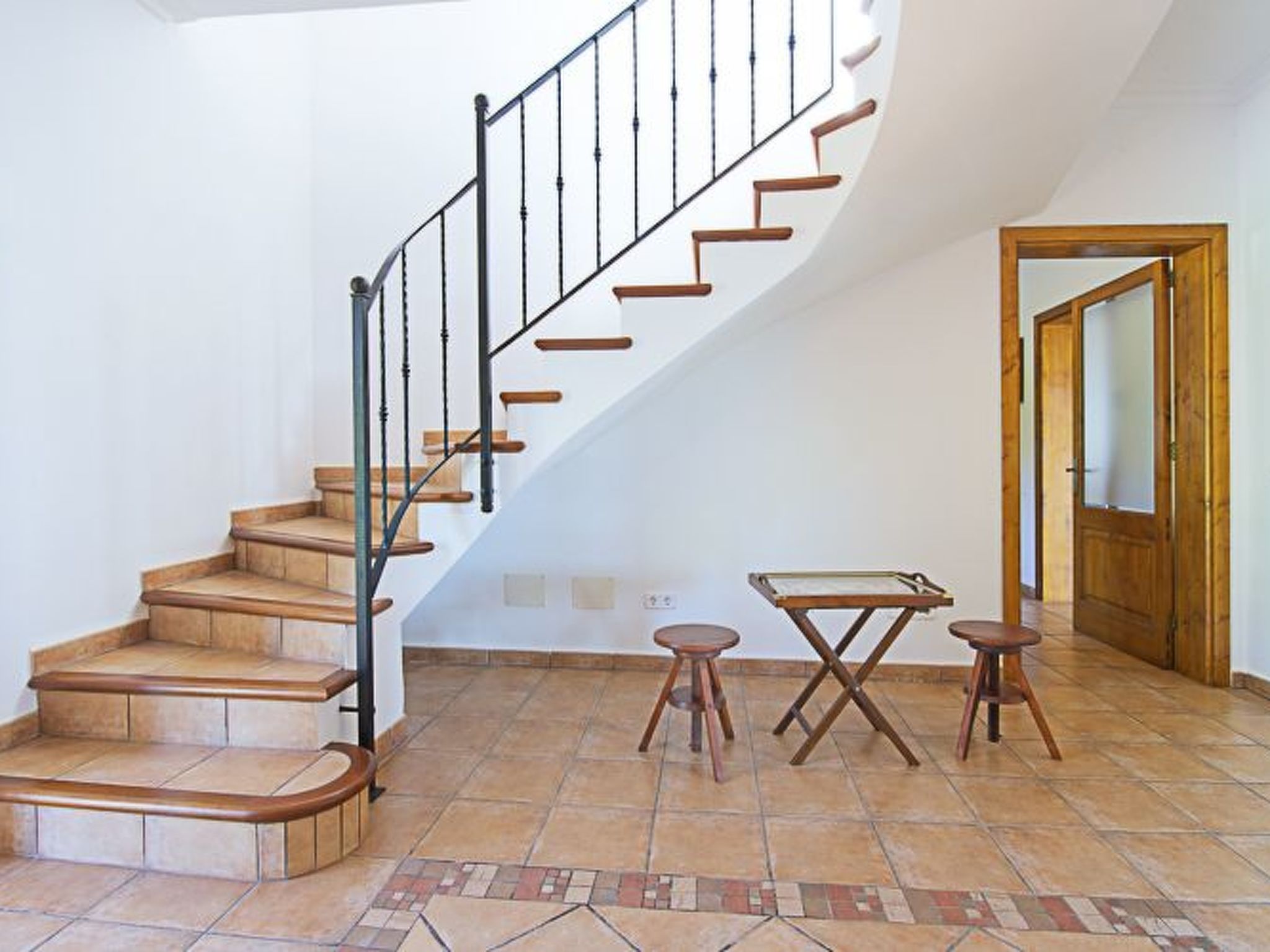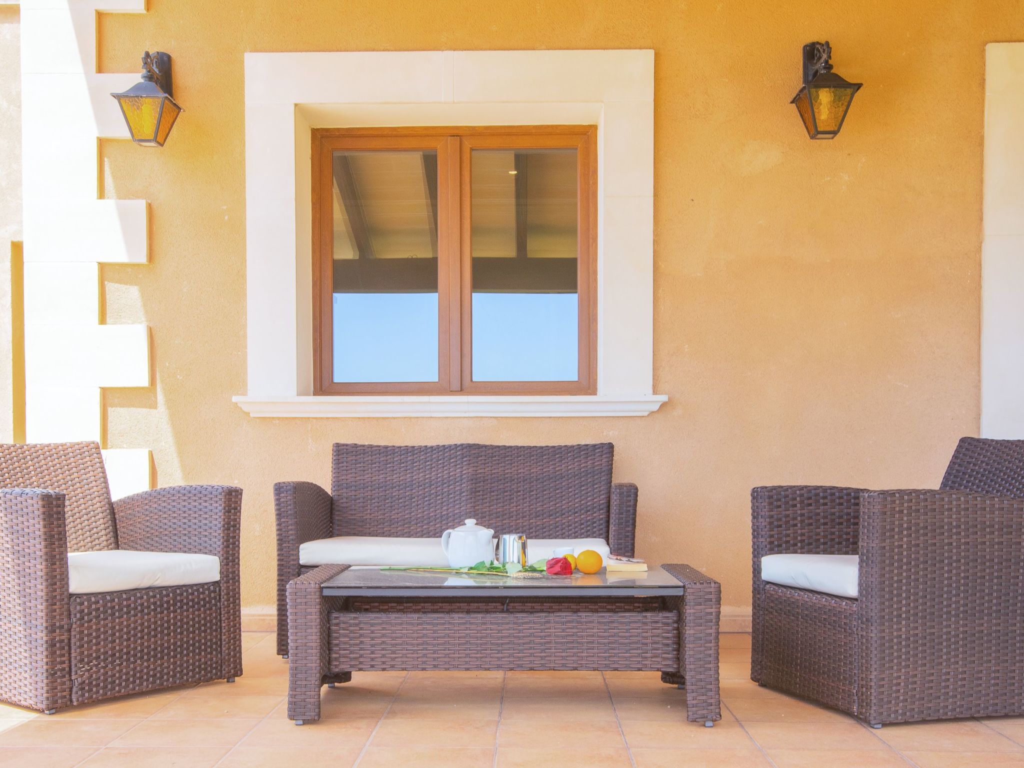 Spacious finca distributed over two levels. On the ground floor is the open-plan living/dining room with access to the porch and the pool and with views of the coast in the distance. The kitchen is spacious and has a pantry. Utility room next to the kitchen. There is also a bedroom with two single beds and a separate shower room on the ground floor. On the floor there are three further bedrooms, all with en-suite bathrooms. A small bedroom with double bed and compact shower room, a second bedroom with twin beds and shower room and the master bedroom with double bed, dressing room, bathroom with whirlpool bath, separate shower and access to a terrace with views of the coast in the distance.