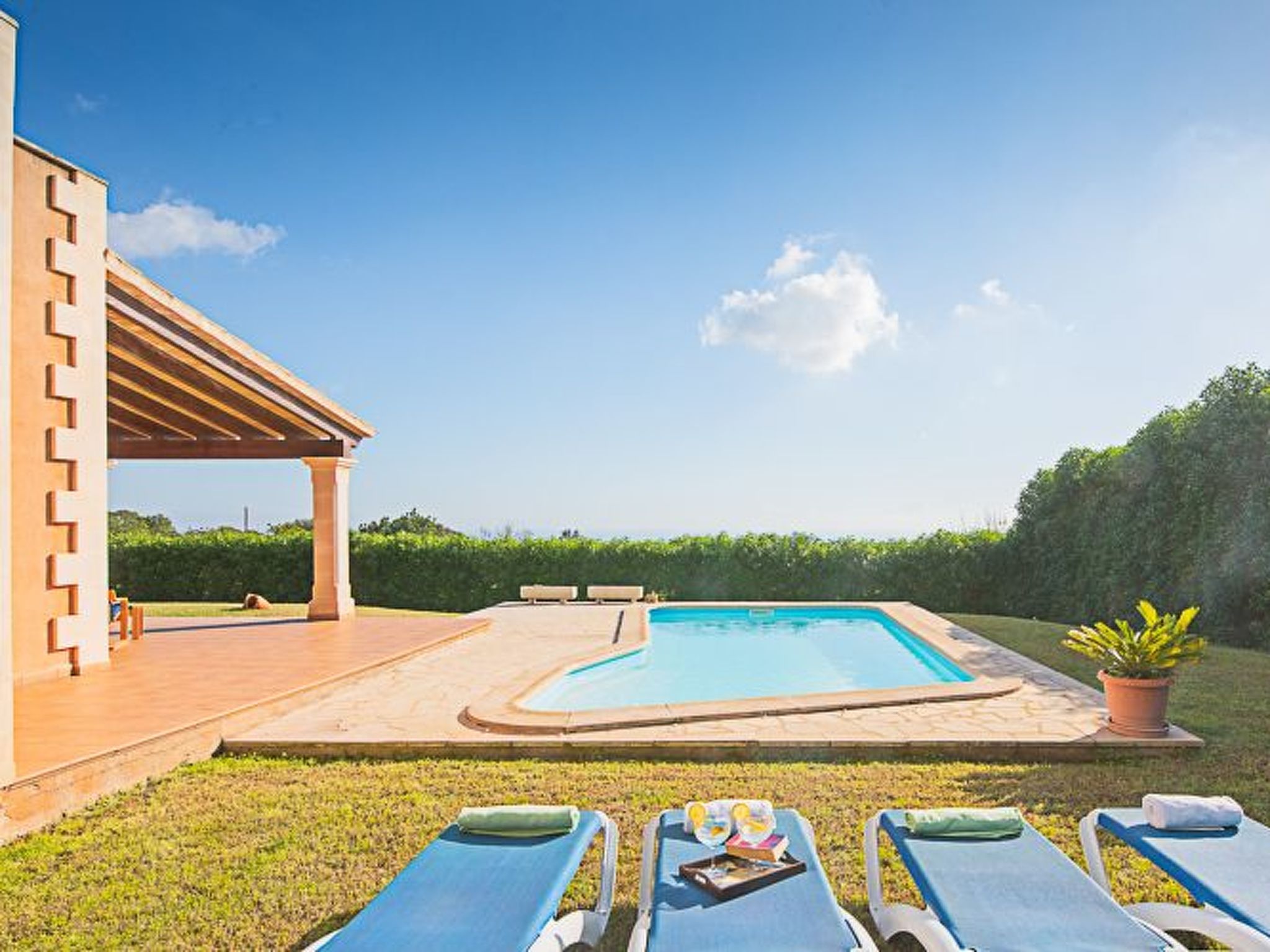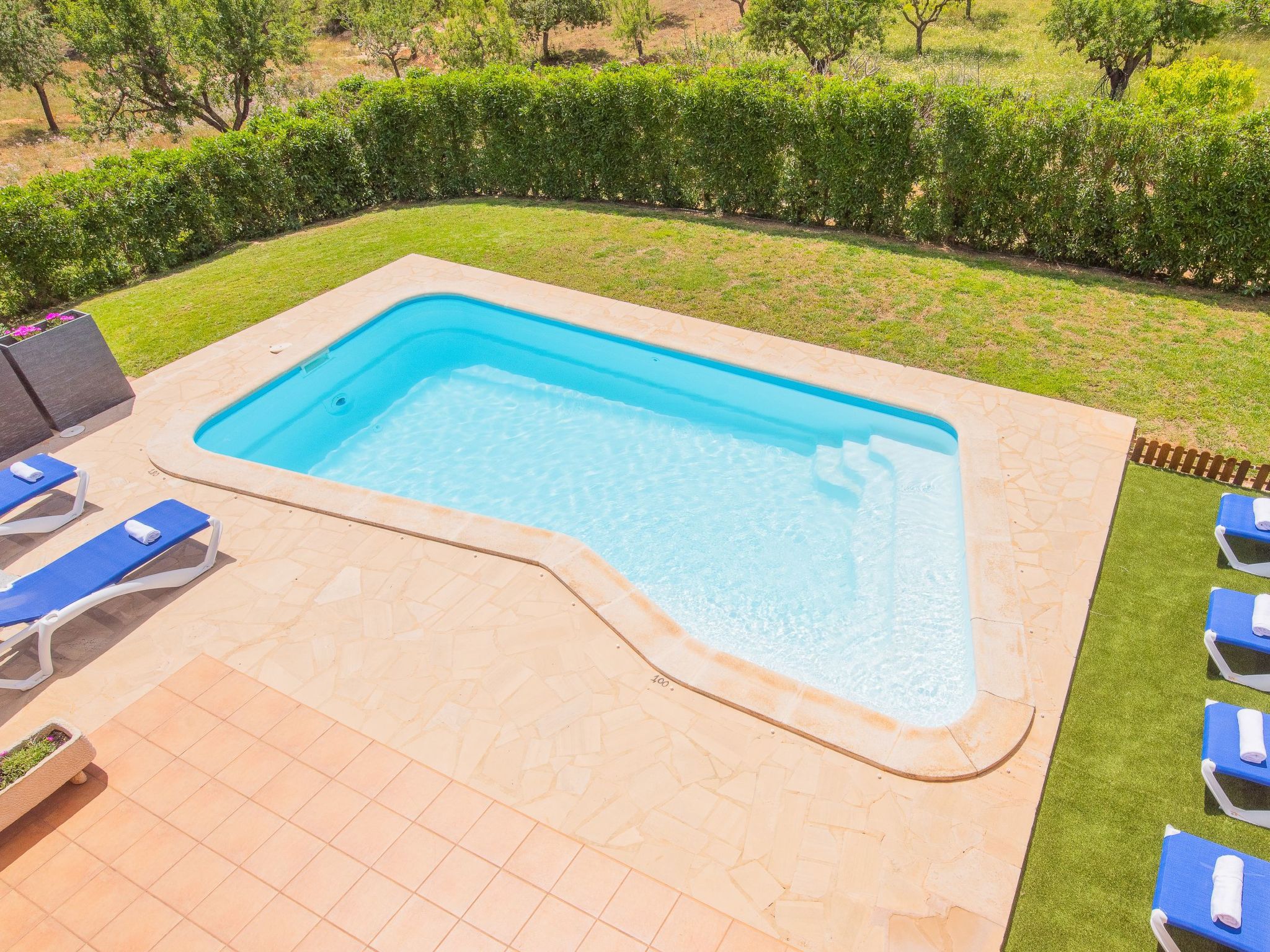 Large beautiful plot, the pool adjoins the terrace and is surrounded by lawn and natural stone tiles.