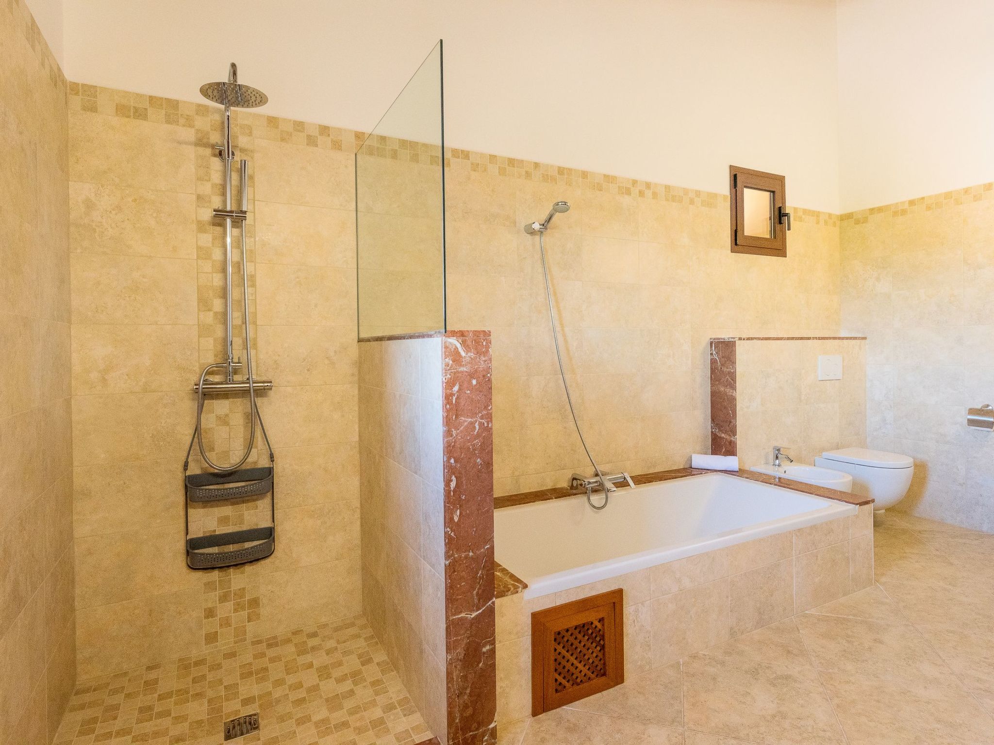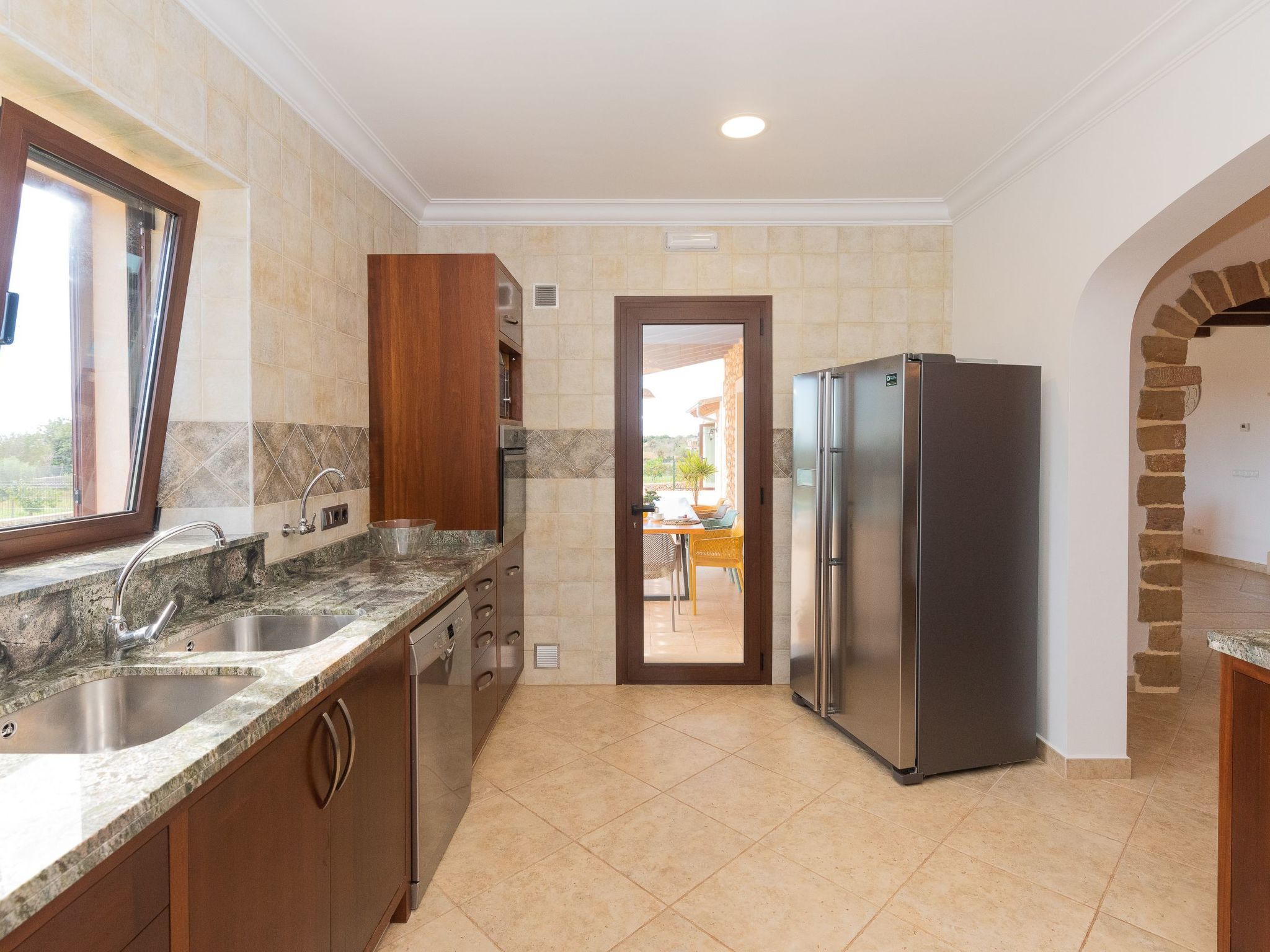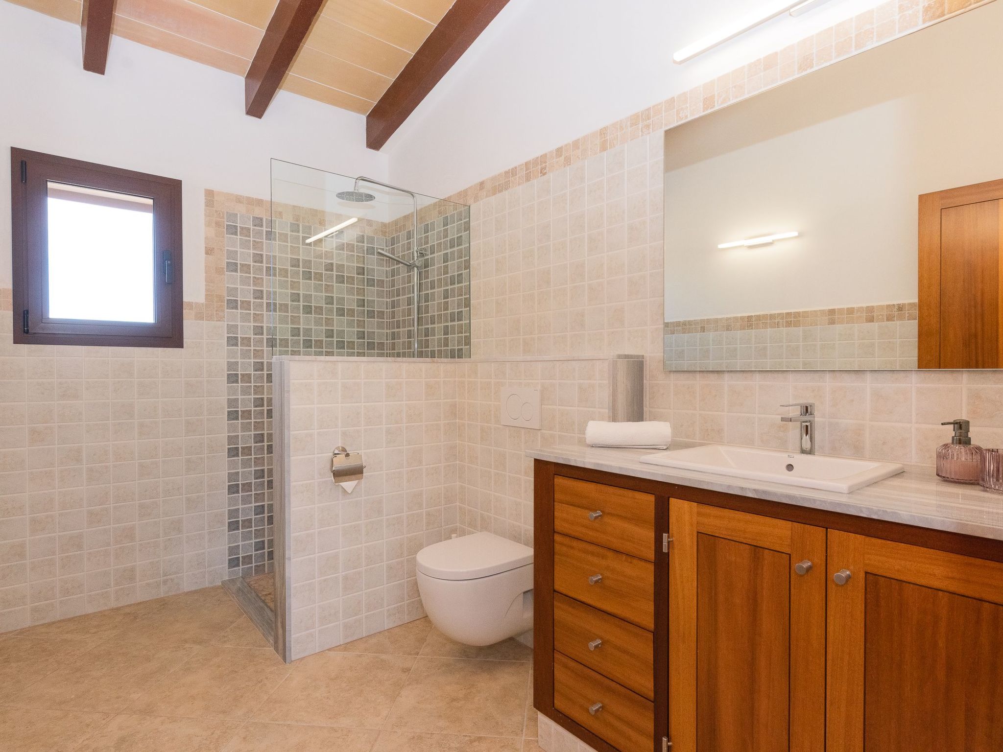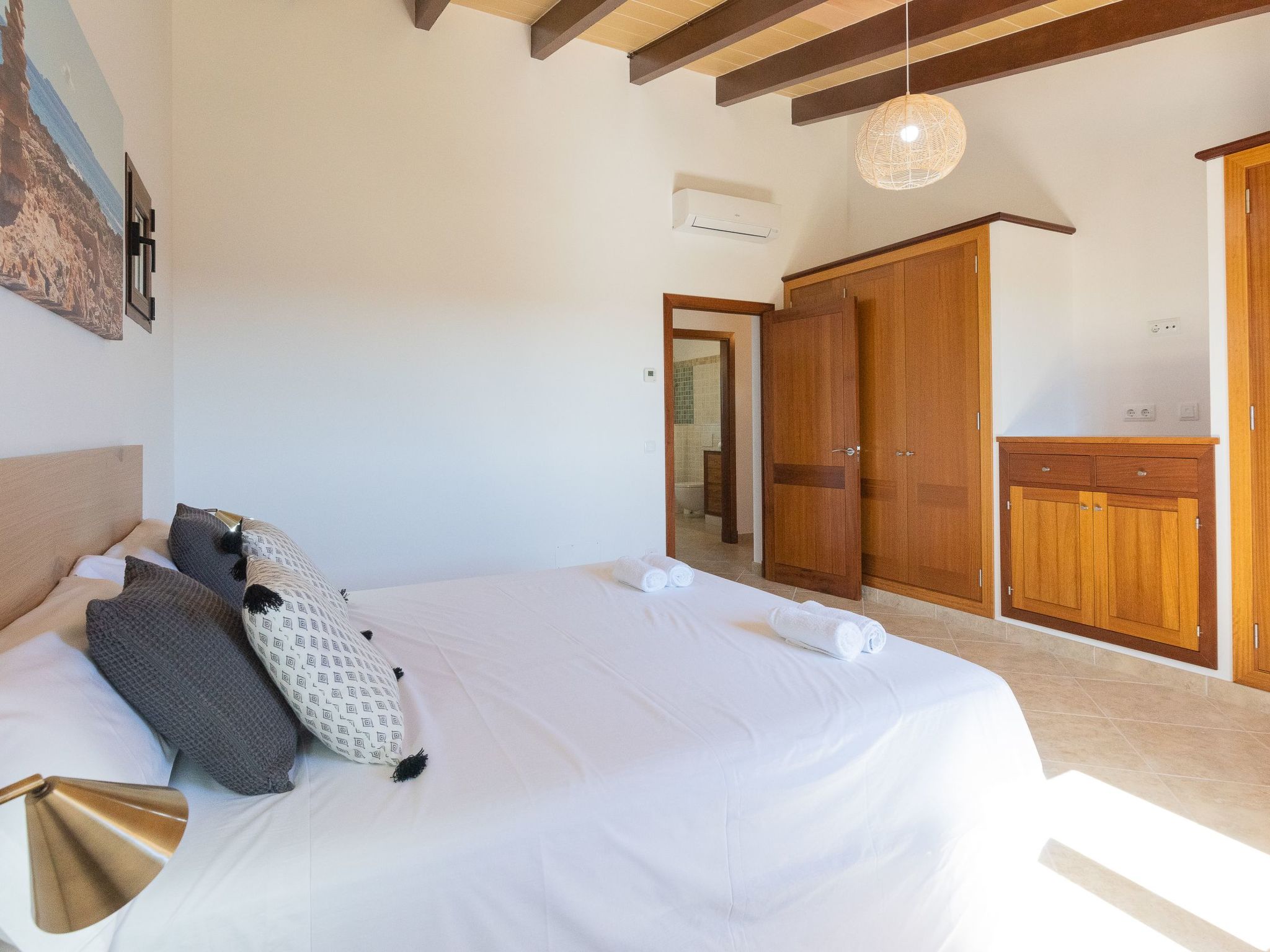 Dreamlike noble finca on two floors. On the ground floor is the living room and the open-plan kitchen with dining area. The furnishings are chic but not overloaded. There is also a bedroom with double bed and en suite shower room on the ground floor. There is also a utility room and a guest toilet. 4 further bedrooms are located on the floor. There are two bedrooms with double beds and two bedrooms with two single beds each. These rooms share 2 bathrooms, one with separate bath and shower, the other with shower. Large sun terrace with views of the rural surroundings. Very nice outdoor area. Large long veranda with dining table. Lawned garden, with pool safely fenced for small children and artificial grass area. The magnificent pool has Roman steps. There is also an outdoor shower, outdoor barbecue and garden shed with outdoor bathroom. Air conditioning hot / cold with limited and fixed usage times of 10 hours/day.