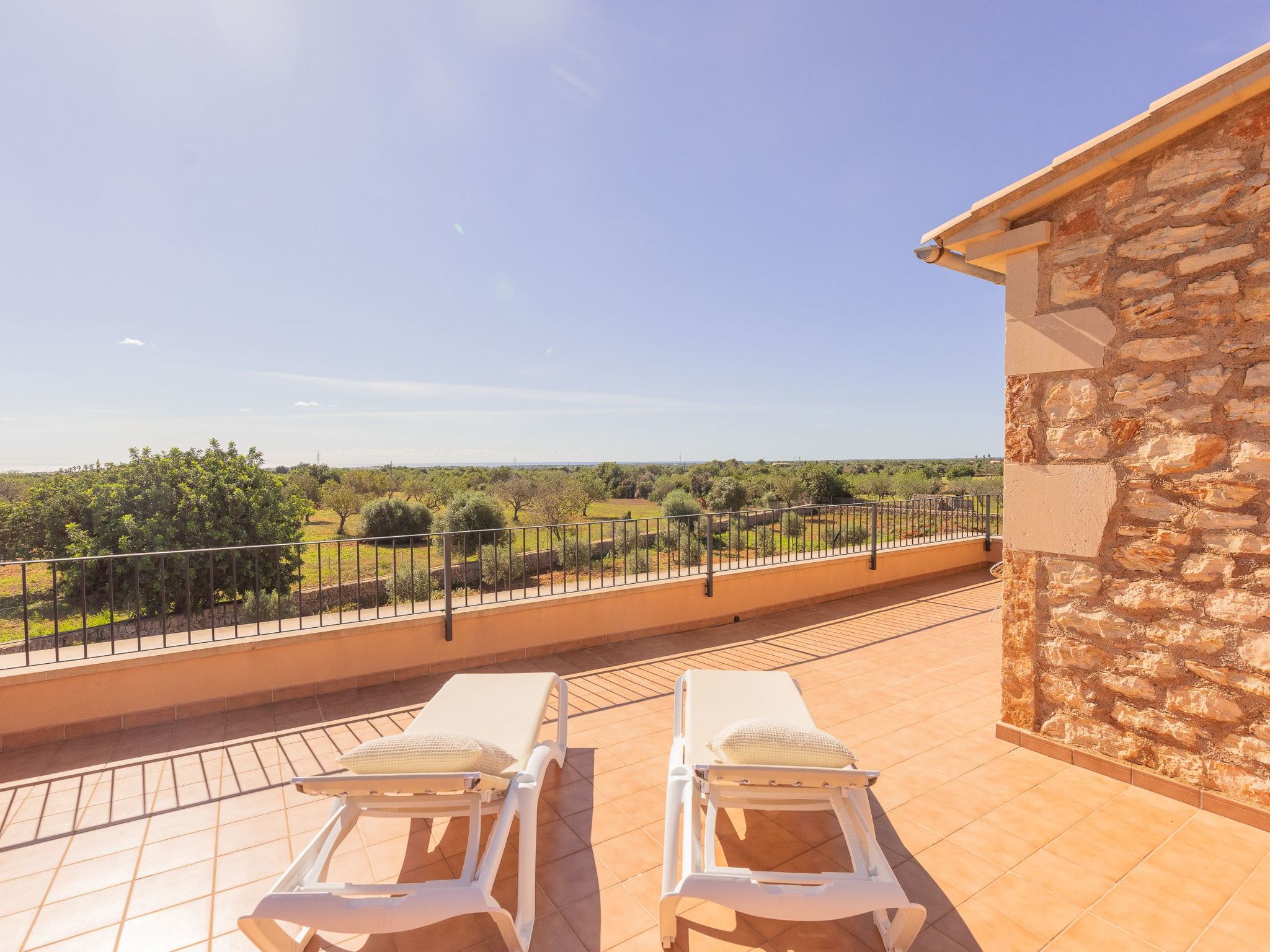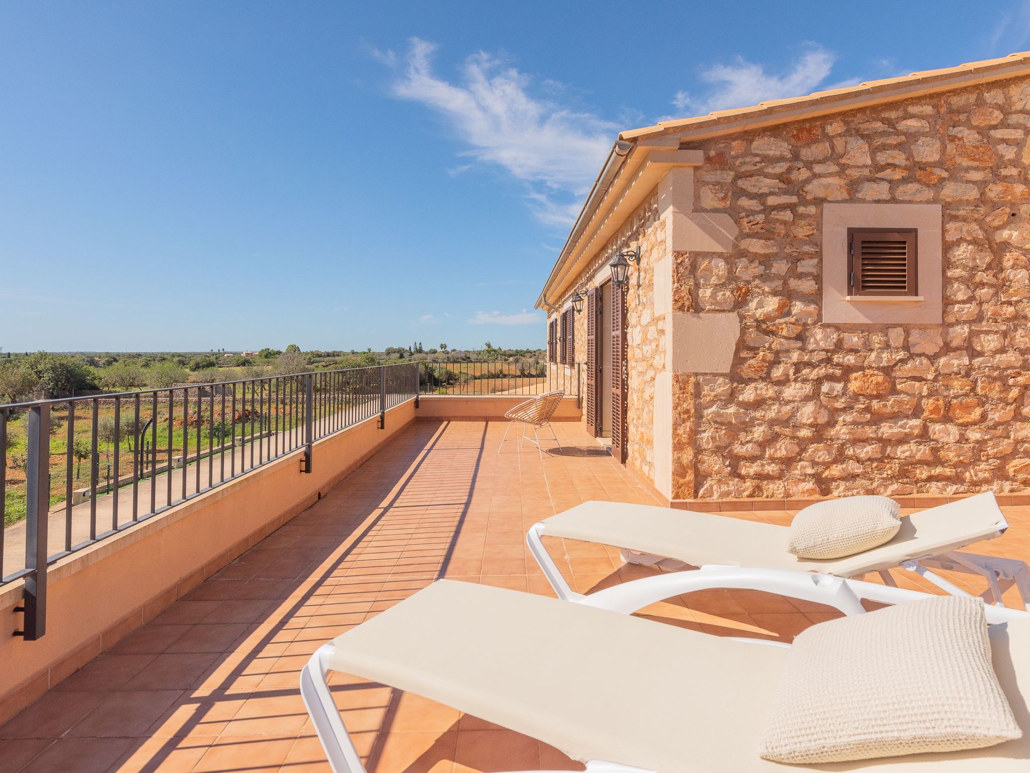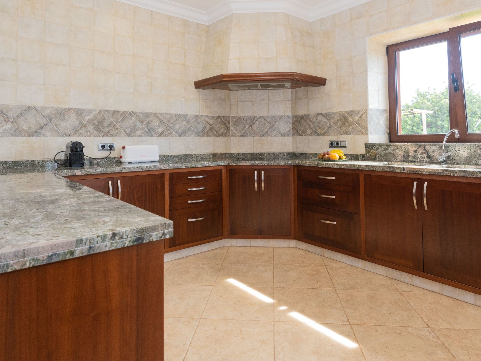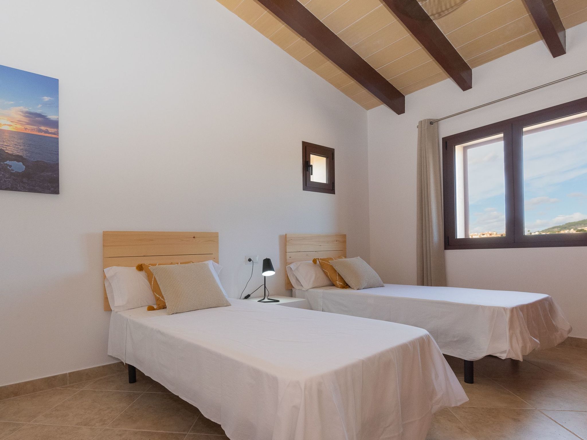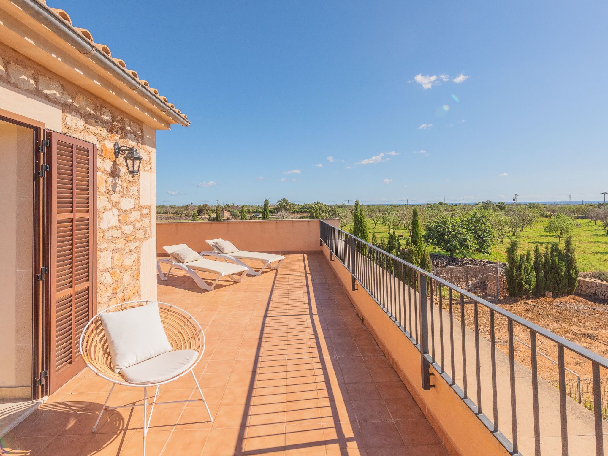 Dreamlike noble finca on two floors. On the ground floor is the living room and the open-plan kitchen with dining area. The furnishings are chic but not overloaded. There is also a bedroom with double bed and en suite shower room on the ground floor. There is also a utility room and a guest toilet. 4 further bedrooms are located on the floor. There are two bedrooms with double beds and two bedrooms with two single beds each. These rooms share 2 bathrooms, one with separate bath and shower, the other with shower. Large sun terrace with views of the rural surroundings. Very nice outdoor area. Large long veranda with dining table. Lawned garden, with pool safely fenced for small children and artificial grass area. The magnificent pool has Roman steps. There is also an outdoor shower, outdoor barbecue and garden shed with outdoor bathroom. Air conditioning hot / cold with limited and fixed usage times of 10 hours/day.