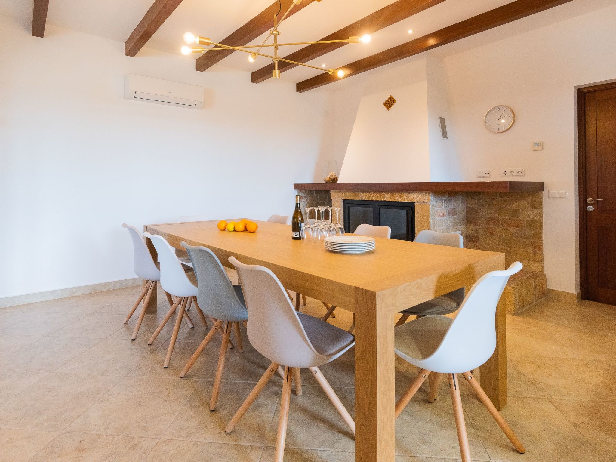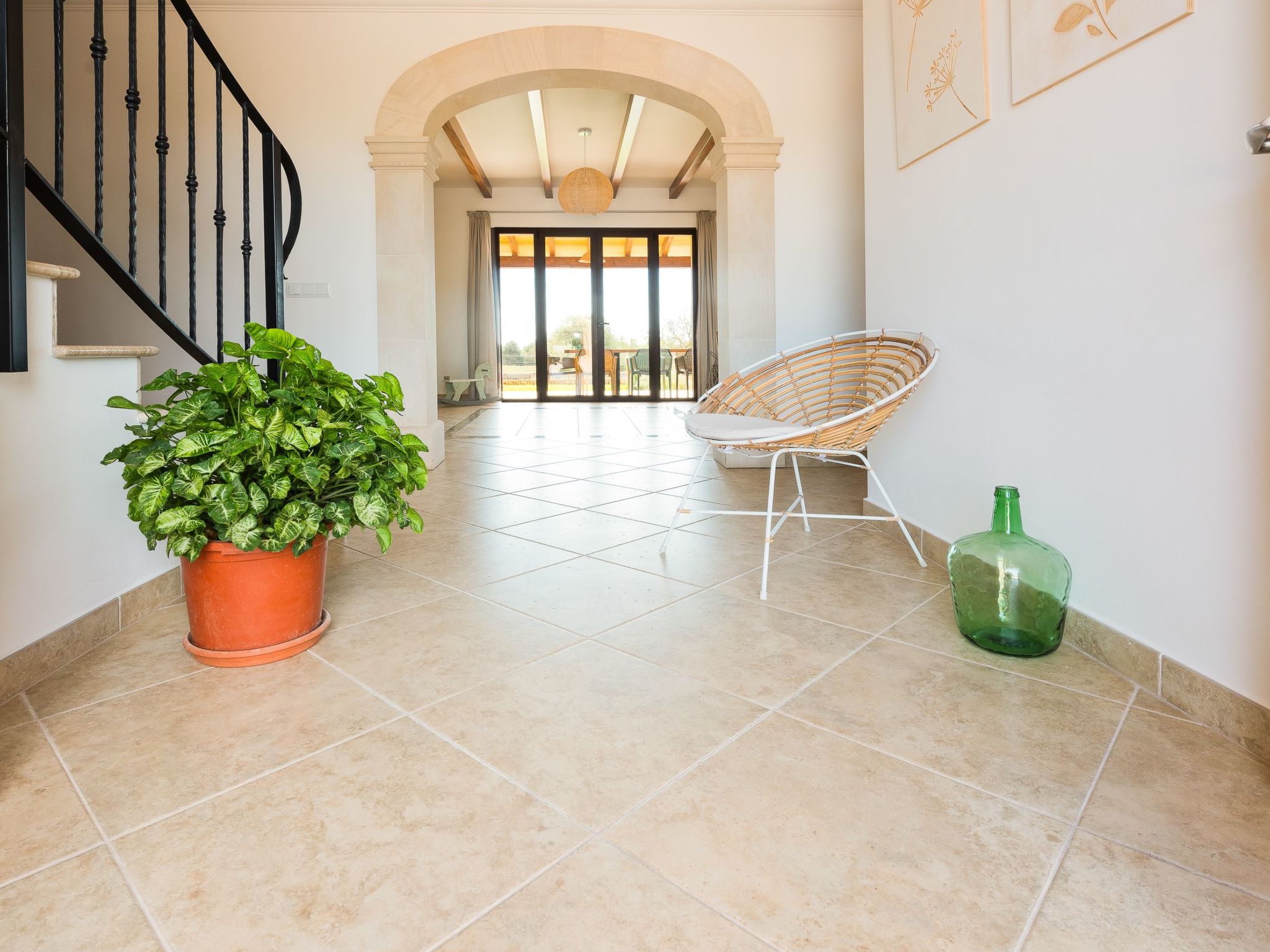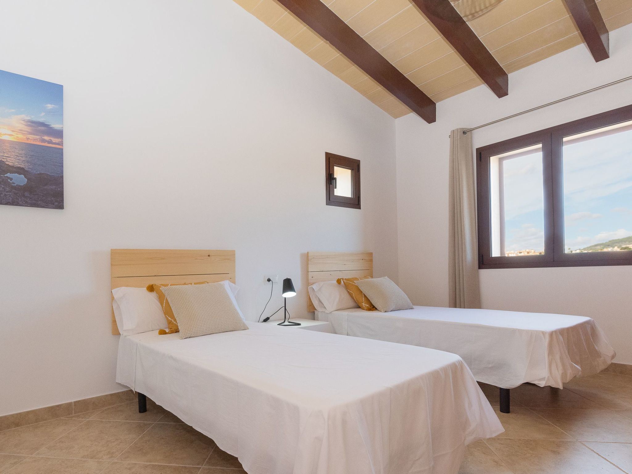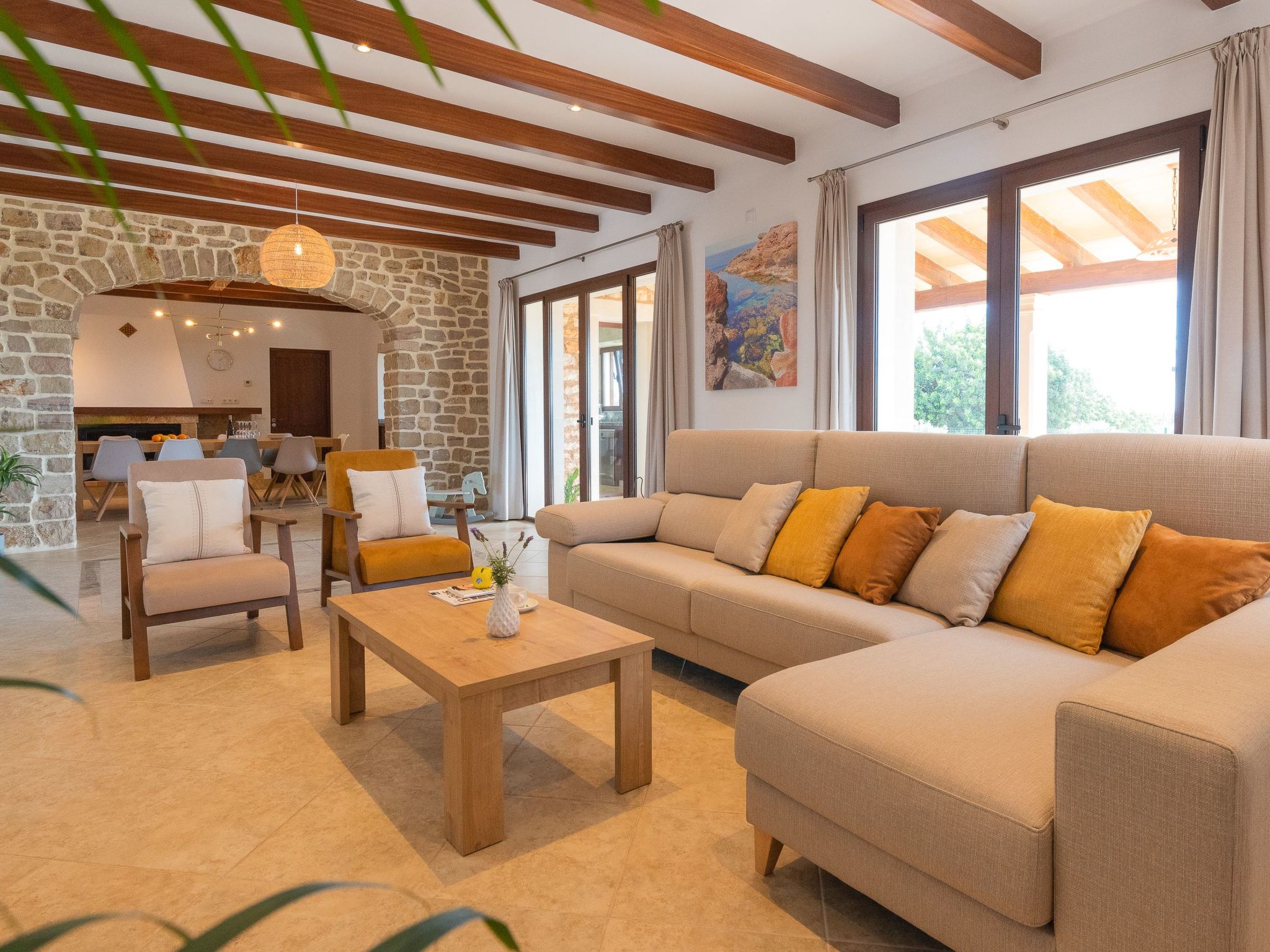 Dreamlike noble finca on two floors. On the ground floor is the living room and the open-plan kitchen with dining area. The furnishings are chic but not overloaded. There is also a bedroom with double bed and en suite shower room on the ground floor. There is also a utility room and a guest toilet. 4 further bedrooms are located on the floor. There are two bedrooms with double beds and two bedrooms with two single beds each. These rooms share 2 bathrooms, one with separate bath and shower, the other with shower. Large sun terrace with views of the rural surroundings. Very nice outdoor area. Large long veranda with dining table. Lawned garden, with pool safely fenced for small children and artificial grass area. The magnificent pool has Roman steps. There is also an outdoor shower, outdoor barbecue and garden shed with outdoor bathroom. Air conditioning hot / cold with limited and fixed usage times of 10 hours/day.