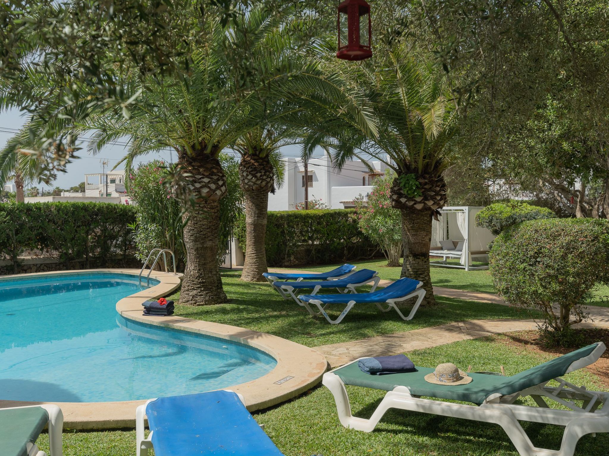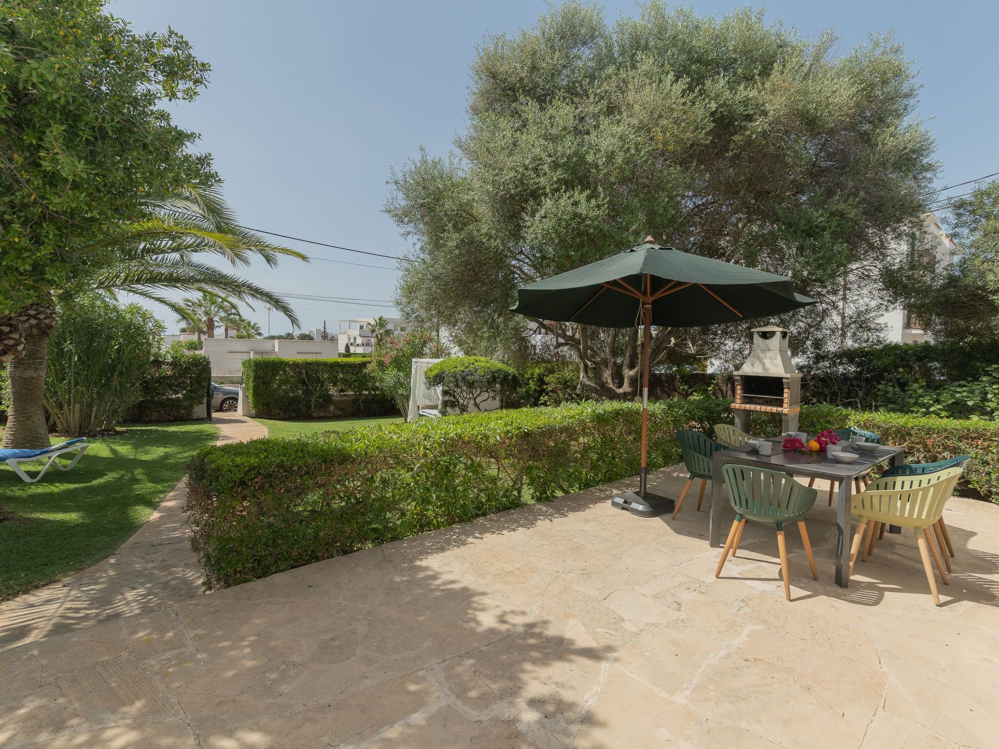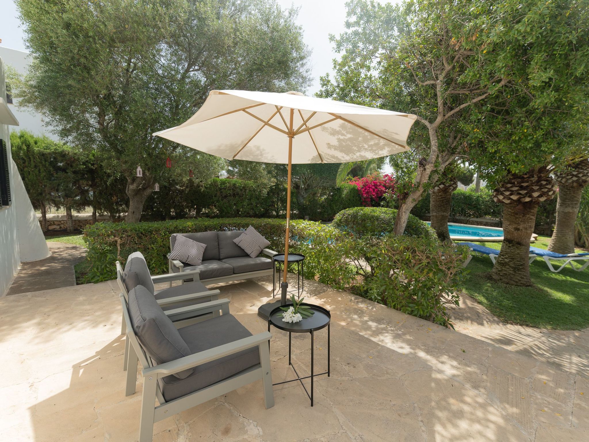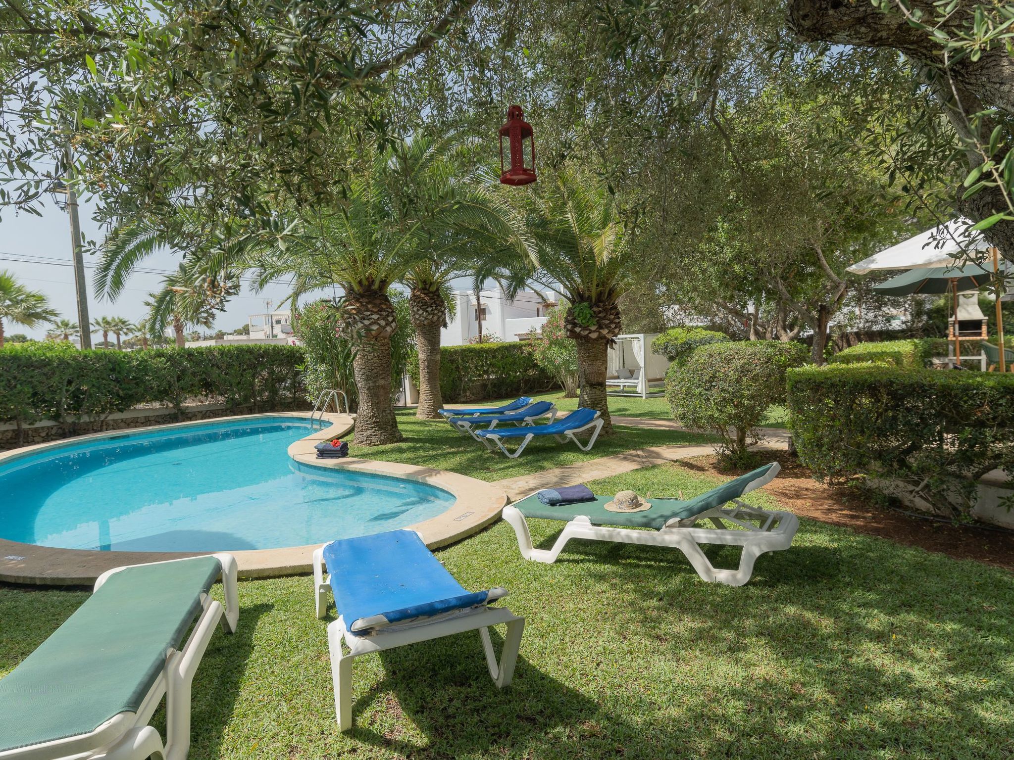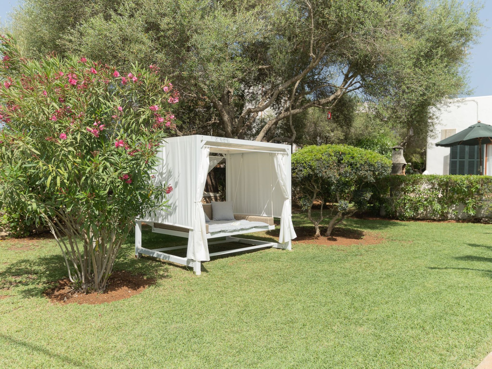 Dora has a garden with a well-kept lawn, Mediterranean plants, palm trees and olive trees, which provide welcome shade during the hot summer days. At the front there is a terrace overlooking the garden and the pool, with a table and chairs so that the delicacies prepared on the barbecue can be enjoyed "al fresco". The kidney-shaped pool with brick steps and a ladder offers refreshment, while the sun loungers invite you to enjoy the long summer days there. A cosy chill-out set also enriches the outdoor area.