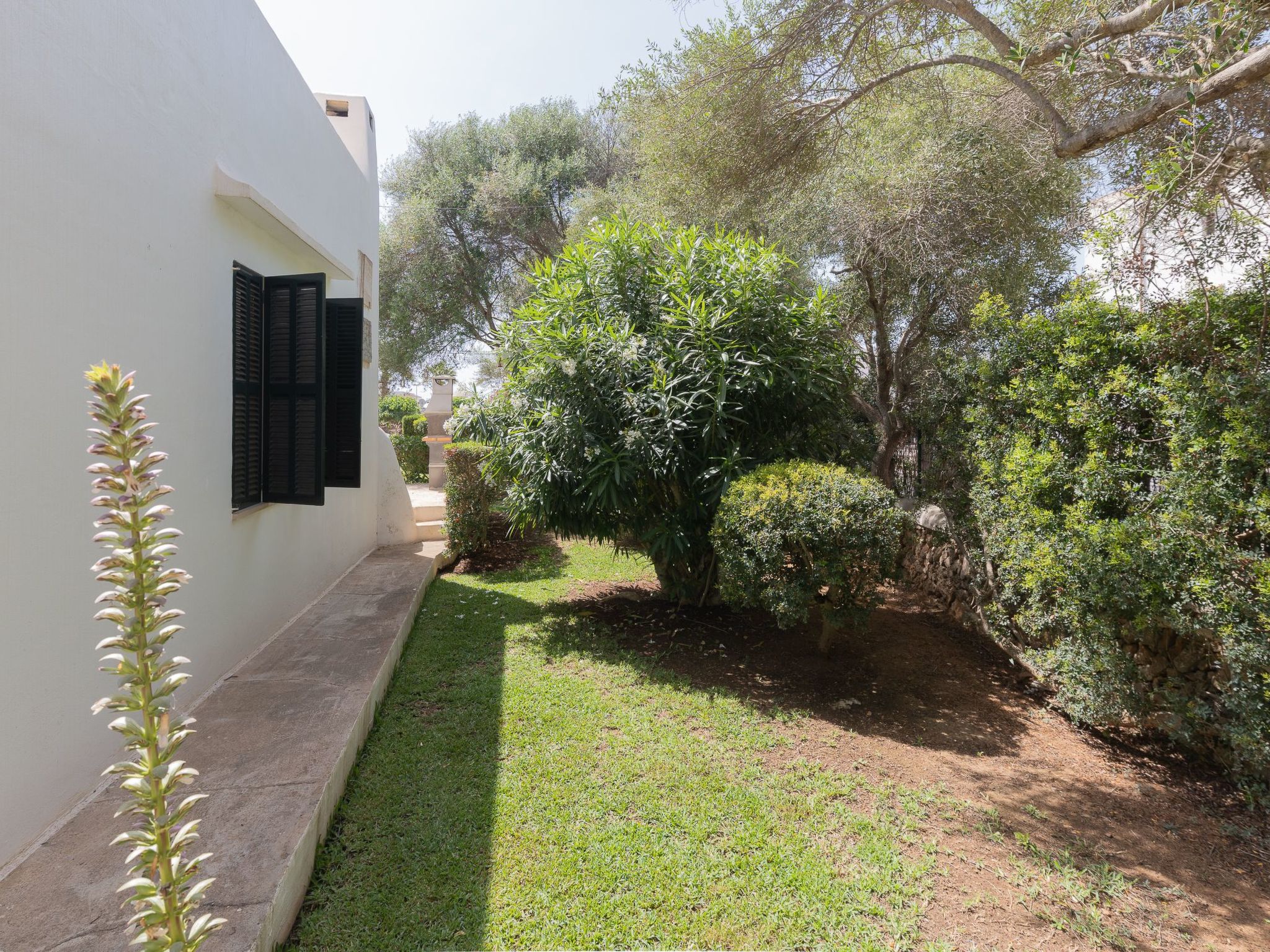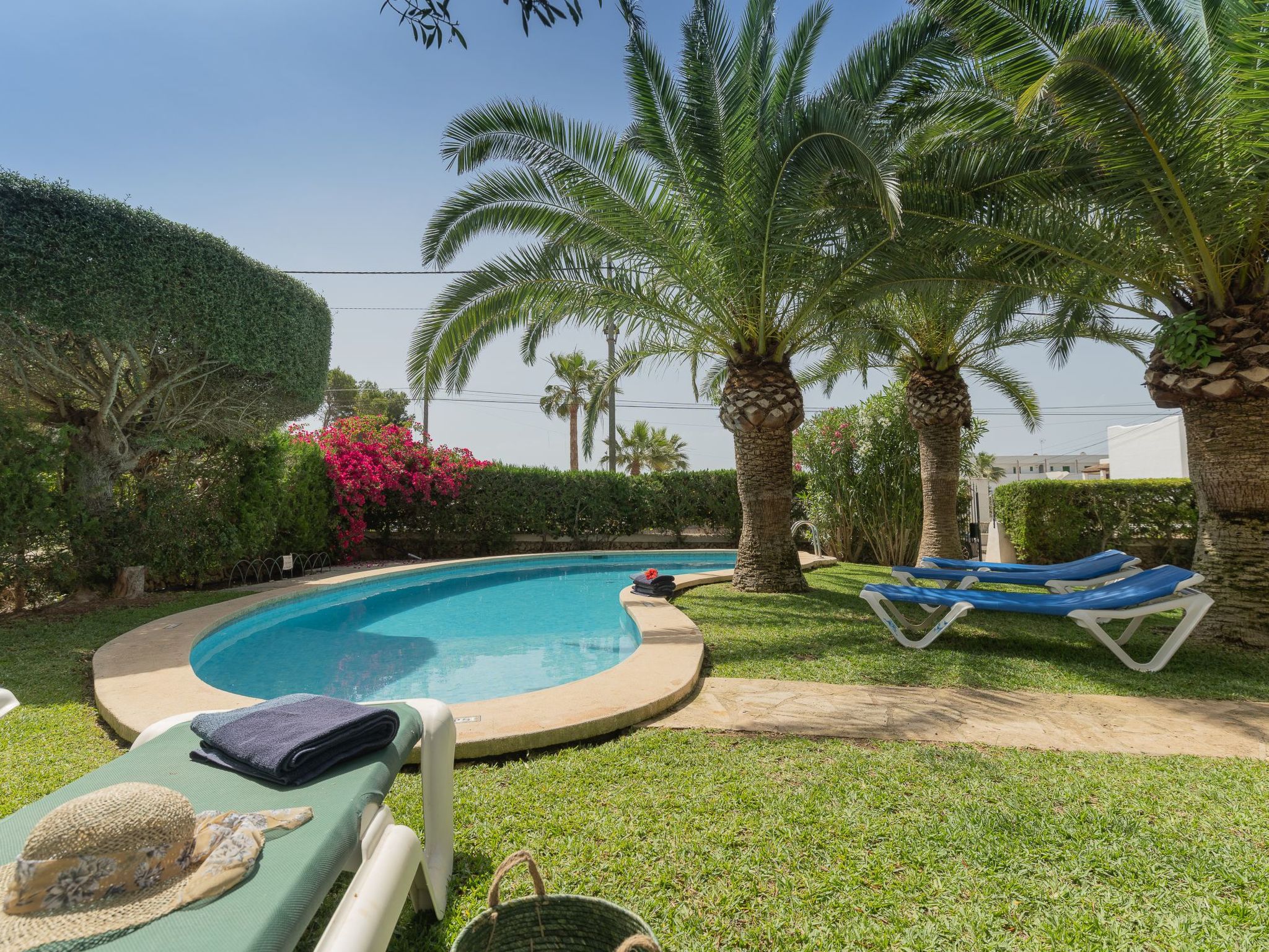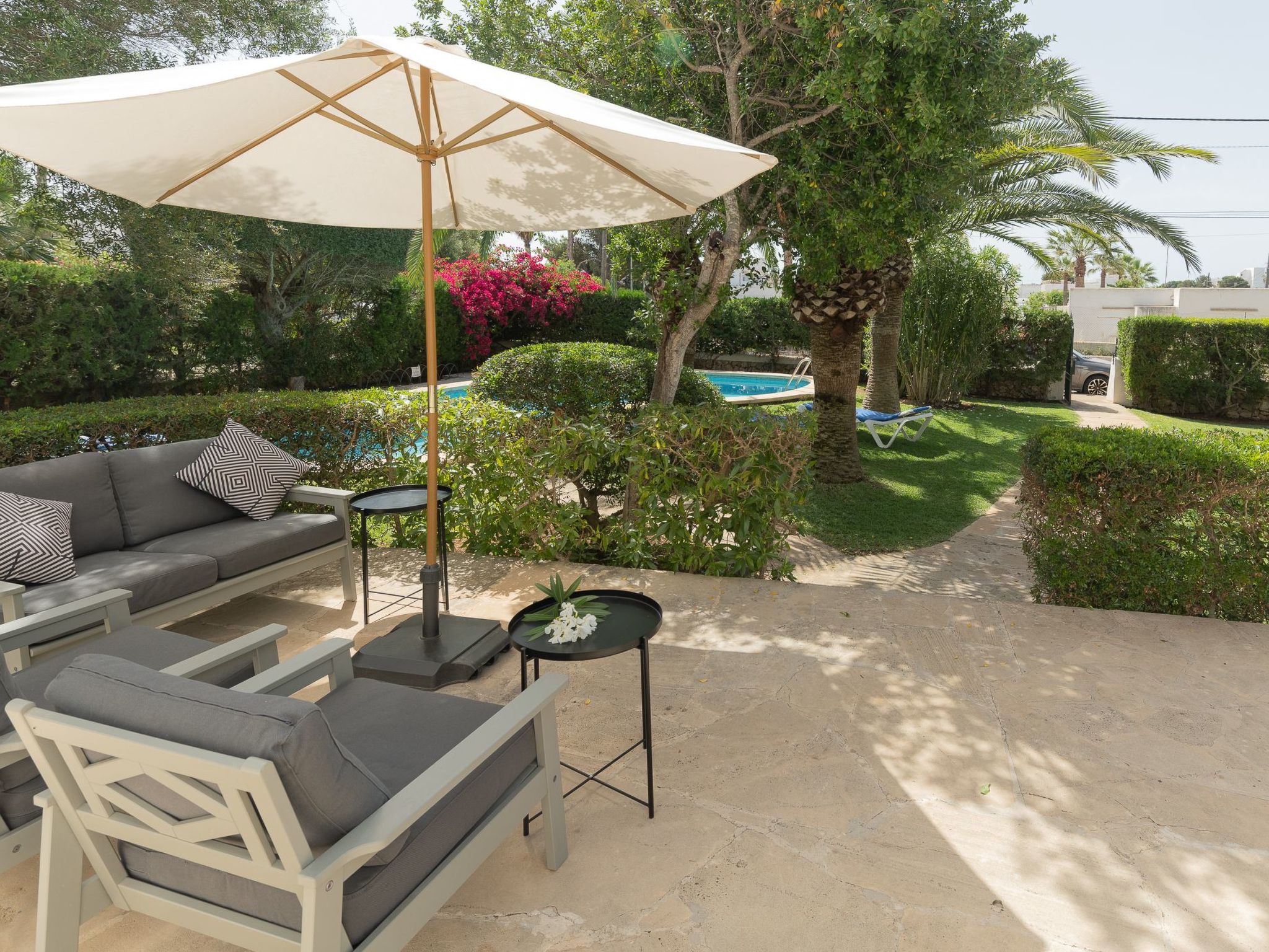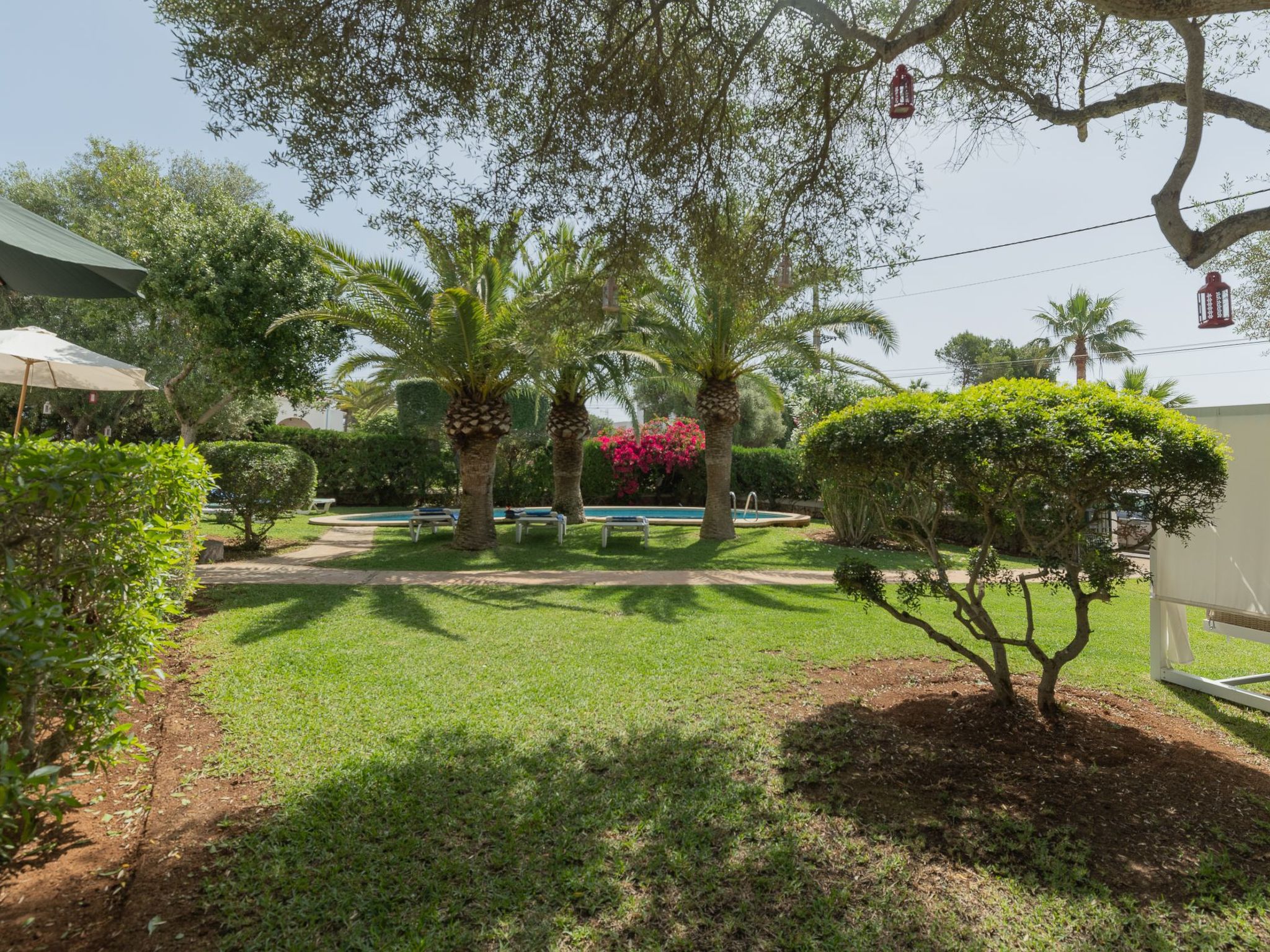 Dora has a garden with a well-kept lawn, Mediterranean plants, palm trees and olive trees, which provide welcome shade during the hot summer days. At the front there is a terrace overlooking the garden and the pool, with a table and chairs so that the delicacies prepared on the barbecue can be enjoyed "al fresco". The kidney-shaped pool with brick steps and a ladder offers refreshment, while the sun loungers invite you to enjoy the long summer days there. A cosy chill-out set also enriches the outdoor area.