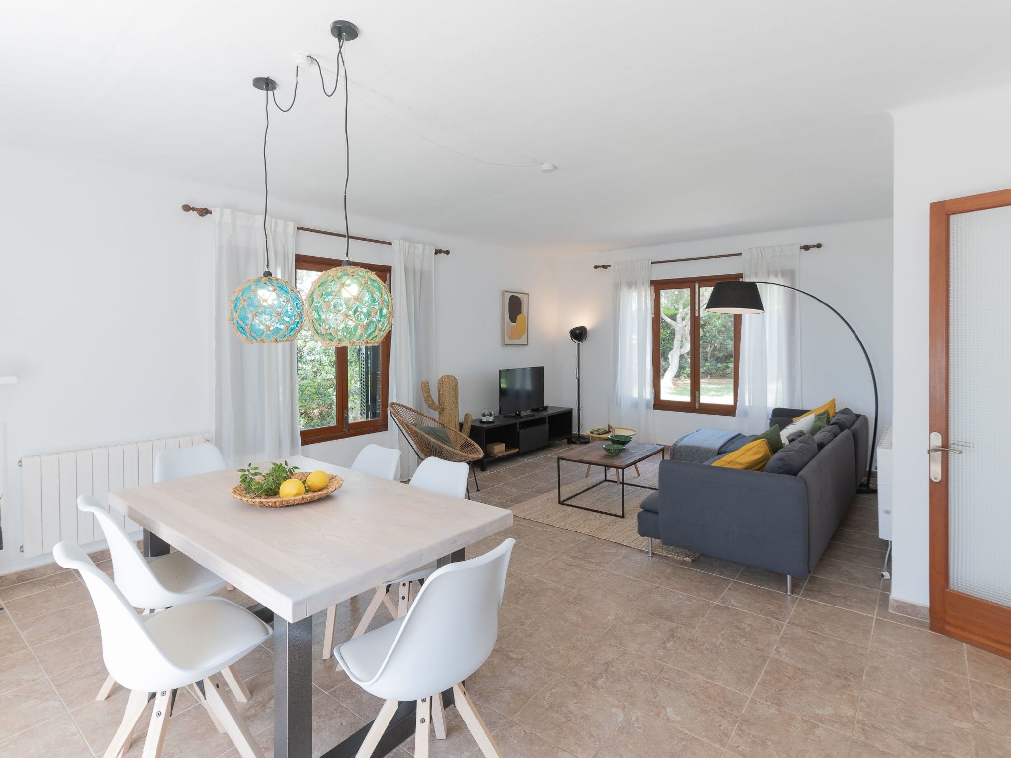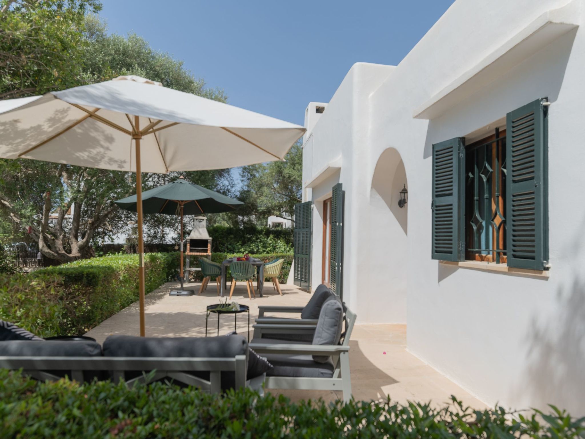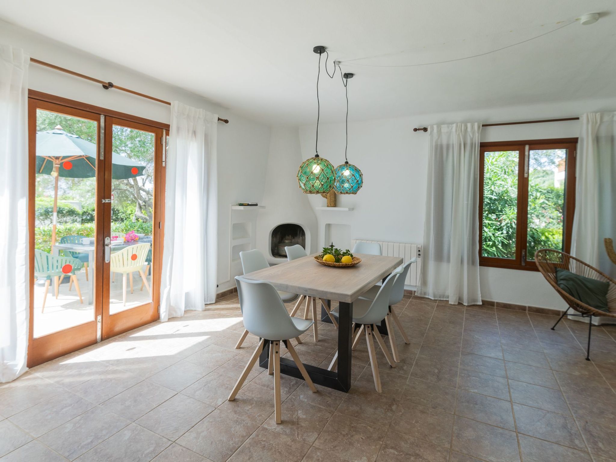 The house Dora is built in the typical Ibizan style of Cala D'Or and has been recently renovated while retaining some original elements. The entrance leads directly into the spacious living/dining room with a cosy sofa and dining area. French doors lead out onto the terrace and pool area. The well-equipped kitchen has access to the terrace and the rear garden. Three bedrooms are available. Two rooms each have two single beds, the third room has a double bed. The bedrooms share two modern bathrooms with showers.