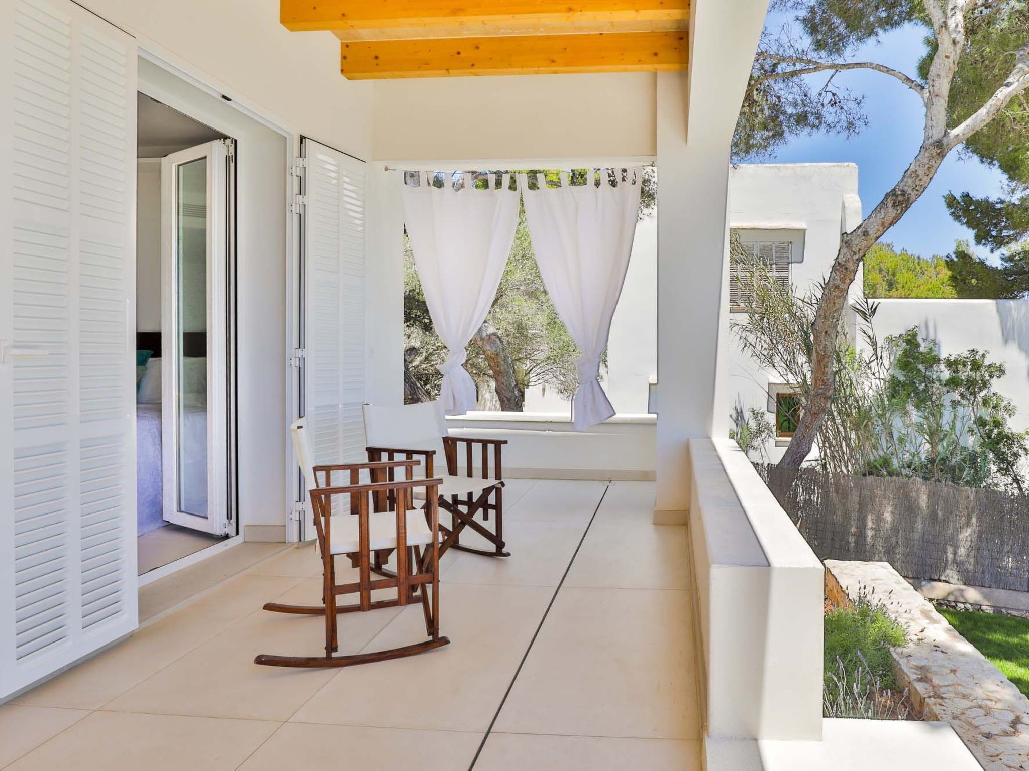 Veranda with chill-out area and dining table. The marvellous view from the veranda and the pool as well as the gentle sound of the sea will make your stay a wonderful experience. The garden extends towards the rocks with access to the sea.