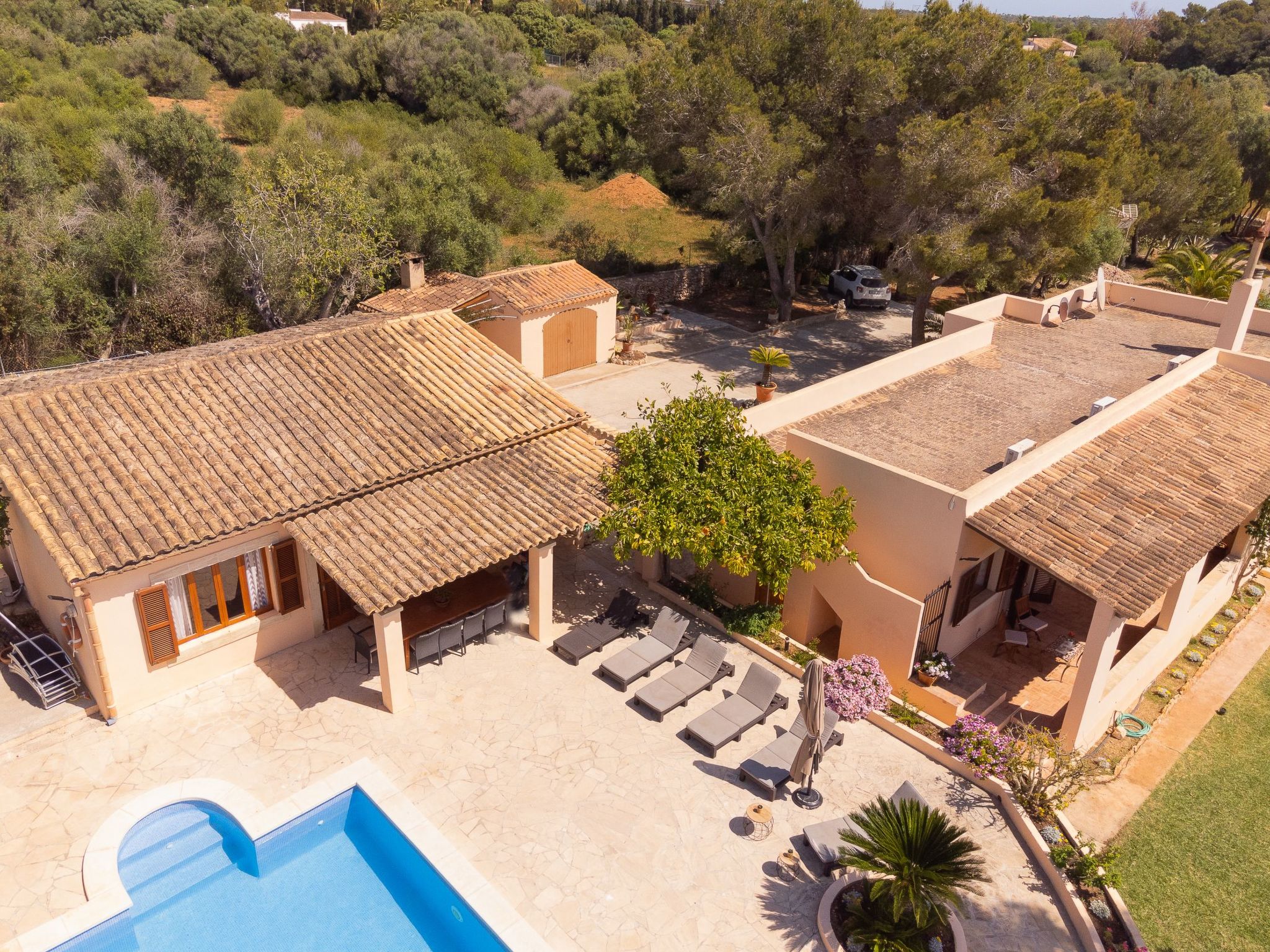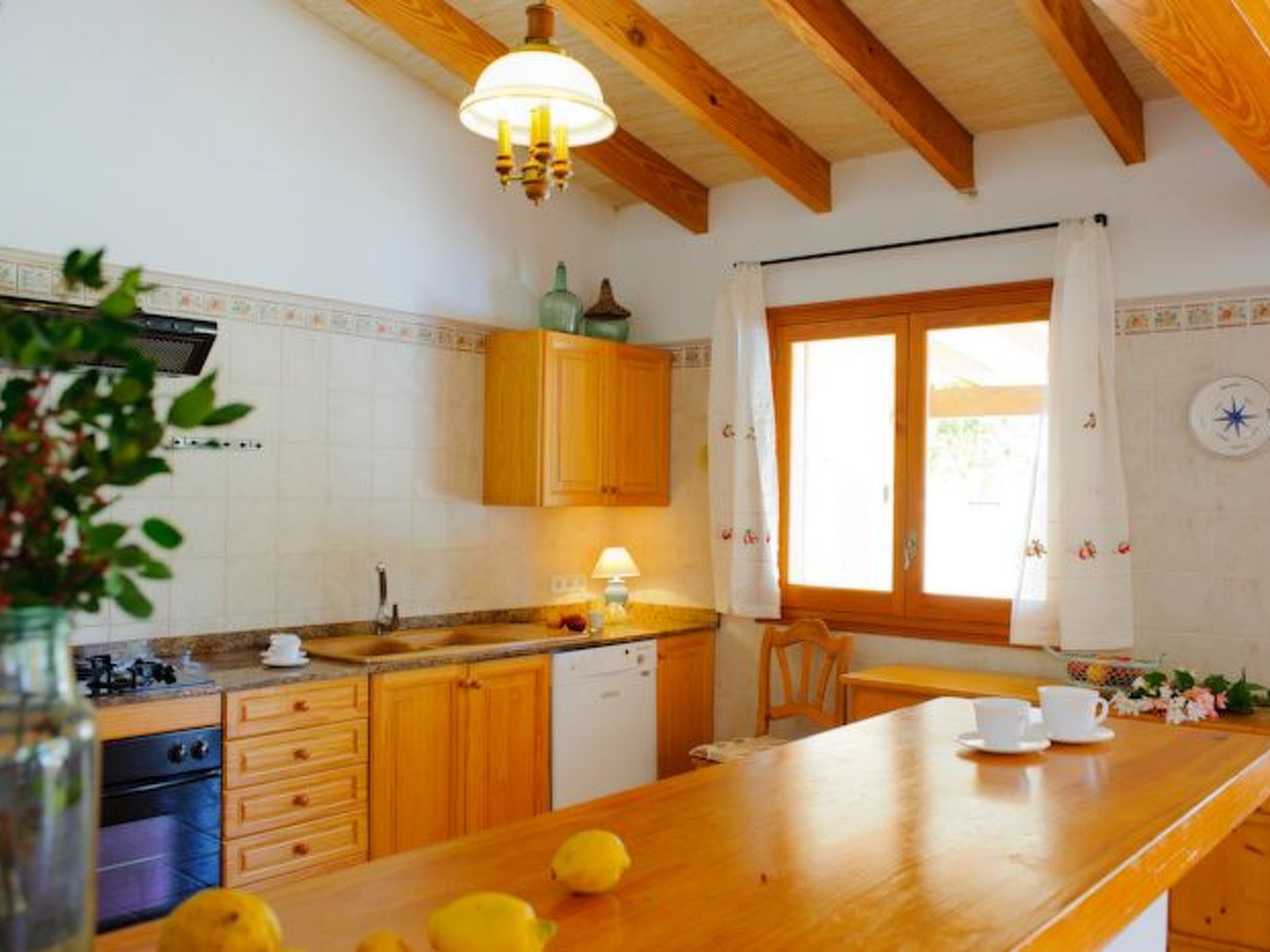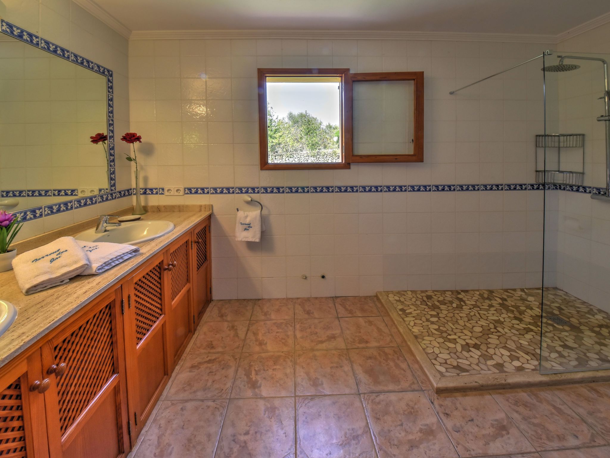 The finca is made up of two separate houses and is therefore ideal for large families and groups who like to holiday together but want to enjoy a certain degree of independence. The main house has a beautiful traditionally furnished living/dining area with vaulted ceilings and the American kitchen directly connected to it. In the main house there are two bedrooms with en suite bathrooms, one with a double bed and the other with two single beds. From the living/dining area you have access to the covered terrace and the pool. Here you can enjoy meals in the open air.