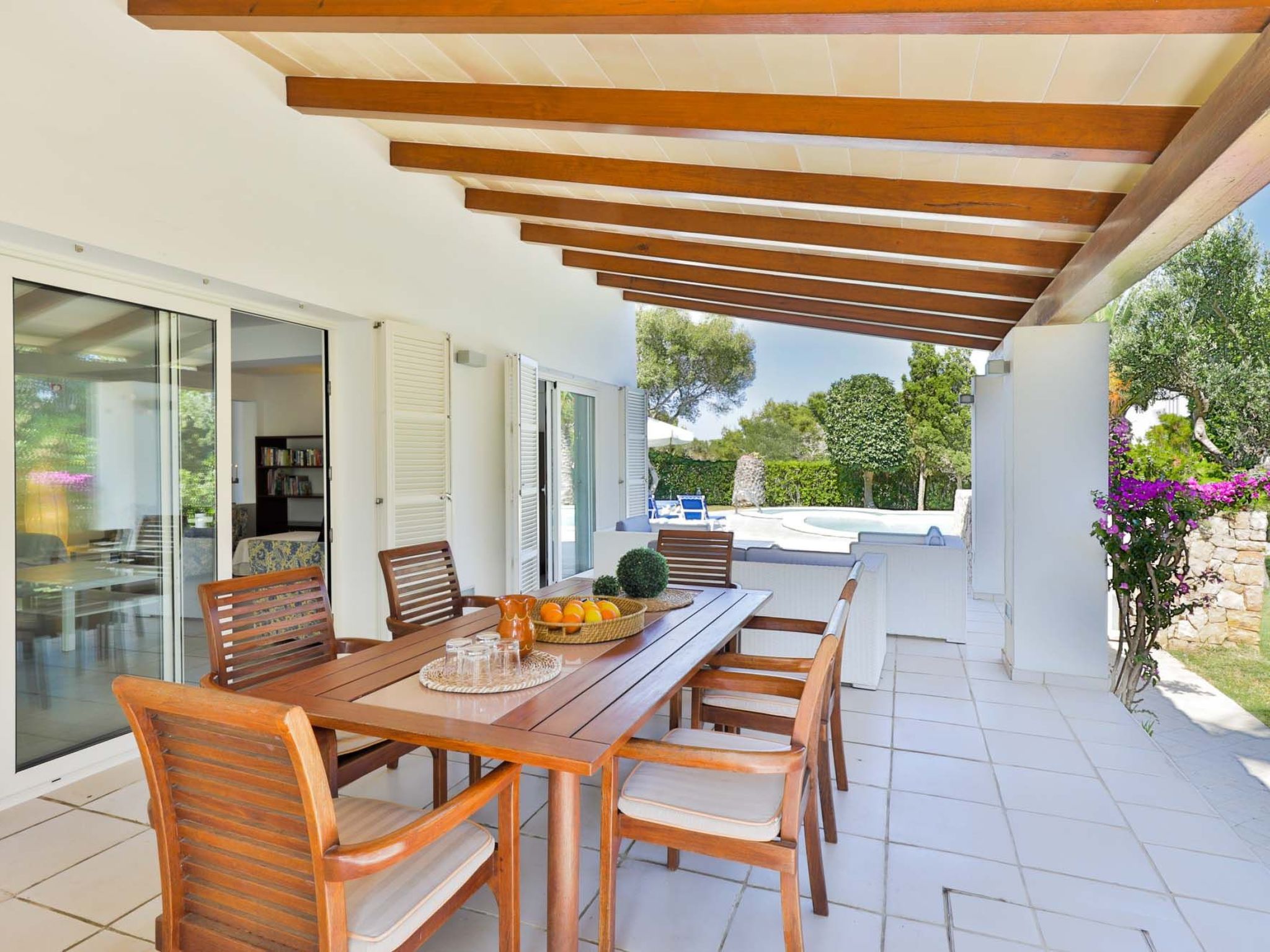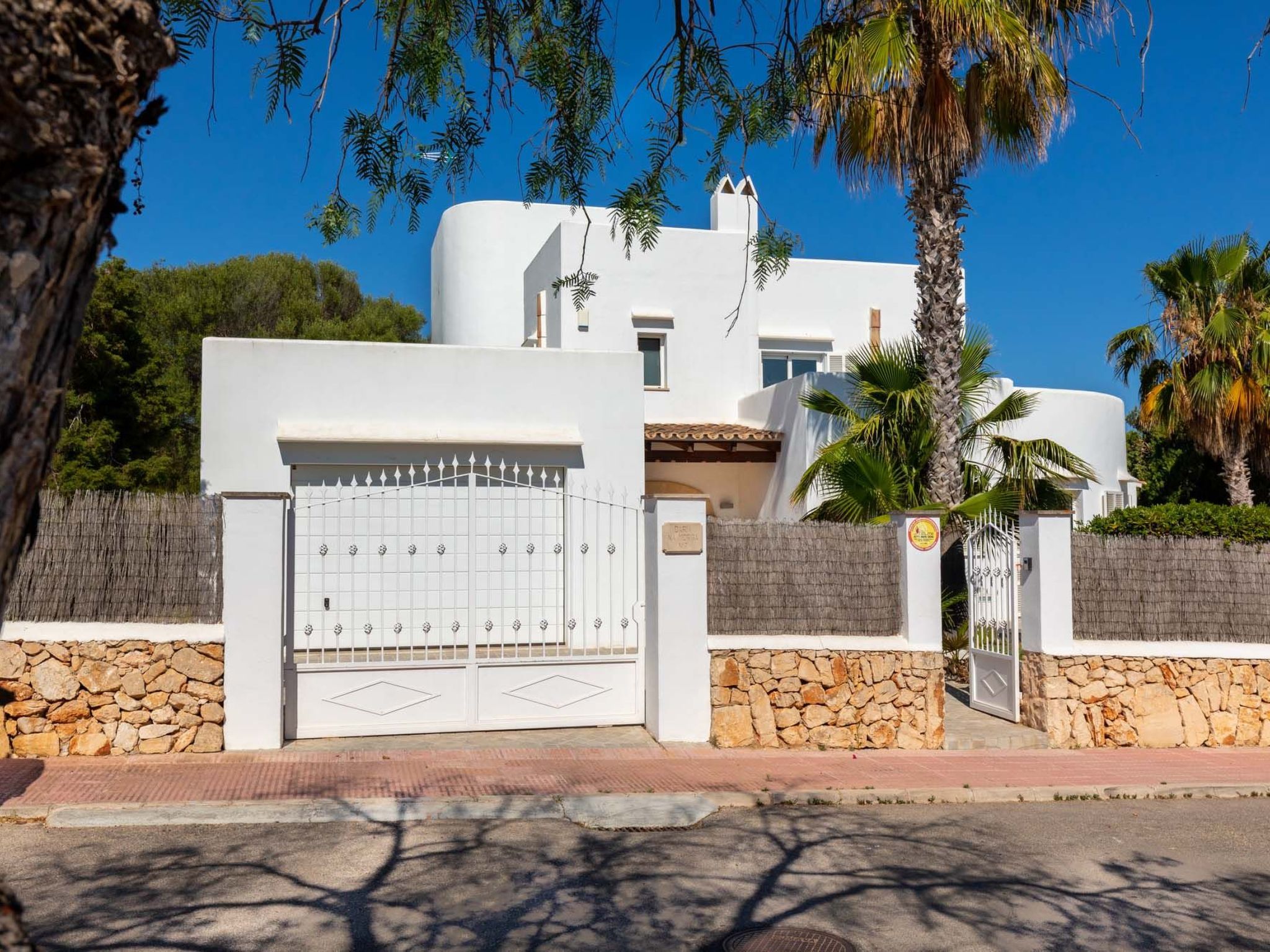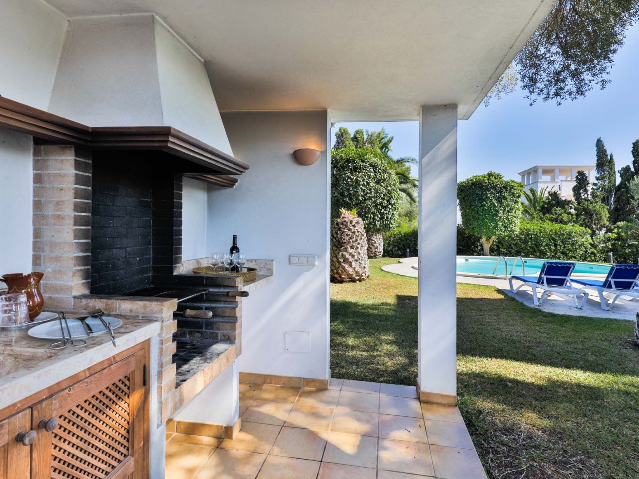 The villa is surrounded by a fairytale garden. Colourful flowers, palm trees, pine trees and the Bougenvillea plants are a feast for the eyes. The large round pool, surrounded by sun loungers and with a large parasol, completes the immaculate outdoor area. There is also a covered barbecue area and a shower with WC.
