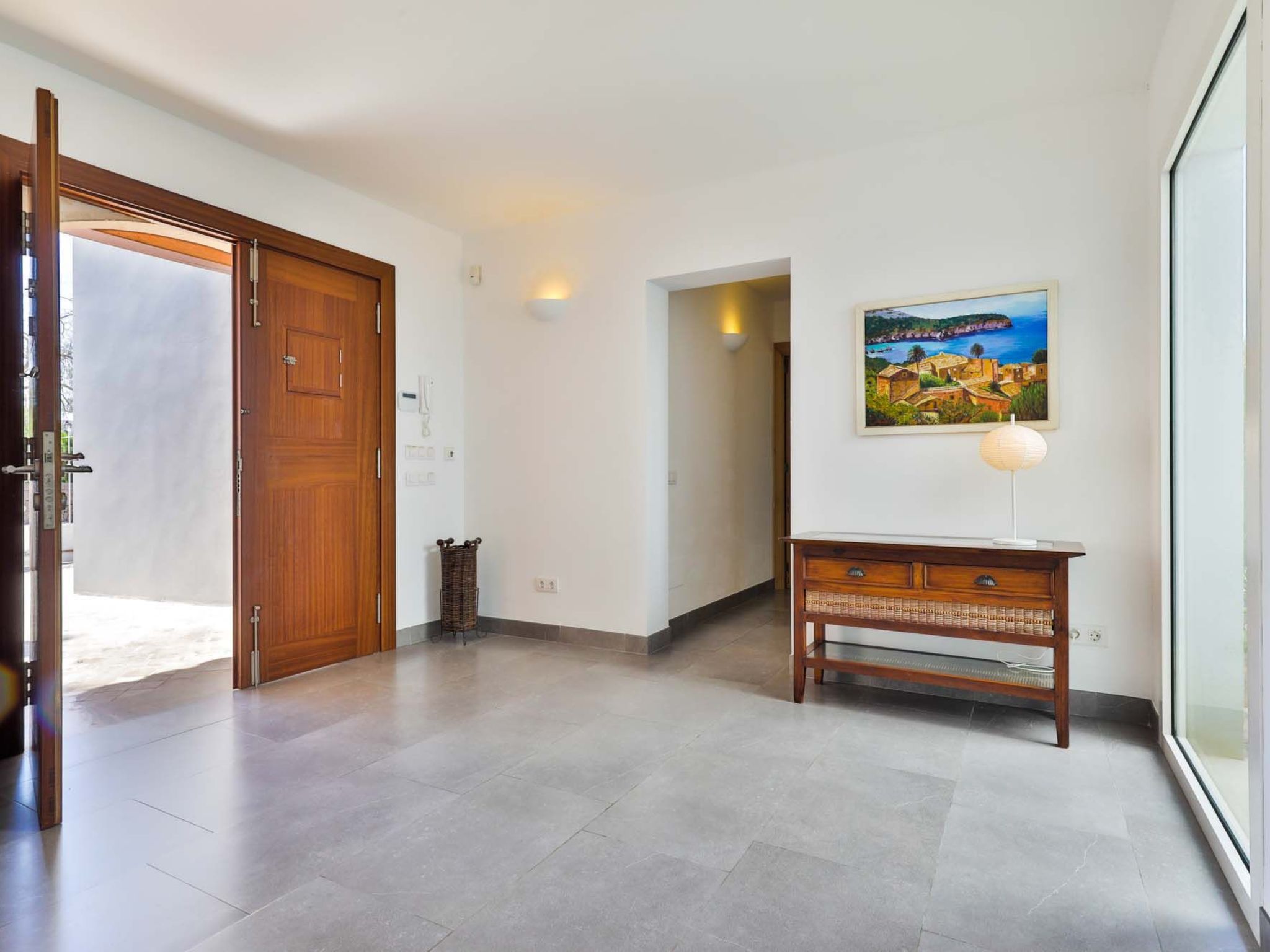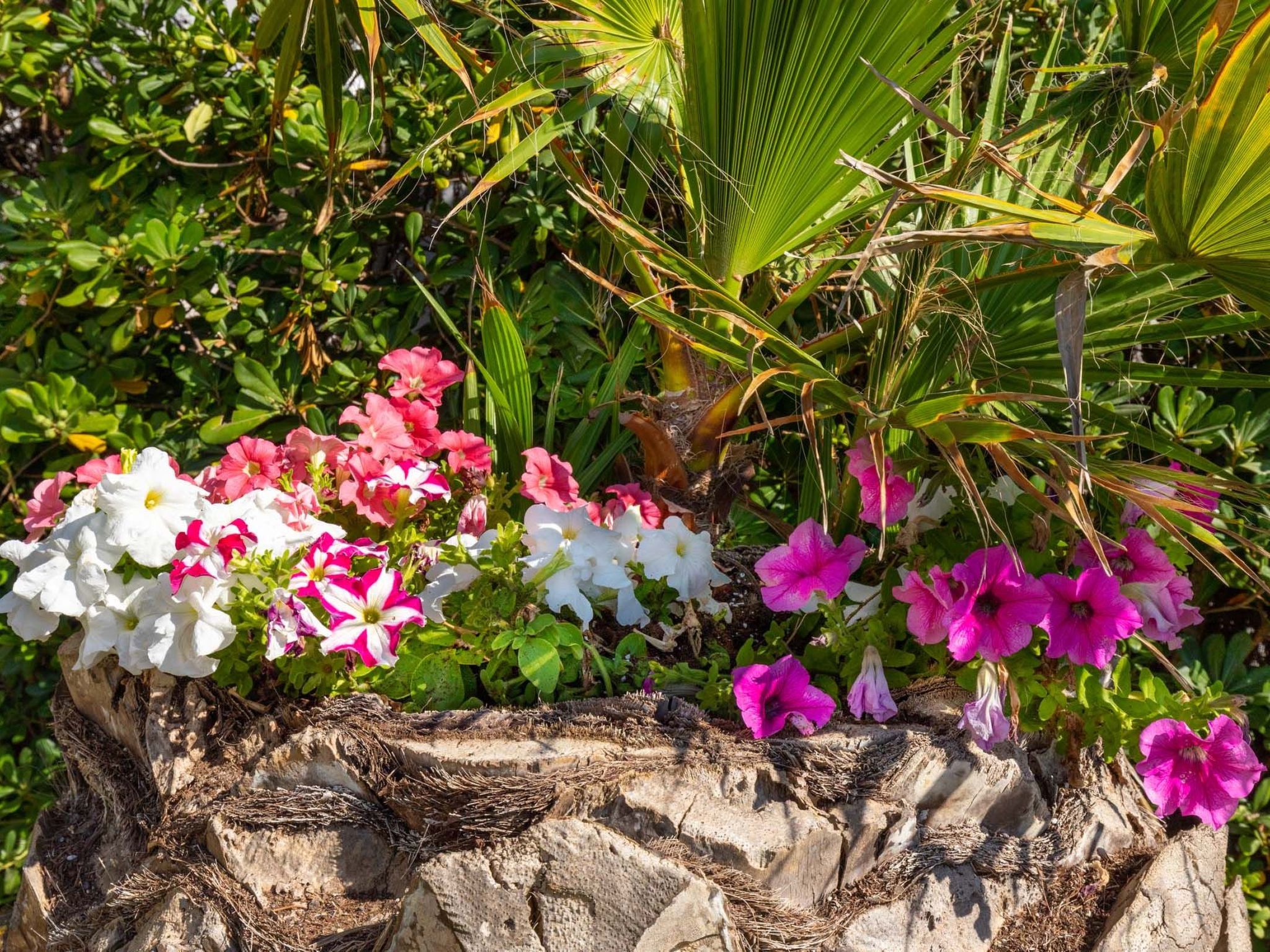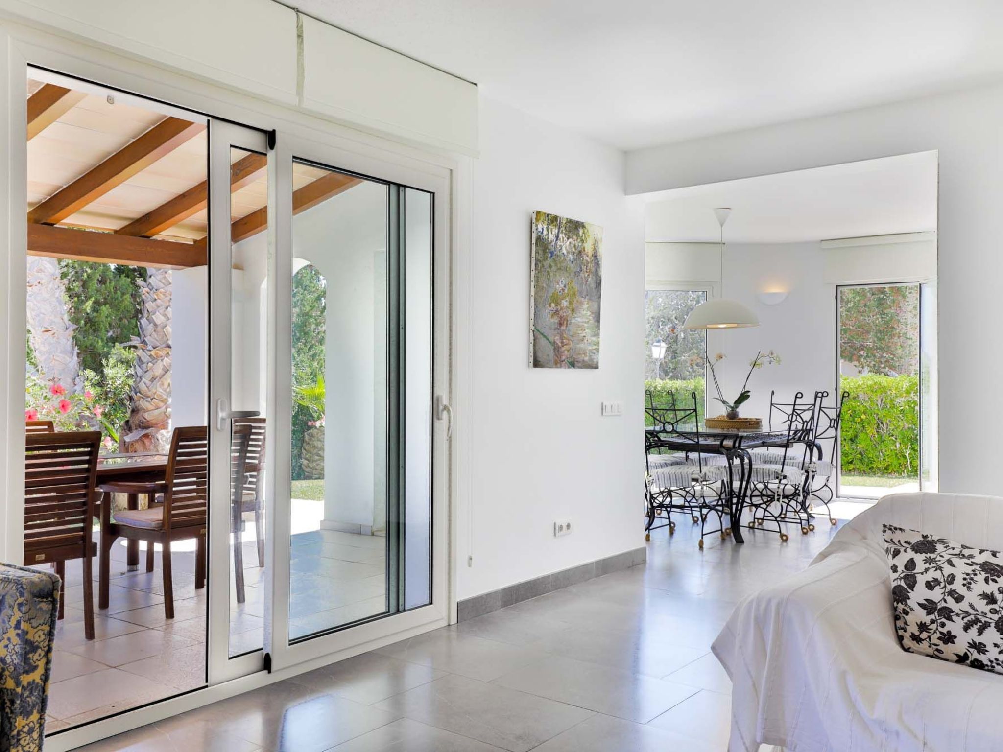 The villa is surrounded by a fairytale garden. Colourful flowers, palm trees, pine trees and the Bougenvillea plants are a feast for the eyes. The large round pool, surrounded by sun loungers and with a large parasol, completes the immaculate outdoor area. There is also a covered barbecue area and a shower with WC.