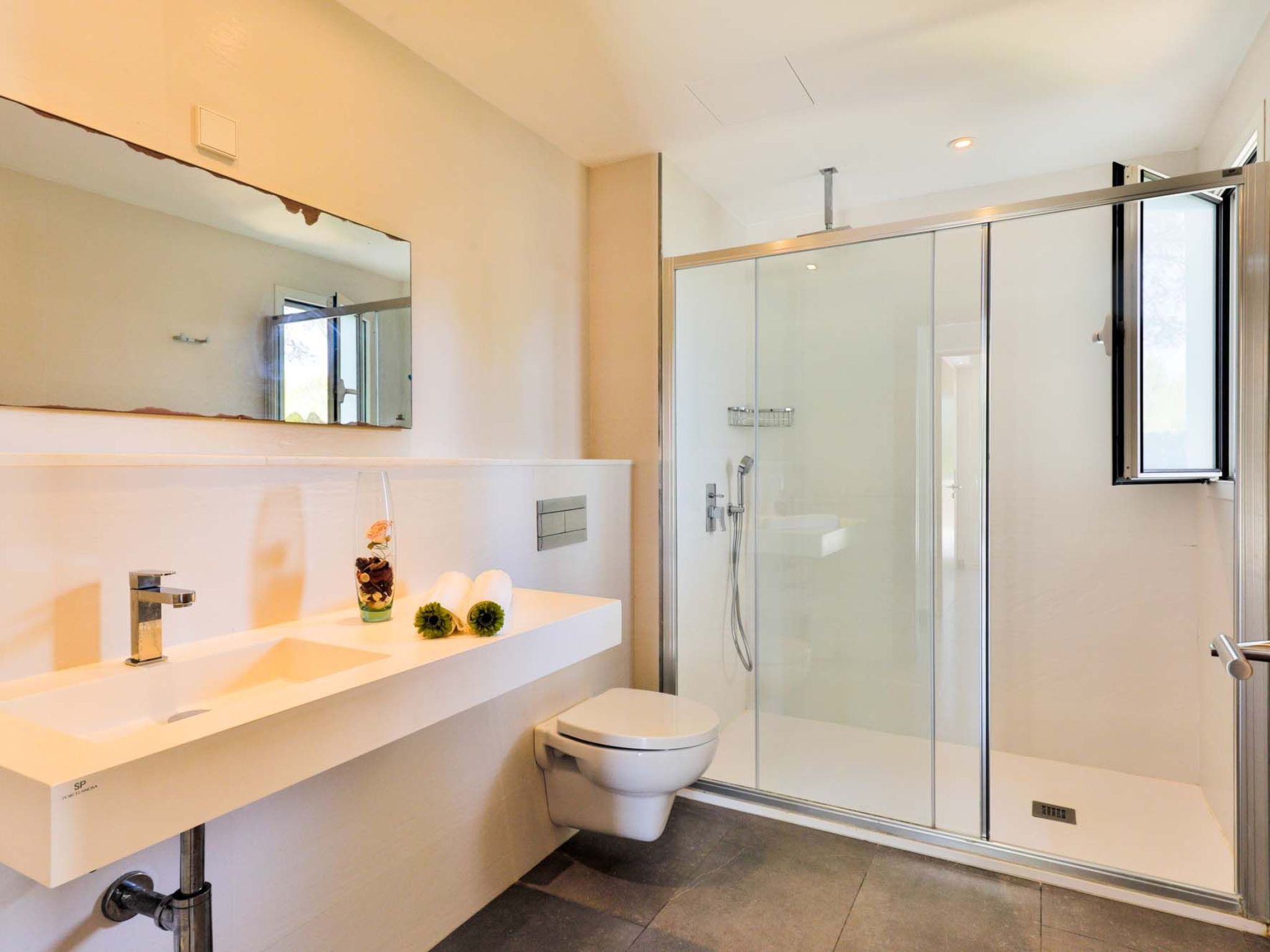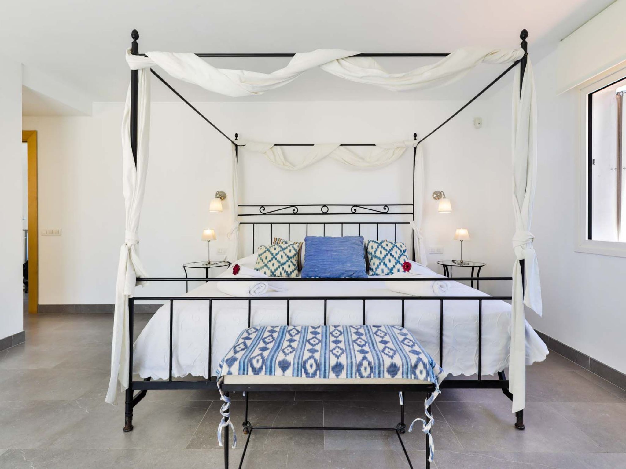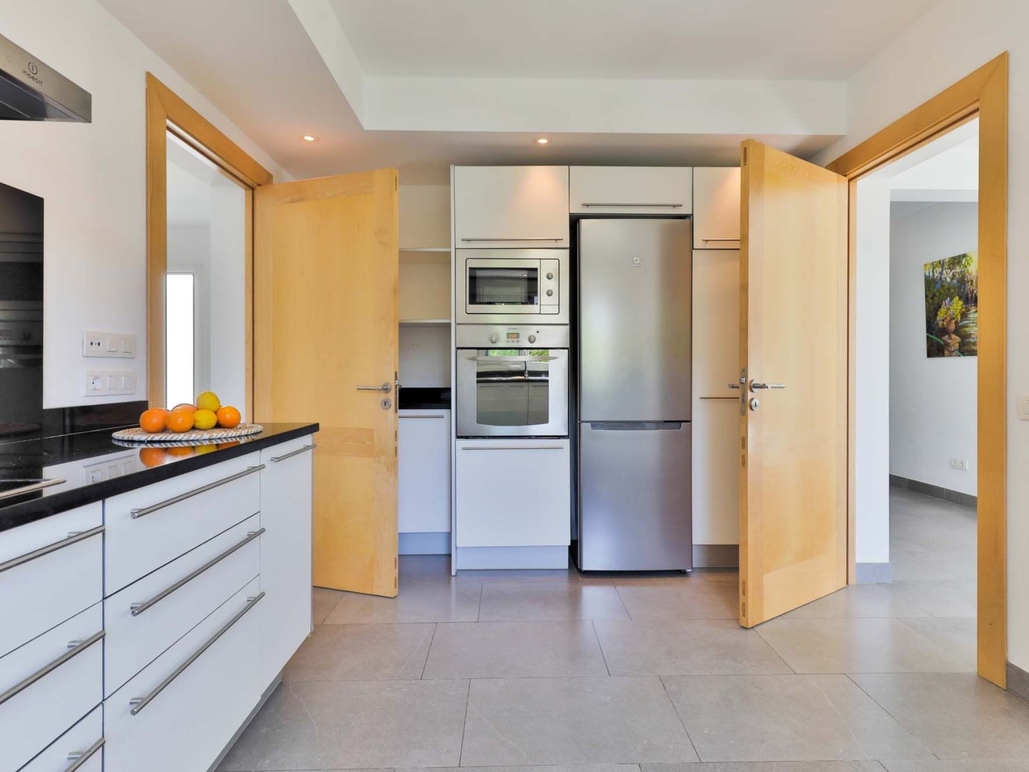 On the upper floor there are 2 double bedrooms, each with an en-suite bathroom. One of these, the master bedroom, is a dream come true with its 2x2 metre four-poster bed and en-suite bathroom with bath, shower and 2 washbasins. The second bedroom, with en-suite shower room, has a beautiful terrace. The sun roof terrace offers a fantastic view of the large round pool and the showpiece garden with mature trees, as well as the Mediterranean Sea.