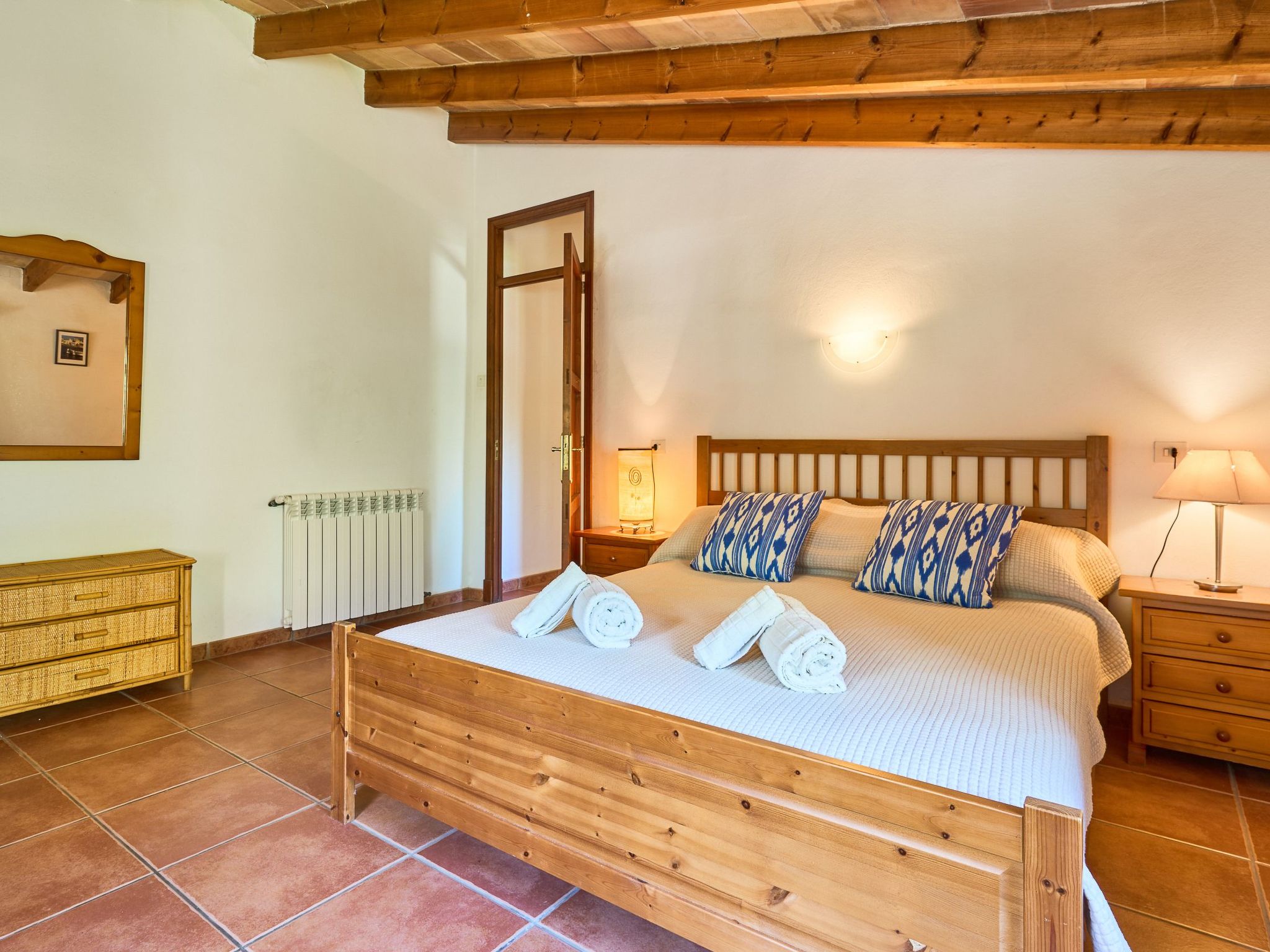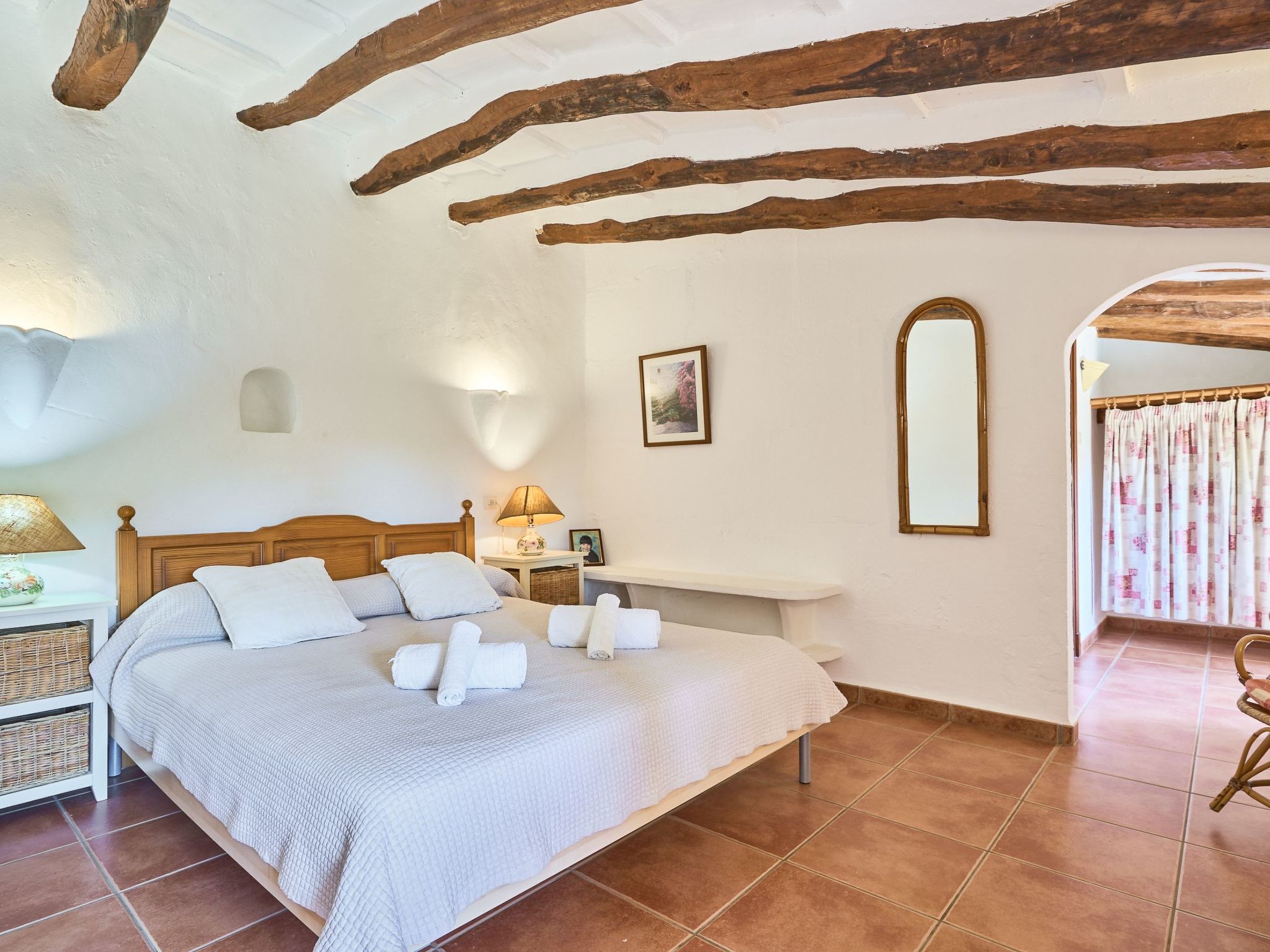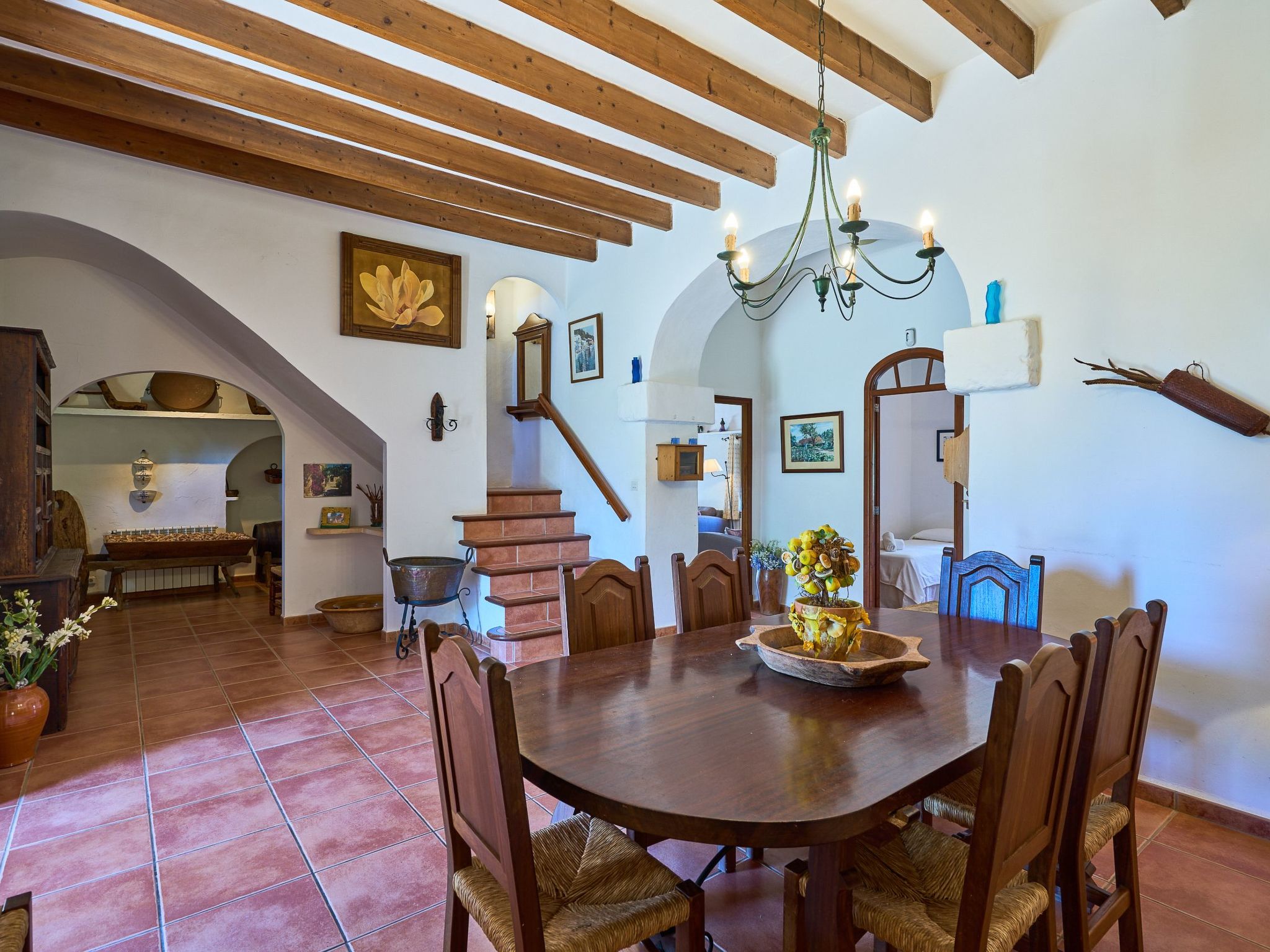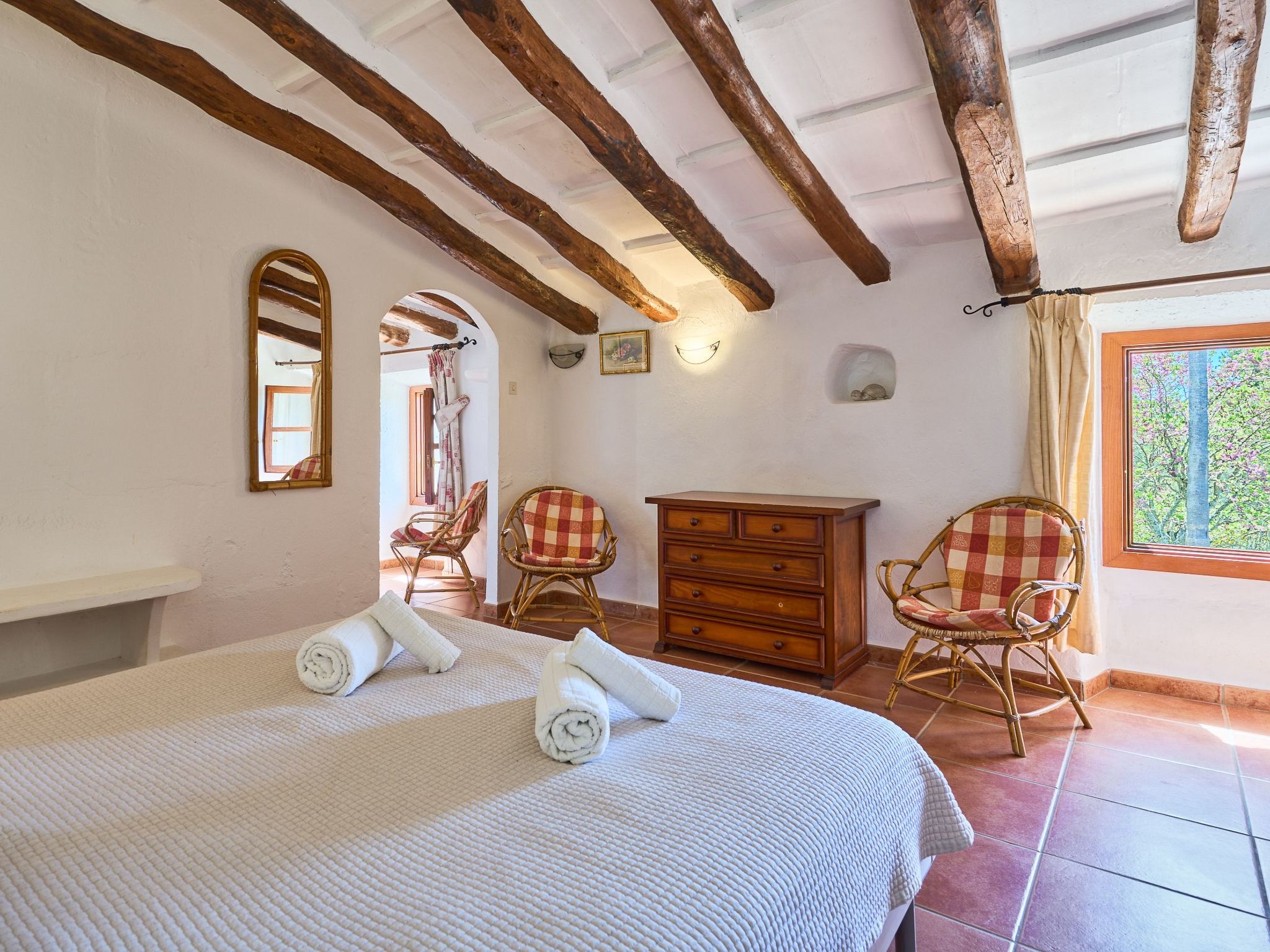 The finca is distributed over two floors. The dining area is located on the ground floor right at the entrance. Next to it is the rustic, well-equipped kitchen. On the other side, overlooking the pool area, is the very spacious living room with access to the veranda and the external dining area. On the ground floor there is also a bedroom with two single beds and a bathroom with bathtub. The utility room is next to the kitchen.