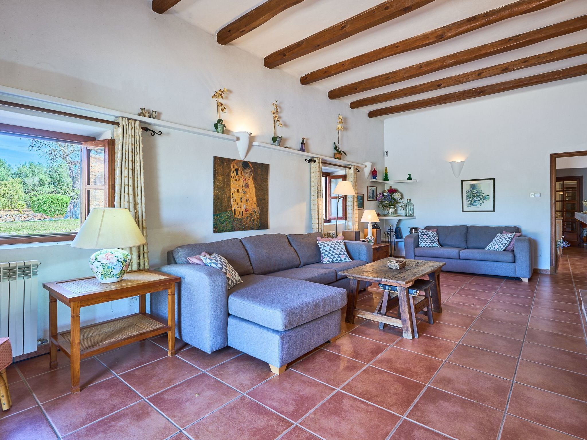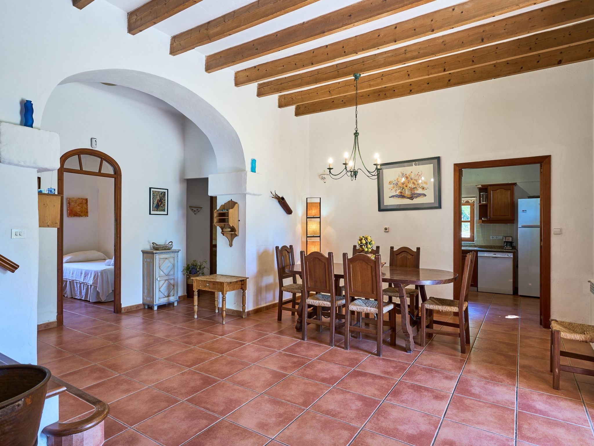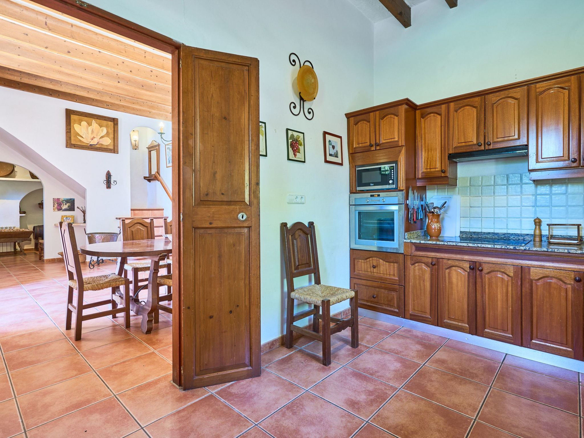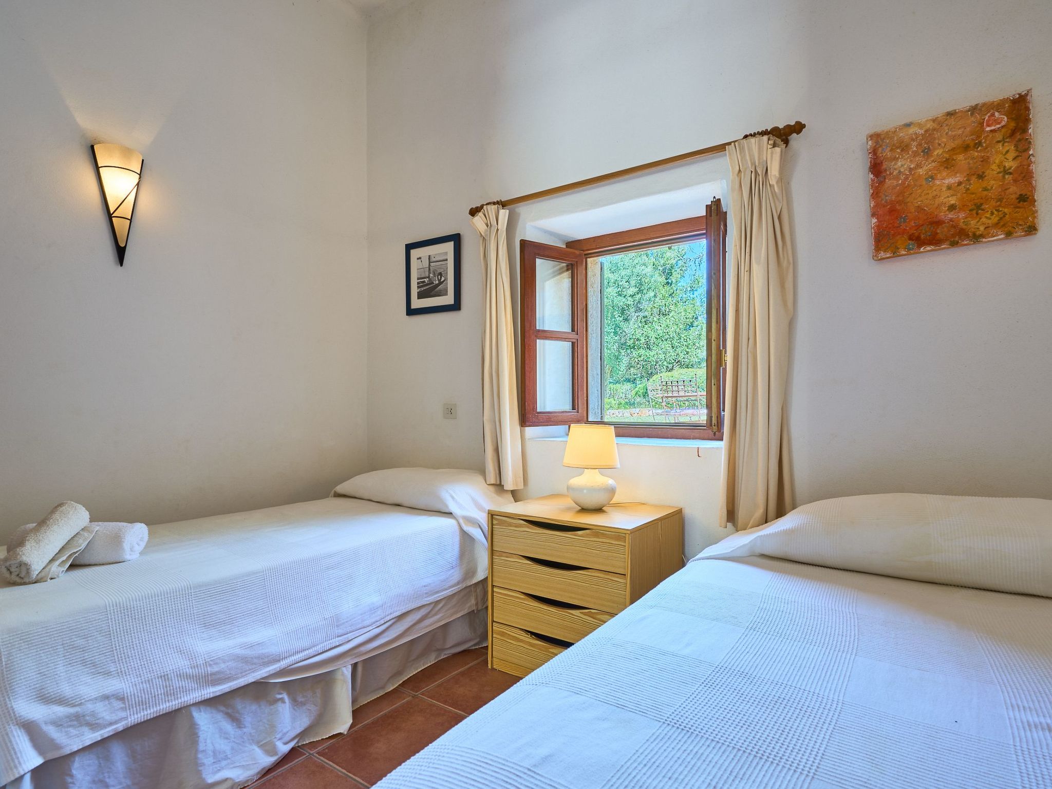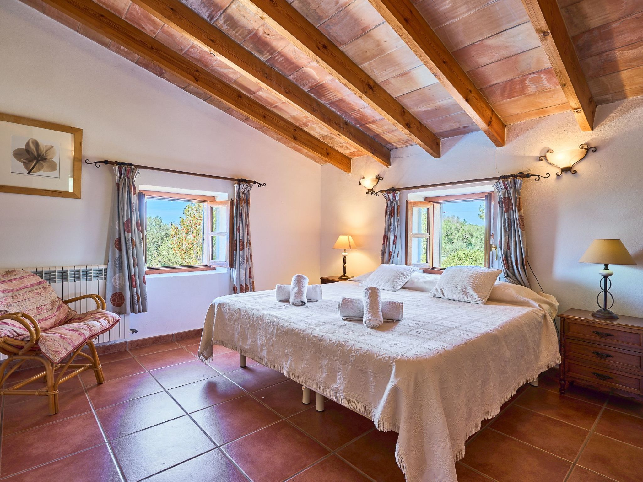 The finca is distributed over two floors. The dining area is located on the ground floor right at the entrance. Next to it is the rustic, well-equipped kitchen. On the other side, overlooking the pool area, is the very spacious living room with access to the veranda and the external dining area. On the ground floor there is also a bedroom with two single beds and a bathroom with bathtub. The utility room is next to the kitchen.