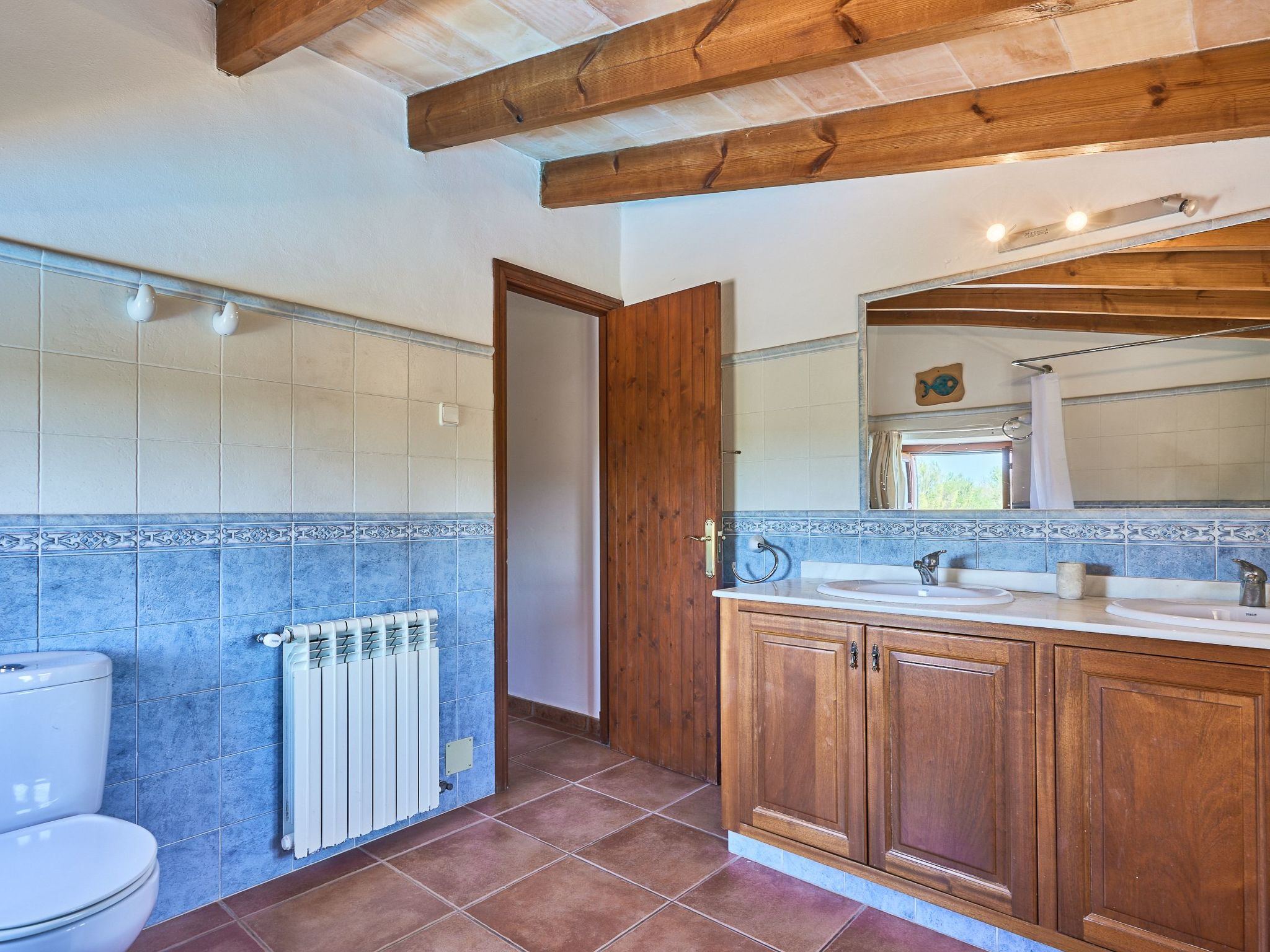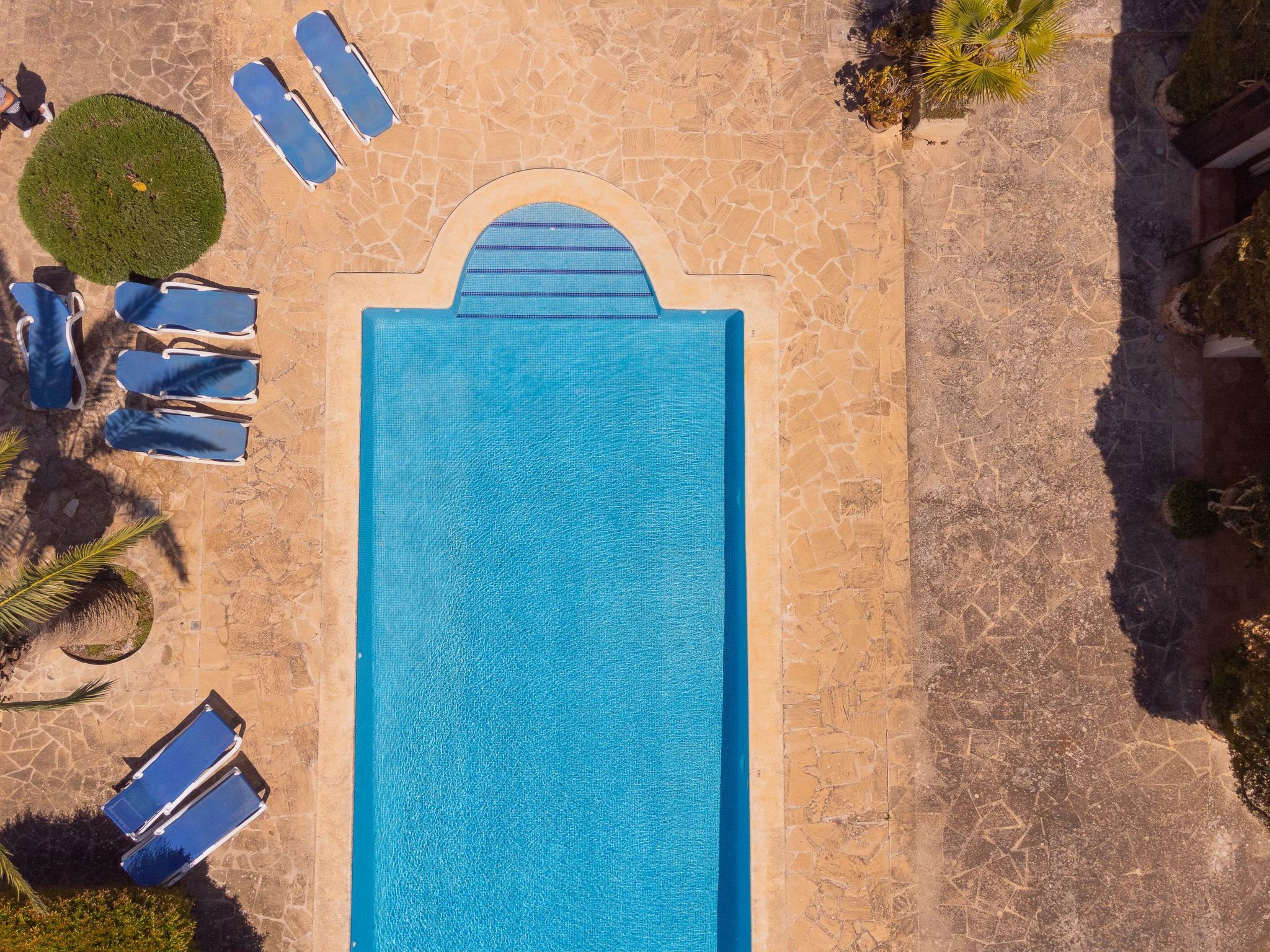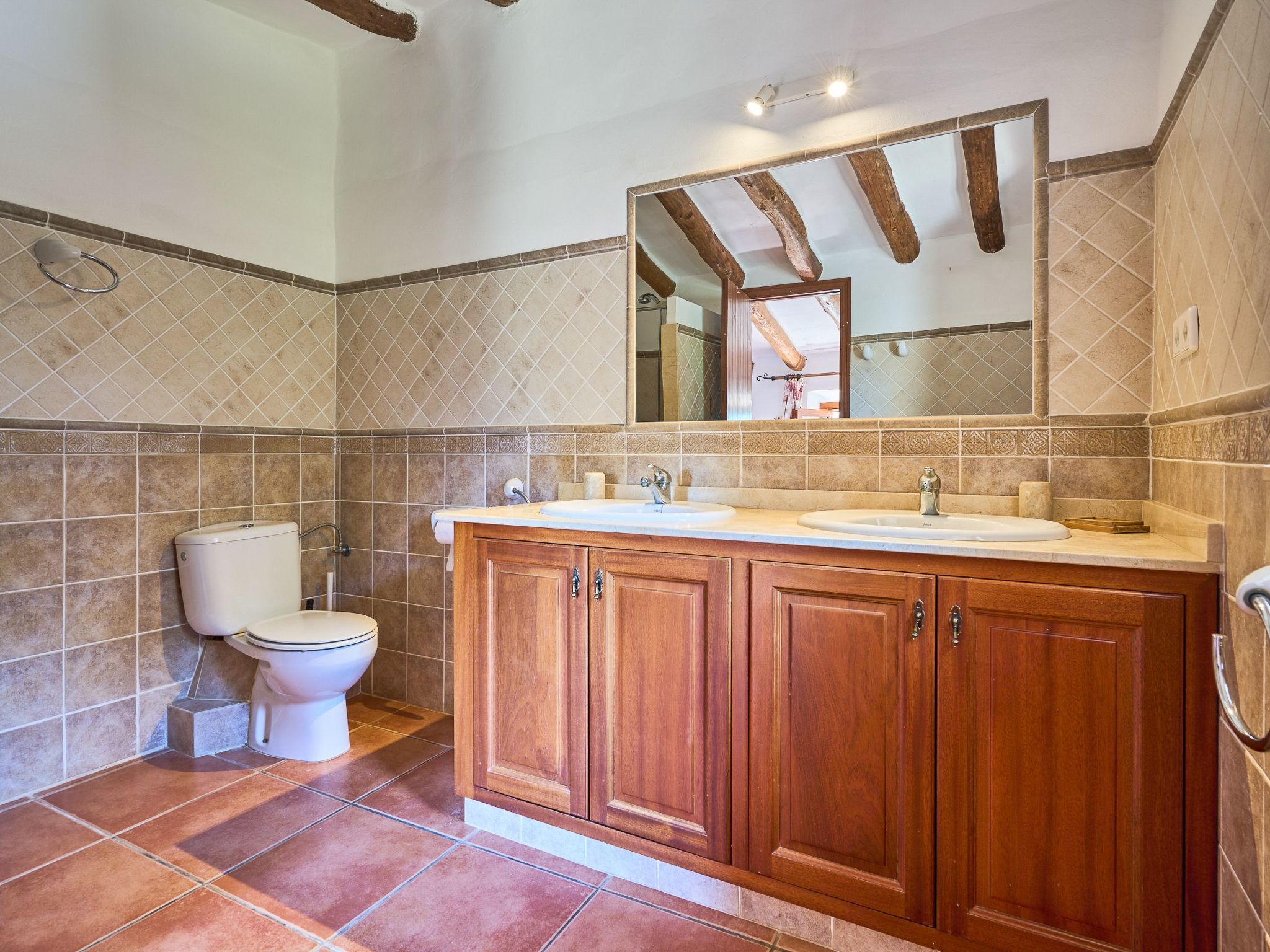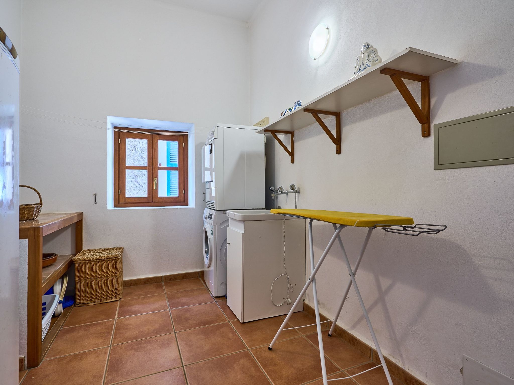The finca is distributed over two floors. The dining area is located on the ground floor right at the entrance. Next to it is the rustic, well-equipped kitchen. On the other side, overlooking the pool area, is the very spacious living room with access to the veranda and the external dining area. On the ground floor there is also a bedroom with two single beds and a bathroom with bathtub. The utility room is next to the kitchen.