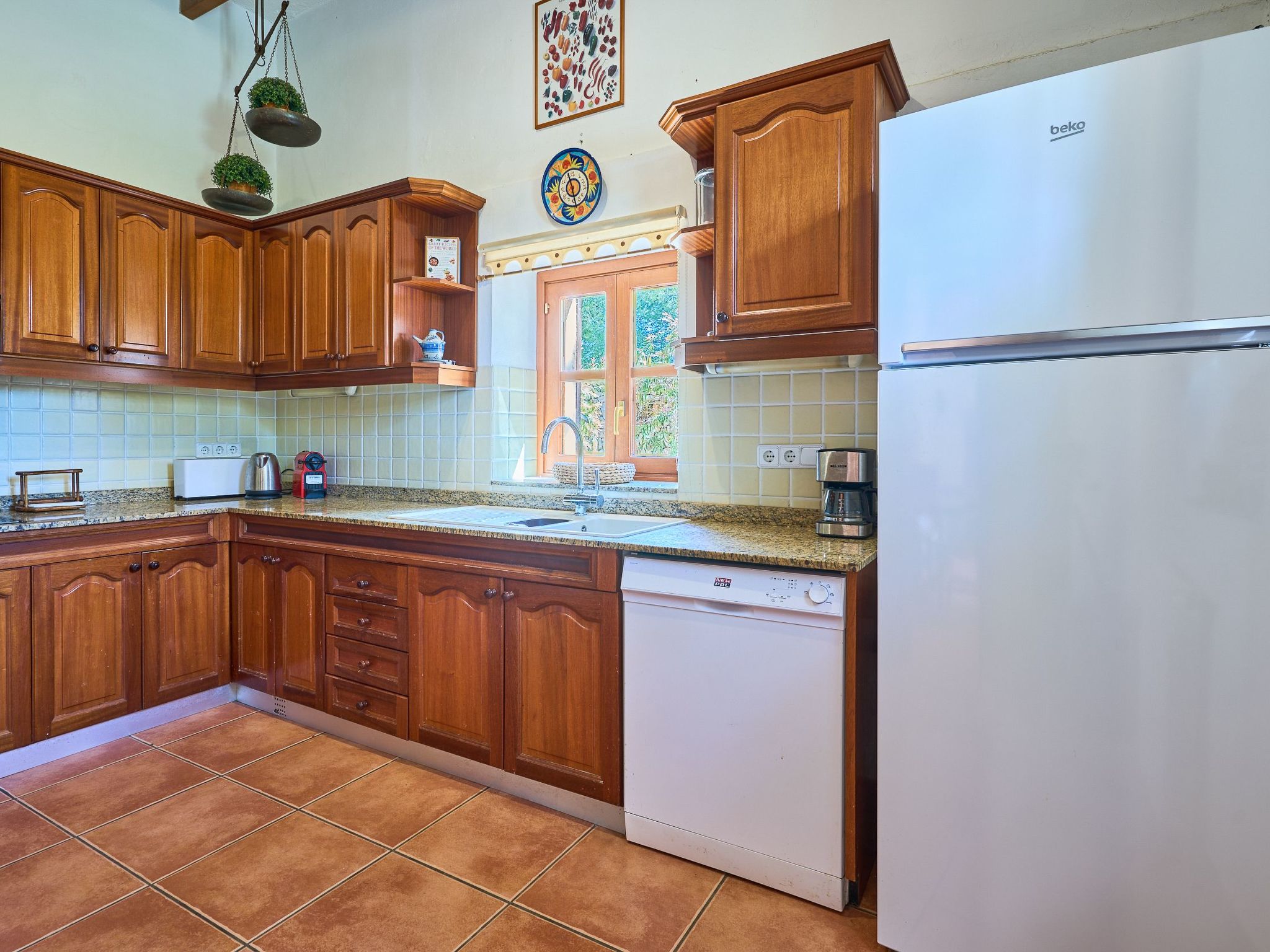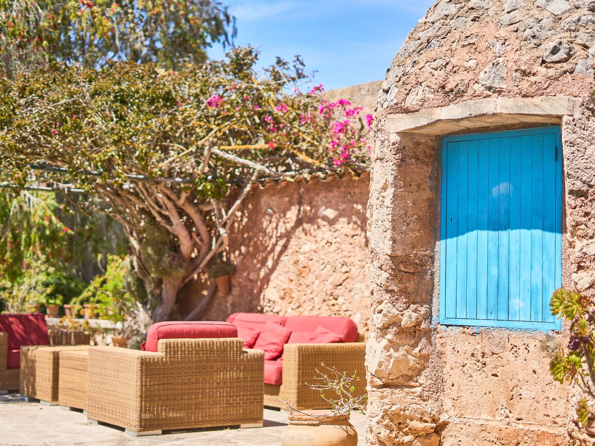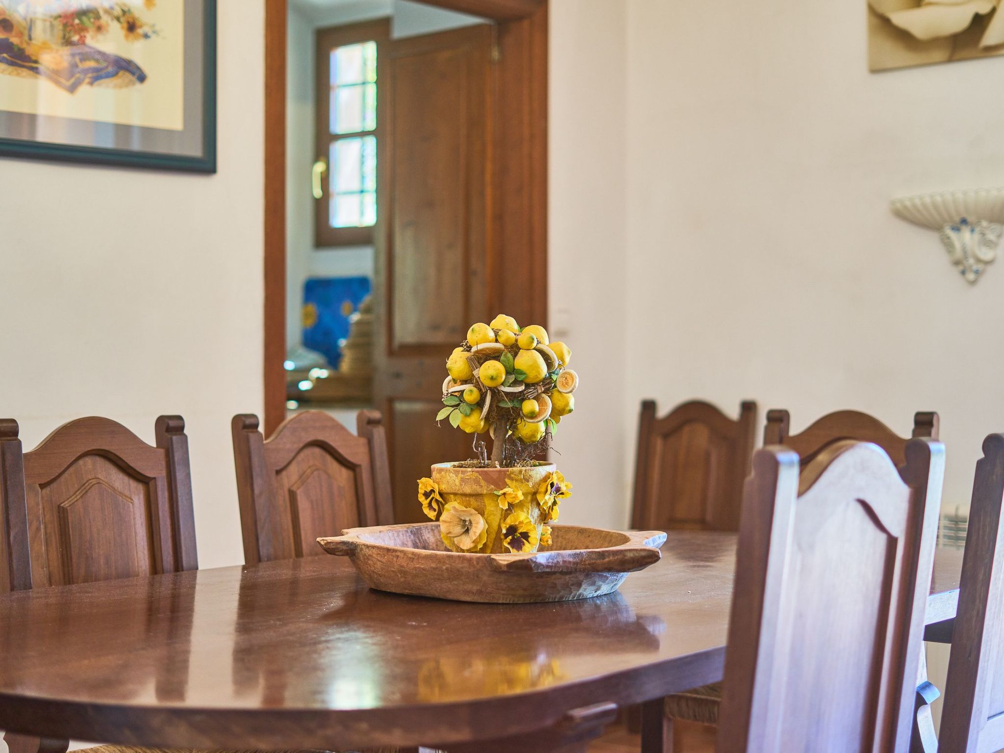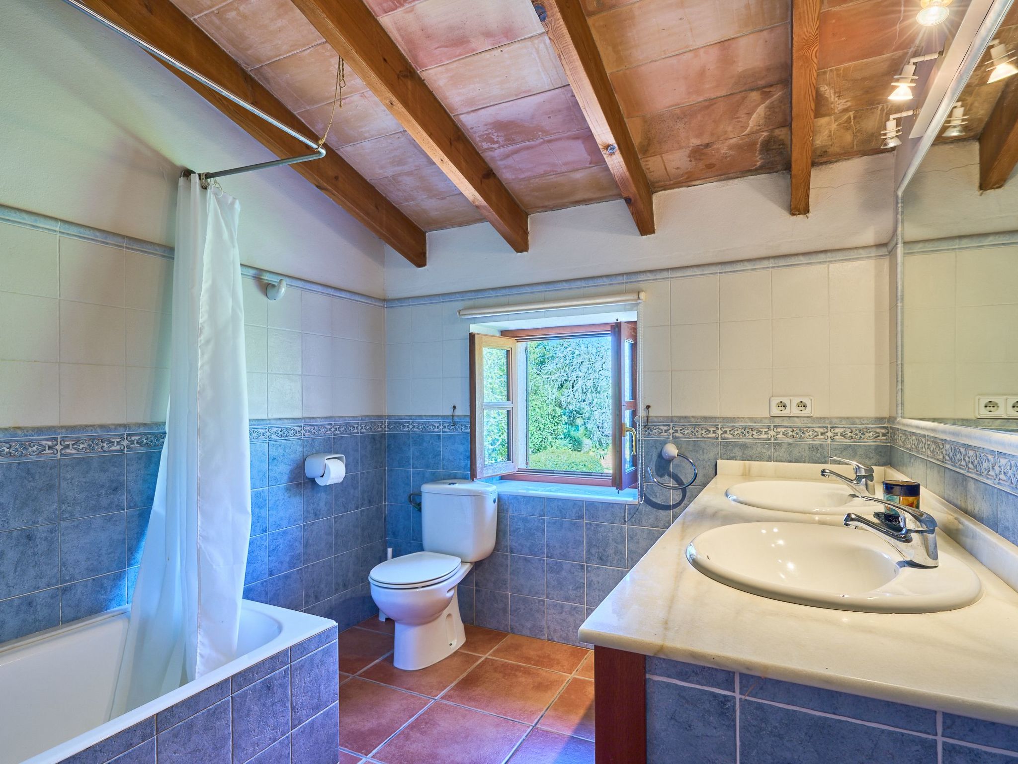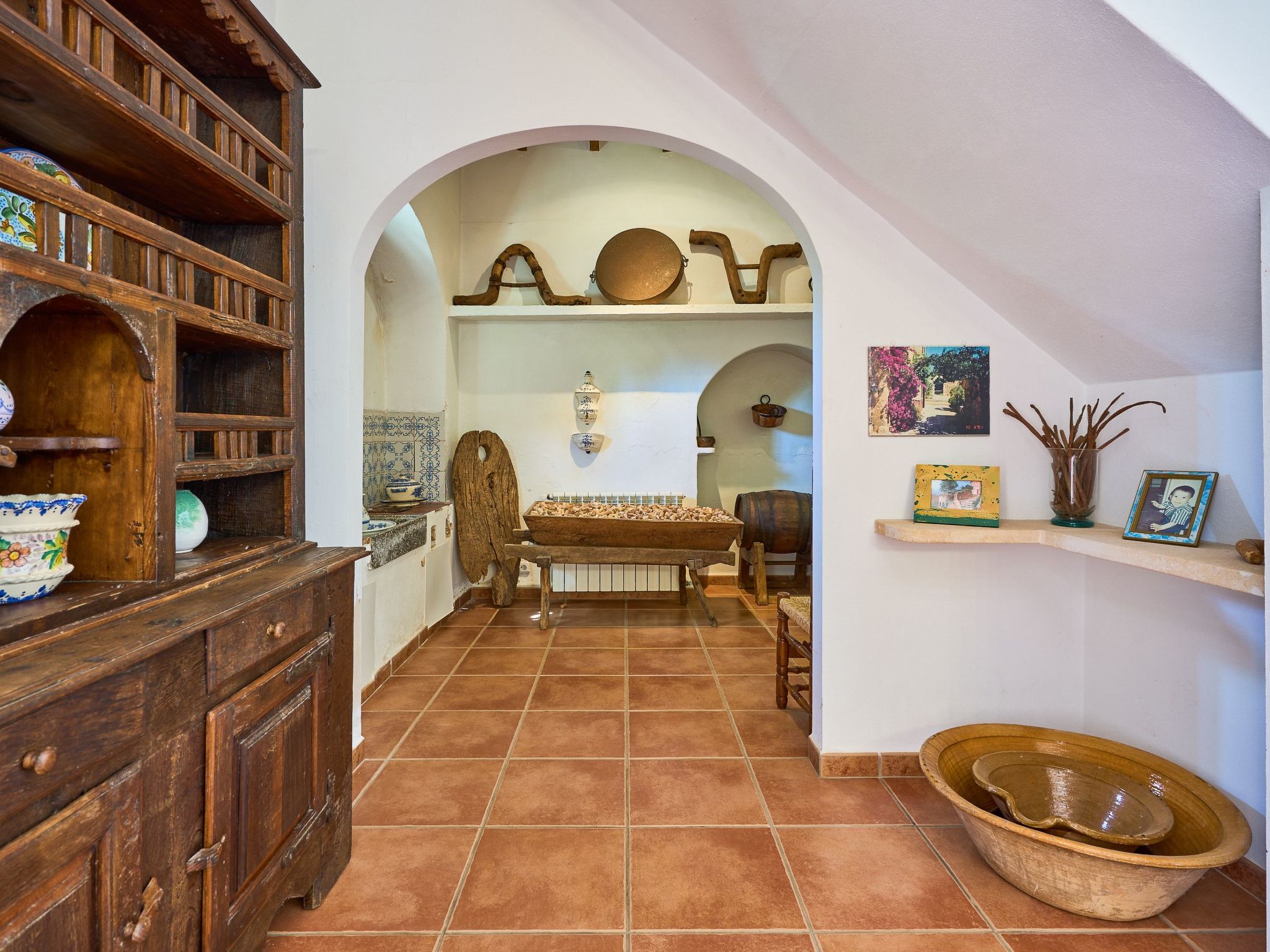 The finca is distributed over two floors. The dining area is located on the ground floor right at the entrance. Next to it is the rustic, well-equipped kitchen. On the other side, overlooking the pool area, is the very spacious living room with access to the veranda and the external dining area. On the ground floor there is also a bedroom with two single beds and a bathroom with bathtub. The utility room is next to the kitchen.