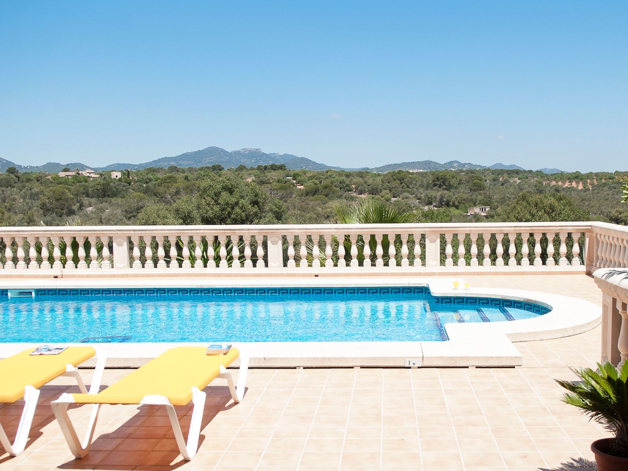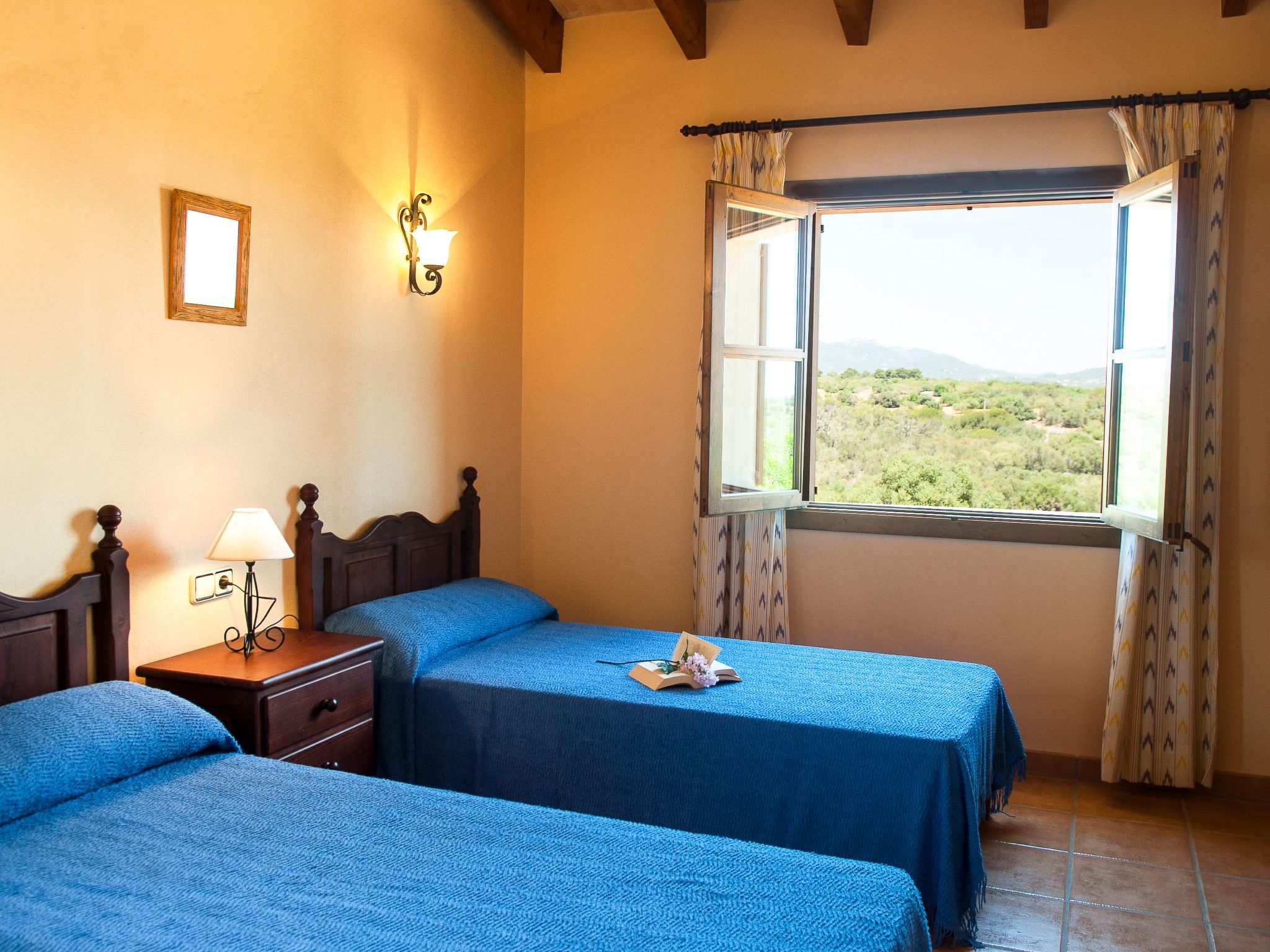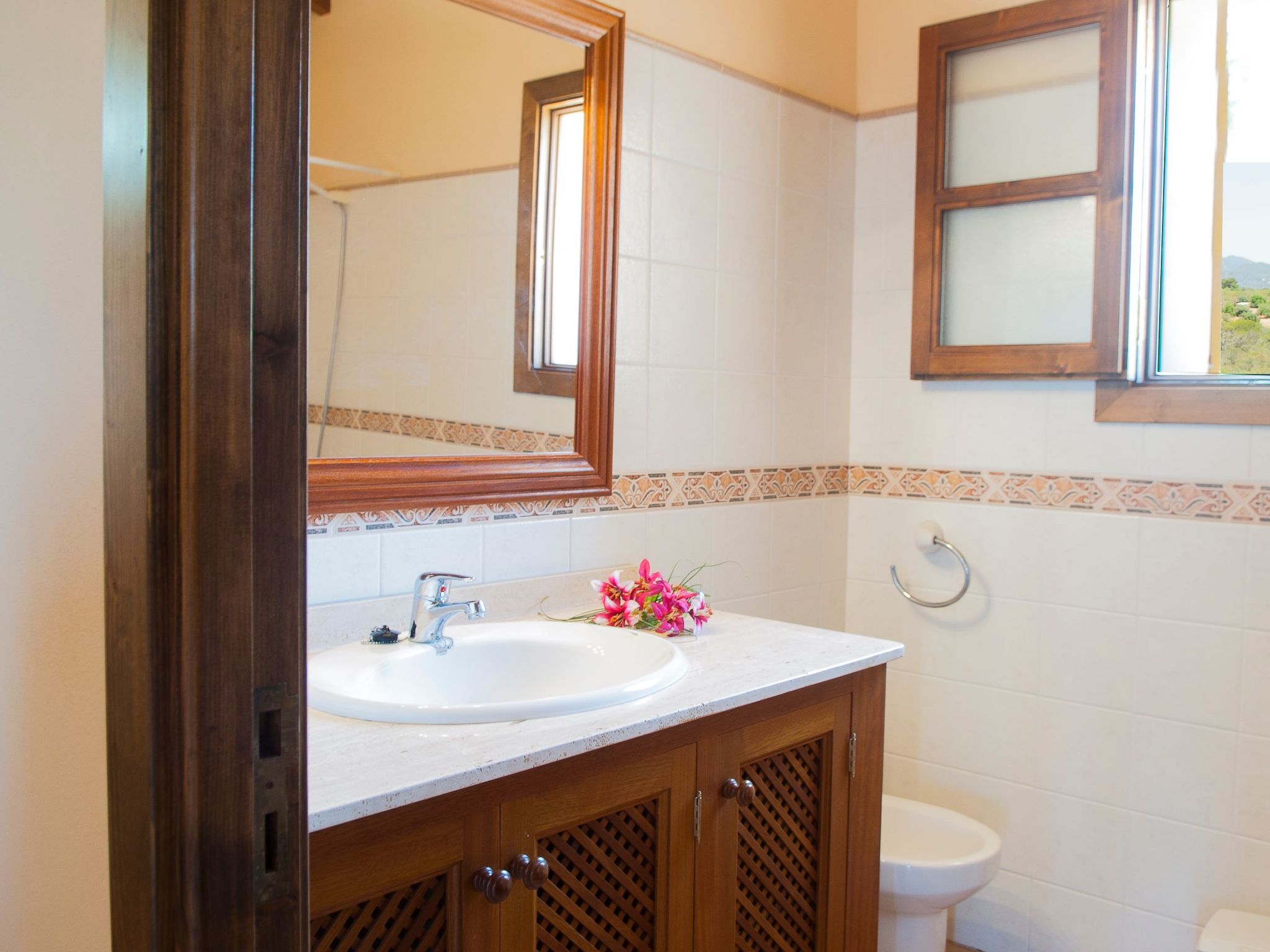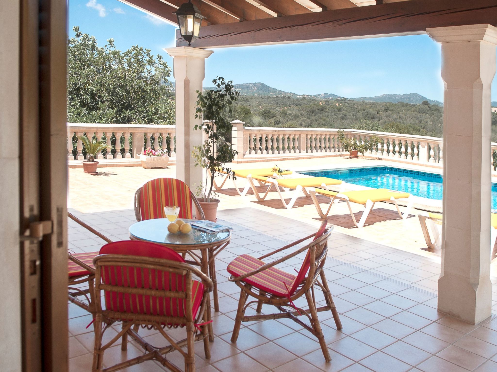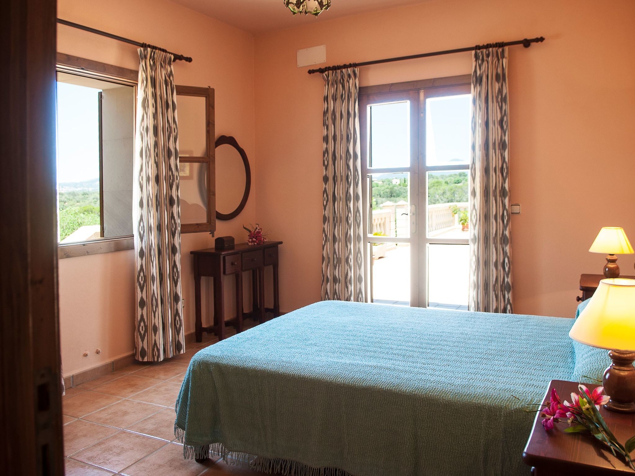 Ullastre is a holiday home, divided into two floors, in traditional style. Mallorcan elements were deliberately incorporated into the design. The front is clad in natural stone and inside the visitor can expect spacious, high rooms with rustic ceiling beams and outside large terraces with beautiful panoramic views. On the ground floor there is an open-plan living and dining area. Glass doors open onto the terrace and pool area. From the well-equipped kitchen with a small table, there is access to another terrace where there is a barbecue area with a brick-built outdoor grill. From the kitchen there is access to a small utility room with washing machine. On the ground floor there is also a bedroom with two single beds and another with a double bed and access to a terrace with panoramic views. The two bedrooms share a bathroom with bathtub. There is also a separate toilet on the ground floor. On the upper floor there is also a bedroom with two single beds and another with a double bed, but these rooms have access to individual, large terraces with fantastic views. The two bedrooms share a spacious bathroom with a bathtub.