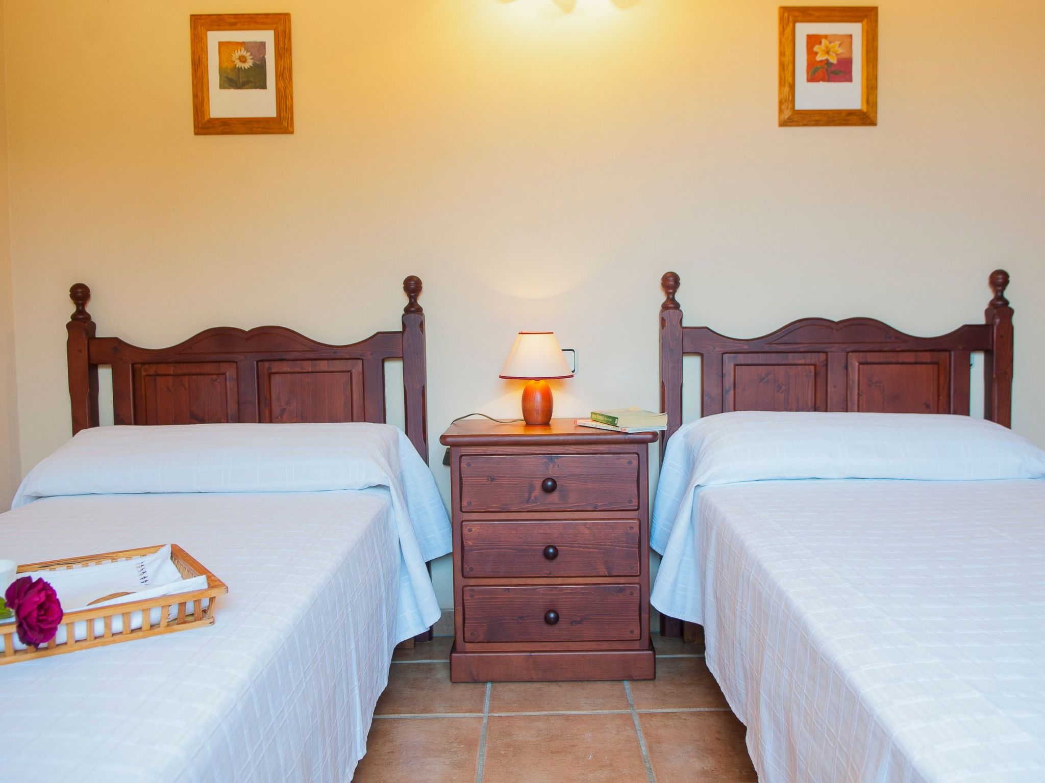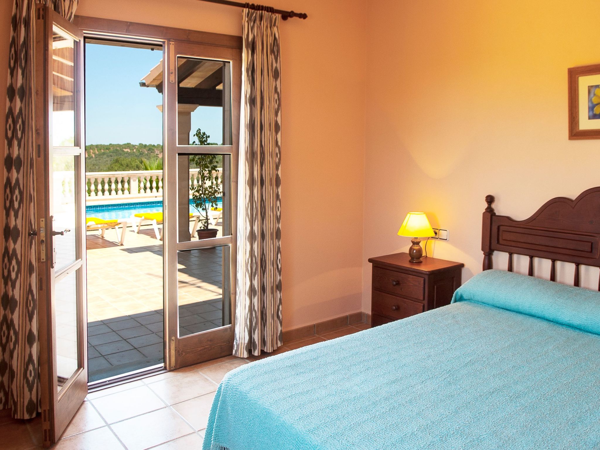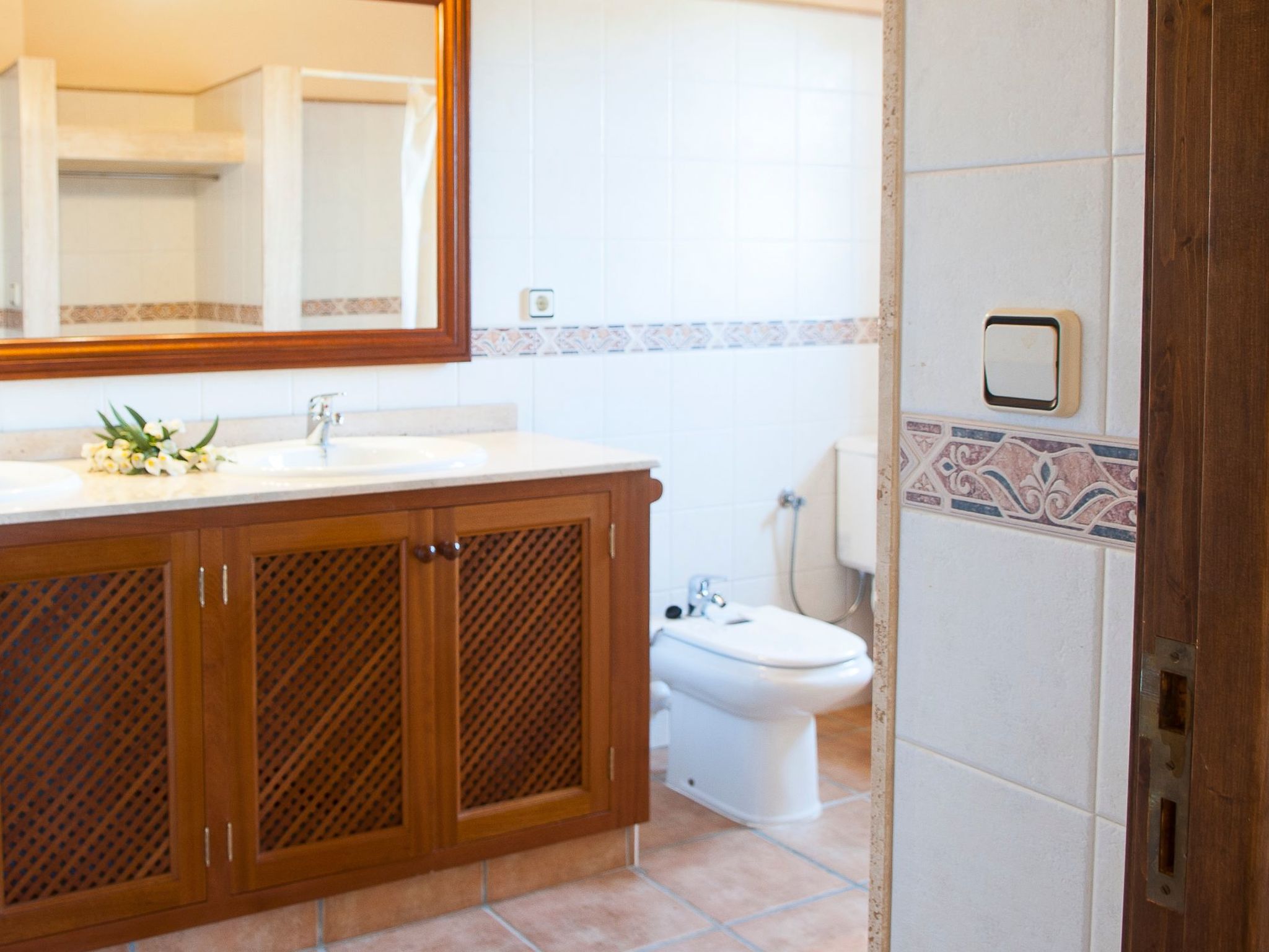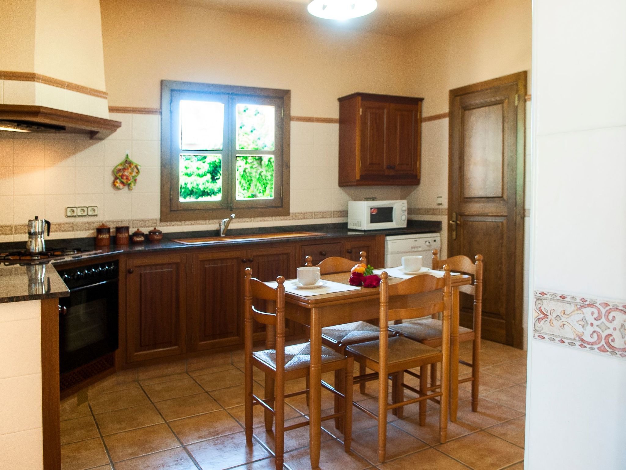 Ullastre is a holiday home, divided into two floors, in traditional style. Mallorcan elements were deliberately incorporated into the design. The front is clad in natural stone and inside the visitor can expect spacious, high rooms with rustic ceiling beams and outside large terraces with beautiful panoramic views. On the ground floor there is an open-plan living and dining area. Glass doors open onto the terrace and pool area. From the well-equipped kitchen with a small table, there is access to another terrace where there is a barbecue area with a brick-built outdoor grill. From the kitchen there is access to a small utility room with washing machine. On the ground floor there is also a bedroom with two single beds and another with a double bed and access to a terrace with panoramic views. The two bedrooms share a bathroom with bathtub. There is also a separate toilet on the ground floor. On the upper floor there is also a bedroom with two single beds and another with a double bed, but these rooms have access to individual, large terraces with fantastic views. The two bedrooms share a spacious bathroom with a bathtub.