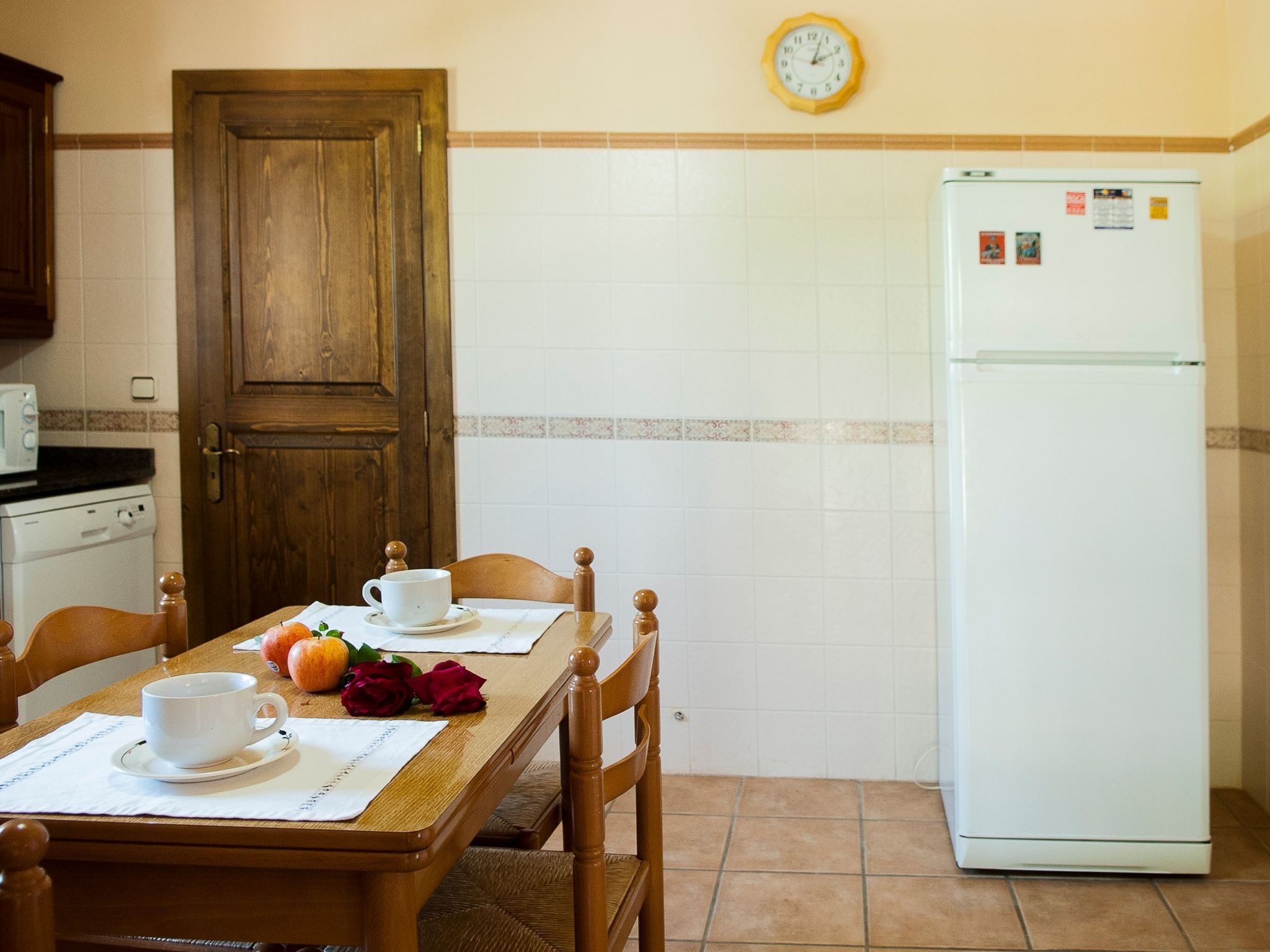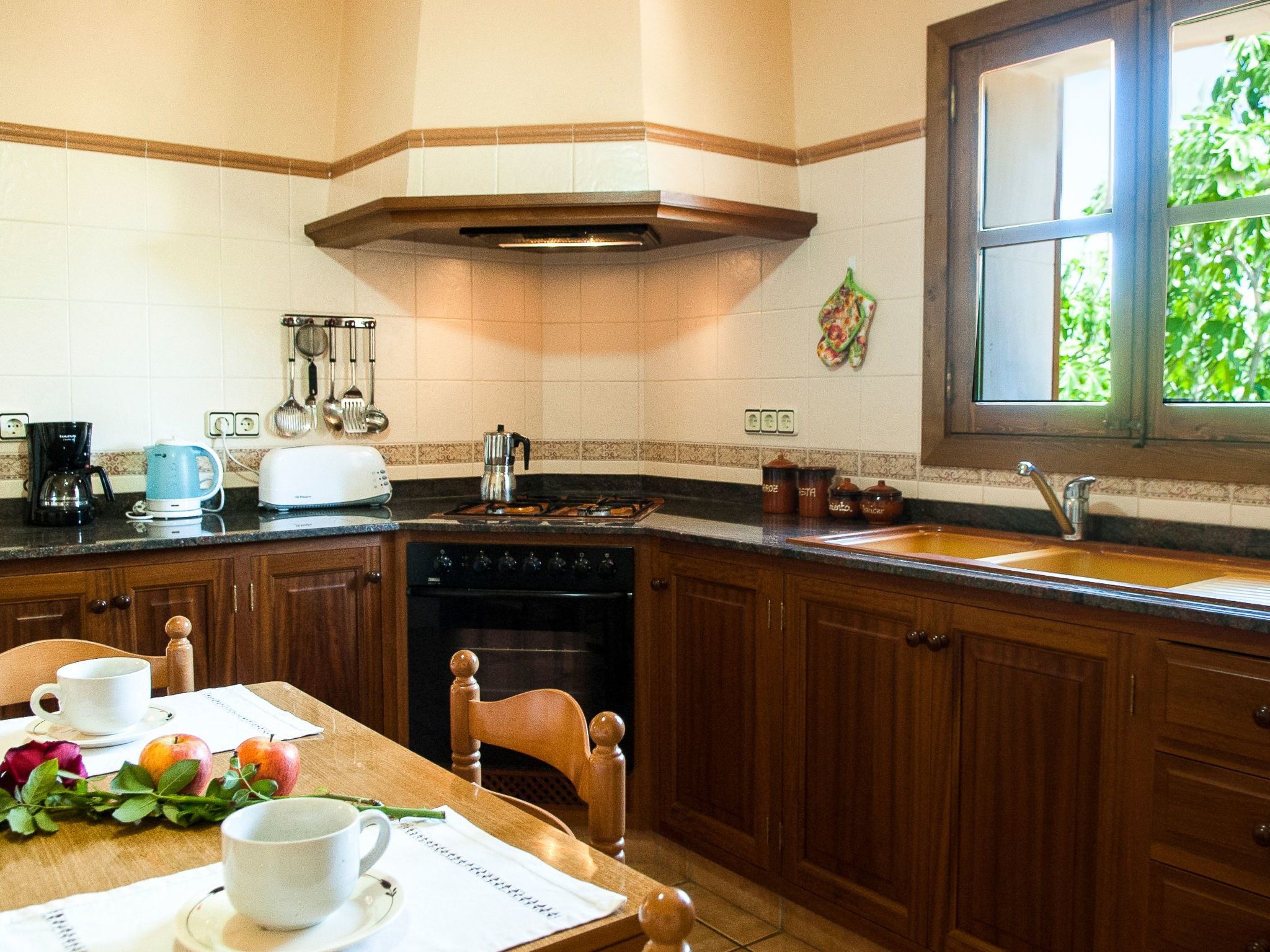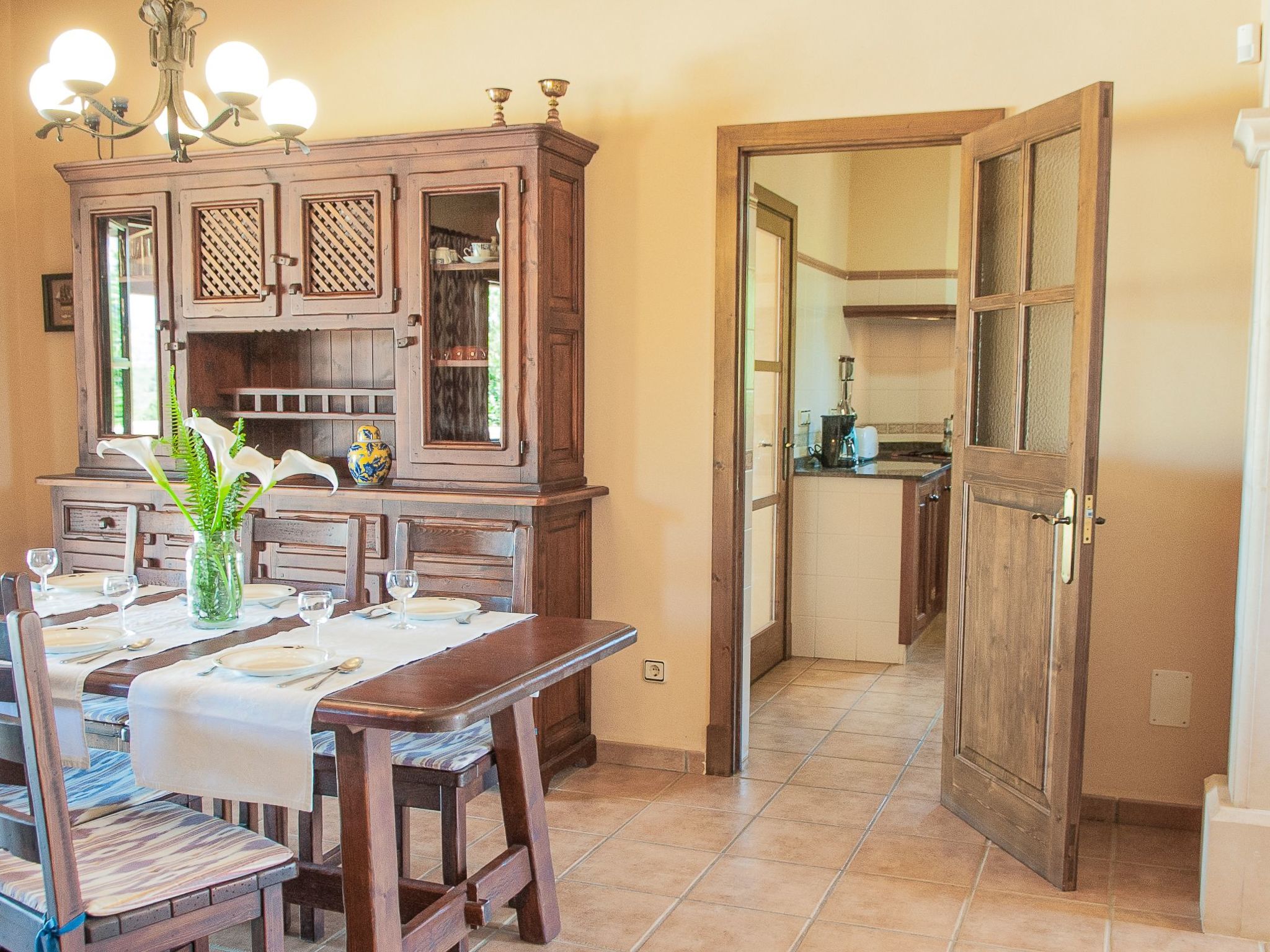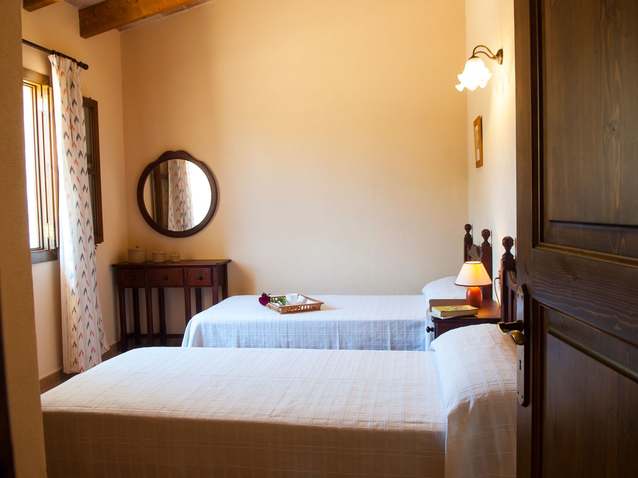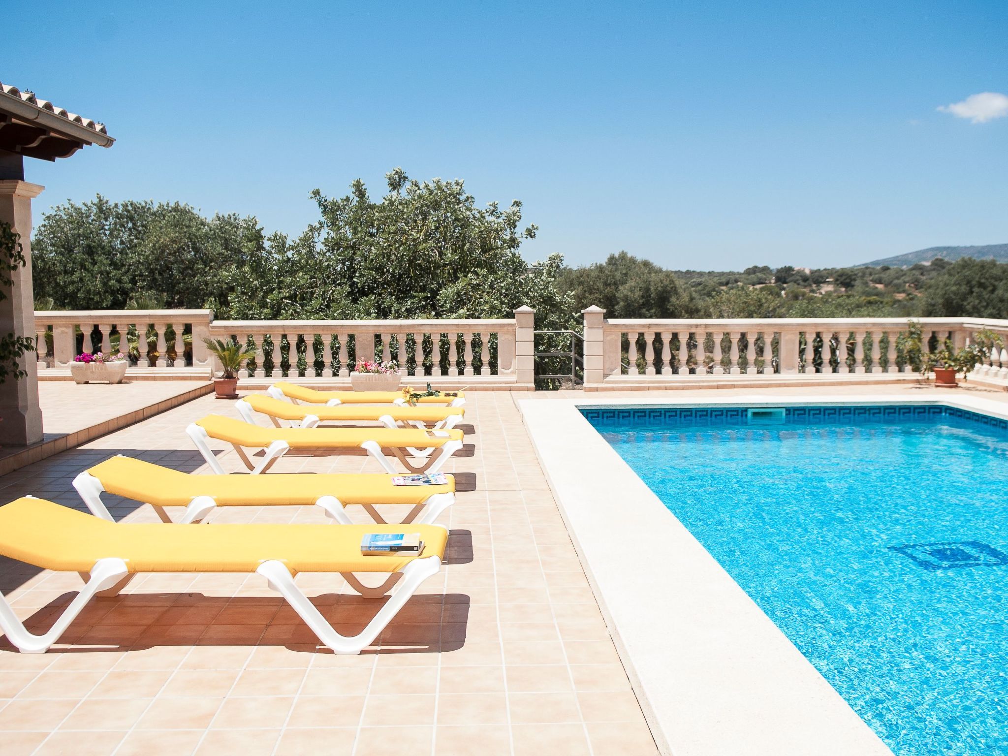 Ullastre is a holiday home, divided into two floors, in traditional style. Mallorcan elements were deliberately incorporated into the design. The front is clad in natural stone and inside the visitor can expect spacious, high rooms with rustic ceiling beams and outside large terraces with beautiful panoramic views. On the ground floor there is an open-plan living and dining area. Glass doors open onto the terrace and pool area. From the well-equipped kitchen with a small table, there is access to another terrace where there is a barbecue area with a brick-built outdoor grill. From the kitchen there is access to a small utility room with washing machine. On the ground floor there is also a bedroom with two single beds and another with a double bed and access to a terrace with panoramic views. The two bedrooms share a bathroom with bathtub. There is also a separate toilet on the ground floor. On the upper floor there is also a bedroom with two single beds and another with a double bed, but these rooms have access to individual, large terraces with fantastic views. The two bedrooms share a spacious bathroom with a bathtub.