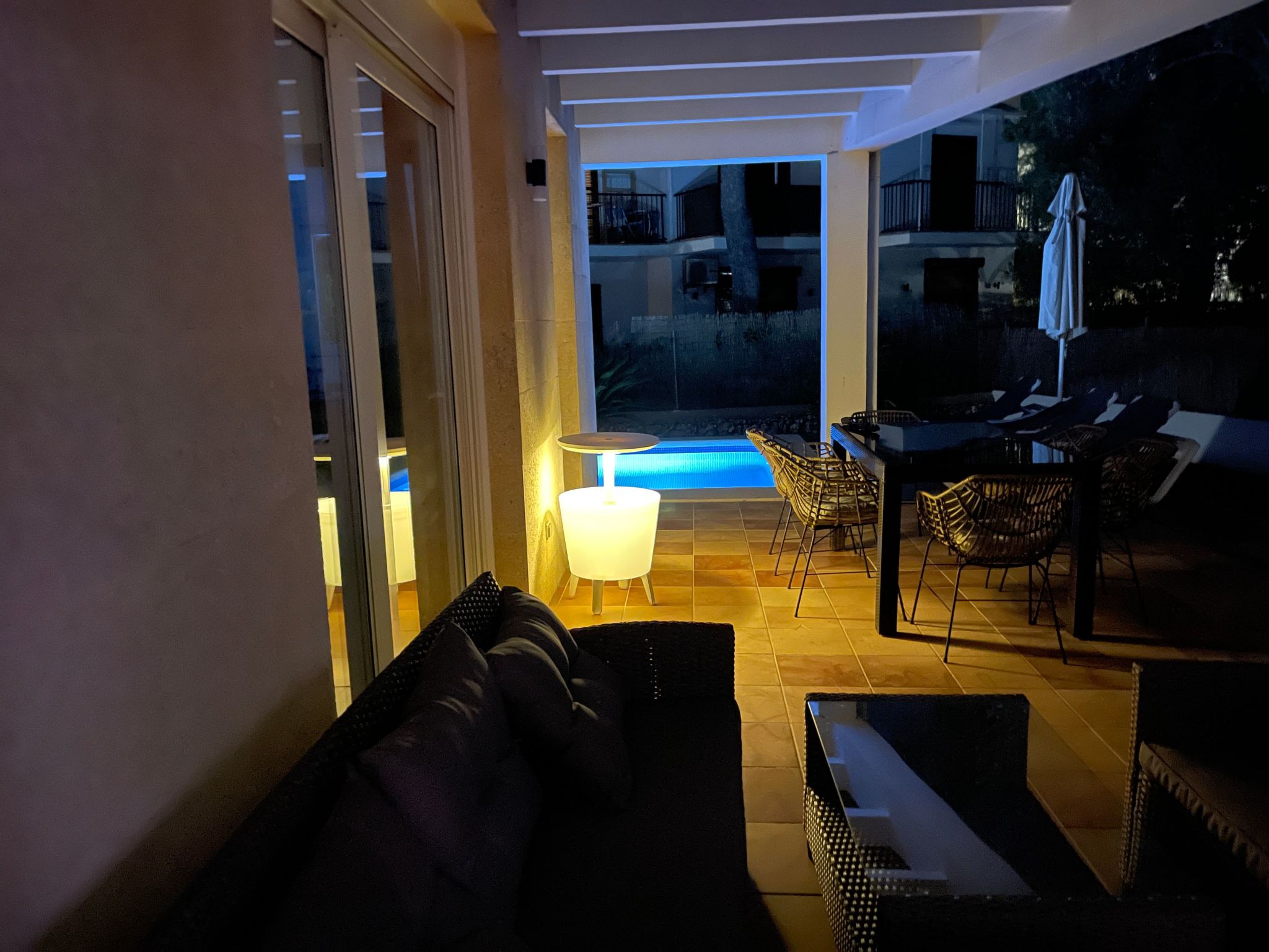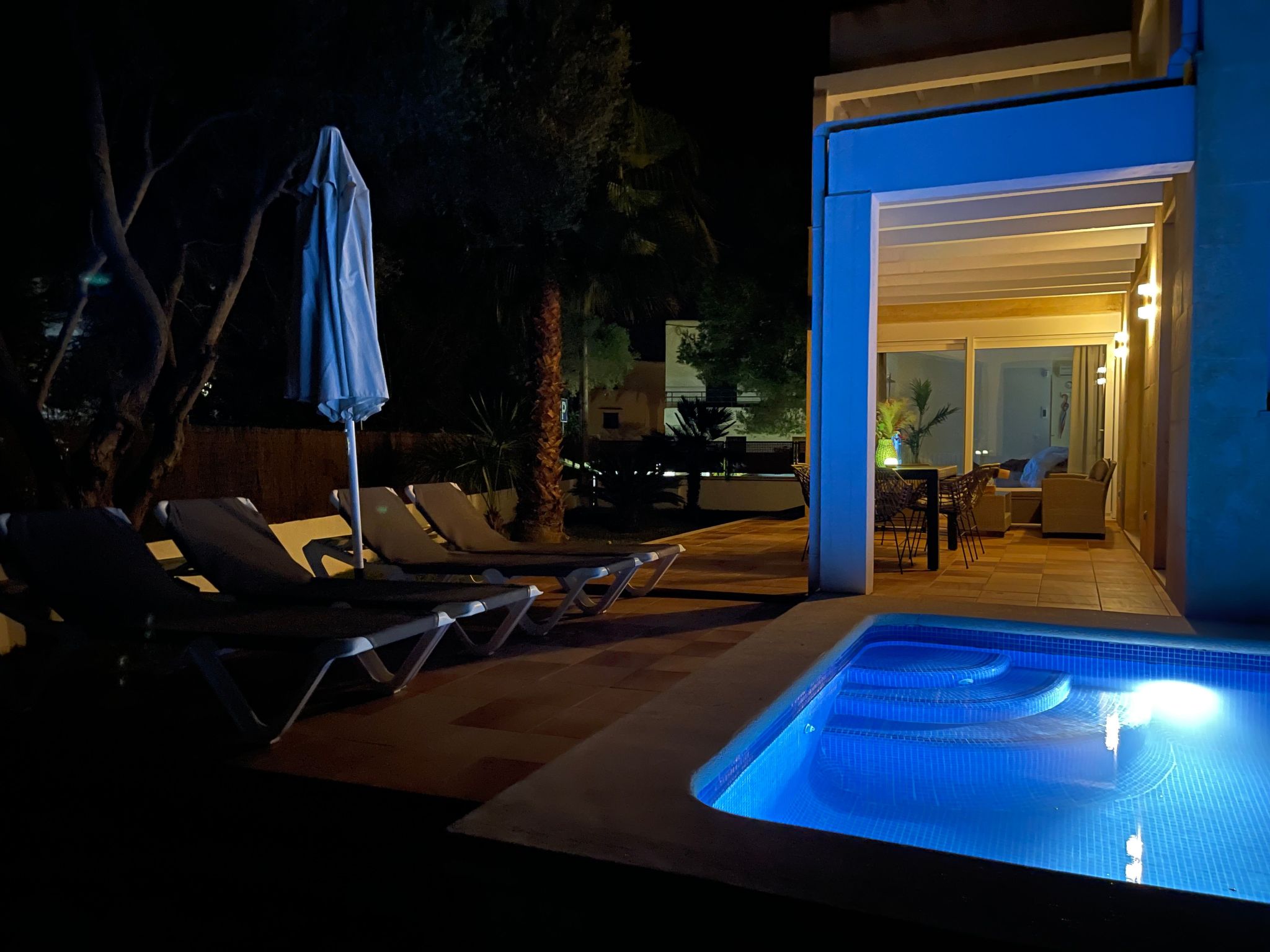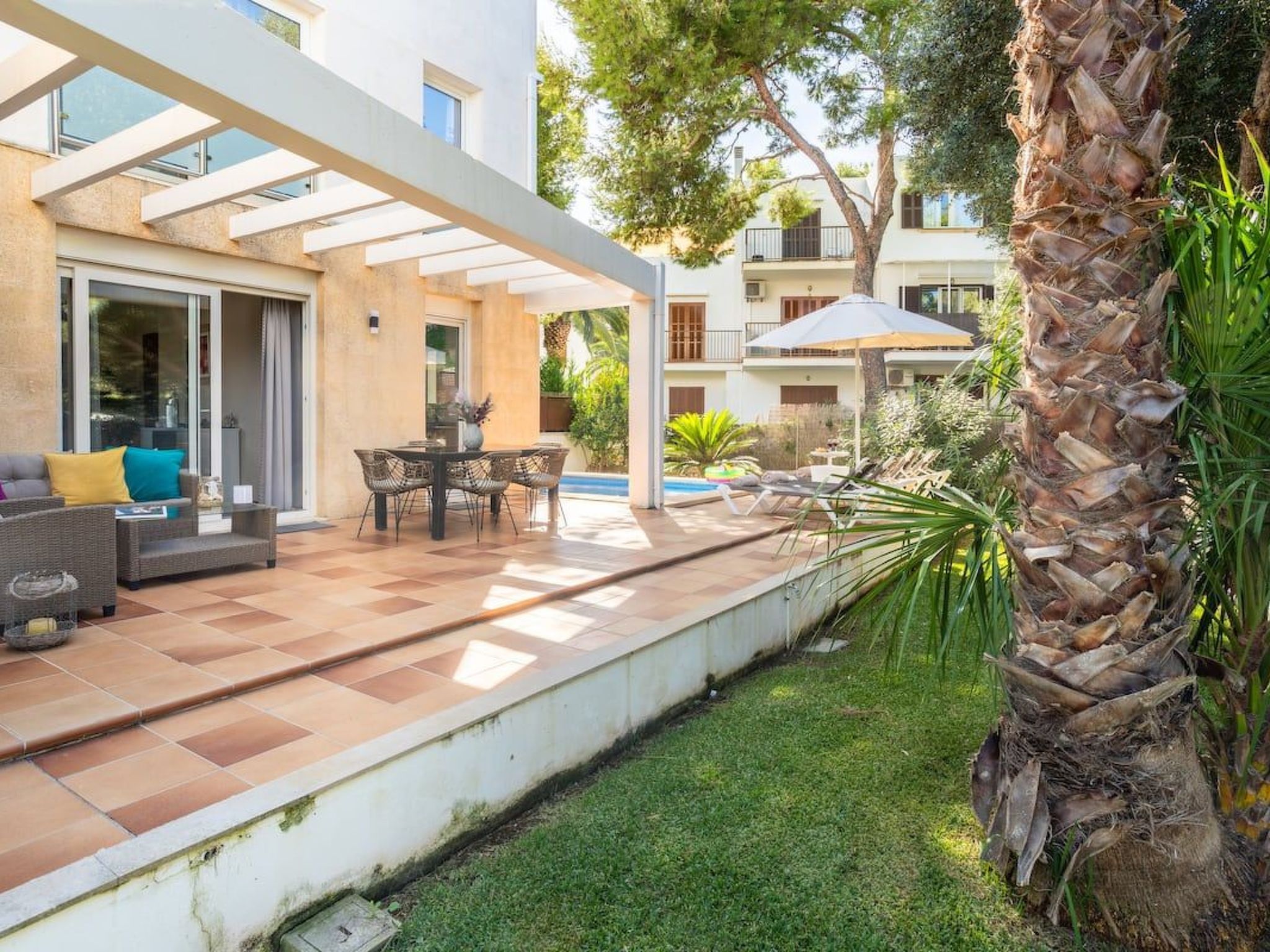 From the living and dining room and from the kitchen you have access to the terrace and the large pool, where you can relax and enjoy the sun loungers.