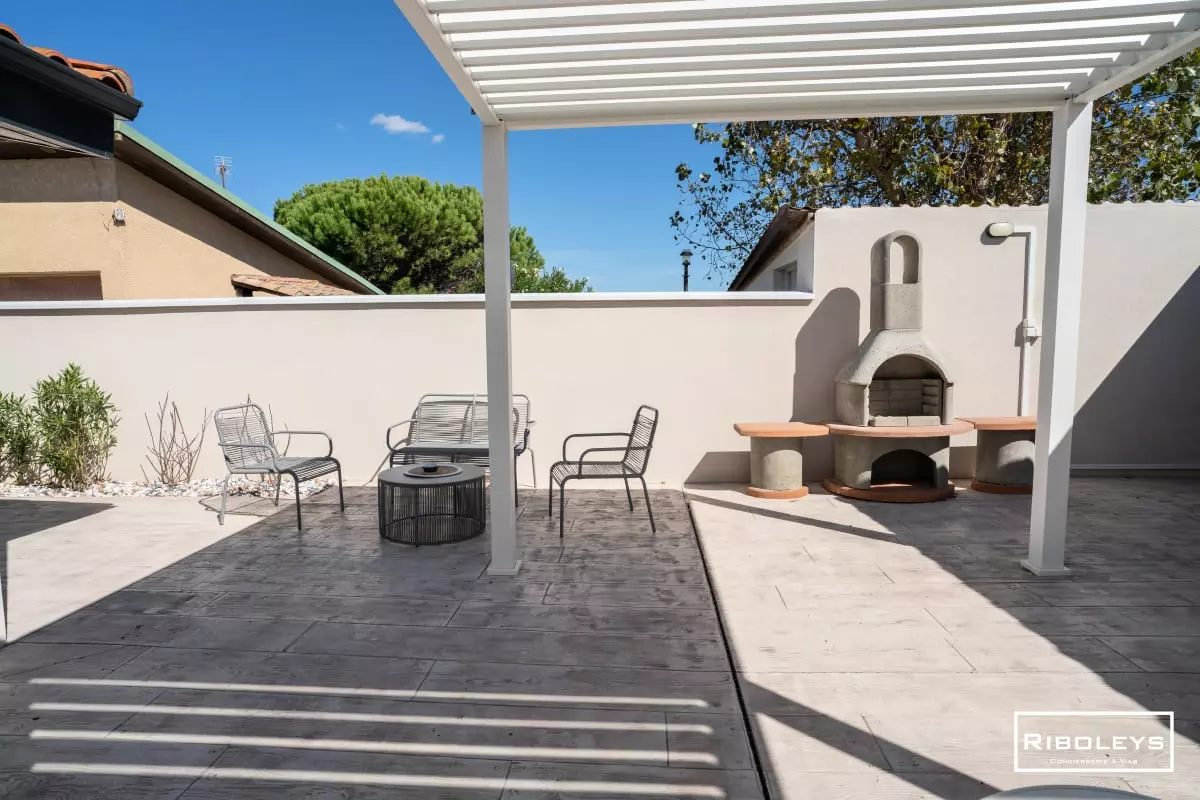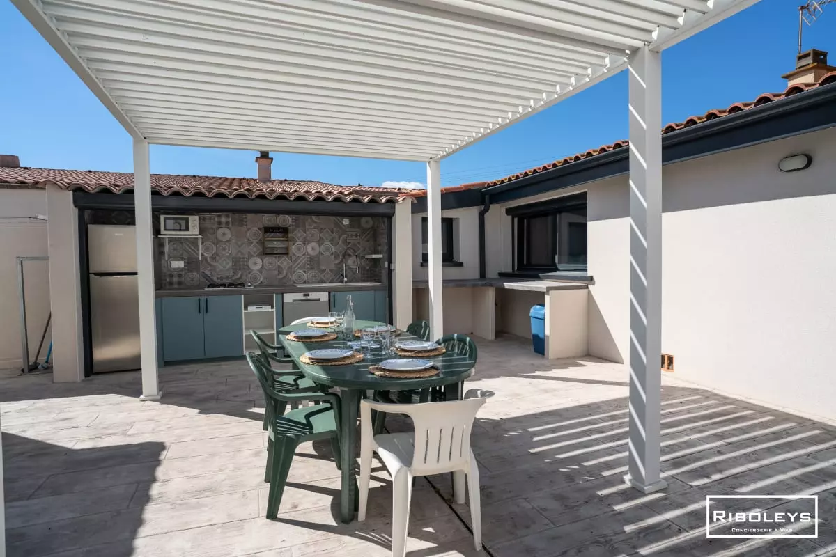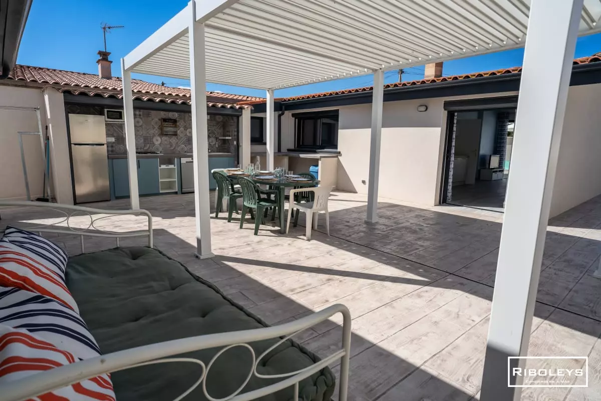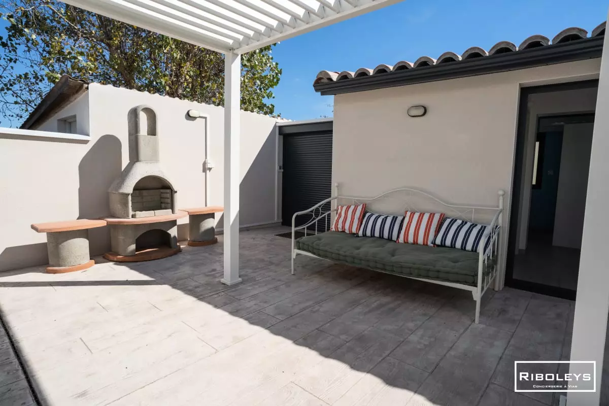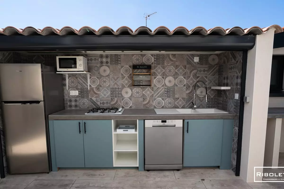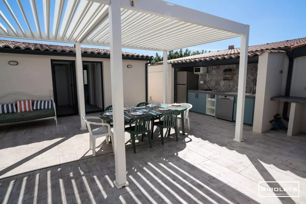 Les espaces extérieurs ont été pensés pour profiter pleinement des vacances. Une cuisine d’été entièrement équipée et un barbecue au charbon permettent de partager des repas conviviaux. Une grande terrasse avec salon de jardin, abritée sous pergola, offre un espace agréable à toute heure de la journée.
