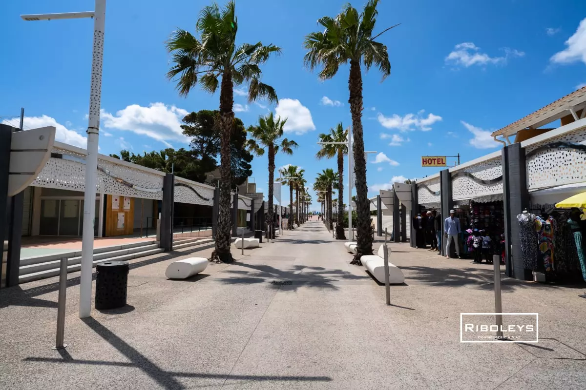 Elle est située dans une résidence calme, familiale et sécurisée, fermée par un portail électrique. La plage est accessible à pied à environ 200 mètres grâce à un portail piéton, et l’avenue commerçante de Vias Plage se trouve à environ 500 mètres.