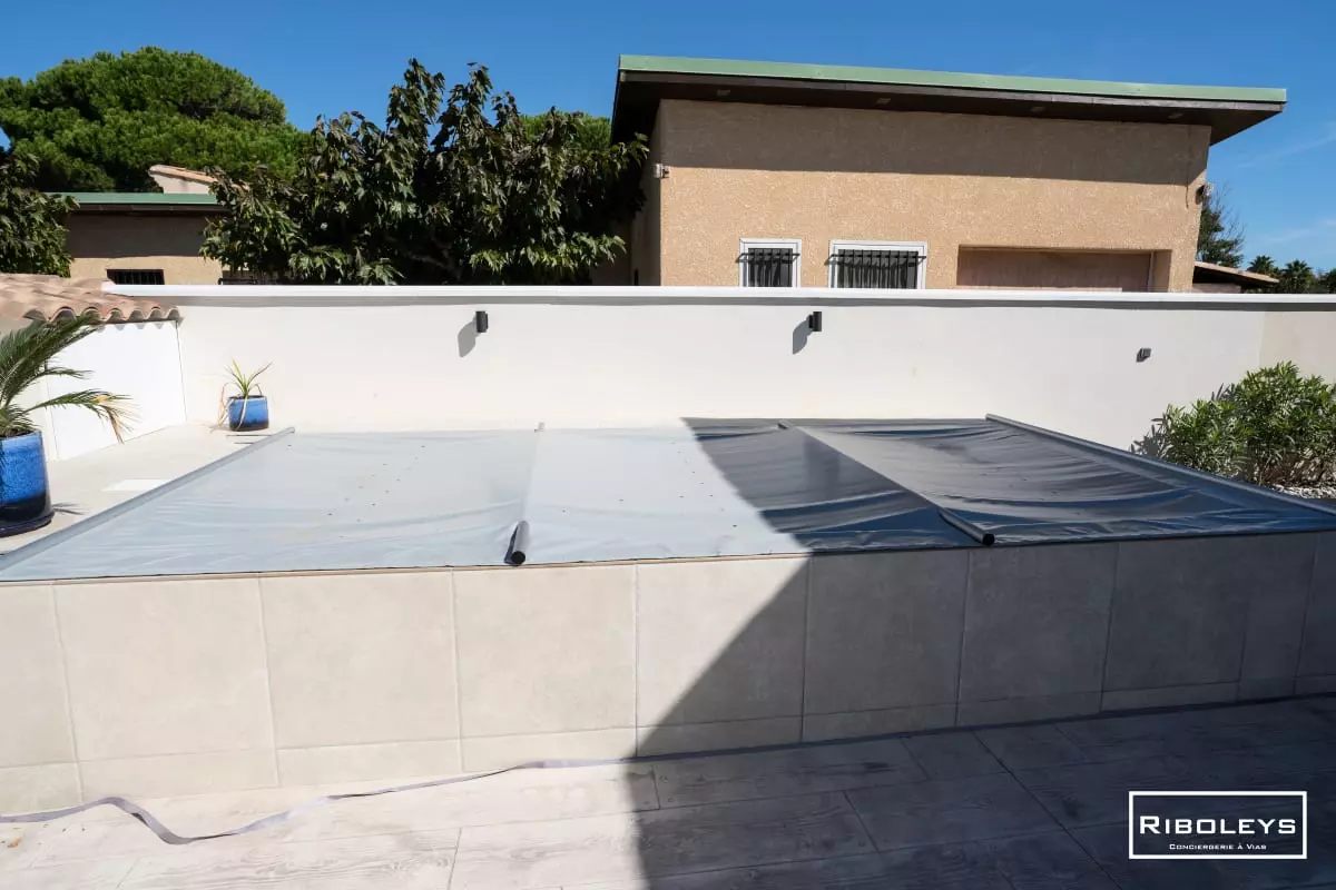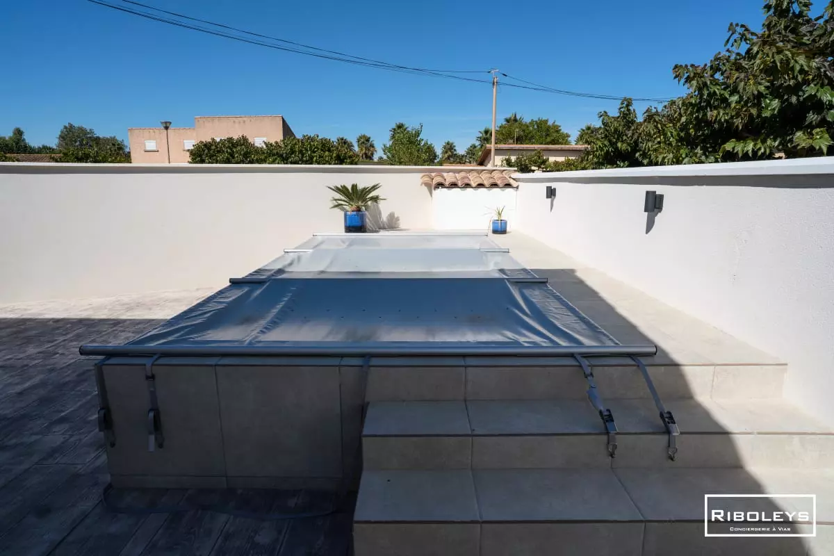 La piscine privée est entourée d’une large terrasse, idéale pour les moments de détente et les bains de soleil. Une bâche à barres assure la sécurité pour les enfants. Une douche extérieure est également à disposition.