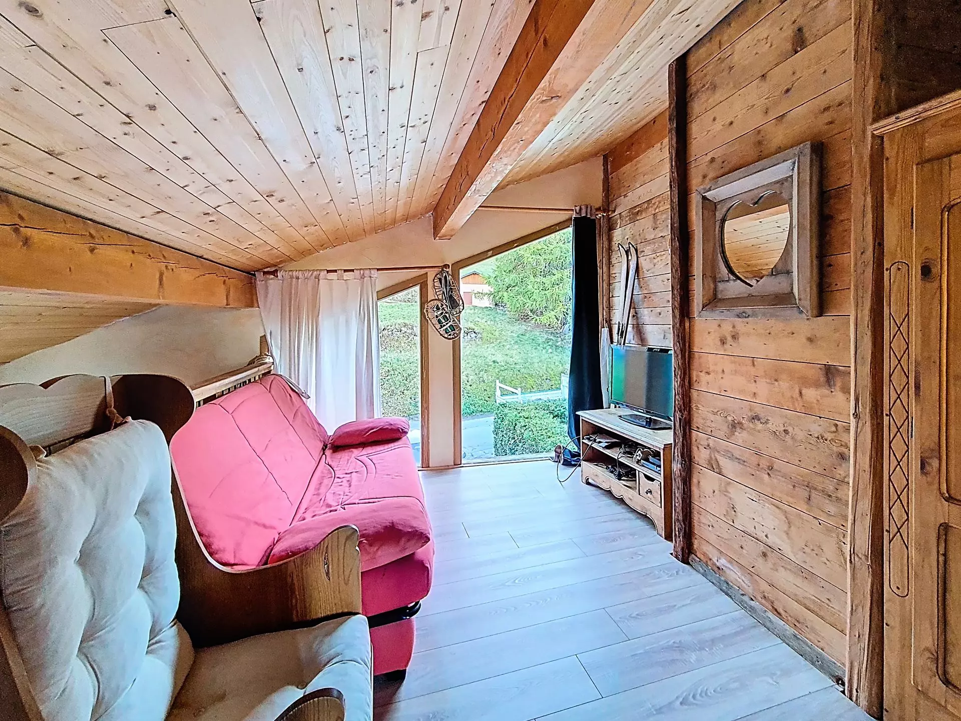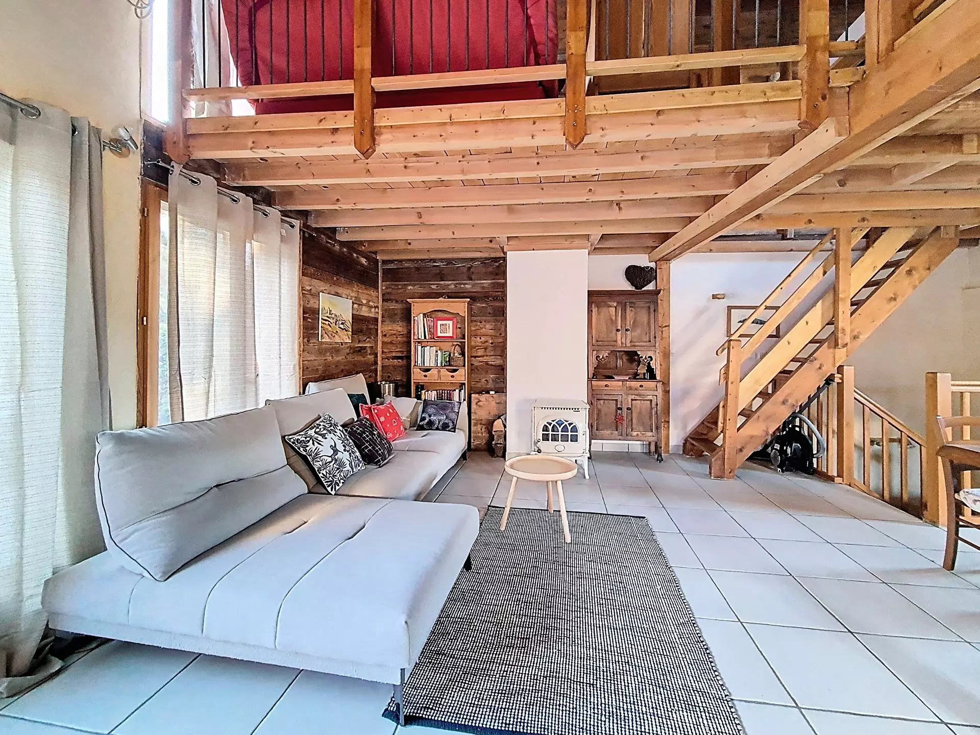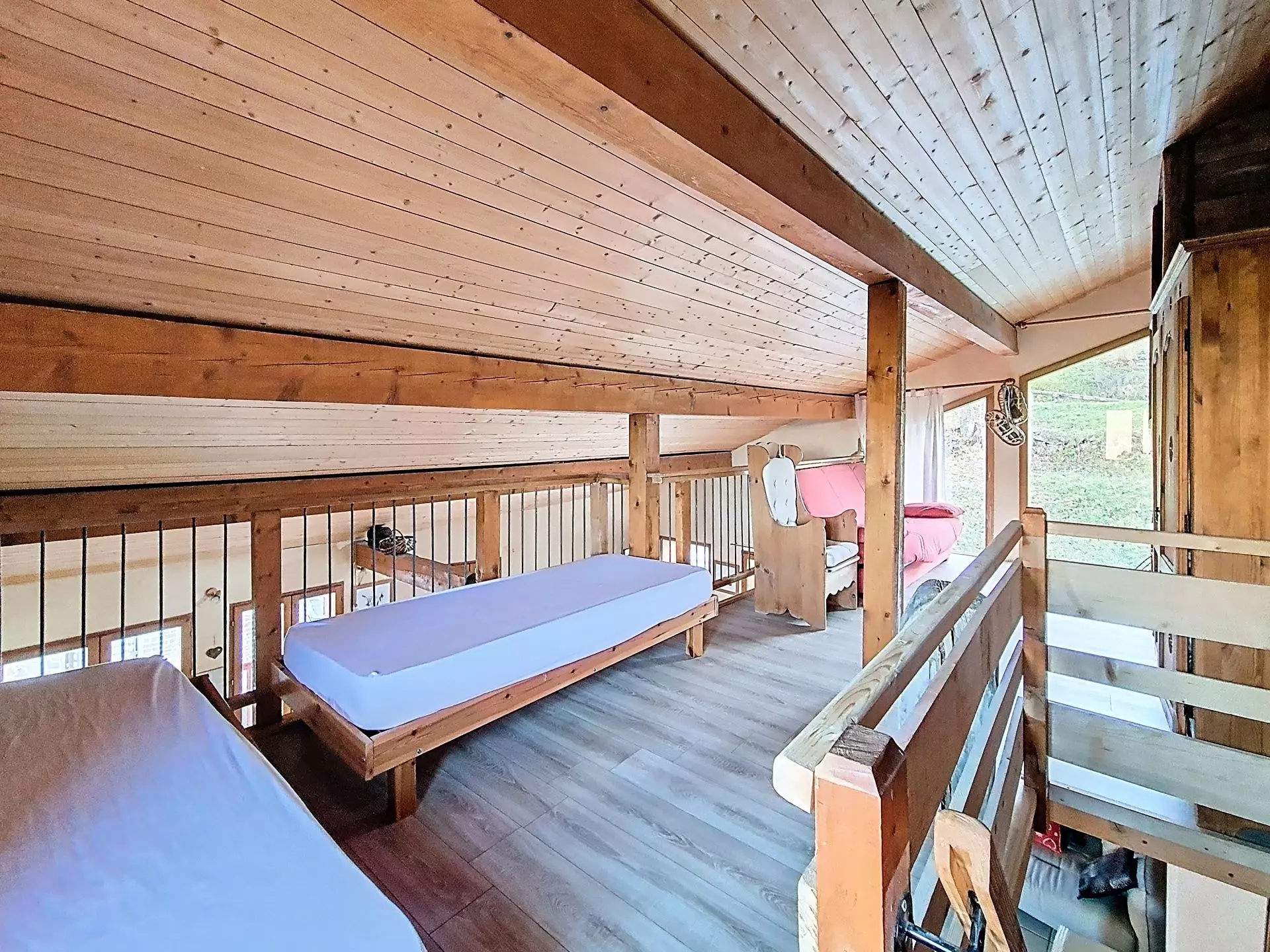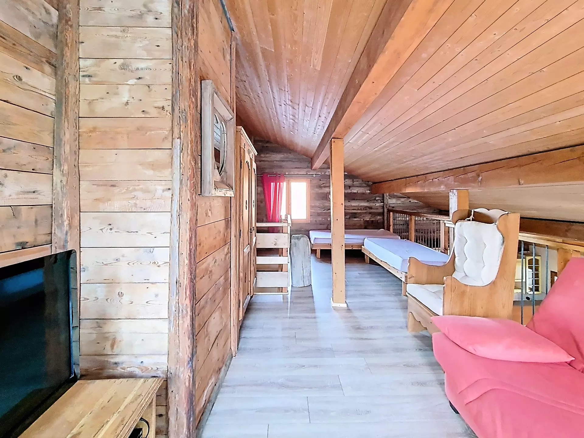 Mezzanine ouverte au dessus du séjour avec une télévision.