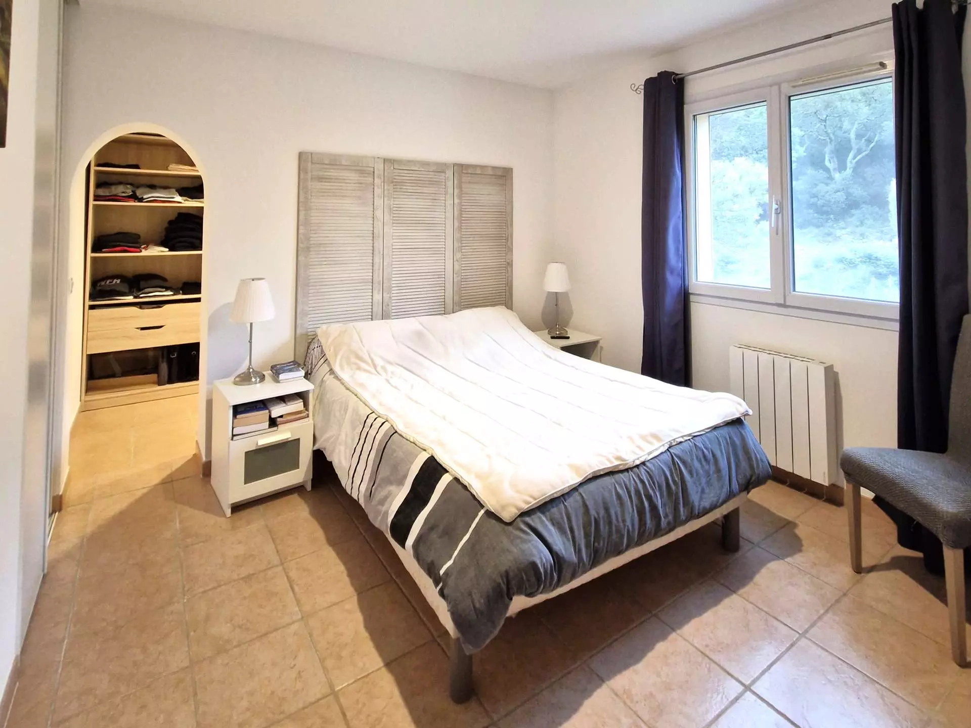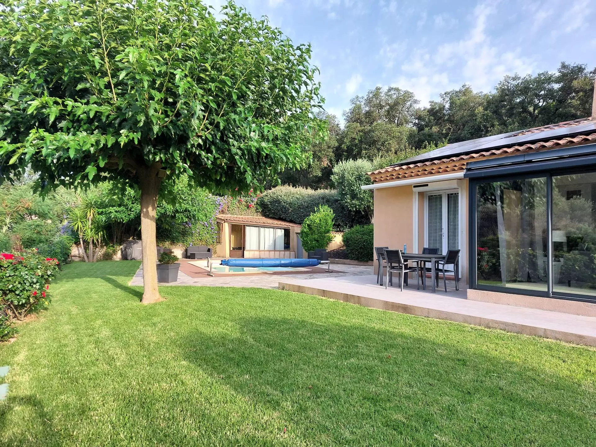 Cette villa bénéficie d’un beau terrain plat, avec piscine privée (4 x 8 m, sécurisée par une alarme) et vue sur les collines du Domaine de Valcros.