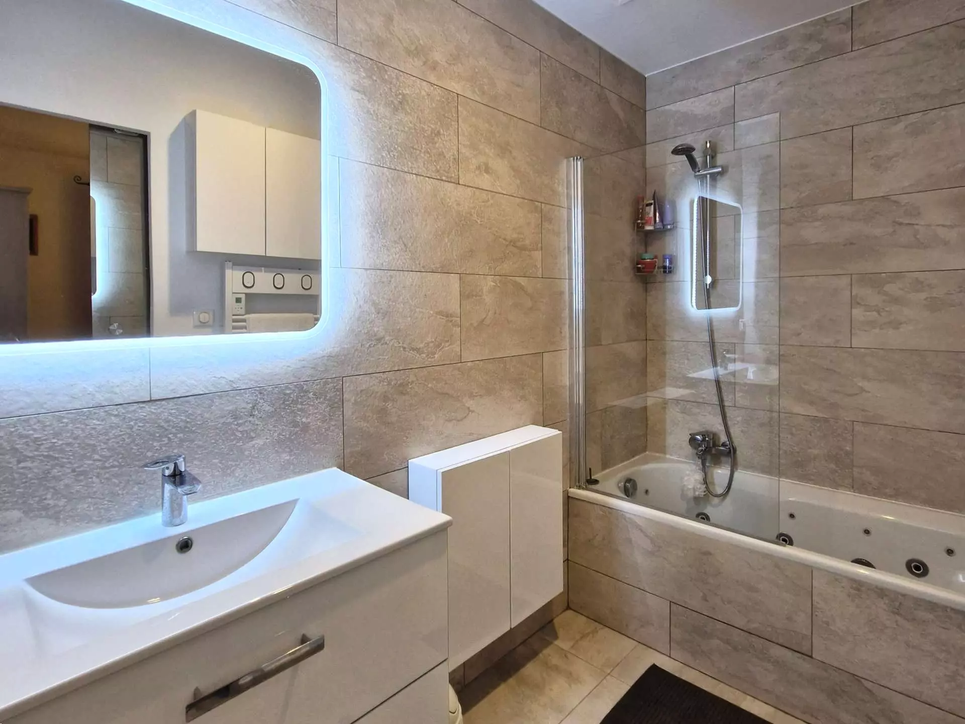 Une troisième chambre avec un lit double (140 x 190 cm) et une salle de bains équipée d’une baignoire balnéo.