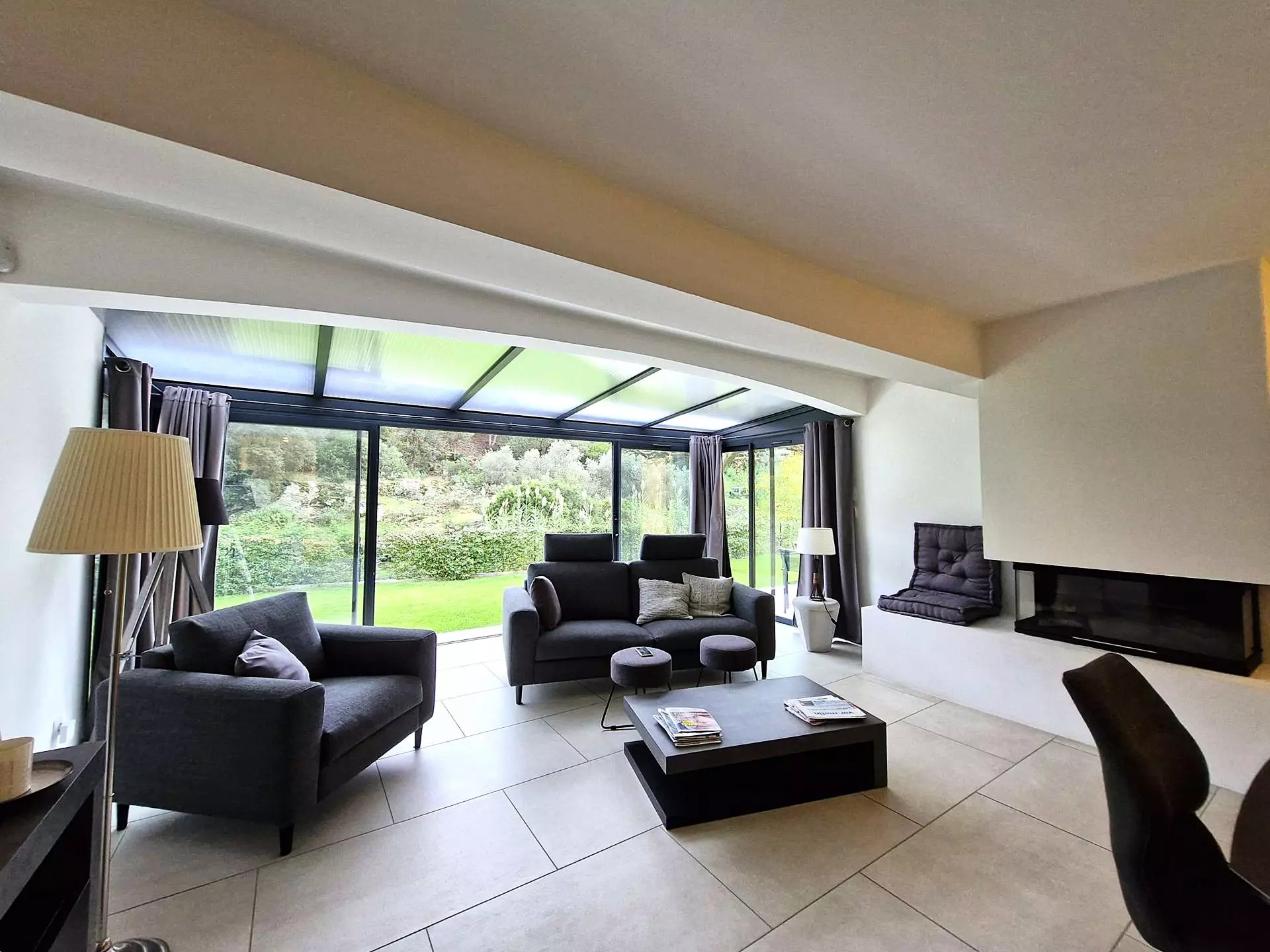 À l’intérieur, un séjour / salle à manger avec véranda ouvrant sur une terrasse et le jardin.