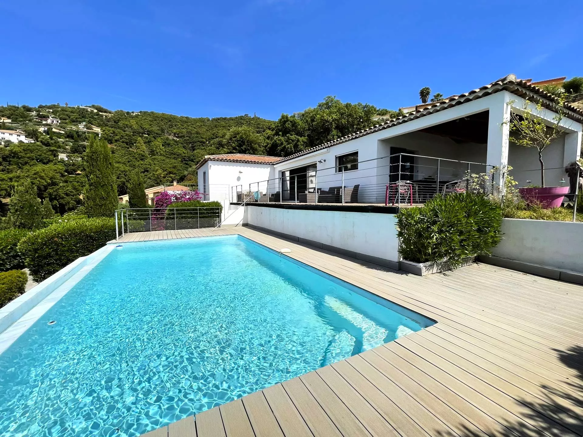 À l’extérieur, vous profiterez d’une grande terrasse au niveau de la piscine, spacieuse et conviviale, avec un espace couvert, une table de repas extérieure, du mobilier de jardin et un store banne, permettant de savourer pleinement les beaux jours à toute heure.