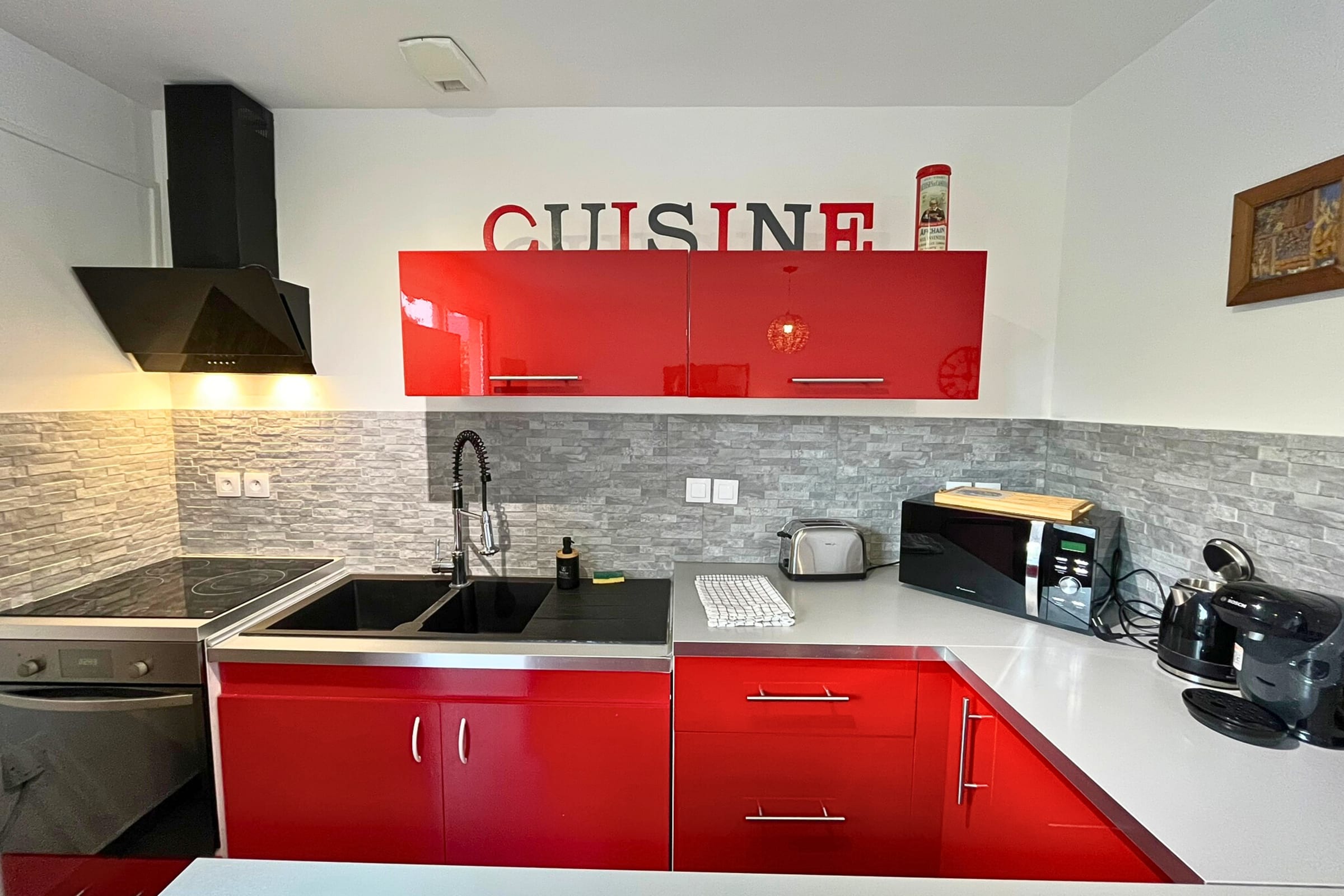 La cuisine entièrement équipée vous permettra de préparer vos repas en toute simplicité (plaque de cuisson, four, micro-ondes, réfrigérateur,vaisselle, machine Tassimo).